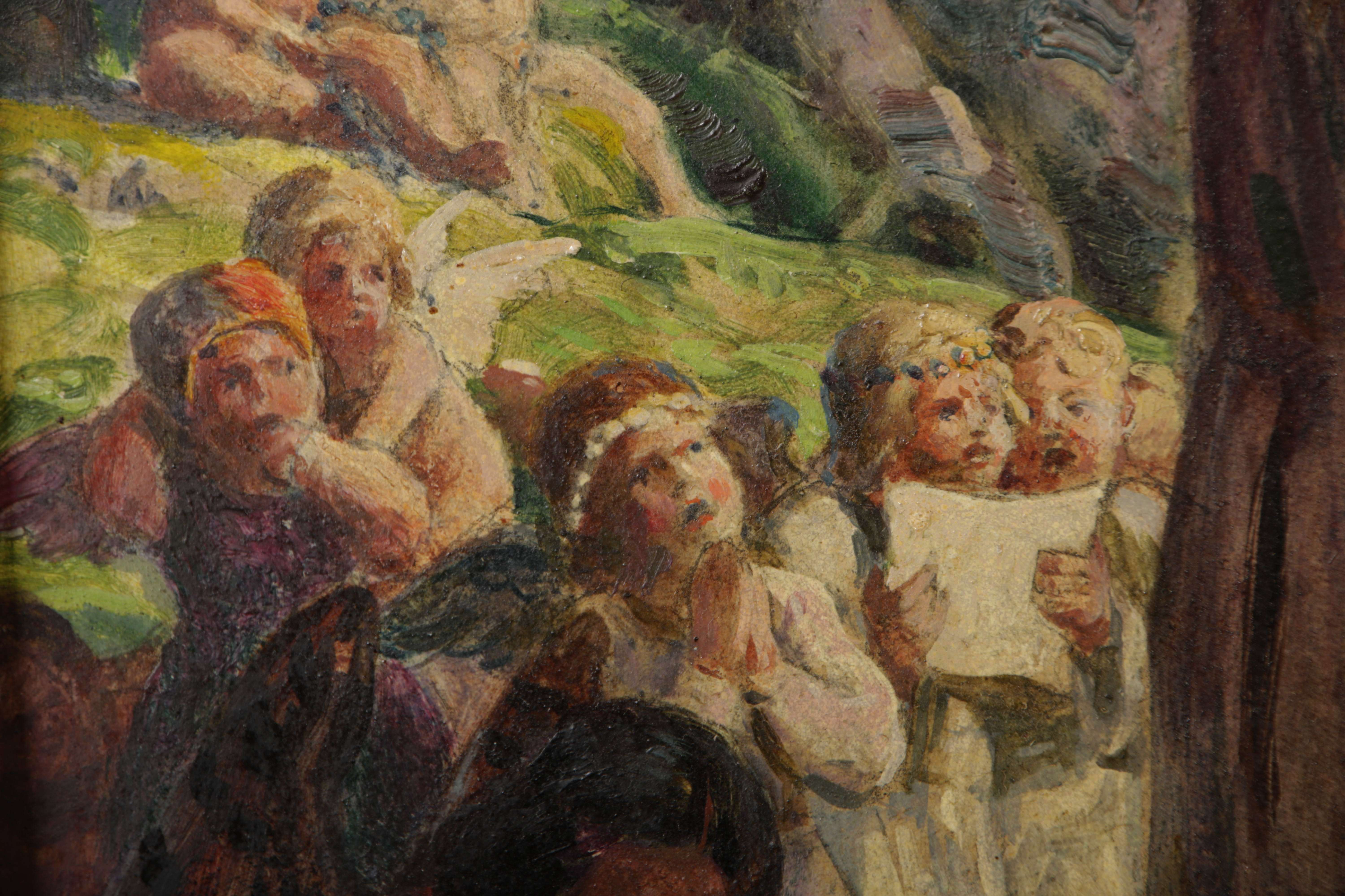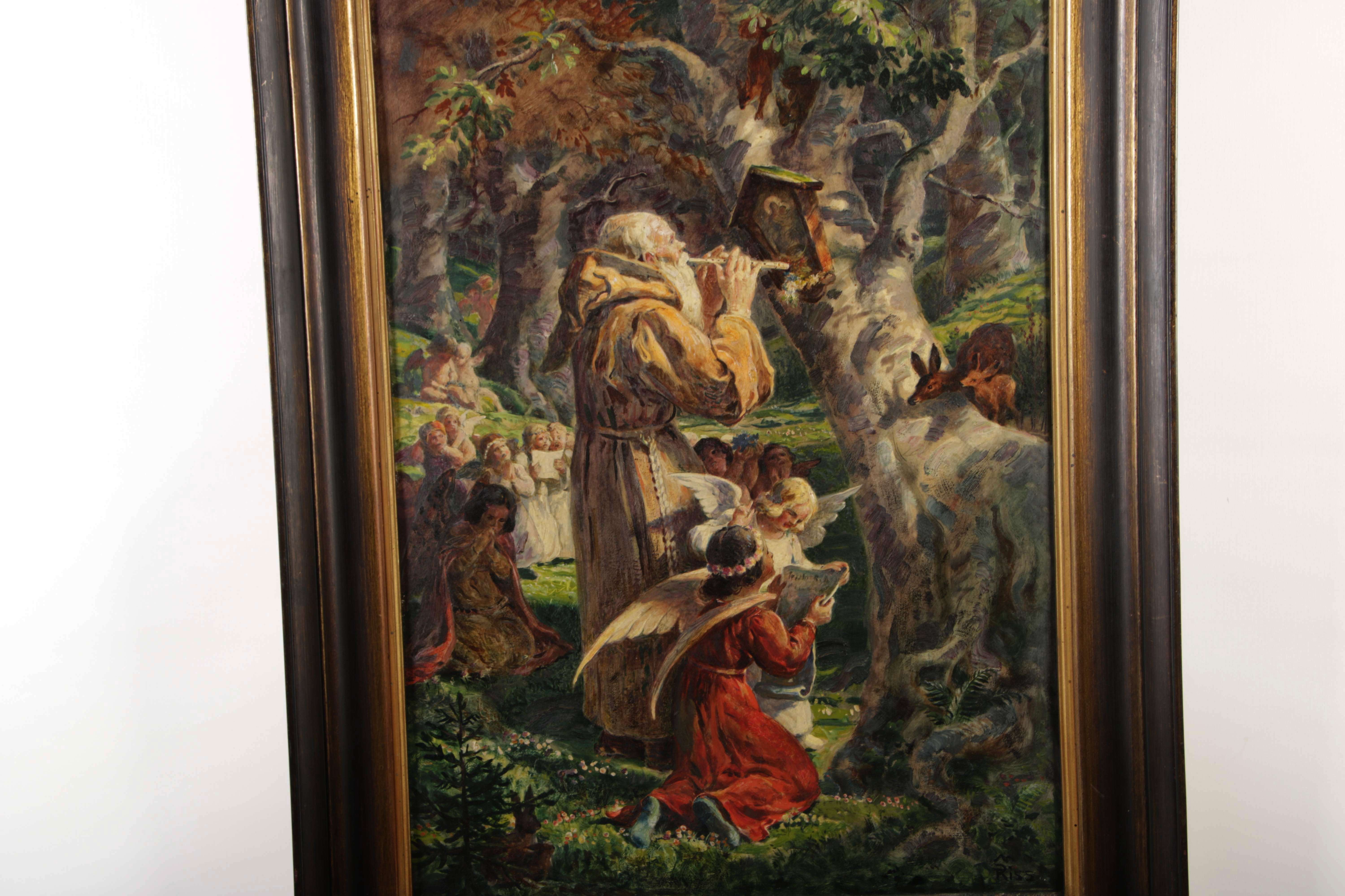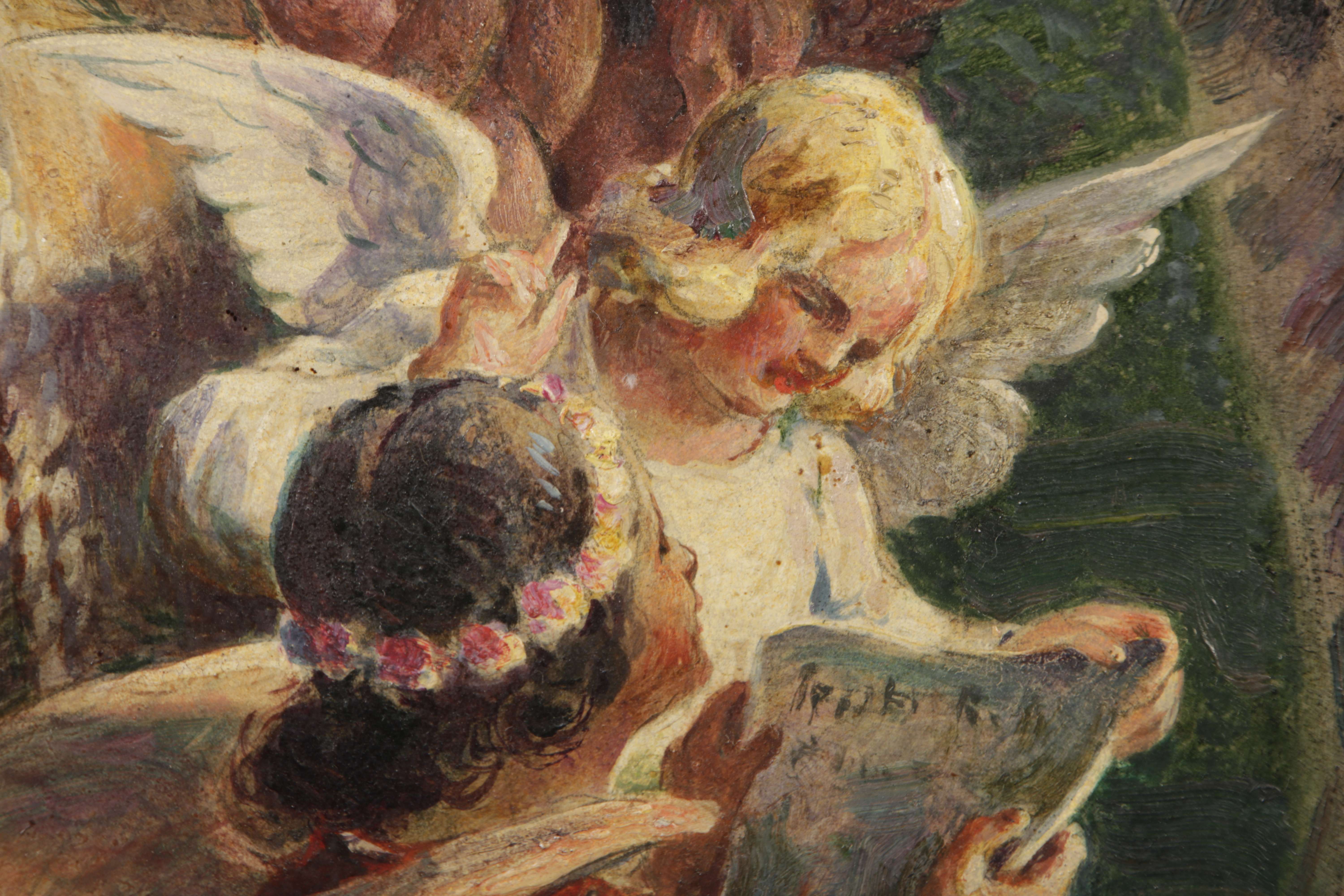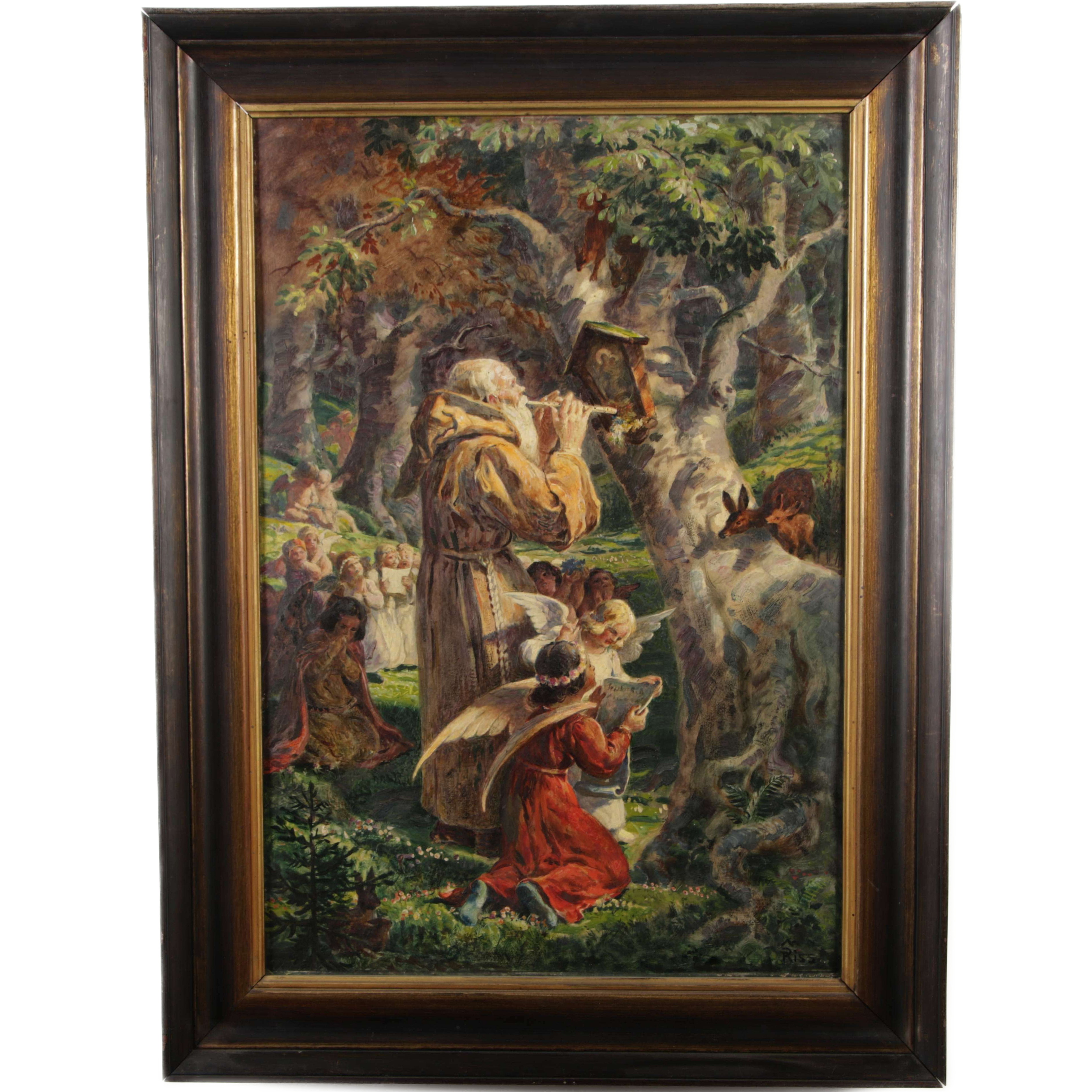 | Waldnacht, Flöte spielender Eremit umringt von tanzenden Putti im Märchenwald, signiert unten rechts: Riss, rückseitig bezeichnet: "Maler Th. Riss Mühlau Tirol", Öl auf Karton |