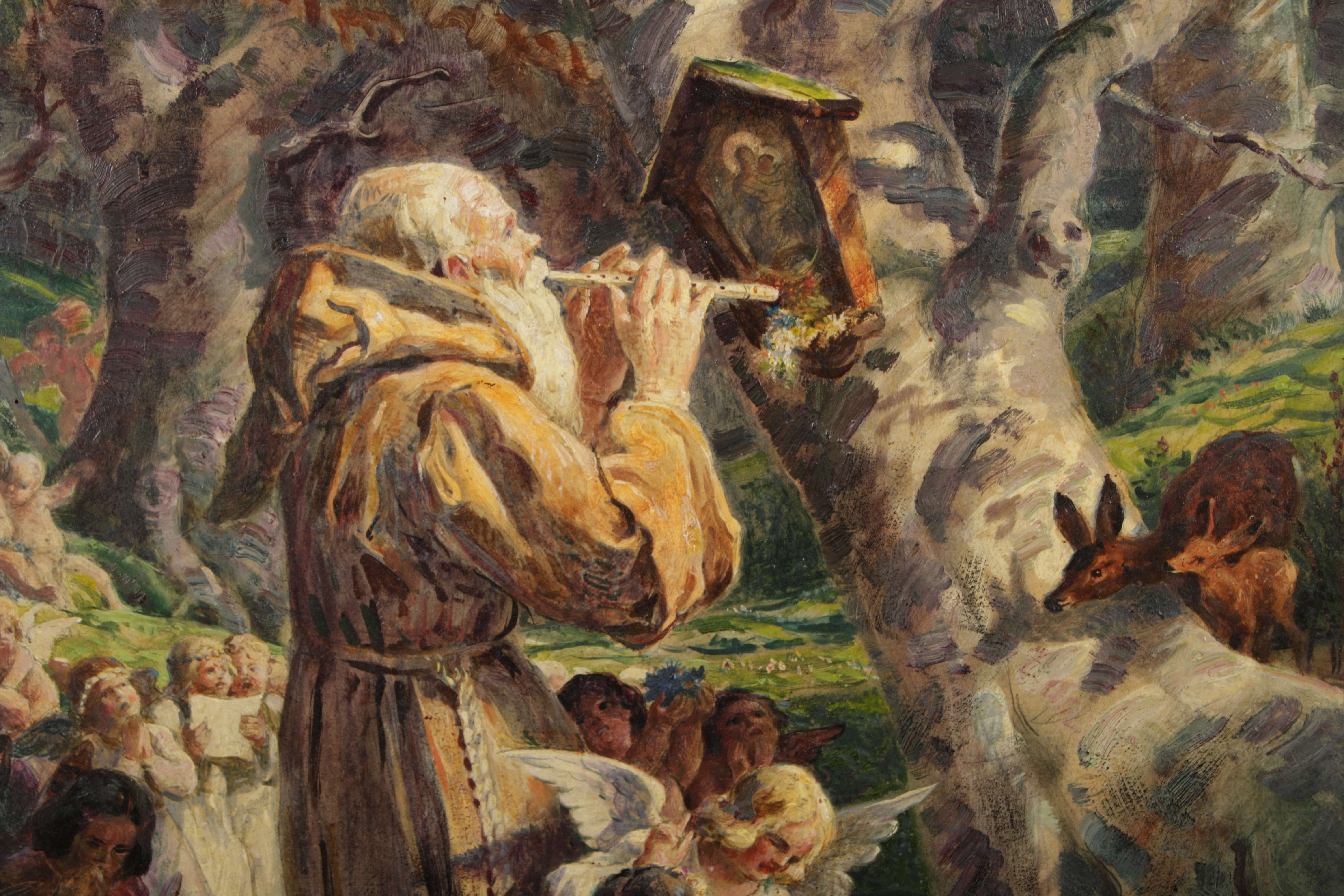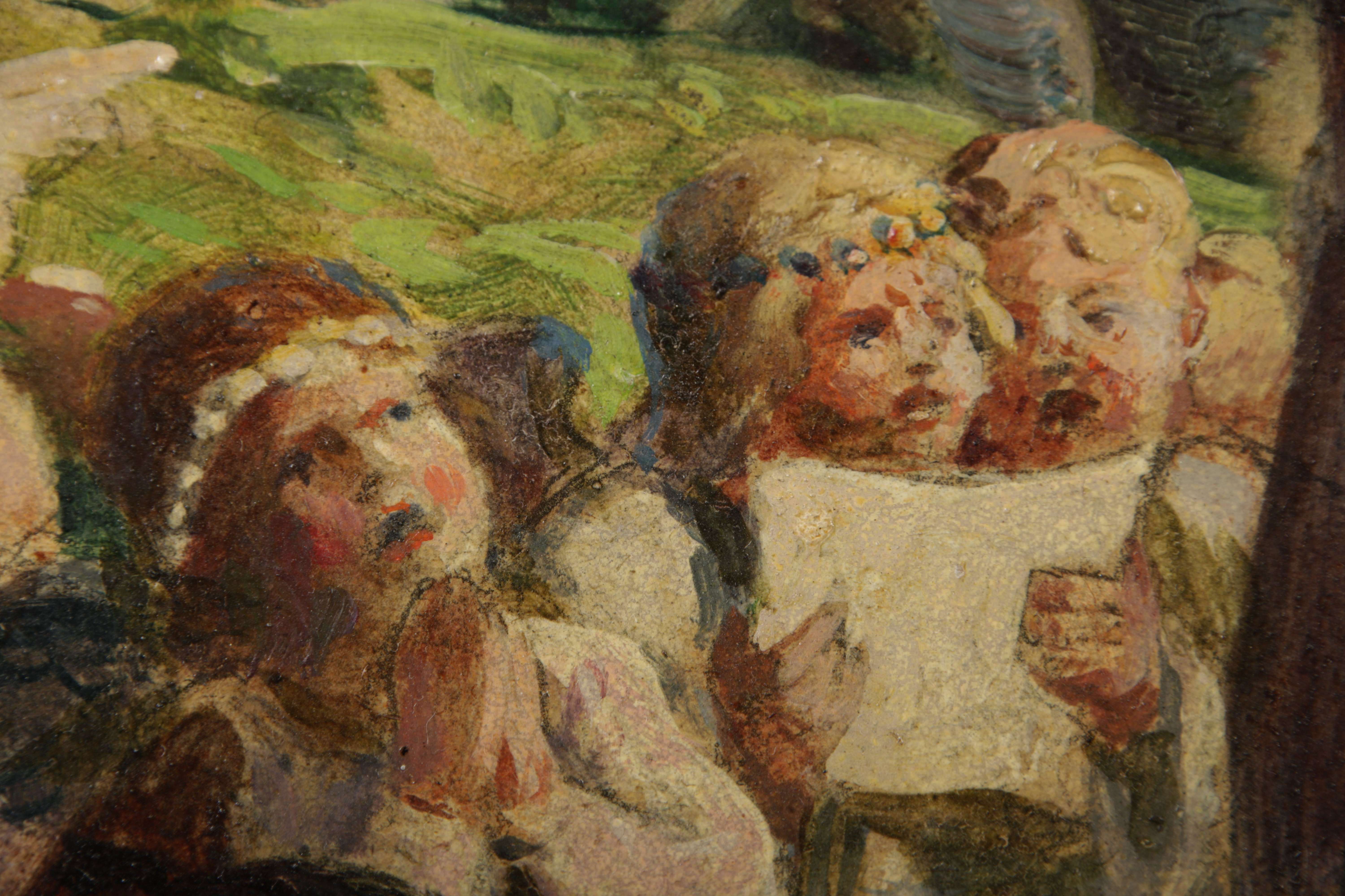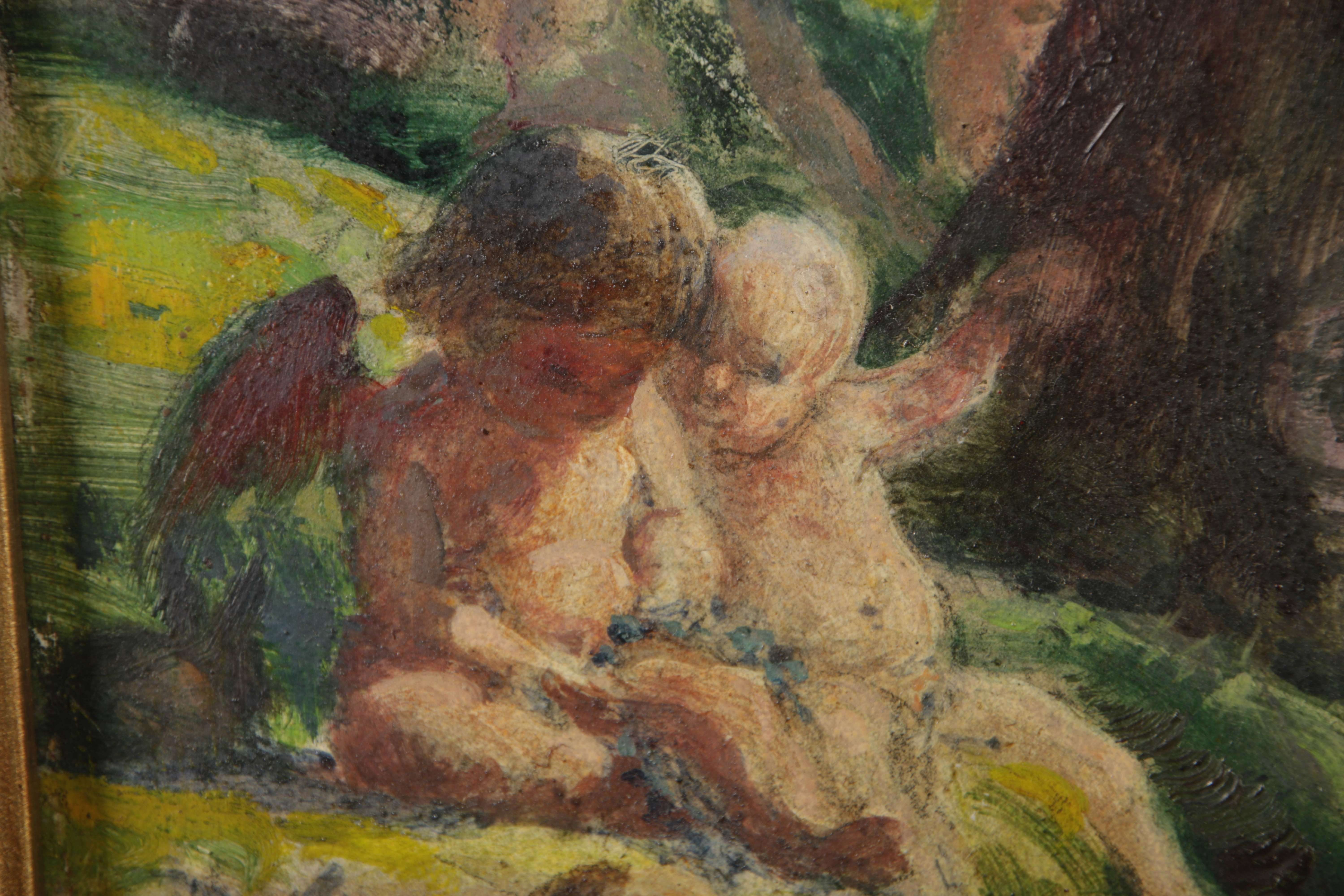 | Waldnacht, Flöte spielender Eremit umringt von tanzenden Putti im Märchenwald, signiert unten rechts: Riss, rückseitig bezeichnet: "Maler Th. Riss Mühlau Tirol", Öl auf Karton |