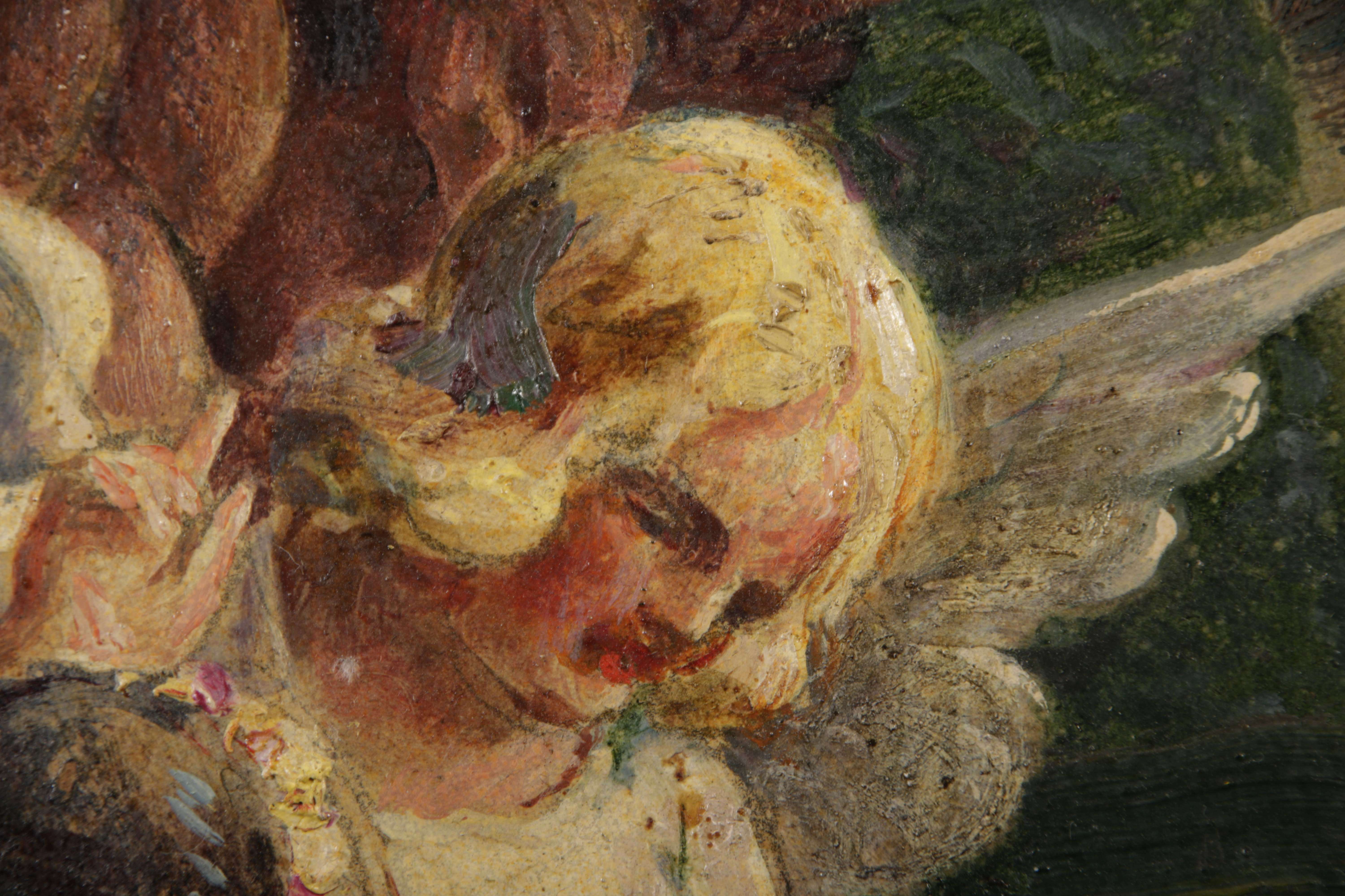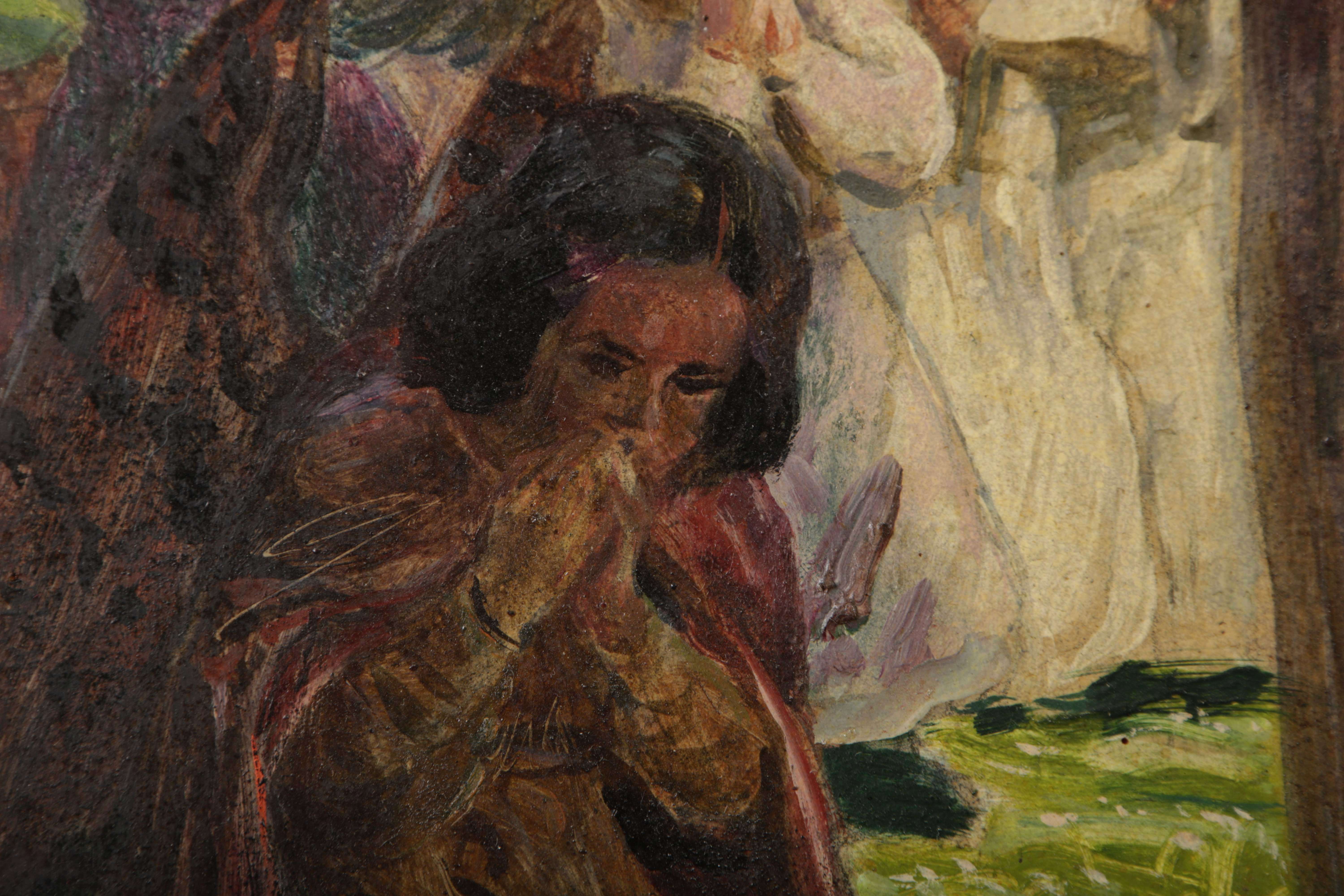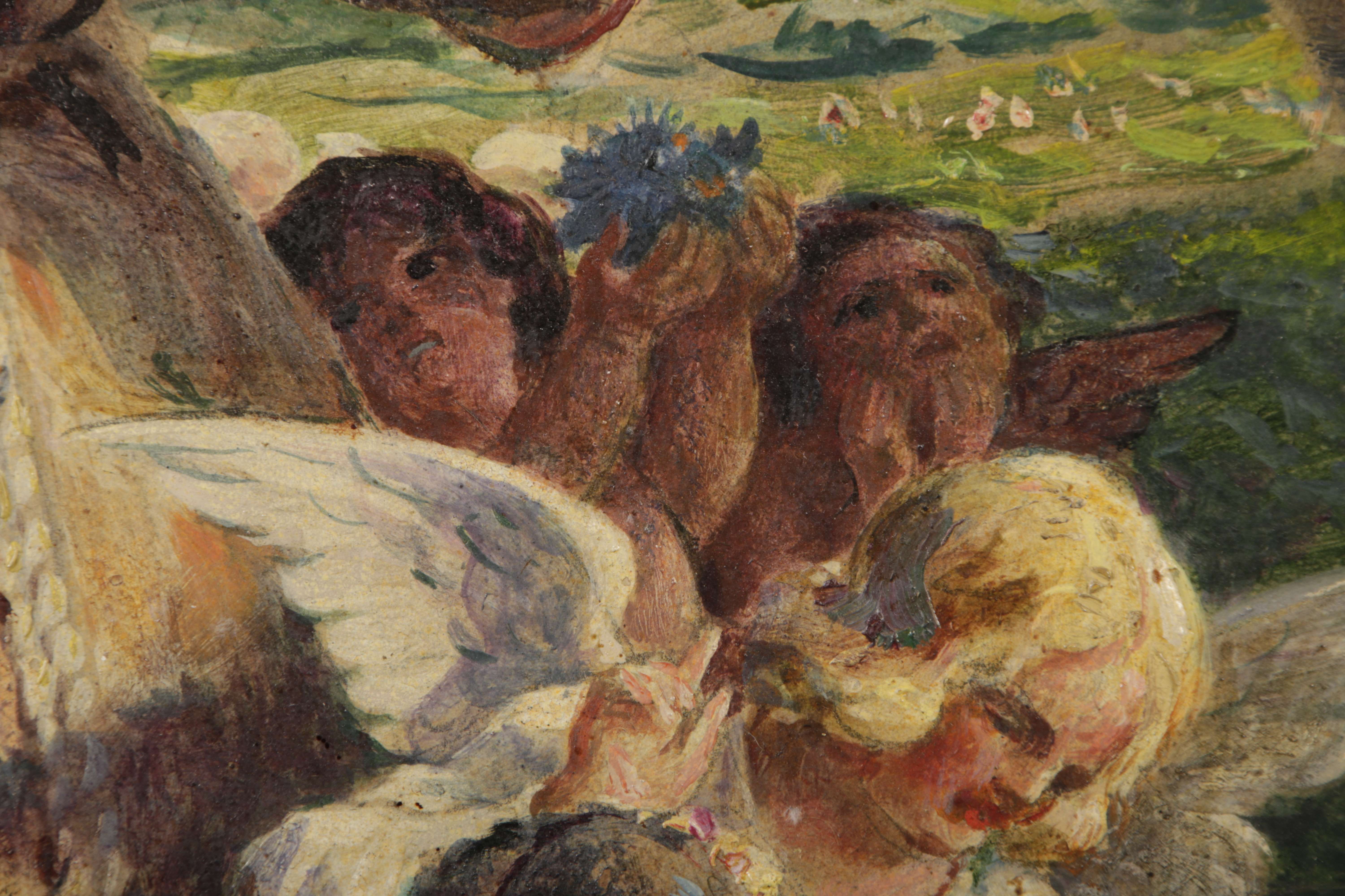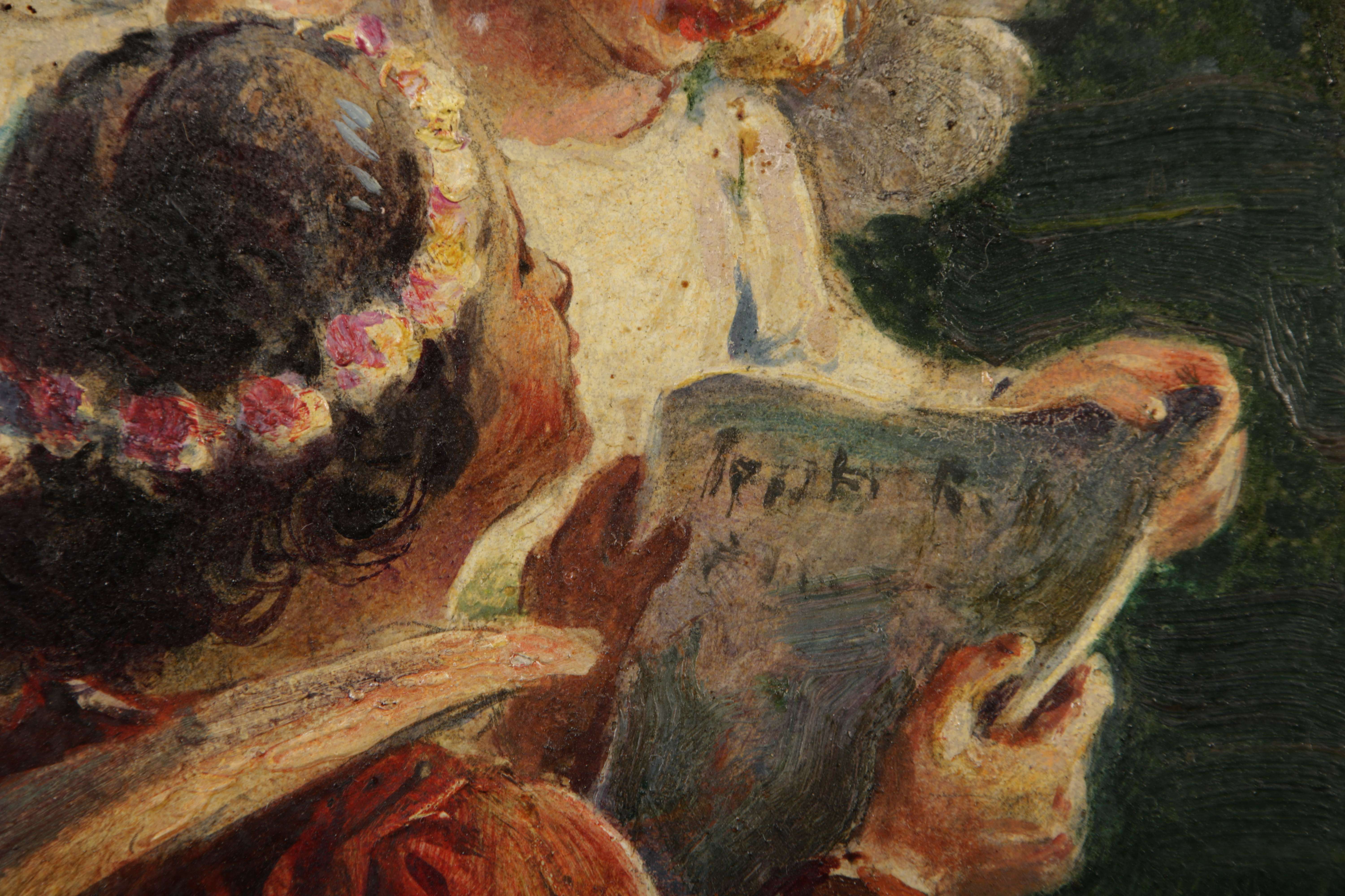 | Waldnacht, Flöte spielender Eremit umringt von tanzenden Putti im Märchenwald, signiert unten rechts: Riss, rückseitig bezeichnet: "Maler Th. Riss Mühlau Tirol", Öl auf Karton |