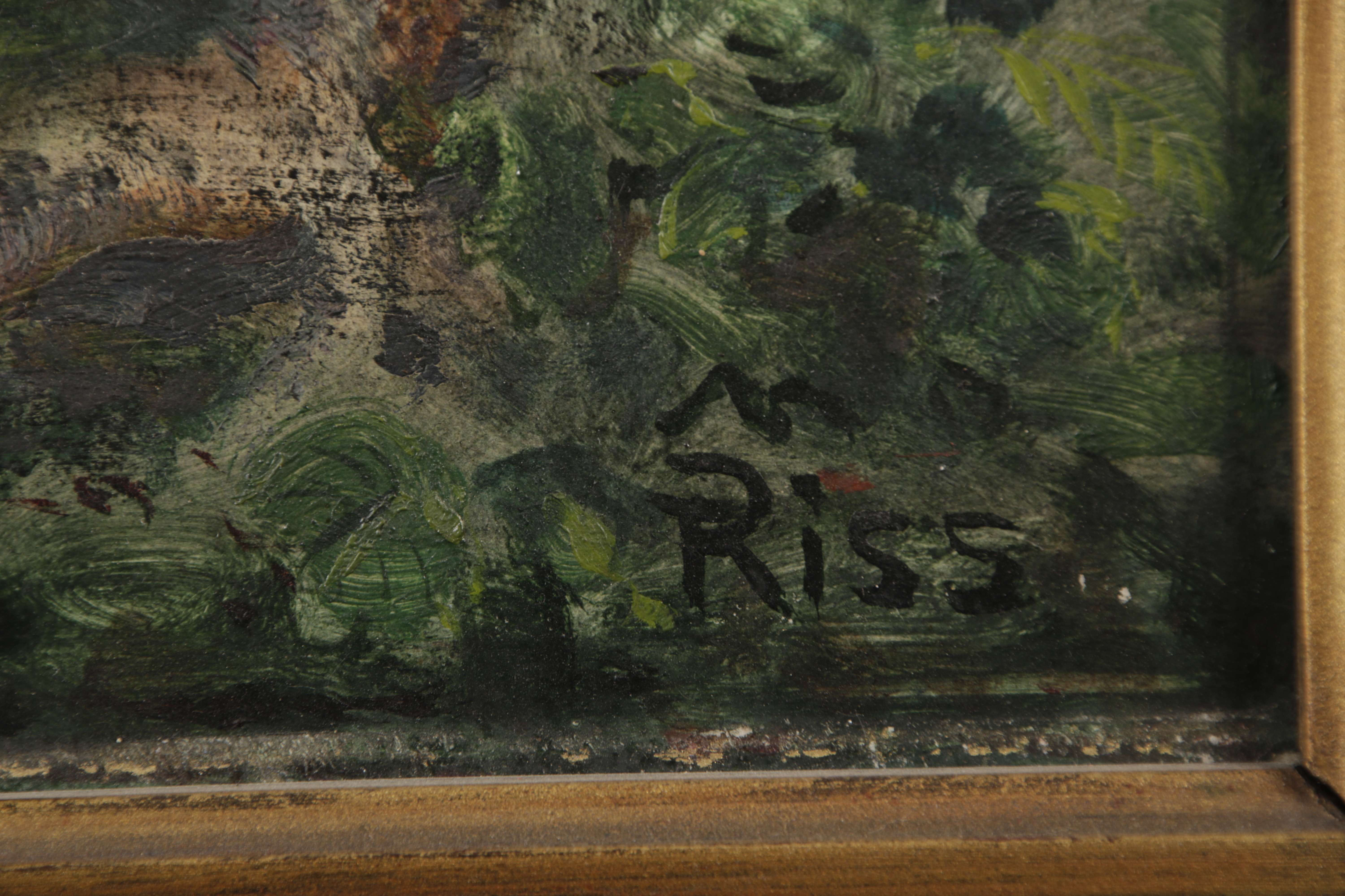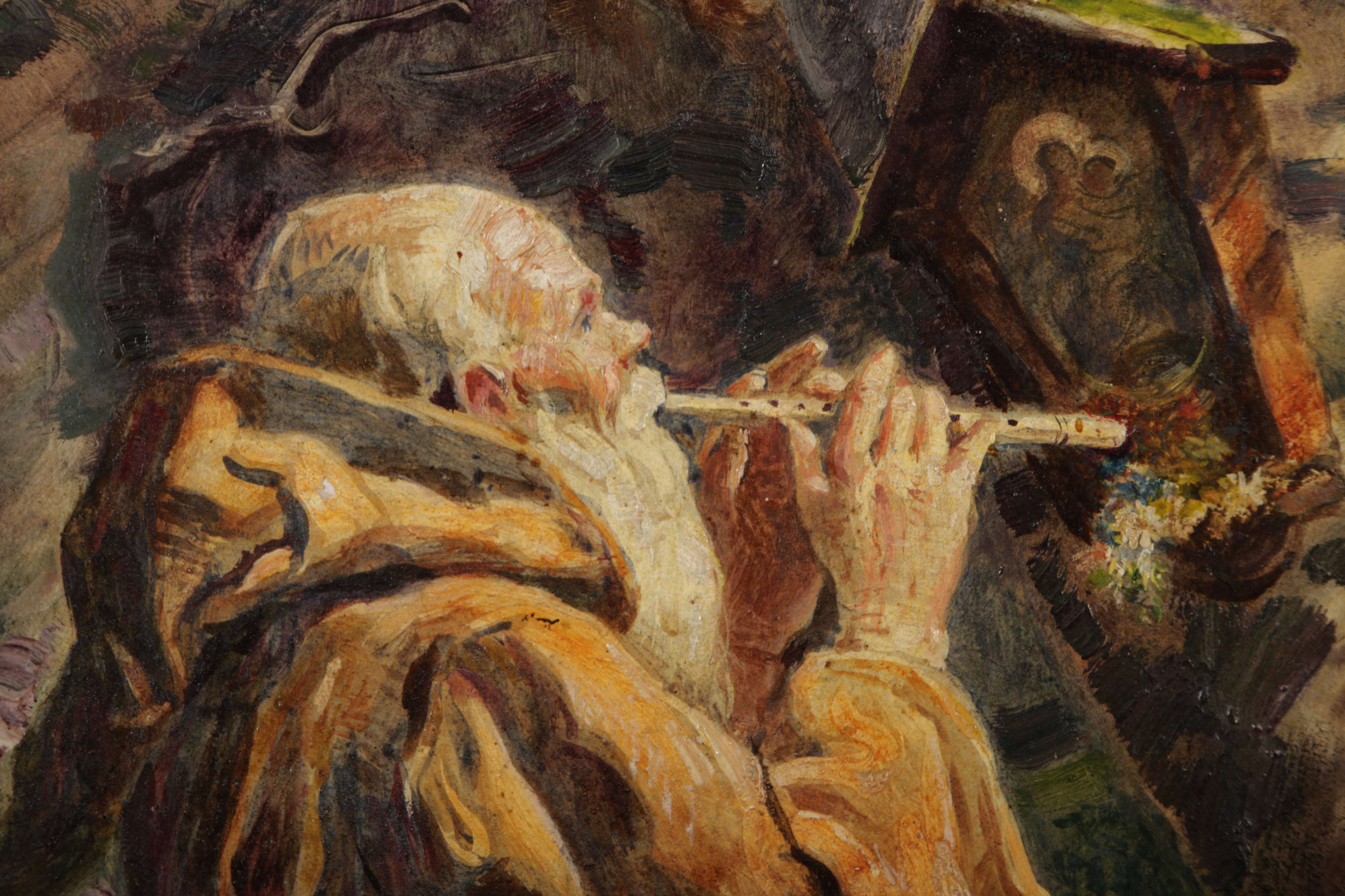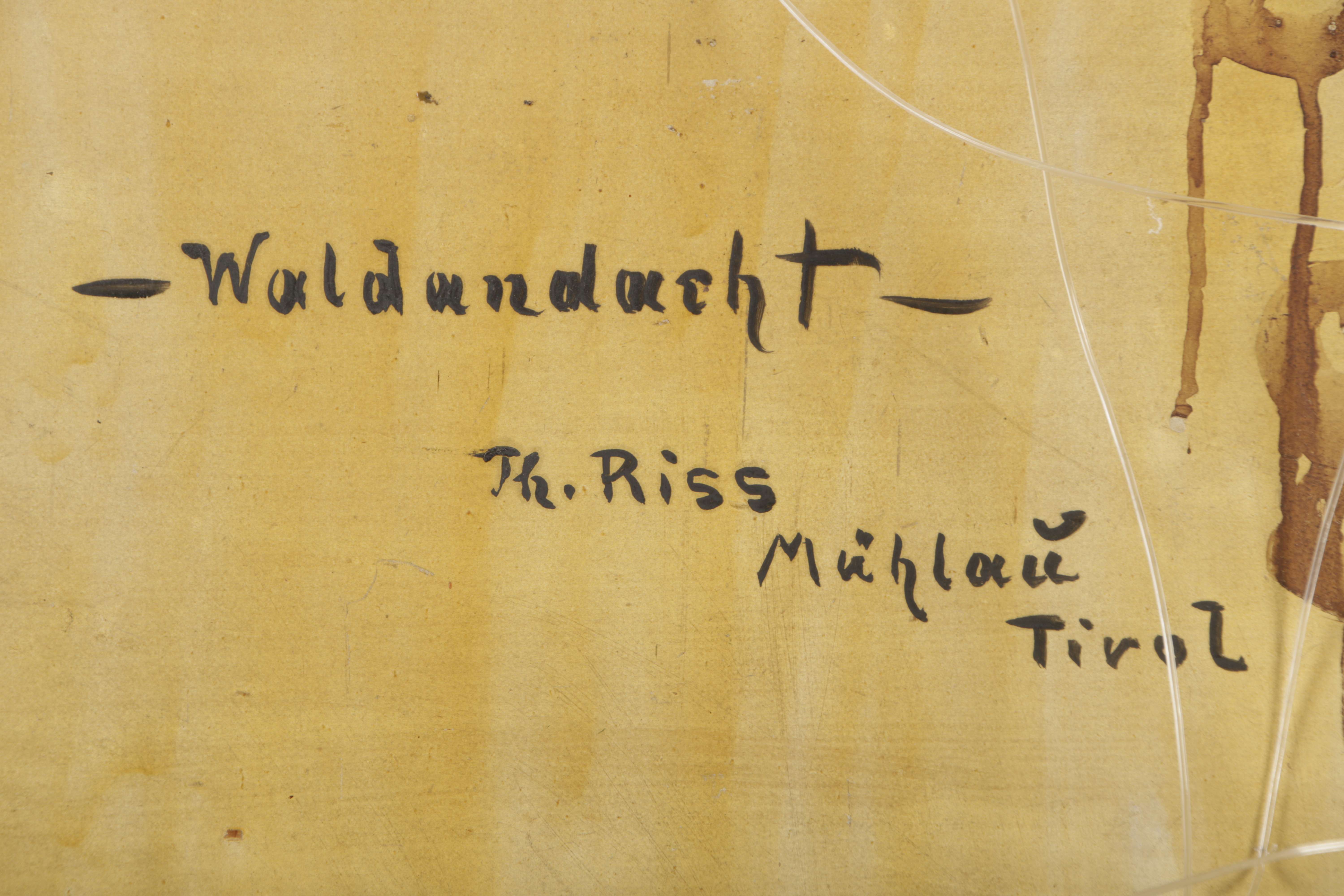 Mahler / Painter: THOMAS RISS Stams 1871 - Innsbruck 1959 Der Lebensweg des Stamser Bauernbubs war geprägt von Erfolg wie auch von Krisen wirtschaftlicher wie persönlich-menschlicher Art. Unter größten materiellen Entbehrungen absolvierte der wenig bemittelte Oberinntaler zunächst in Innsbruck an der Staatsgewerbeschule eine Ausbildung zum kunsthandwerklichen Maler , um sich im Anschluss daran für den Besuch der Kunstakademie in München zu entscheiden, wo er u.a. auch bei Franz von Defregger studierte. 1898 kam der junge Künster zur Kurierung einer Lungenerkrankung nach Meran/Burggrafenamt, wo er dann für 29 Jahre blieb. 1904 Reise in die USA zur Weltausstellung in St. Louis, wo er die Goldmedaille gewinnt. 1907 Heirat mit Friederike Kuhn in der Karlskirche in Wien, 1908 Tochter Walfrieda (Friedele) wird geboren. 1914 Einberufung im 1. Weltkrieg- rückt als Standschütze mit den Meranern ein, wird ein geschätzter Kriegsmaler. 1927 dann, angesichts der durch den Ersten Weltkrieg veränderten Territorialen Veränderung, zog es ihn zurück nach Nordtirol wo er in Innsbruck-Mühlau ein Haus erwarb. 1959 starb Riss im Alter von 87 Jharen an einer Lungenentzündung. Für seine künstlerische Arbeit wurden ihm zahlreiche Anerkennungen verliehen: der Titel "Professor", das Ehrenzeichen des Landes Tirol, das österreichische Verdienstkreuz für Kunst und Wissenschaft, die Ehrenbürgerschaft von Stams. Als Bildschöpfer stellte Riss angesichts der revolutionären Entwicklungen in der Kunst des 20. Jahrhunderts eine entschieden unzeitgemäße Erscheinung dar. Stilistisch blieb er trotz vereinzelter Exkurse in den Impressionismus zeitlebens einer naturalistischen Darstellungsweise treu. Thematisch ist das Werk des Künstlers breit gefächert, besonders hervorzuheben sind allerdings die souveränen Porträts die der Meister schuf. Neben diesen finden sich Landschaftsbilder, Themen bäuerlicher Menschen im Alltag, religiöse und mythologische Motive. Waldnacht, Flöte spielender Eremit umringt von tanzenden Putti im Märchenwald, signiert unten rechts: Riss, rückseitig bezeichnet: "Maler Th. Riss Mühlau Tirol", Öl auf Karton Zeit / Time : vor 1959 Masse