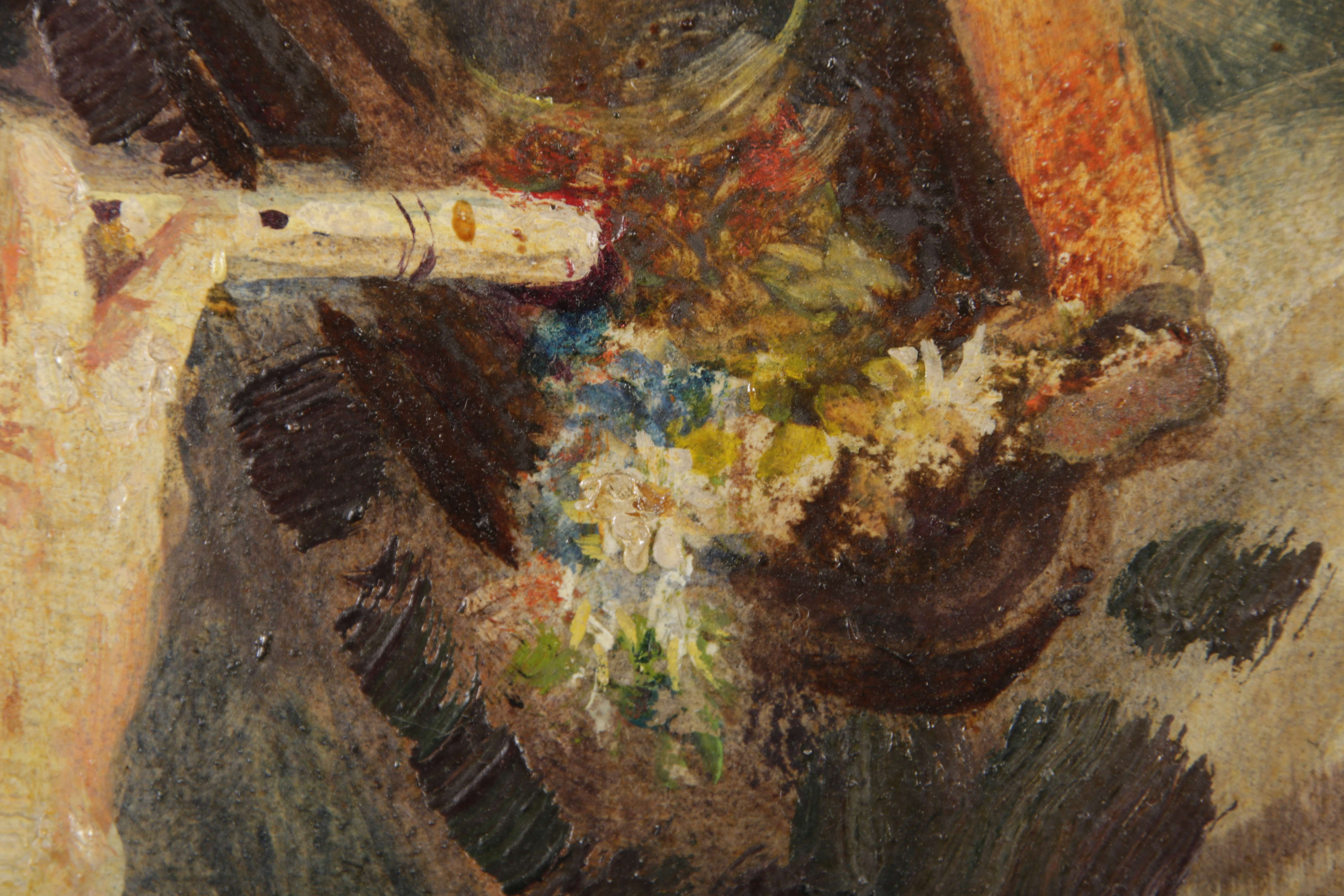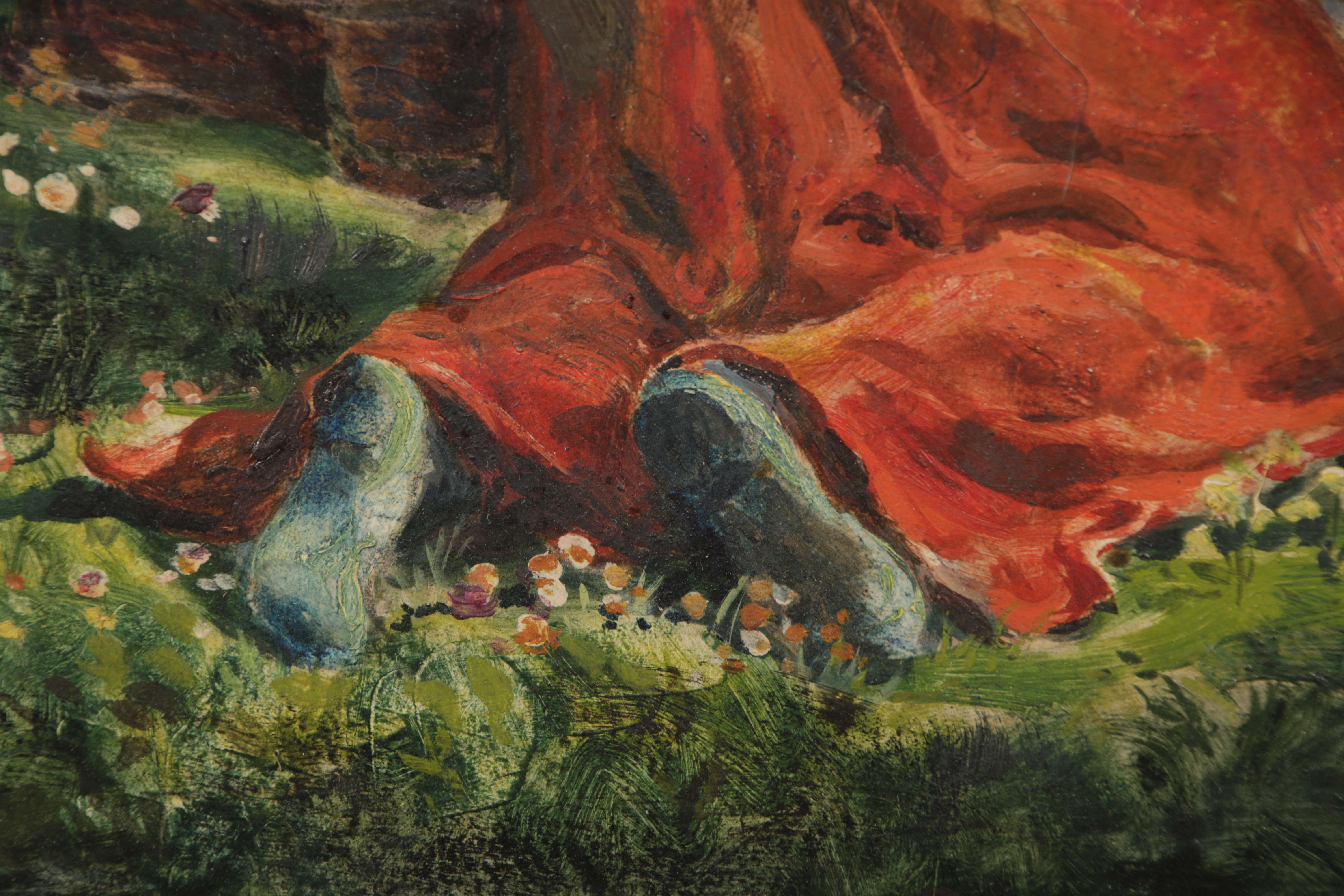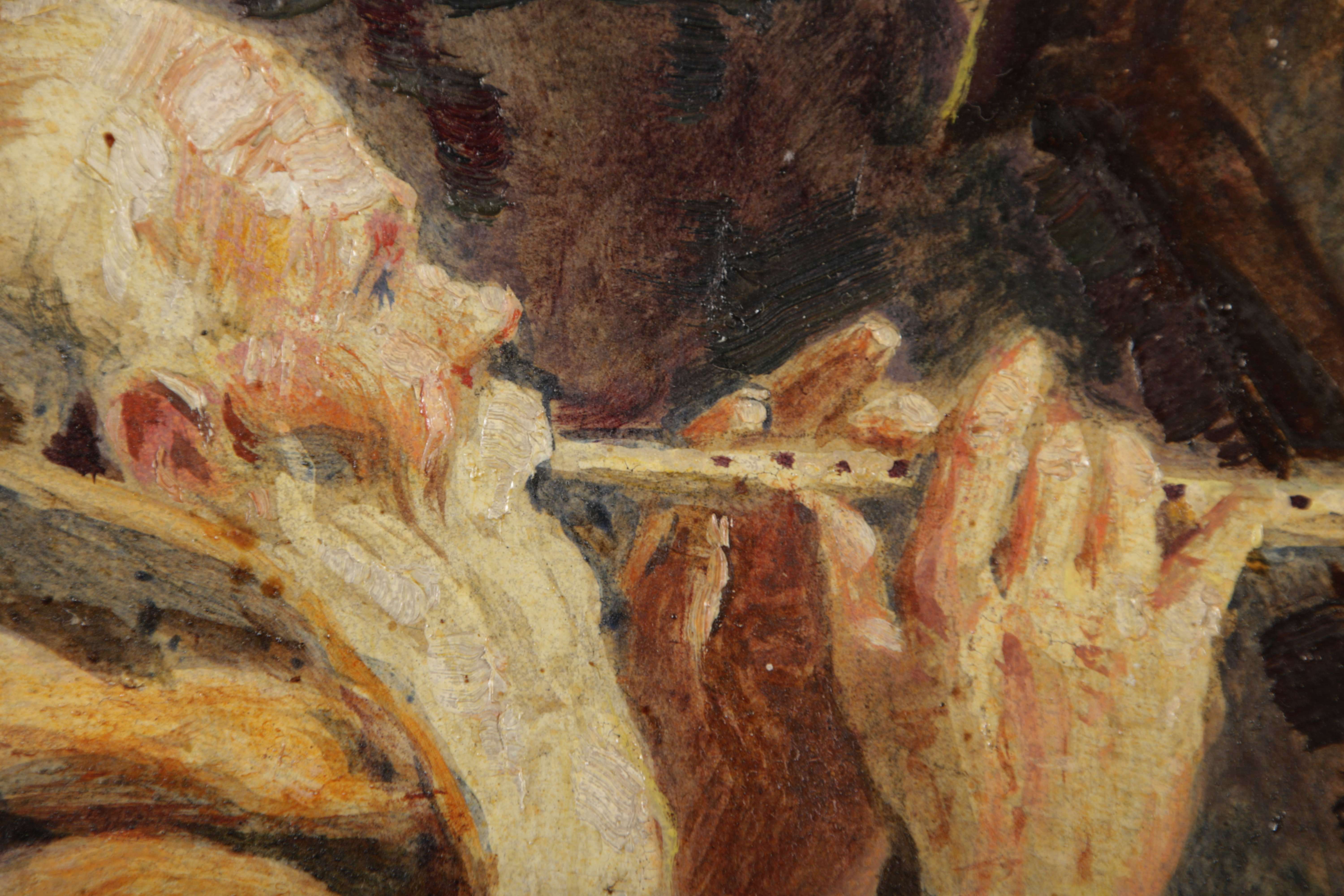 Mahler / Painter: THOMAS RISS Stams 1871 - Innsbruck 1959 Der Lebensweg des Stamser Bauernbubs war geprägt von Erfolg wie auch von Krisen wirtschaftlicher wie persönlich-menschlicher Art. Unter größten materiellen Entbehrungen absolvierte der wenig bemittelte Oberinntaler zunächst in Innsbruck an der Staatsgewerbeschule eine Ausbildung zum kunsthandwerklichen Maler , um sich im Anschluss daran für den Besuch der Kunstakademie in München zu entscheiden, wo er u.a. auch bei Franz von Defregger studierte. 1898 kam der junge Künster zur Kurierung einer Lungenerkrankung nach Meran/Burggrafenamt, wo er dann für 29 Jahre blieb. 1904 Reise in die USA zur Weltausstellung in St. Louis, wo er die Goldmedaille gewinnt. 1907 Heirat mit Friederike Kuhn in der Karlskirche in Wien, 1908 Tochter Walfrieda (Friedele) wird geboren. 1914 Einberufung im 1. Weltkrieg- rückt als Standschütze mit den Meranern ein, wird ein geschätzter Kriegsmaler. 1927 dann, angesichts der durch den Ersten Weltkrieg veränderten Territorialen Veränderung, zog es ihn zurück nach Nordtirol wo er in Innsbruck-Mühlau ein Haus erwarb. 1959 starb Riss im Alter von 87 Jharen an einer Lungenentzündung. Für seine künstlerische Arbeit wurden ihm zahlreiche Anerkennungen verliehen: der Titel "Professor", das Ehrenzeichen des Landes Tirol, das österreichische Verdienstkreuz für Kunst und Wissenschaft, die Ehrenbürgerschaft von Stams. Als Bildschöpfer stellte Riss angesichts der revolutionären Entwicklungen in der Kunst des 20. Jahrhunderts eine entschieden unzeitgemäße Erscheinung dar. Stilistisch blieb er trotz vereinzelter Exkurse in den Impressionismus zeitlebens einer naturalistischen Darstellungsweise treu. Thematisch ist das Werk des Künstlers breit gefächert, besonders hervorzuheben sind allerdings die souveränen Porträts die der Meister schuf. Neben diesen finden sich Landschaftsbilder, Themen bäuerlicher Menschen im Alltag, religiöse und mythologische Motive. Waldnacht, Flöte spielender Eremit umringt von tanzenden Putti im Märchenwald, signiert unten rechts: Riss, rückseitig bezeichnet: "Maler Th. Riss Mühlau Tirol", Öl auf Karton Zeit / Time : vor 1959 Masse