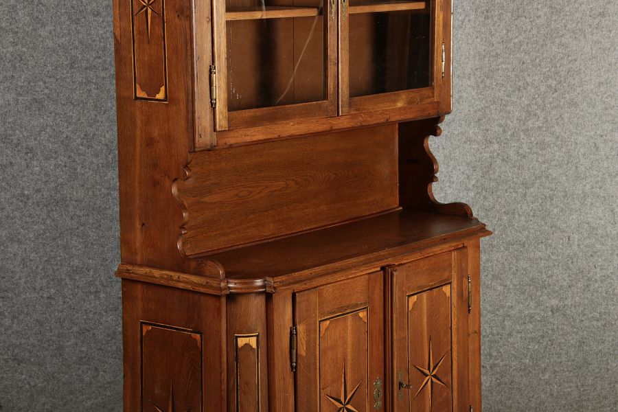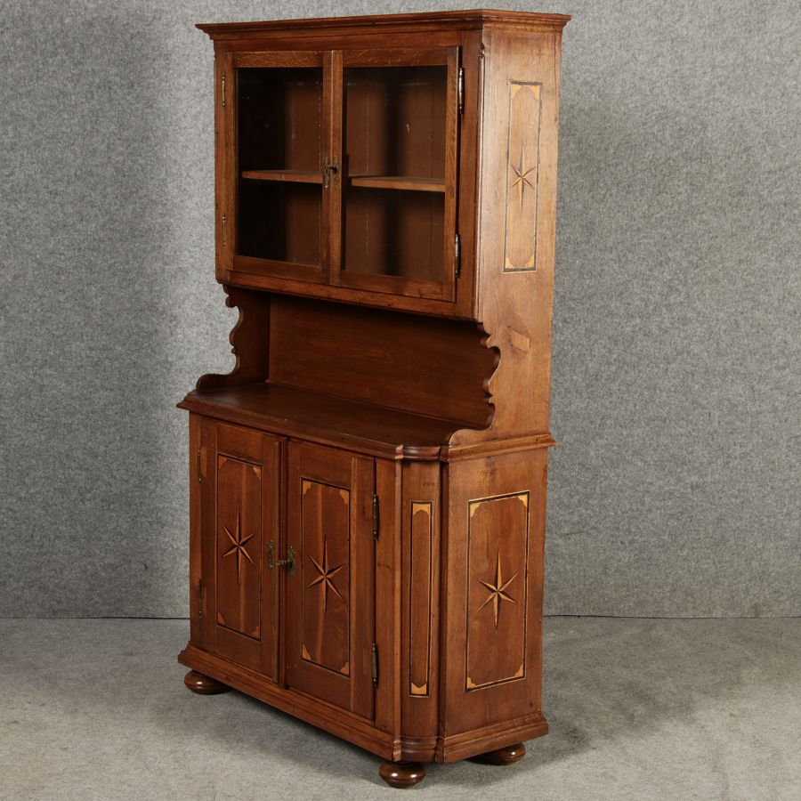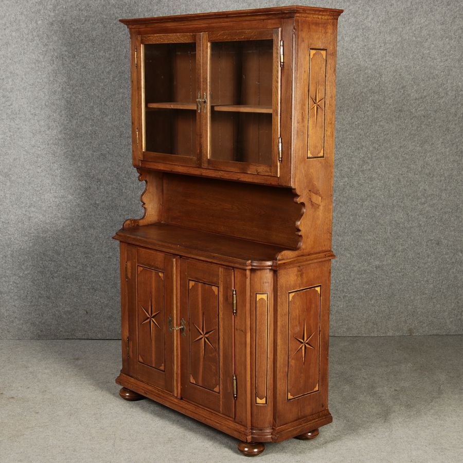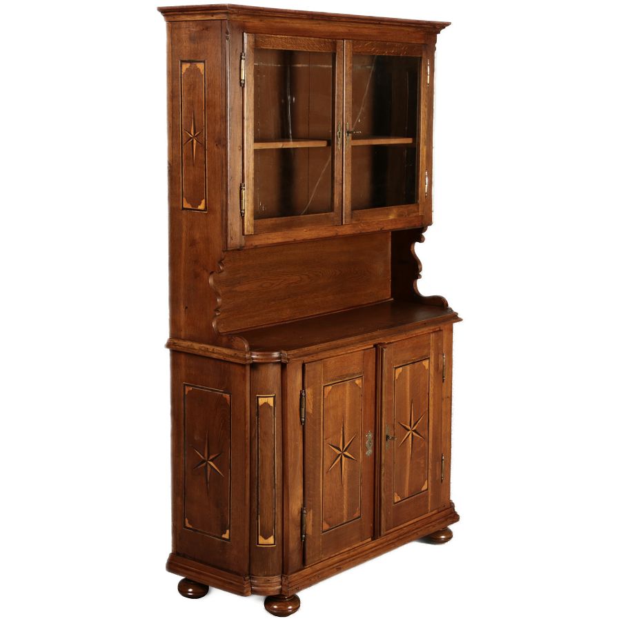 Dieser antike Buffet-Schrank aus massivem Holz kombiniert klassischen Stauraum mit edlen Verzierungen. Die schlichte Eleganz der verglasten oberen Schranktüren wird durch die kunstvollen Intarsien auf den unteren Türen kontrastiert, die einen stilvollen Stern als zentrales Motiv zeigen. Das Möbelstück stammt vermutlich aus der zweiten Hälfte des 18. Jahrhunderts und bietet sowohl praktischen Stauraum als auch dekorative Elemente. Der Schrank ist zweiteilig aufgebaut. Im oberen Teil befinden sich zwei Glastüren, hinter denen sich ein Regal befindet, das ideal zur Präsentation von Geschirr oder Dekorationsobjekten geeignet ist. Der untere Teil bietet zwei Türen mit großzügigem Stauraum. Die kunstvollen Intarsien mit Sternmotiv verleihen dem Möbelstück einen besonderen Akzent. Auf den unteren Türen sind kunstvolle Intarsien in Form eines Sterns zu finden, die das Design besonders hervorheben. Die Scharniere und Griffe aus Metall unterstreichen den antiken Charakter. Dieser Schrank eignet sich hervorragend als dekoratives und praktisches Möbelstück in Esszimmern, Wohnräumen oder Fluren. Die Glastüren ermöglichen eine ansprechende Präsentation von besonderen Sammlerstücken oder Geschirr, während die unteren Fächer zusätzlichen Stauraum bieten. |