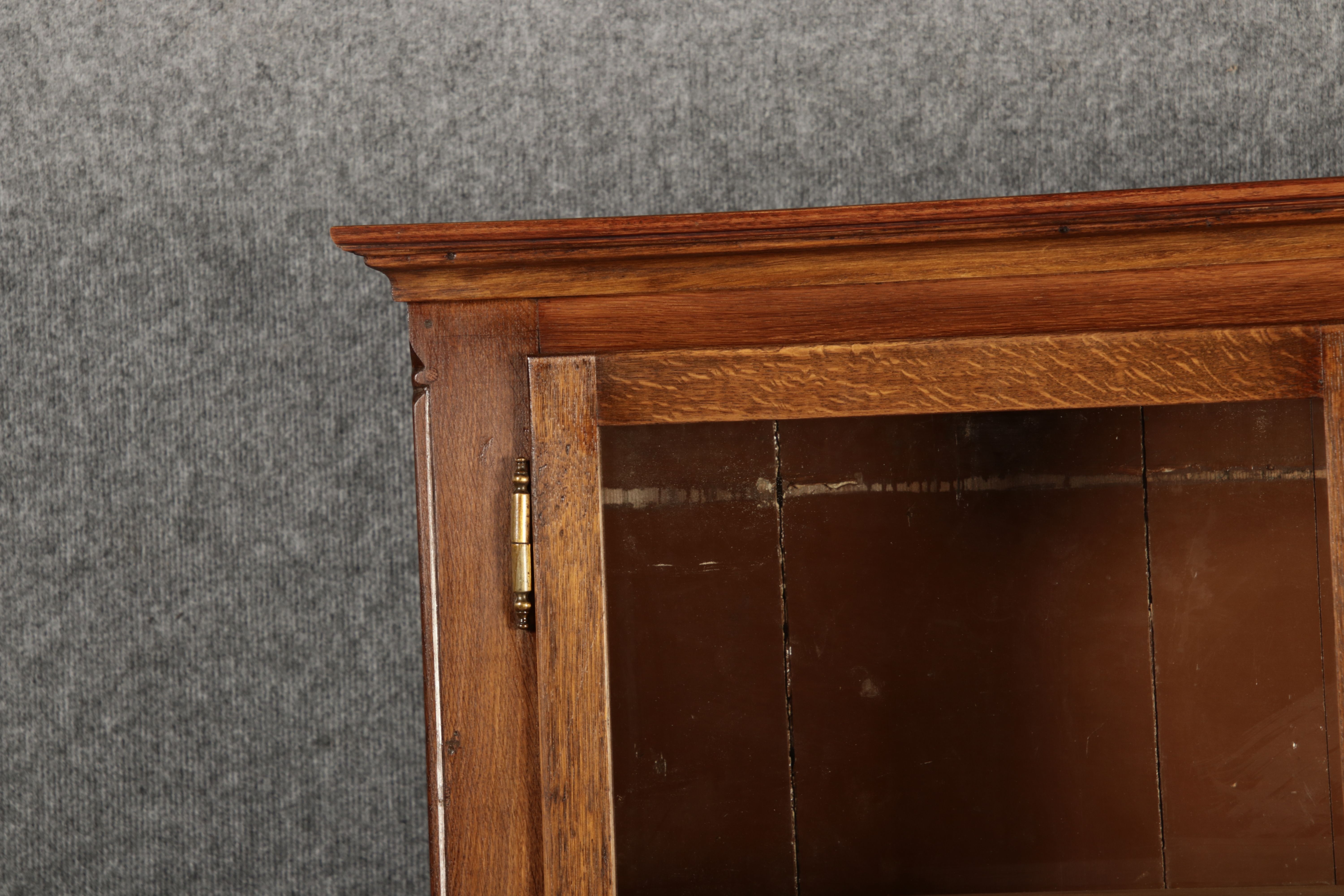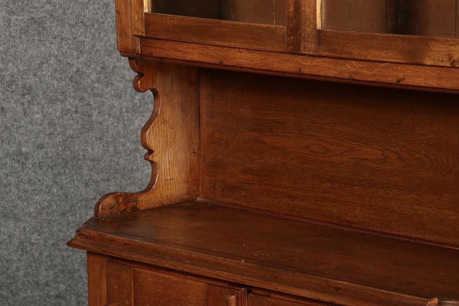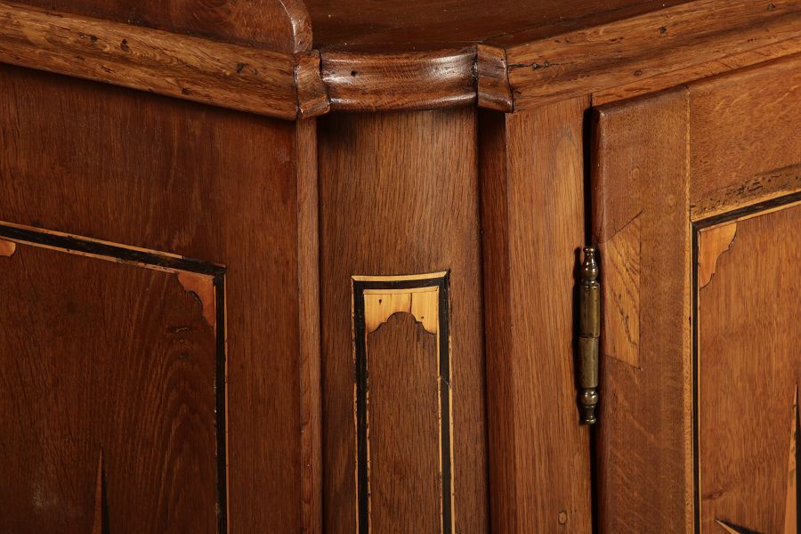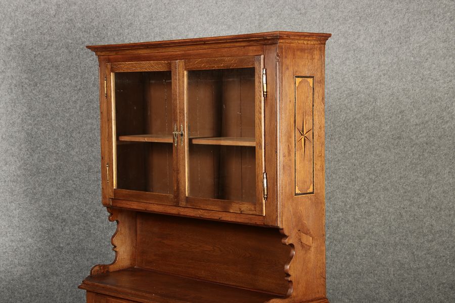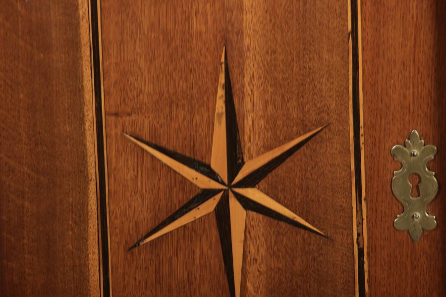 Dieser antike Buffet-Schrank aus massivem Holz kombiniert klassischen Stauraum mit edlen Verzierungen. Die schlichte Eleganz der verglasten oberen Schranktüren wird durch die kunstvollen Intarsien auf den unteren Türen kontrastiert, die einen stilvollen Stern als zentrales Motiv zeigen. Das Möbelstück stammt vermutlich aus der zweiten Hälfte des 18. Jahrhunderts und bietet sowohl praktischen Stauraum als auch dekorative Elemente. Der Schrank ist zweiteilig aufgebaut. Im oberen Teil befinden sich zwei Glastüren, hinter denen sich ein Regal befindet, das ideal zur Präsentation von Geschirr oder Dekorationsobjekten geeignet ist. Der untere Teil bietet zwei Türen mit großzügigem Stauraum. Die kunstvollen Intarsien mit Sternmotiv verleihen dem Möbelstück einen besonderen Akzent. Auf den unteren Türen sind kunstvolle Intarsien in Form eines Sterns zu finden, die das Design besonders hervorheben. Die Scharniere und Griffe aus Metall unterstreichen den antiken Charakter. Dieser Schrank eignet sich hervorragend als dekoratives und praktisches Möbelstück in Esszimmern, Wohnräumen oder Fluren. Die Glastüren ermöglichen eine ansprechende Präsentation von besonderen Sammlerstücken oder Geschirr, während die unteren Fächer zusätzlichen Stauraum bieten. |