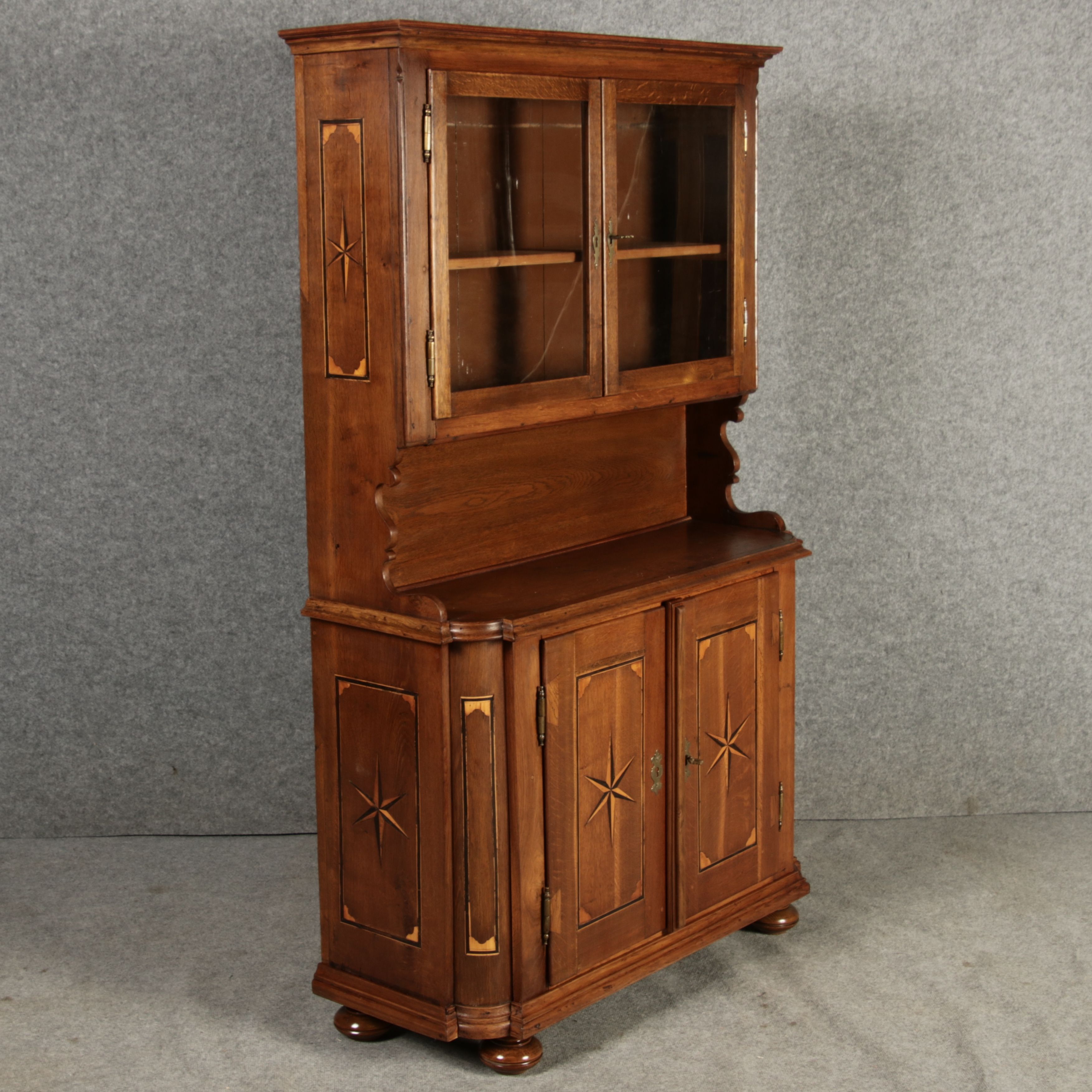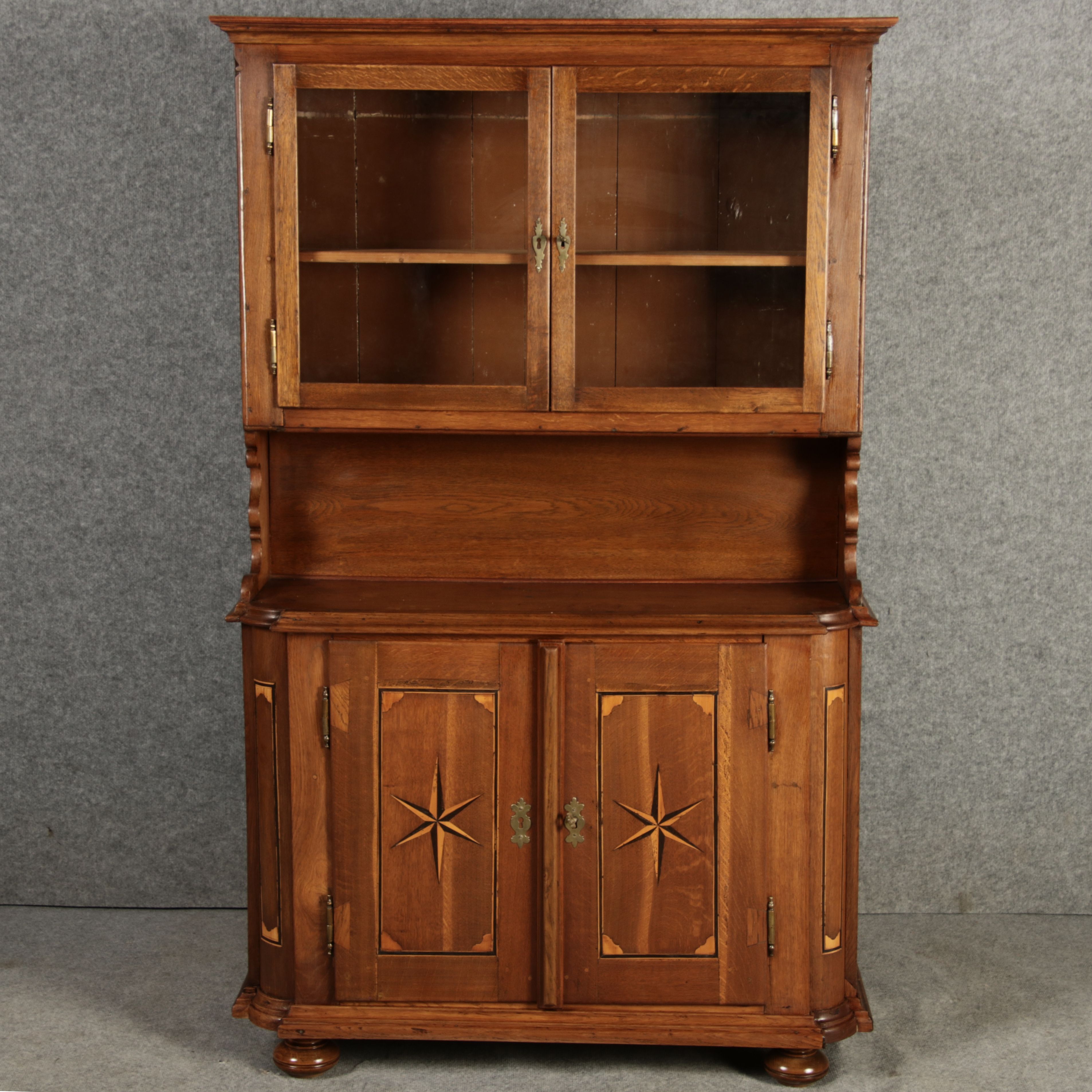 Kleiner Antiker Buffet-Schrank mit Glastüren und Intarsien (18. Jahrhundert) Dieser antike Buffet-Schrank aus massivem Holz kombiniert klassischen Stauraum mit edlen Verzierungen. Die schlichte Eleganz der verglasten oberen Schranktüren wird durch die kunstvollen Intarsien auf den unteren Türen kontrastiert, die einen stilvollen Stern als zentrales Motiv zeigen. Das Möbelstück stammt vermutlich aus der zweiten Hälfte des 18. Jahrhunderts und bietet sowohl praktischen Stauraum als auch dekorative Elemente. Der Schrank ist zweiteilig aufgebaut. Im oberen Teil befinden sich zwei Glastüren, hinter denen sich ein Regal befindet, das ideal zur Präsentation von Geschirr oder Dekorationsobjekten geeignet ist. Der untere Teil bietet zwei Türen mit großzügigem Stauraum. Die kunstvollen Intarsien mit Sternmotiv verleihen dem Möbelstück einen besonderen Akzent. Auf den unteren Türen sind kunstvolle Intarsien in Form eines Sterns zu finden, die das Design besonders hervorheben. Die Scharniere und Griffe aus Metall unterstreichen den antiken Charakter. Dieser Schrank eignet sich hervorragend als dekoratives und praktisches Möbelstück in Esszimmern, Wohnräumen oder Fluren. Die Glastüren ermöglichen eine ansprechende Präsentation von besonderen Sammlerstücken oder Geschirr, während die unteren Fächer zusätzlichen Stauraum bieten.ArtikelNummer /number: buf114