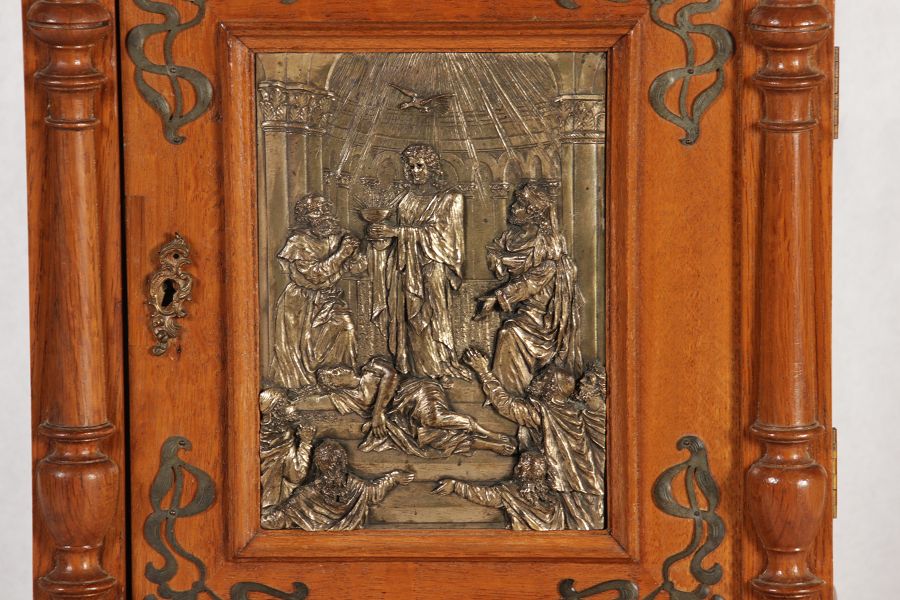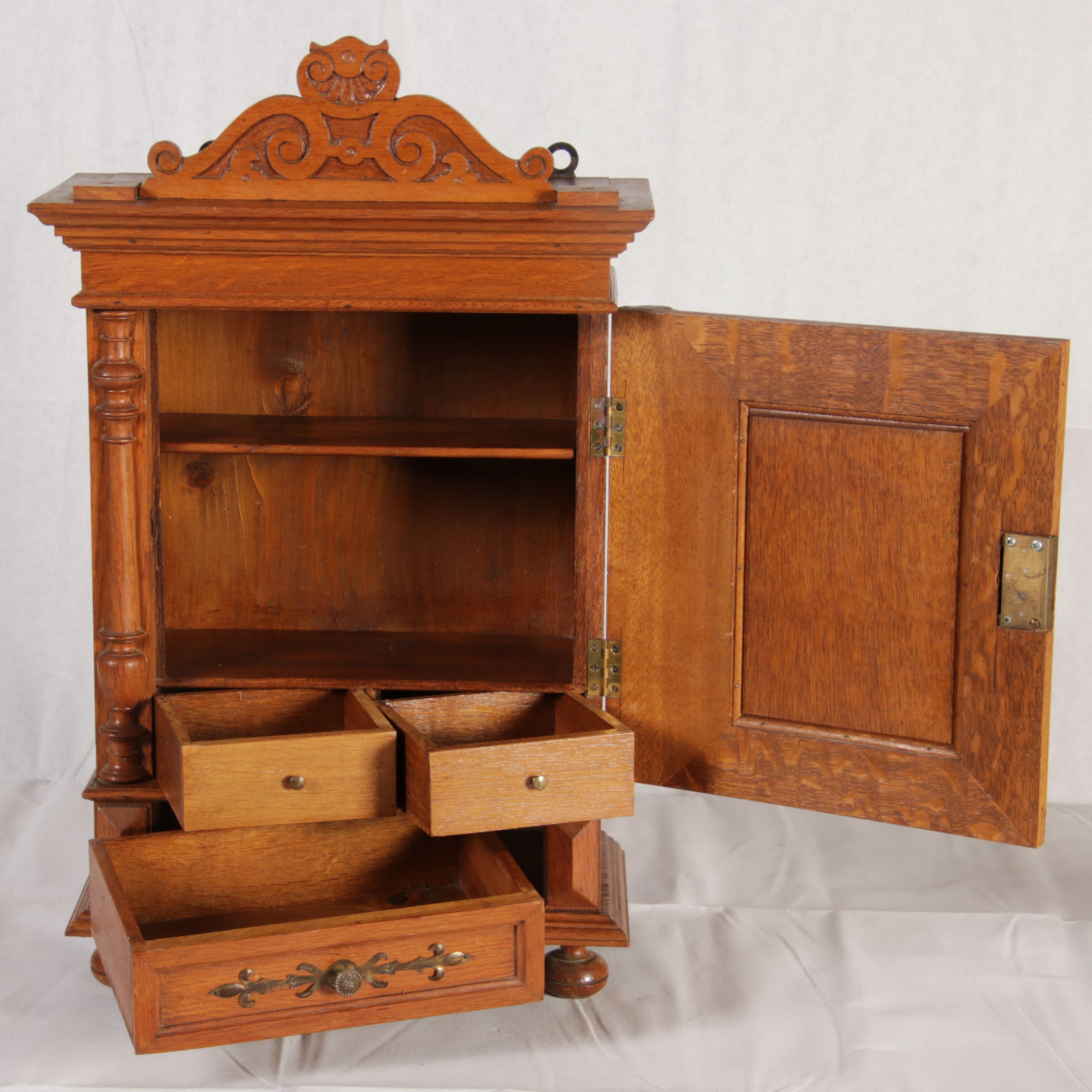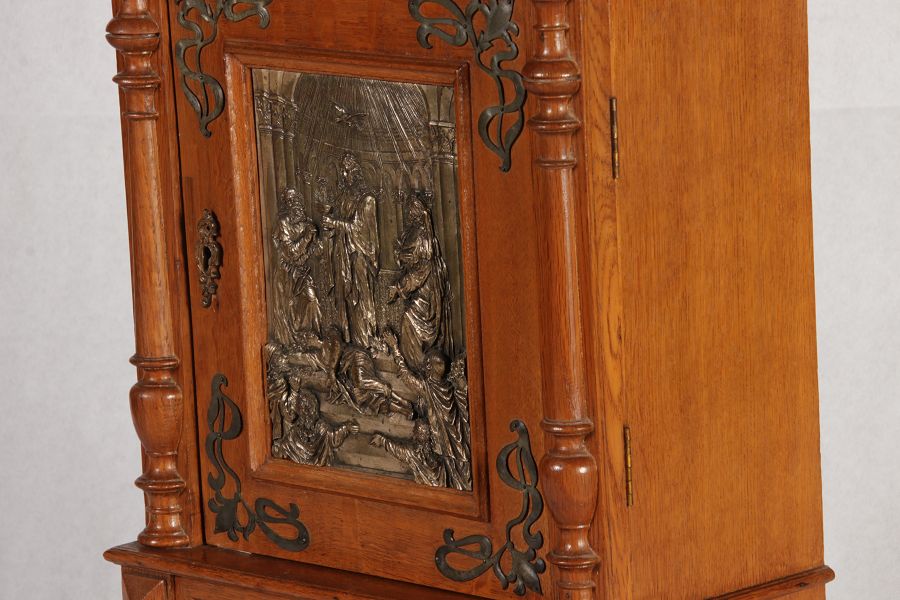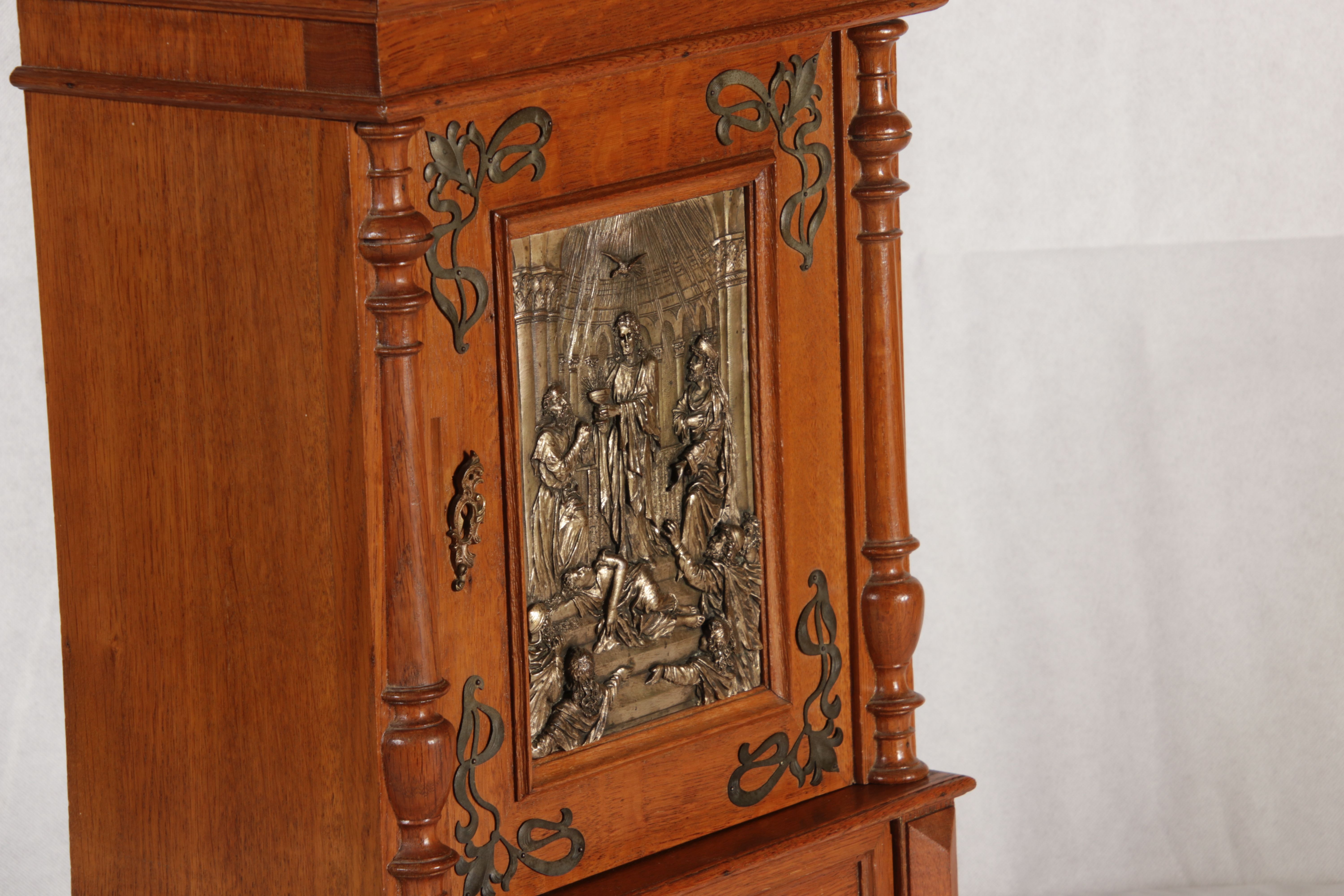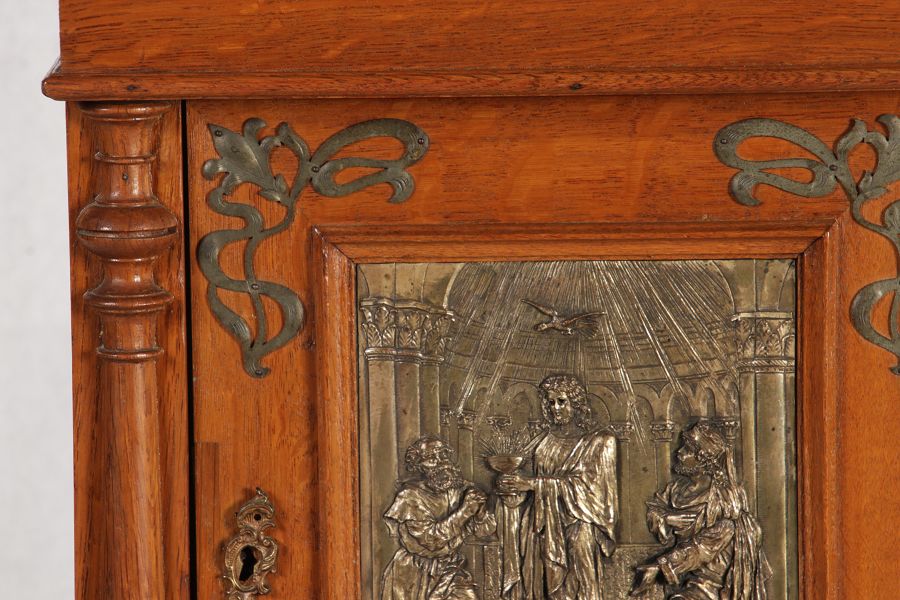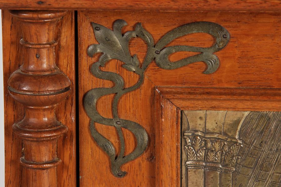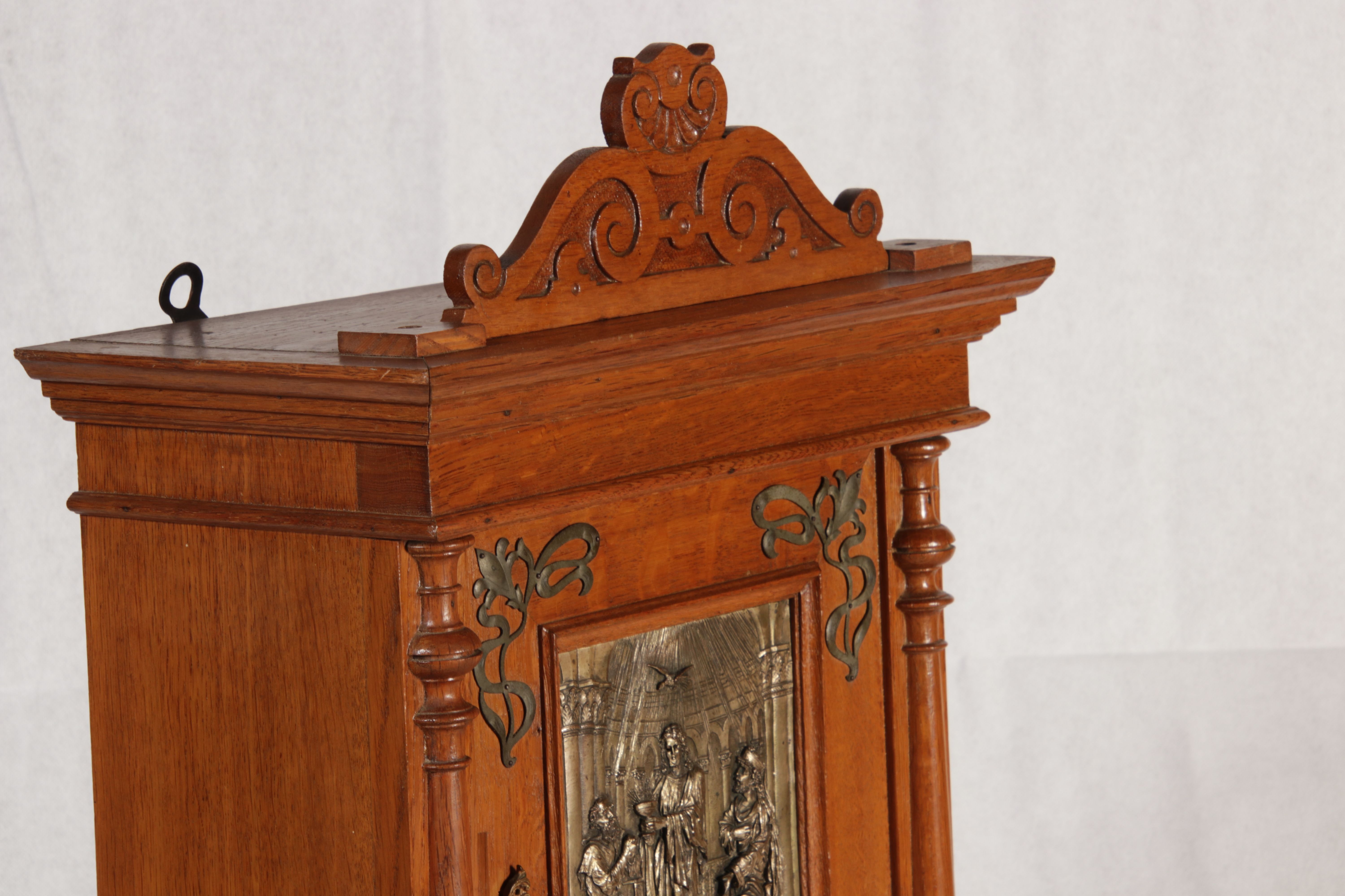 | Antikes Hängeschränkchen Wandkasten Jugendstiel Eiche Messing Relief um 1900 | ||