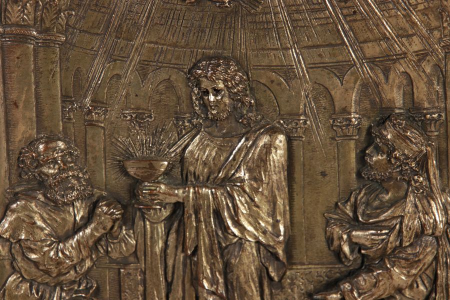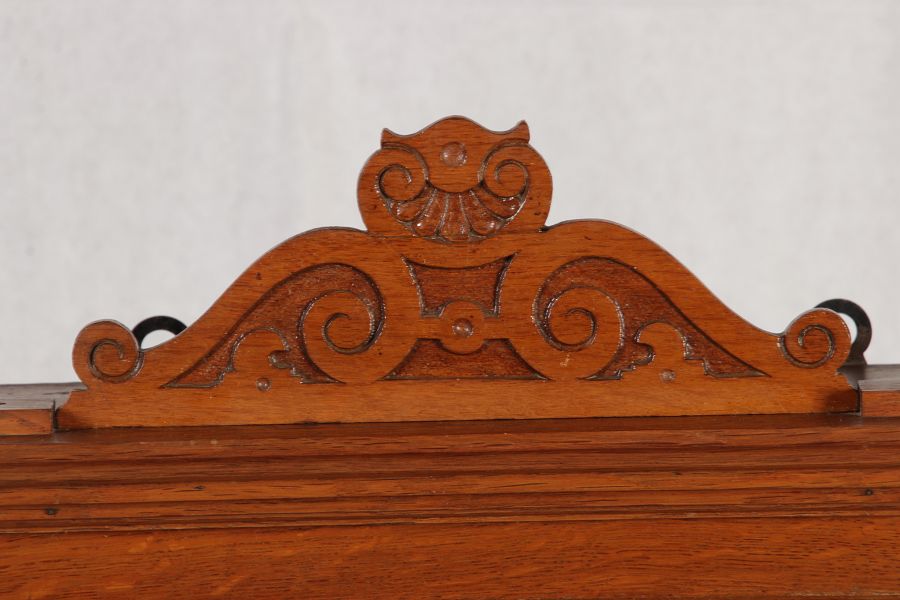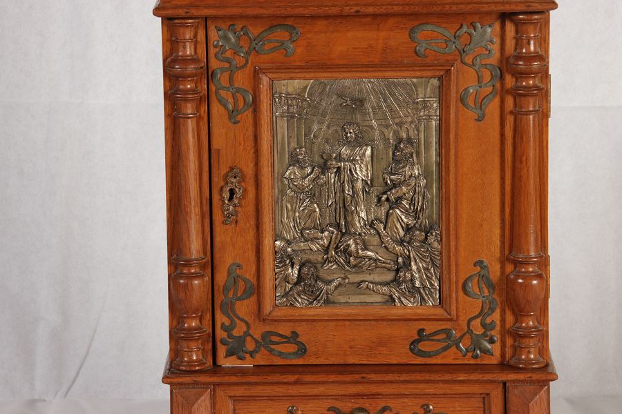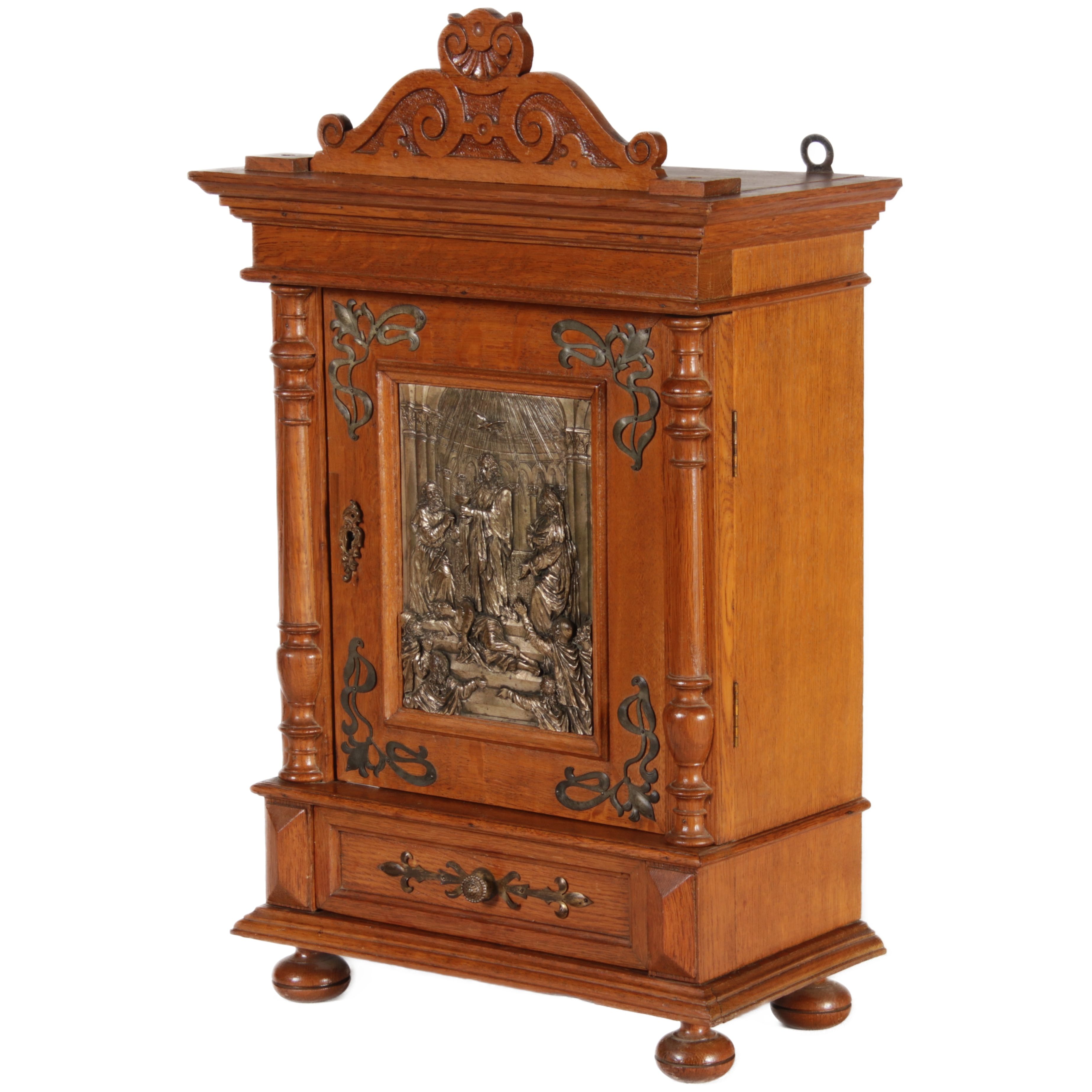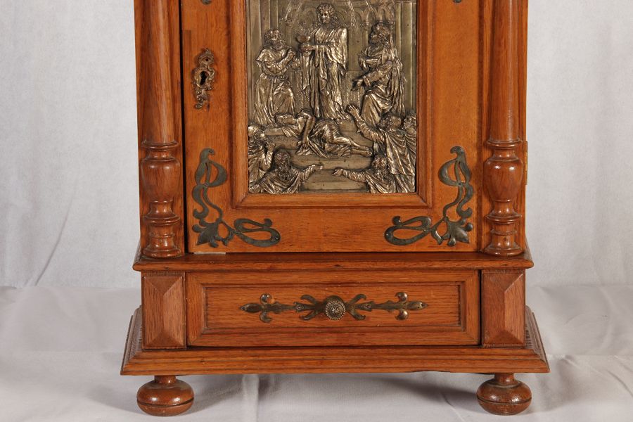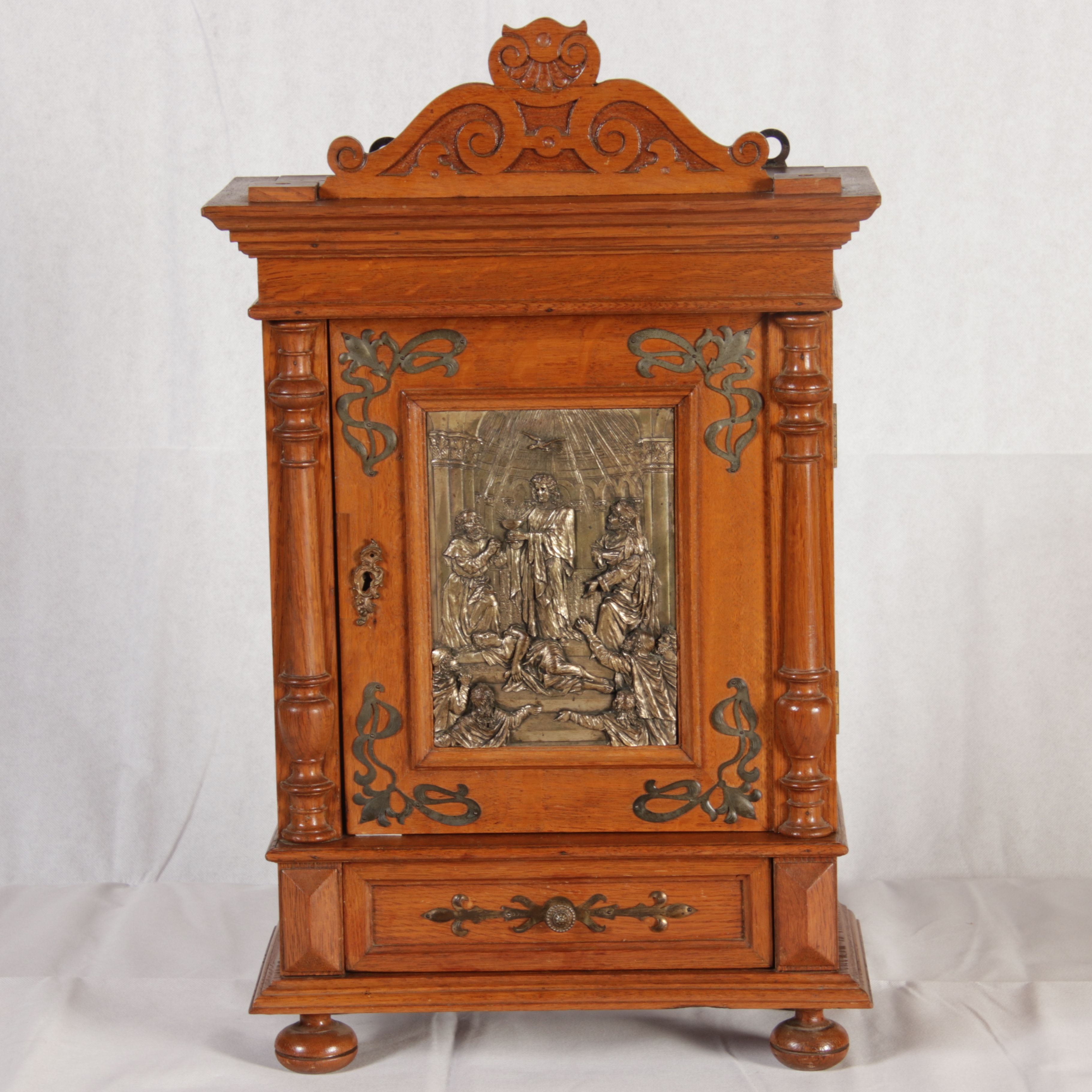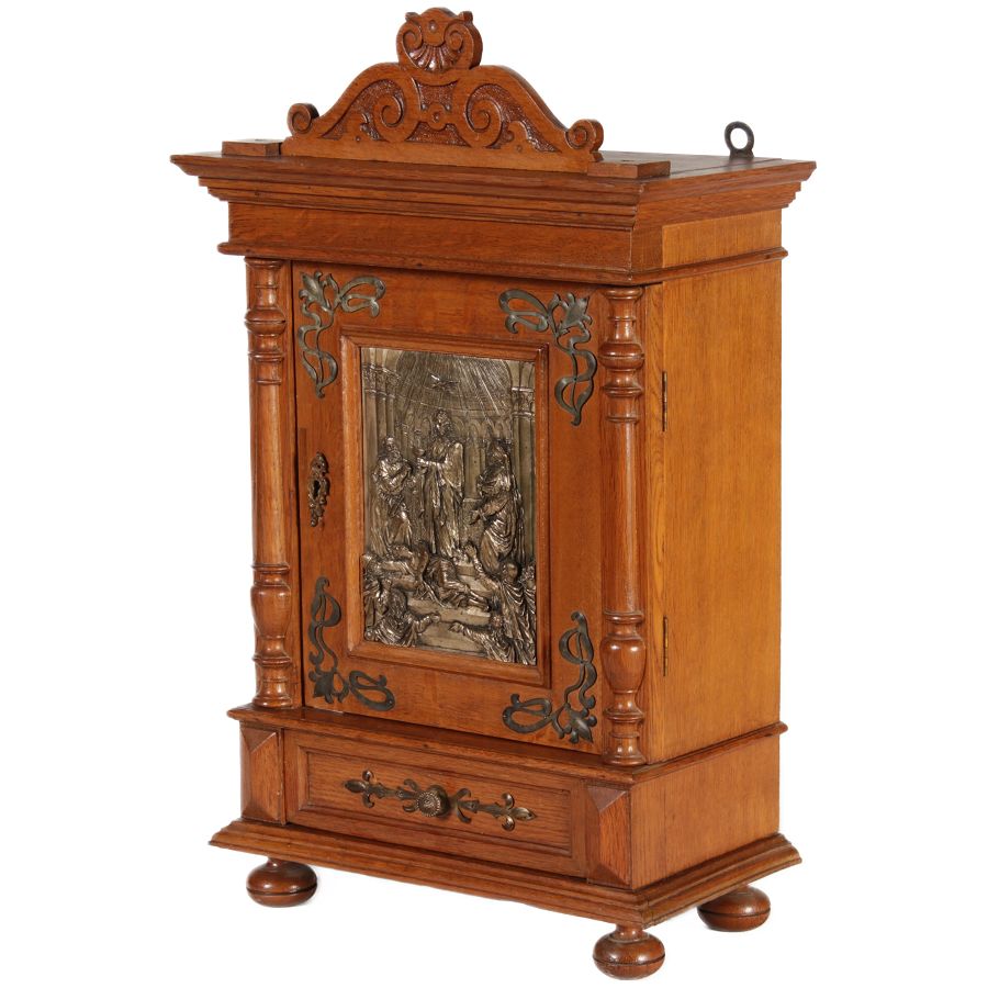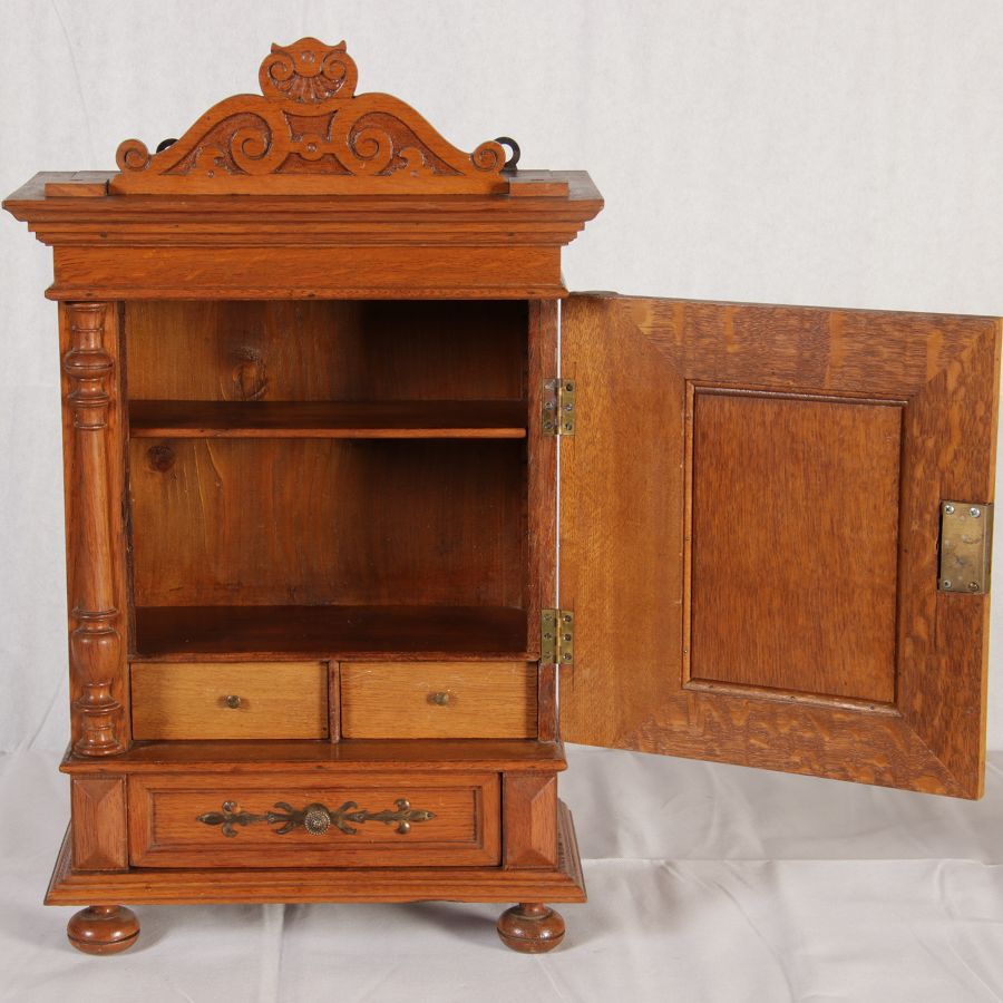 | Antikes Hängeschränkchen Wandkasten Jugendstiel Eiche Messing Relief um 1900 | ||