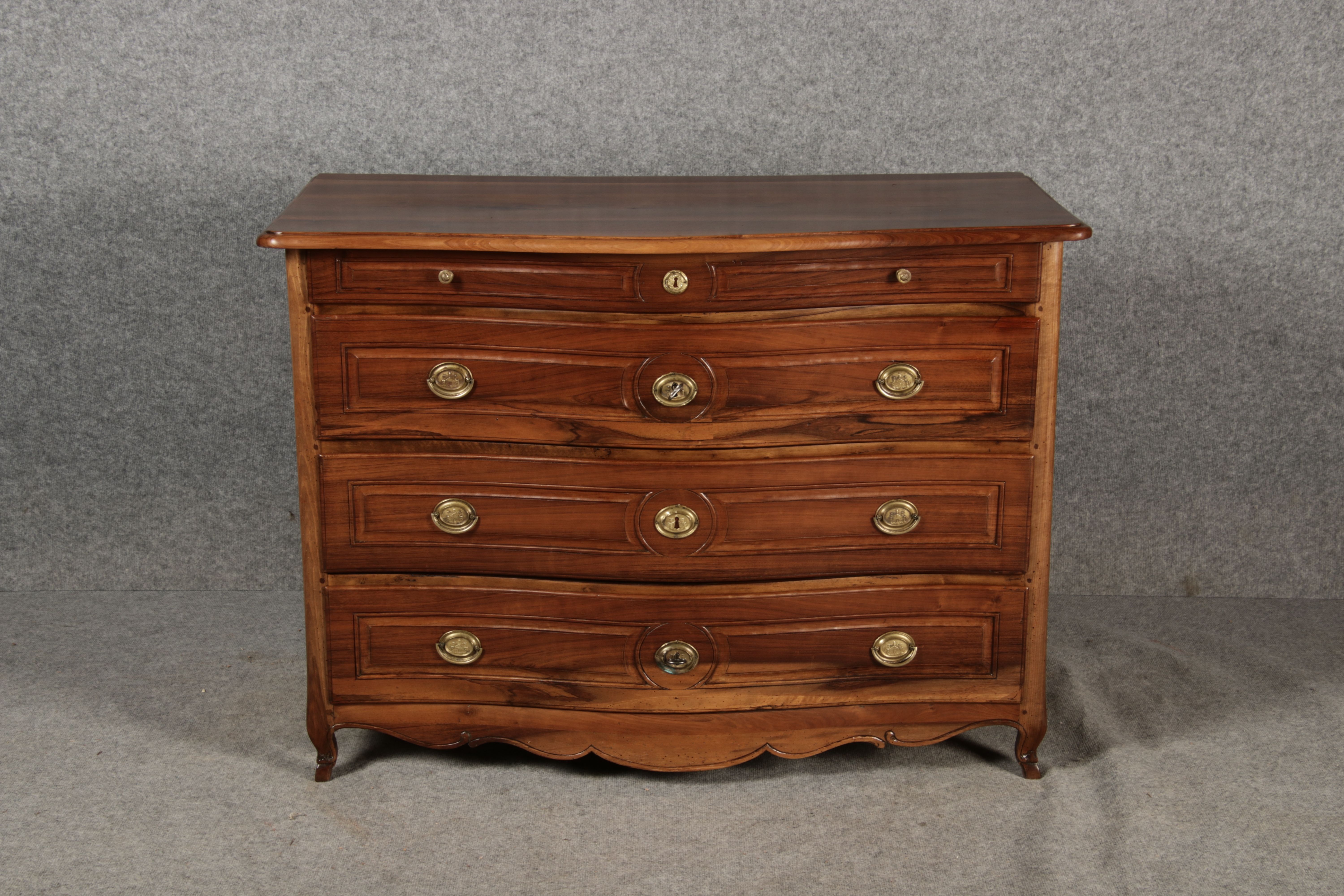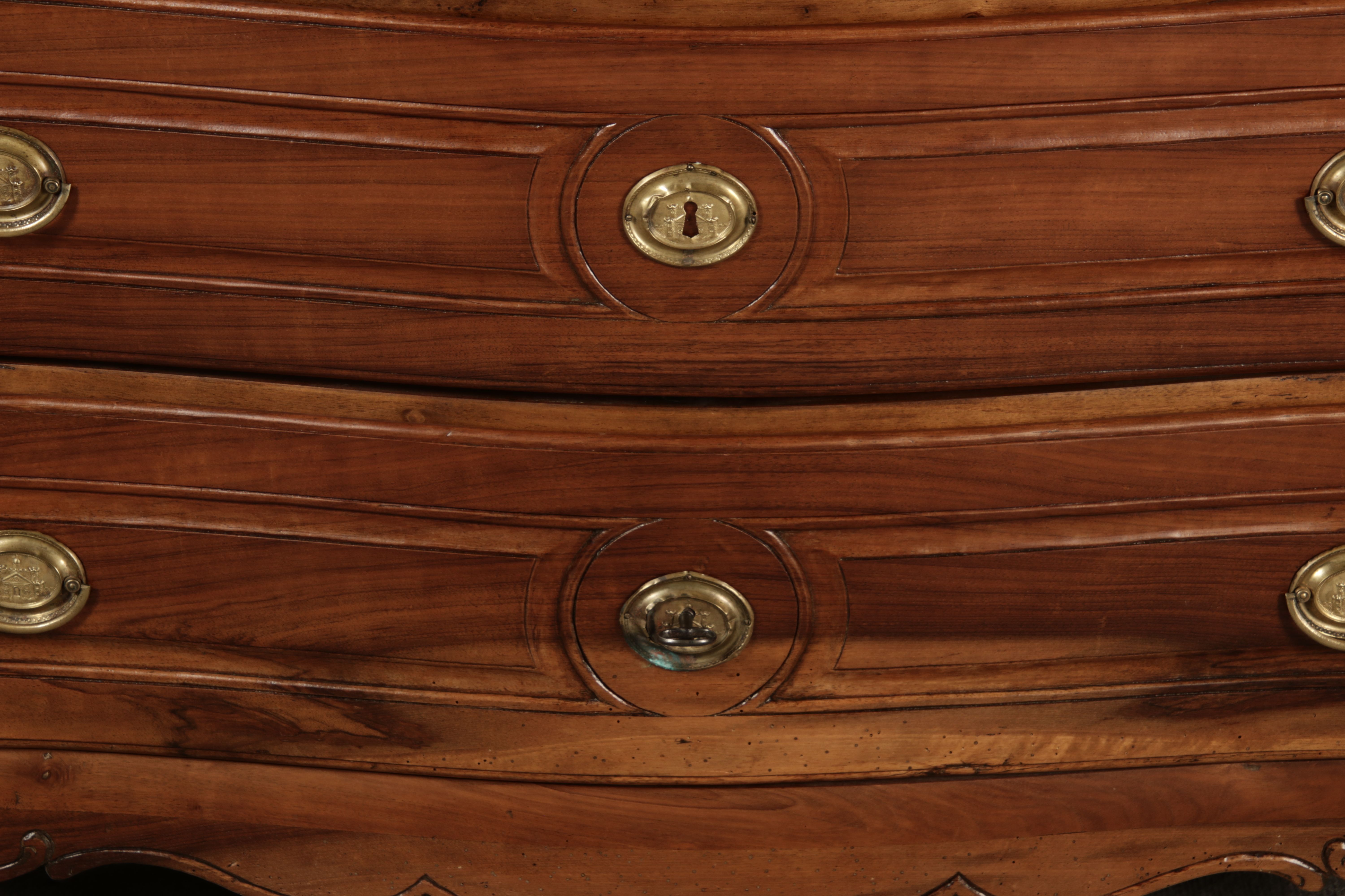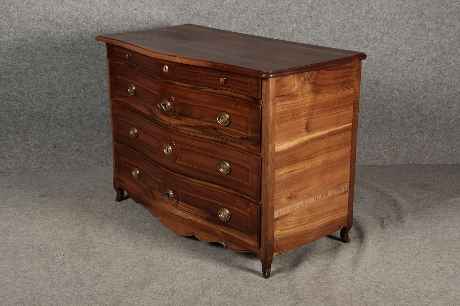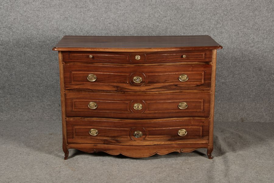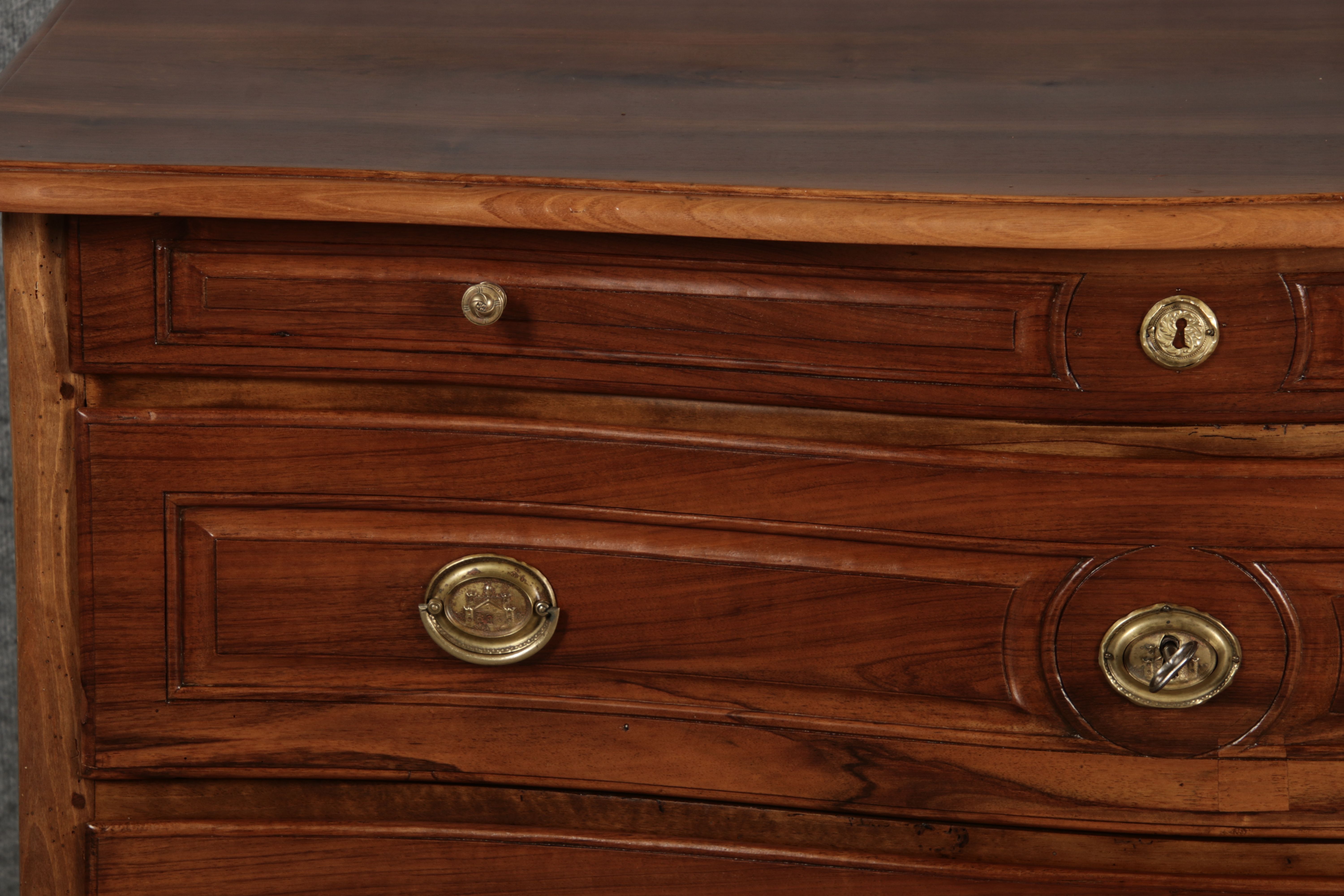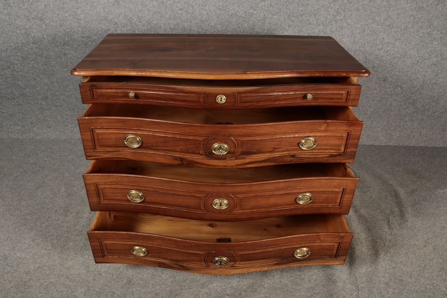 Beschreibung/description: Nussbaumkommode, 18. Jahrhundert Die Kommode verfügt über vier geräumige Schubladen. Jede Schublade ist mit, kunstvoll gestalteten Messingbeschlägen und Schlüsselschildern ausgestattet, die den historischen Charakter unterstreichen. Die geschwungene Front sowie die leicht geschwungene Zarge verleihen dem Möbelstück eine grazile Leichtigkeit, die von den geschwungenen Beinen harmonisch ergänzt wird. Der geschweifte Sockel und die fein geschliffene Deckplatte runden das harmonische Gesamtbild ab. Dieses zeitlose Möbelstück fügt sich mühelos in klassisch wie auch modern eingerichtete Räume ein und bietet zugleich praktischen Stauraum und ästhetische Schönheit.