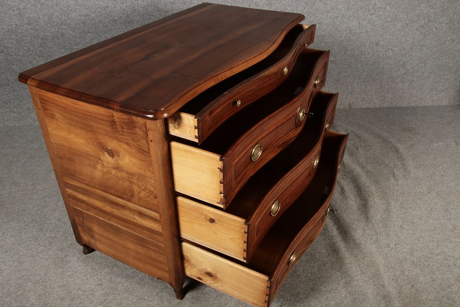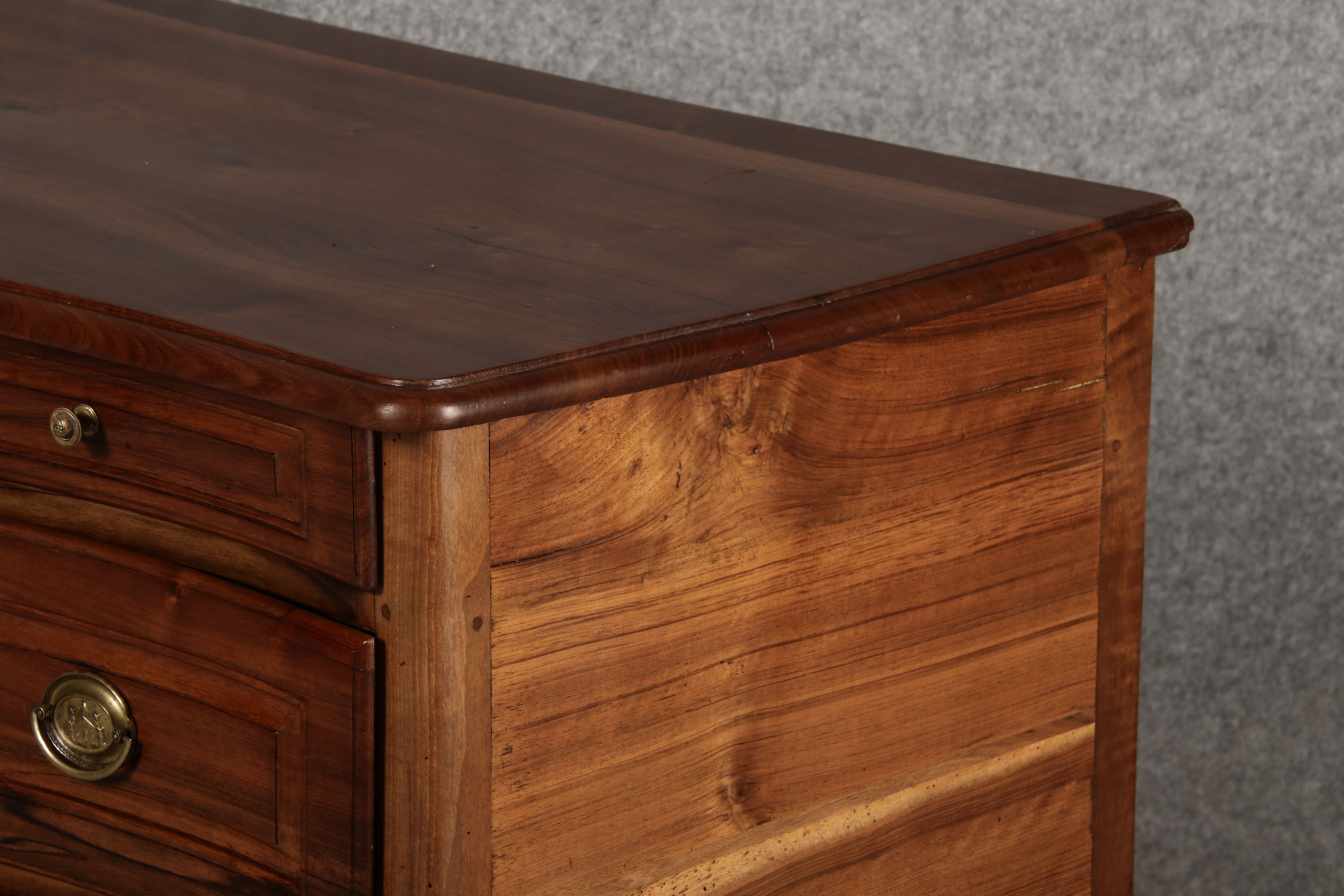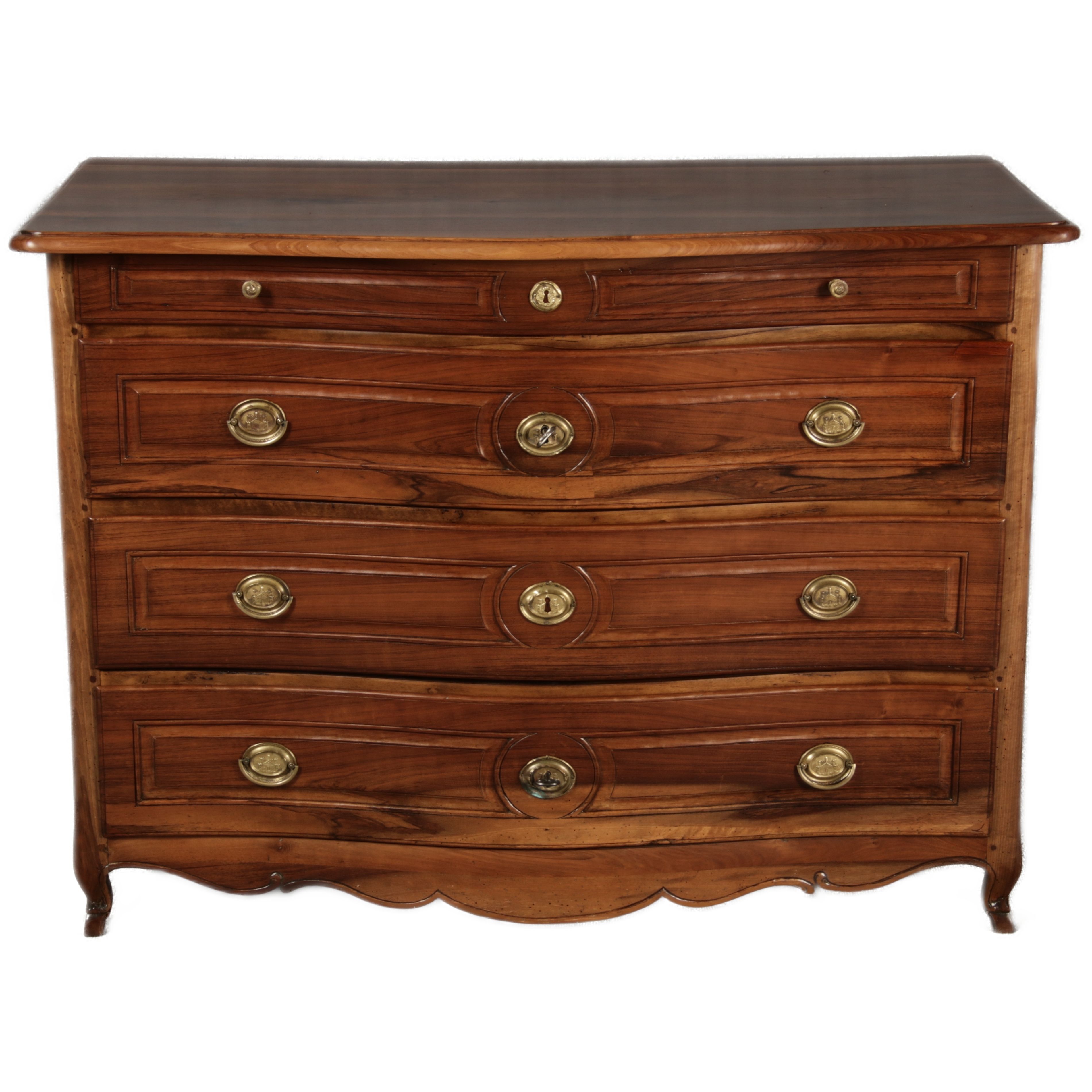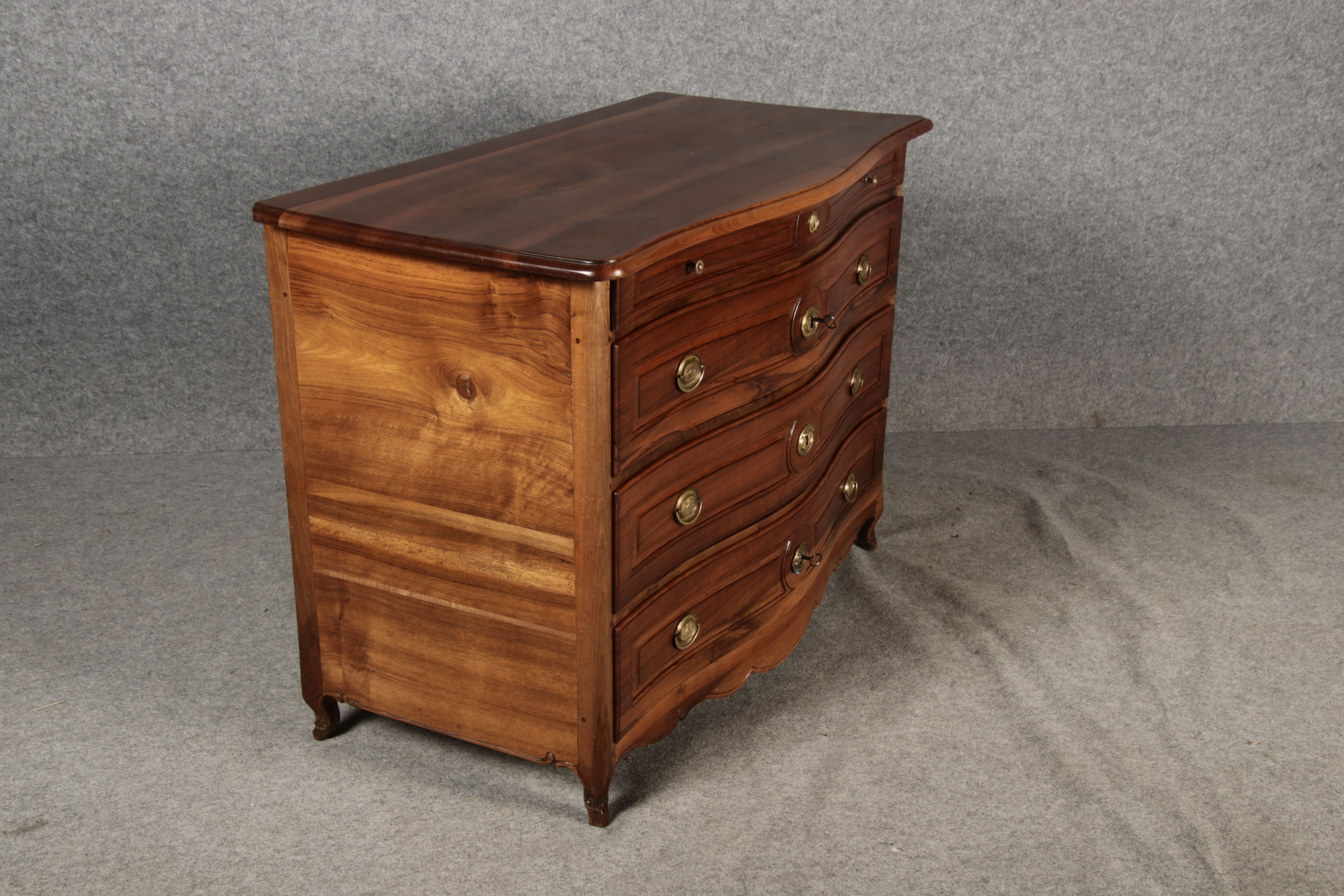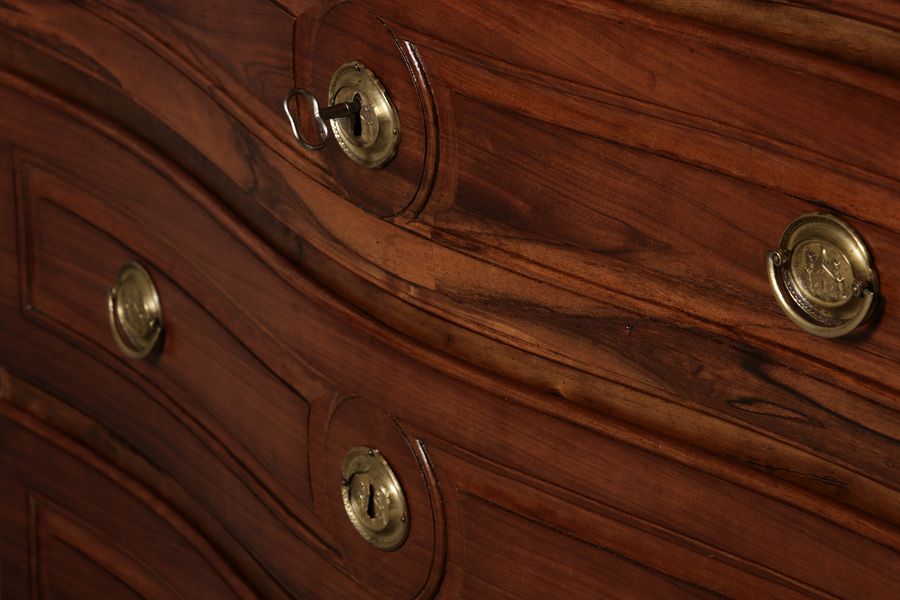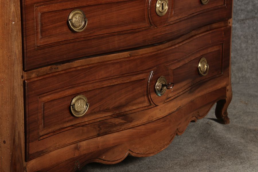 Beschreibung/description: Nussbaumkommode, 18. Jahrhundert Die Kommode verfügt über vier geräumige Schubladen. Jede Schublade ist mit, kunstvoll gestalteten Messingbeschlägen und Schlüsselschildern ausgestattet, die den historischen Charakter unterstreichen. Die geschwungene Front sowie die leicht geschwungene Zarge verleihen dem Möbelstück eine grazile Leichtigkeit, die von den geschwungenen Beinen harmonisch ergänzt wird. Der geschweifte Sockel und die fein geschliffene Deckplatte runden das harmonische Gesamtbild ab. Dieses zeitlose Möbelstück fügt sich mühelos in klassisch wie auch modern eingerichtete Räume ein und bietet zugleich praktischen Stauraum und ästhetische Schönheit.