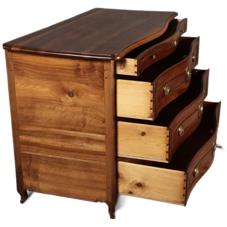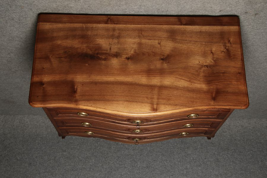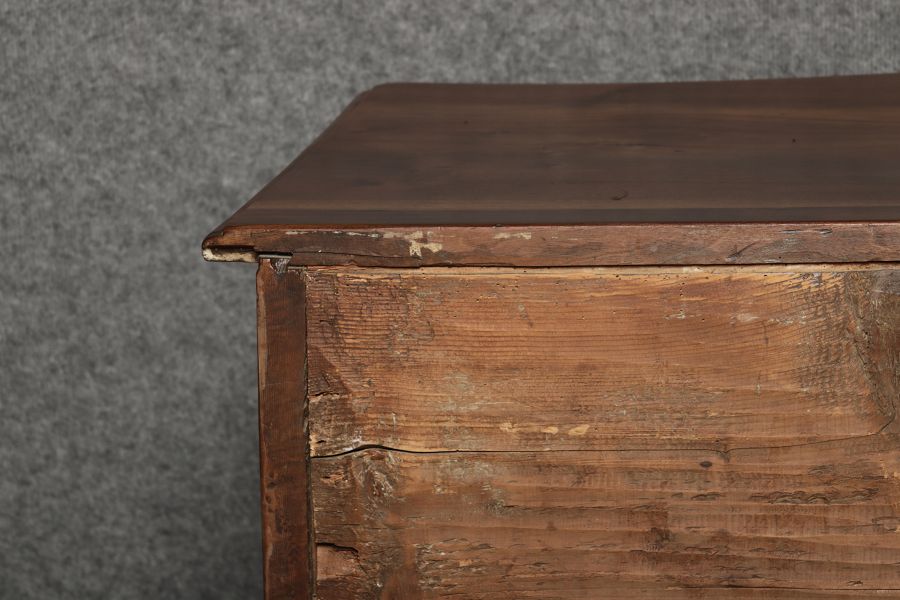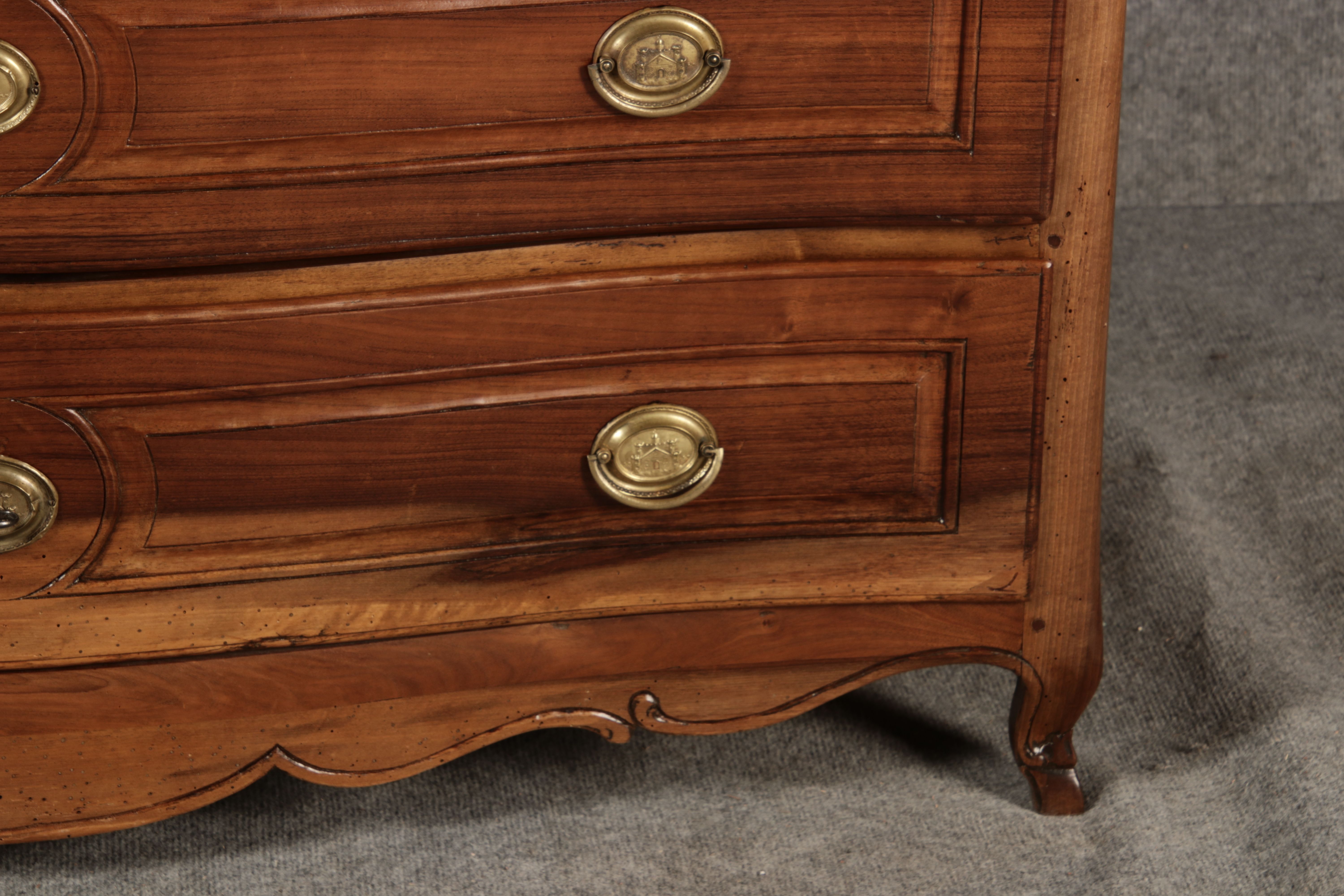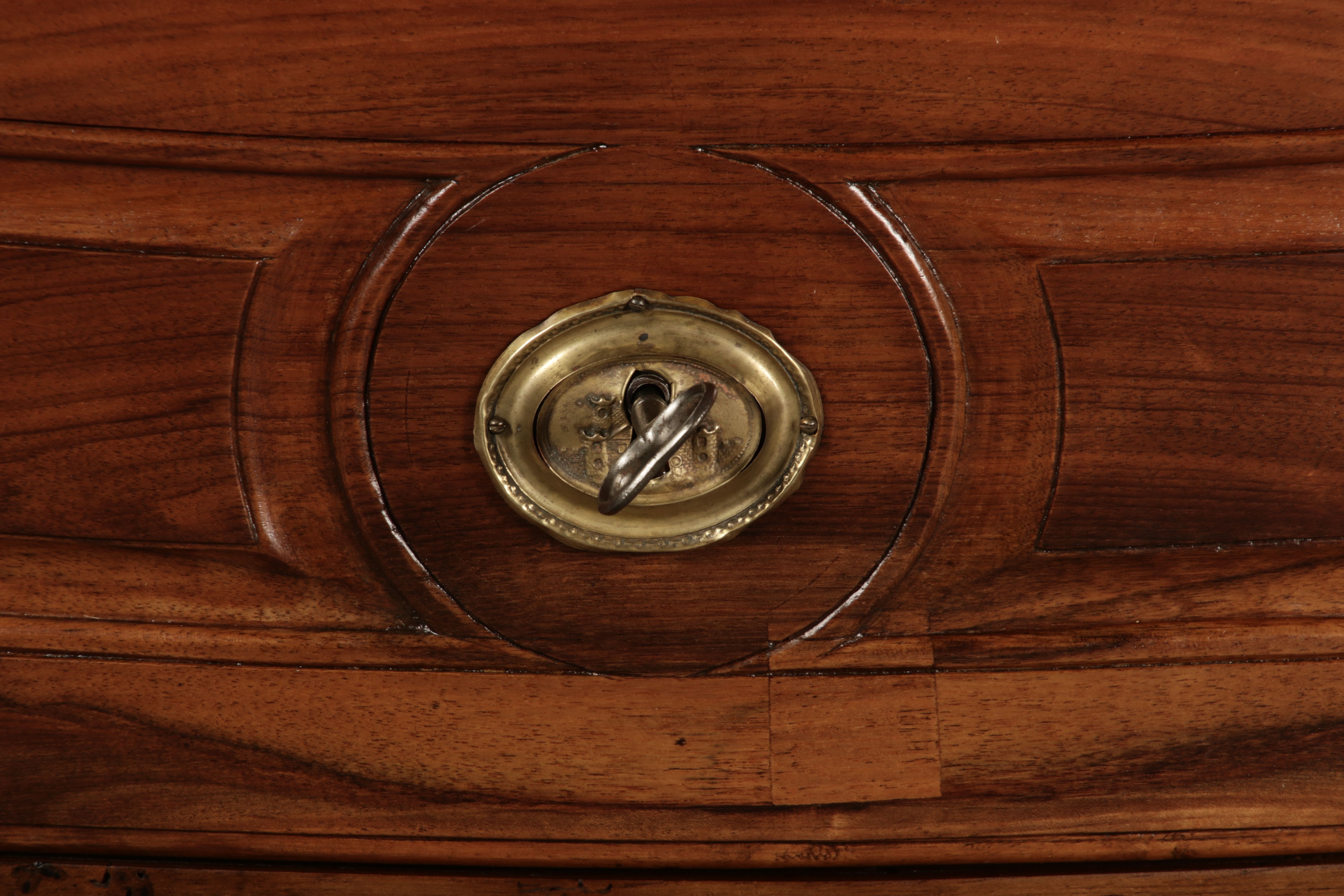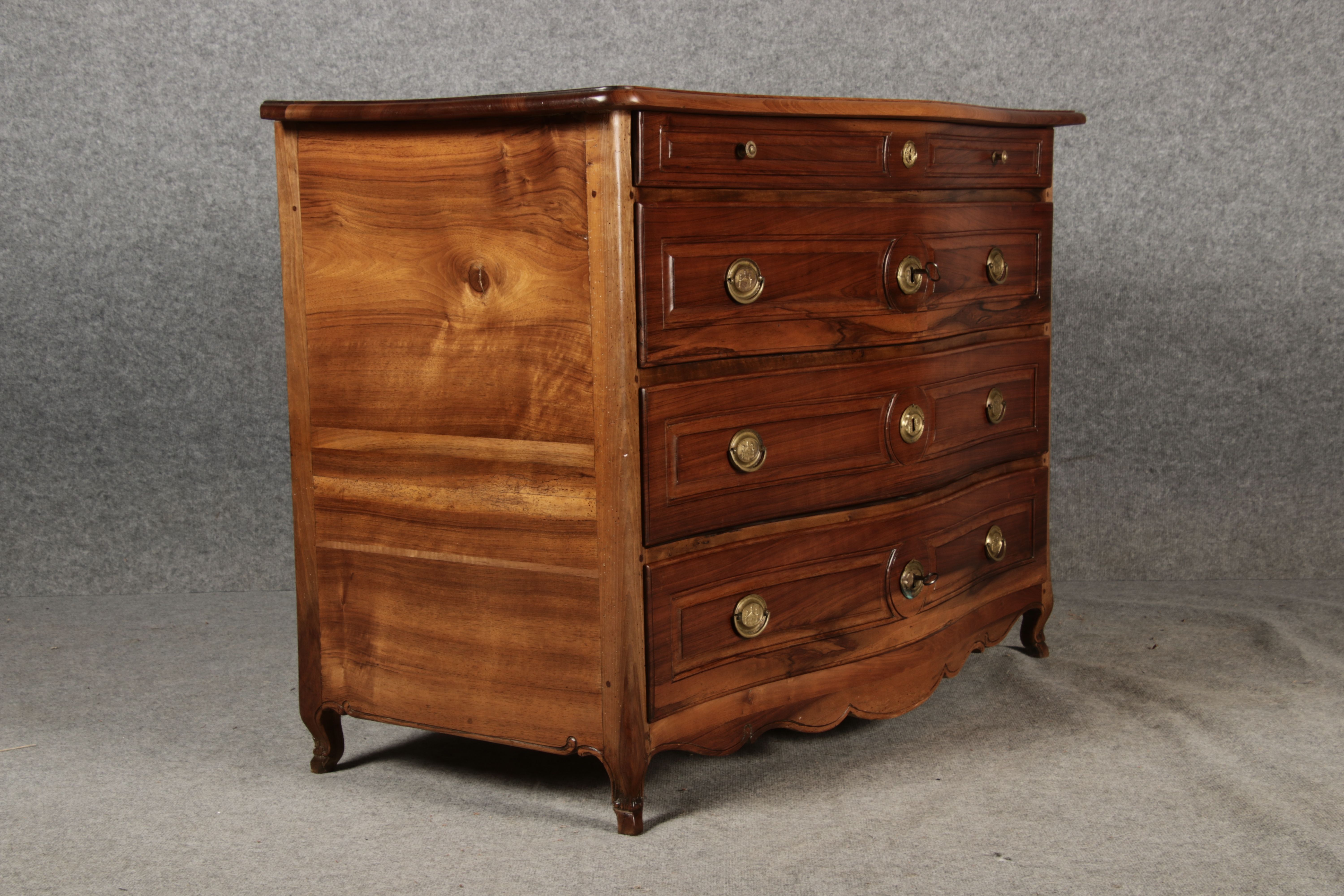 Beschreibung/description: Nussbaumkommode, 18. Jahrhundert Die Kommode verfügt über vier geräumige Schubladen. Jede Schublade ist mit, kunstvoll gestalteten Messingbeschlägen und Schlüsselschildern ausgestattet, die den historischen Charakter unterstreichen. Die geschwungene Front sowie die leicht geschwungene Zarge verleihen dem Möbelstück eine grazile Leichtigkeit, die von den geschwungenen Beinen harmonisch ergänzt wird. Der geschweifte Sockel und die fein geschliffene Deckplatte runden das harmonische Gesamtbild ab. Dieses zeitlose Möbelstück fügt sich mühelos in klassisch wie auch modern eingerichtete Räume ein und bietet zugleich praktischen Stauraum und ästhetische Schönheit.