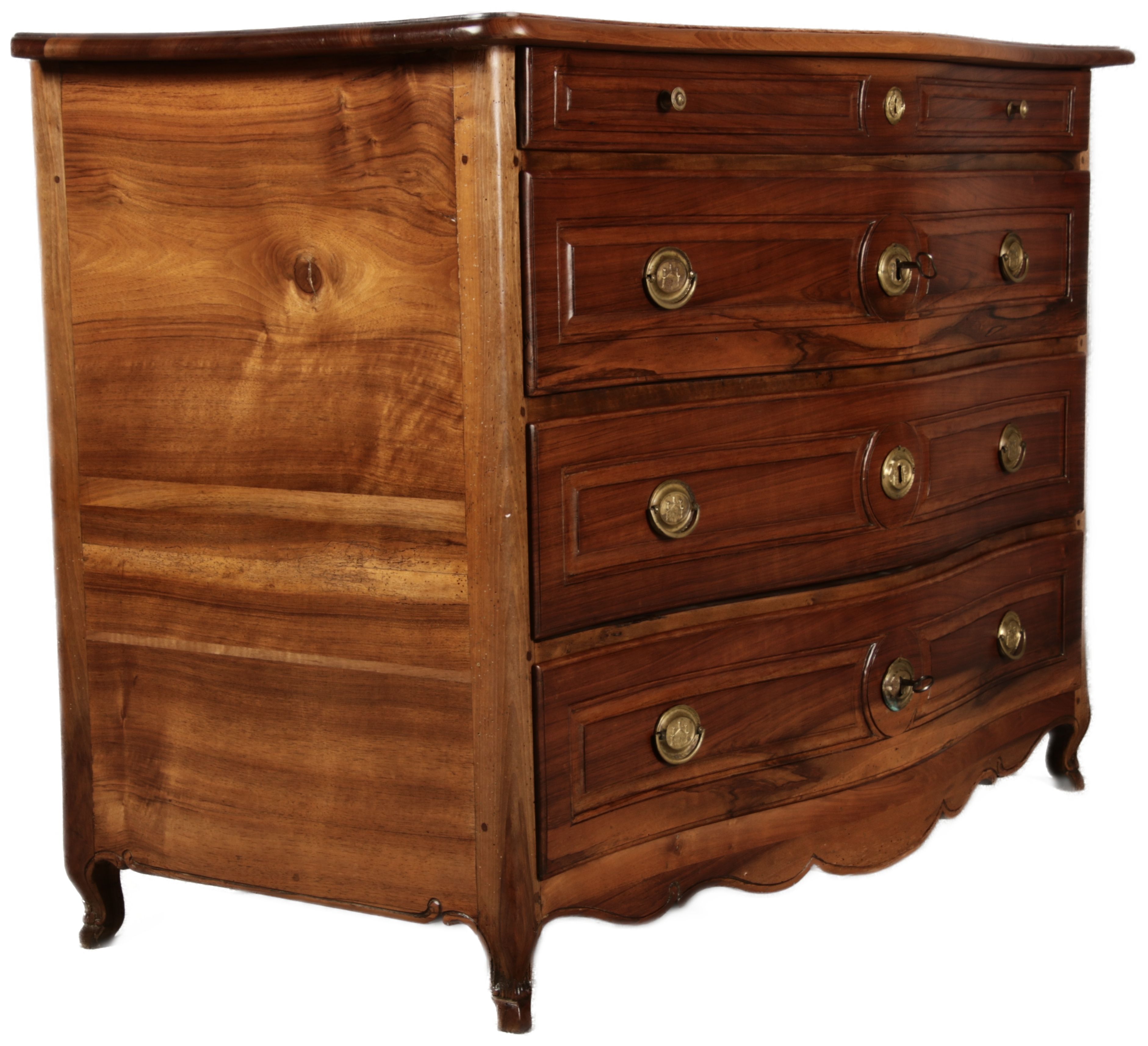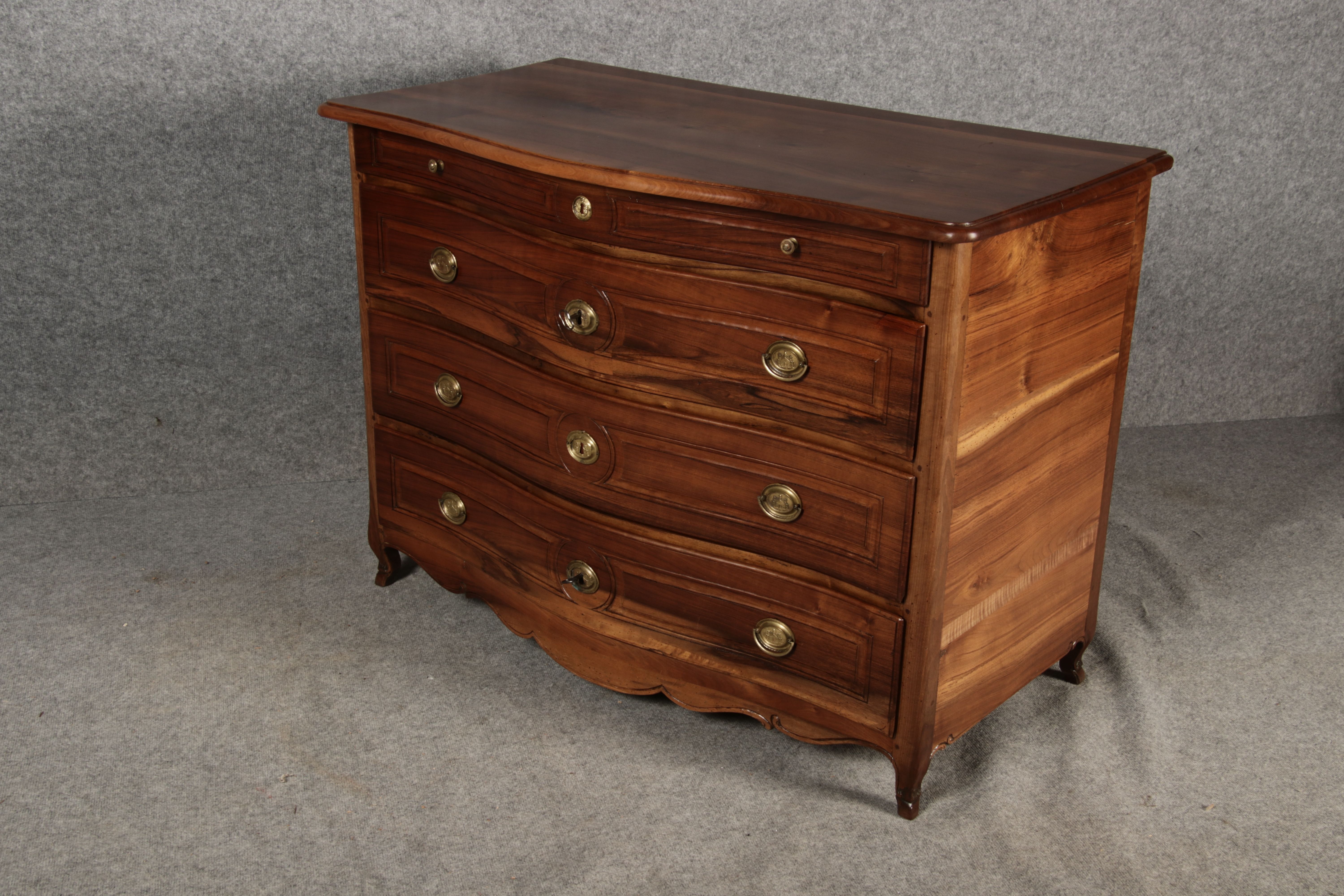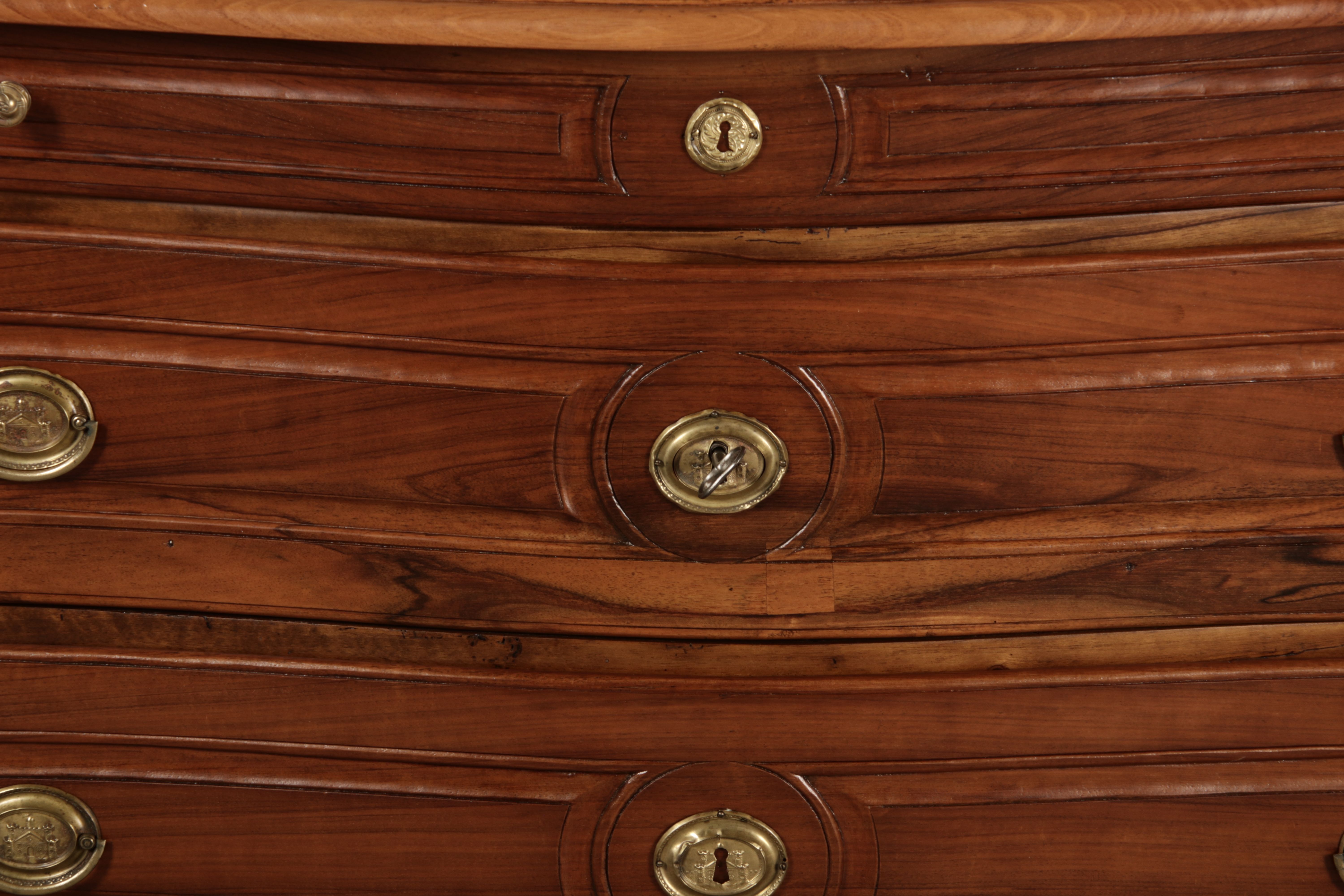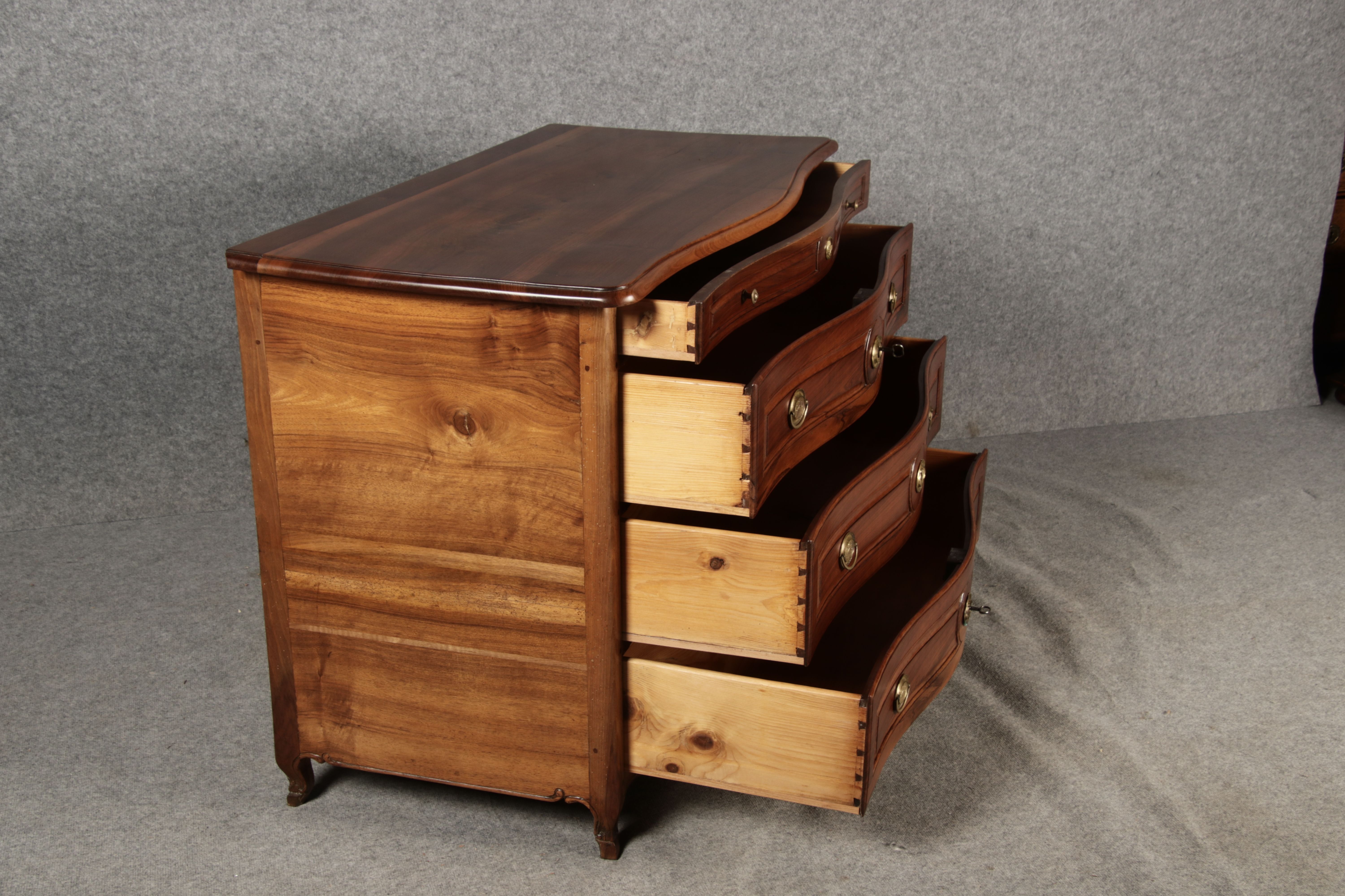 Beschreibung/description: Nussbaumkommode, 18. Jahrhundert Die Kommode verfügt über vier geräumige Schubladen. Jede Schublade ist mit, kunstvoll gestalteten Messingbeschlägen und Schlüsselschildern ausgestattet, die den historischen Charakter unterstreichen. Die geschwungene Front sowie die leicht geschwungene Zarge verleihen dem Möbelstück eine grazile Leichtigkeit, die von den geschwungenen Beinen harmonisch ergänzt wird. Der geschweifte Sockel und die fein geschliffene Deckplatte runden das harmonische Gesamtbild ab. Dieses zeitlose Möbelstück fügt sich mühelos in klassisch wie auch modern eingerichtete Räume ein und bietet zugleich praktischen Stauraum und ästhetische Schönheit.