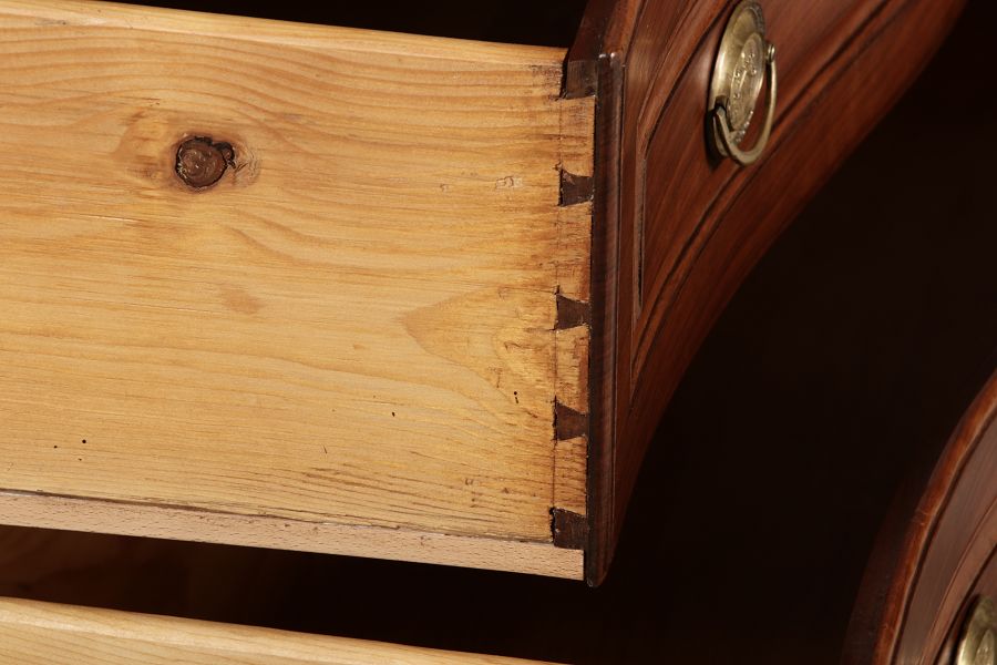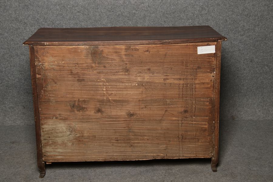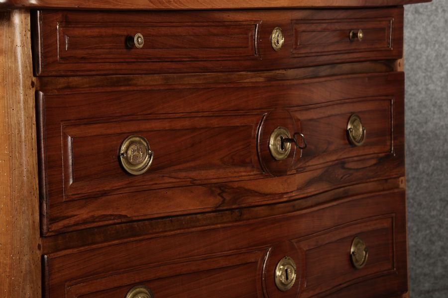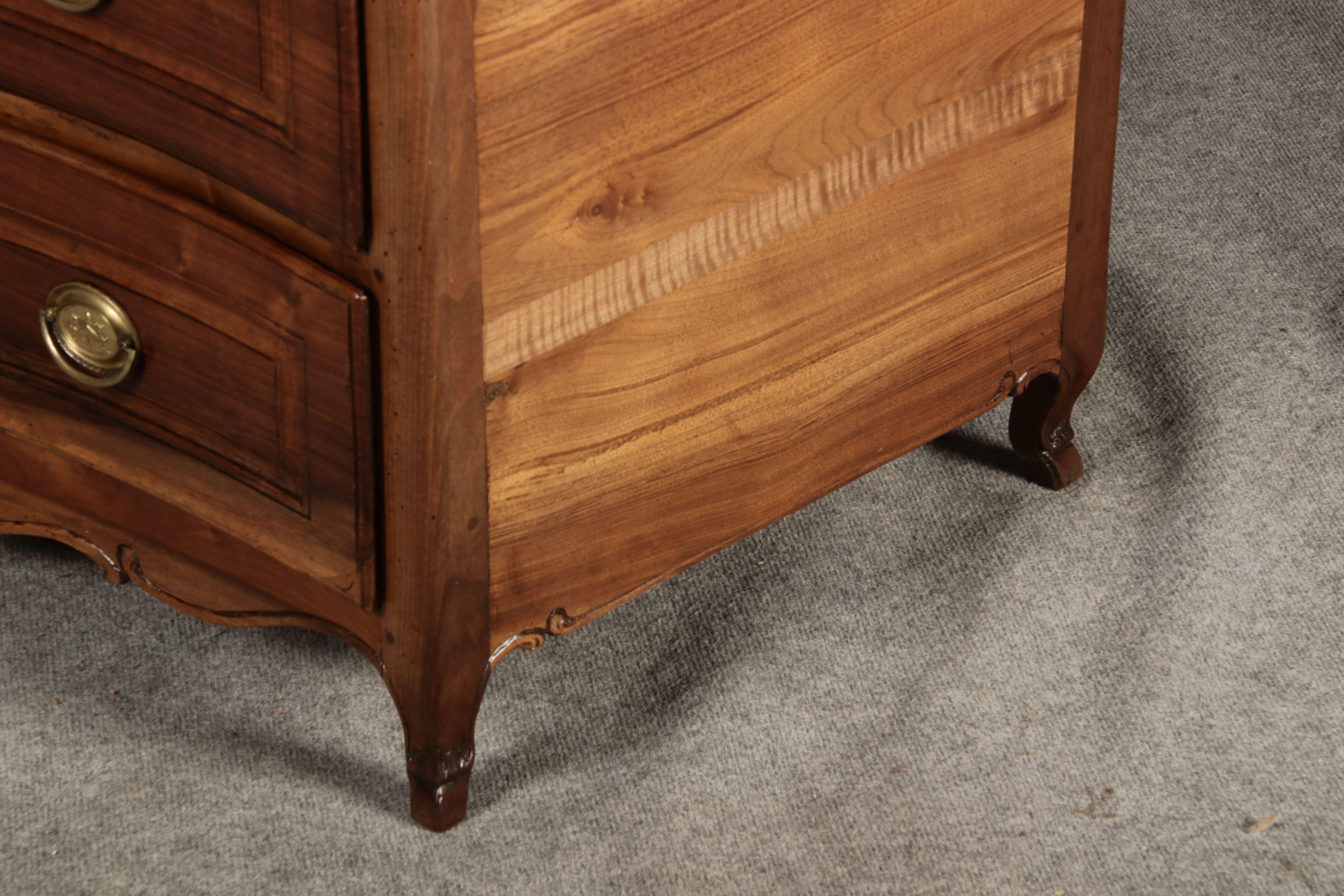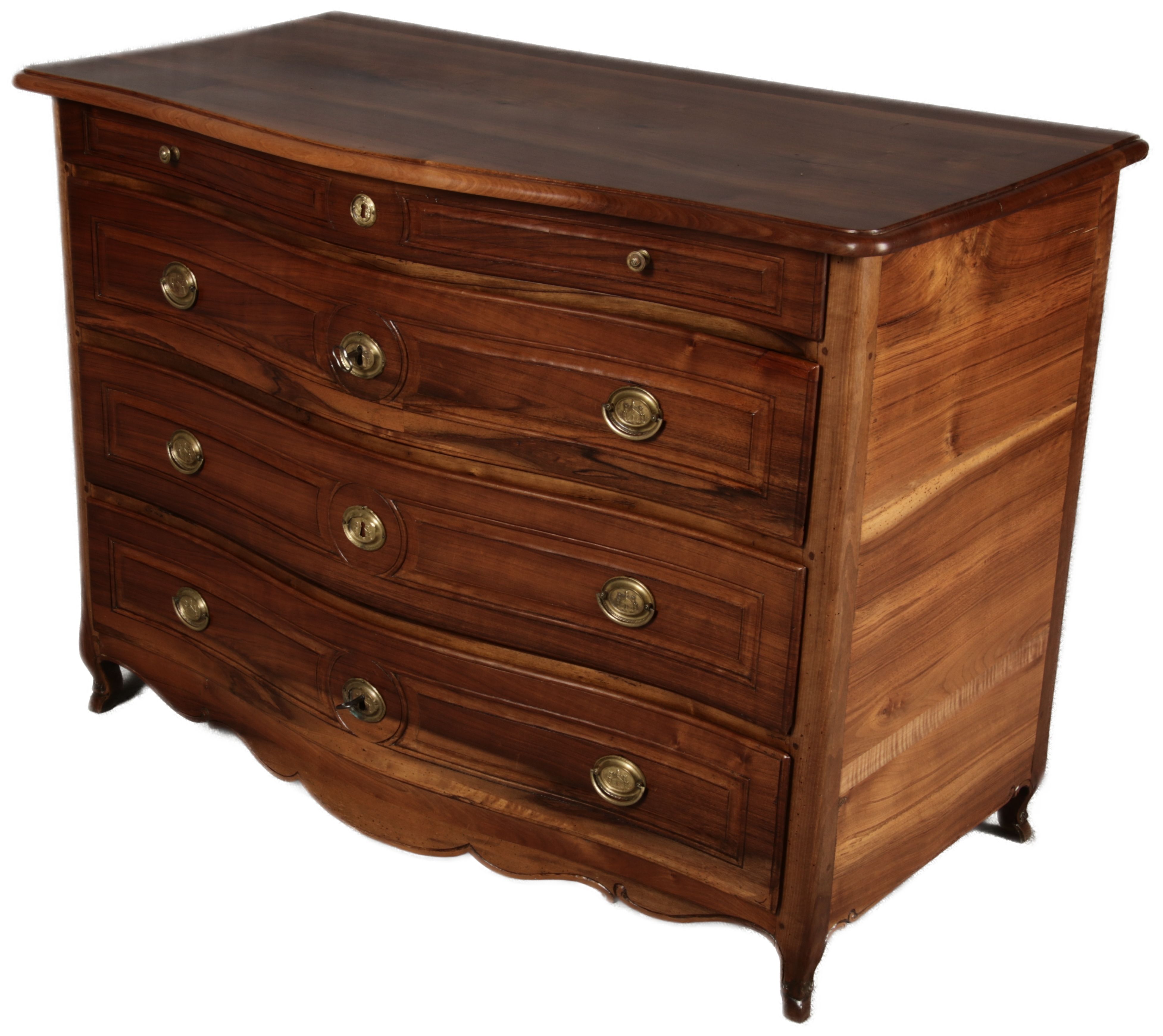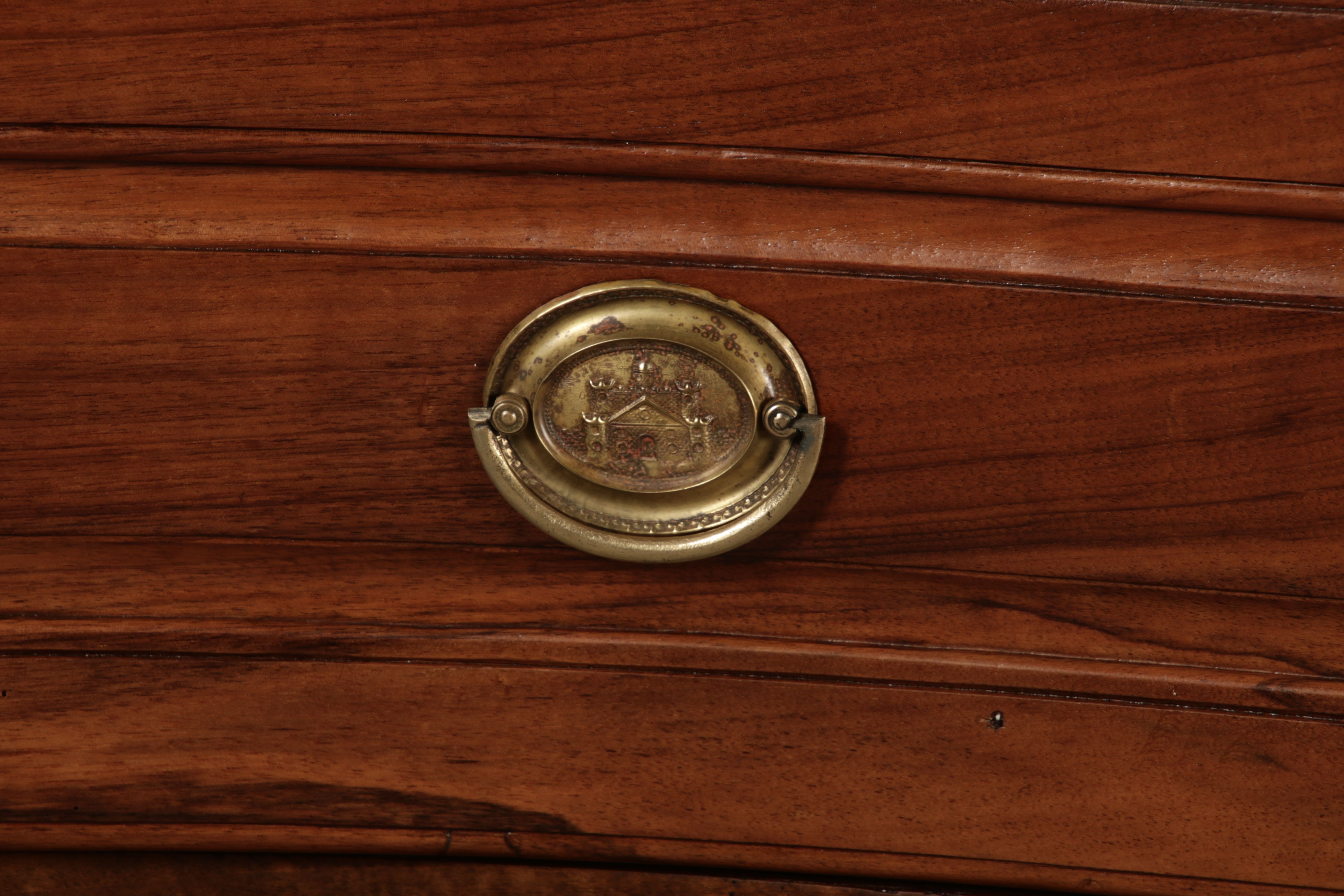 Beschreibung/description: Nussbaumkommode, 18. Jahrhundert Die Kommode verfügt über vier geräumige Schubladen. Jede Schublade ist mit, kunstvoll gestalteten Messingbeschlägen und Schlüsselschildern ausgestattet, die den historischen Charakter unterstreichen. Die geschwungene Front sowie die leicht geschwungene Zarge verleihen dem Möbelstück eine grazile Leichtigkeit, die von den geschwungenen Beinen harmonisch ergänzt wird. Der geschweifte Sockel und die fein geschliffene Deckplatte runden das harmonische Gesamtbild ab. Dieses zeitlose Möbelstück fügt sich mühelos in klassisch wie auch modern eingerichtete Räume ein und bietet zugleich praktischen Stauraum und ästhetische Schönheit.