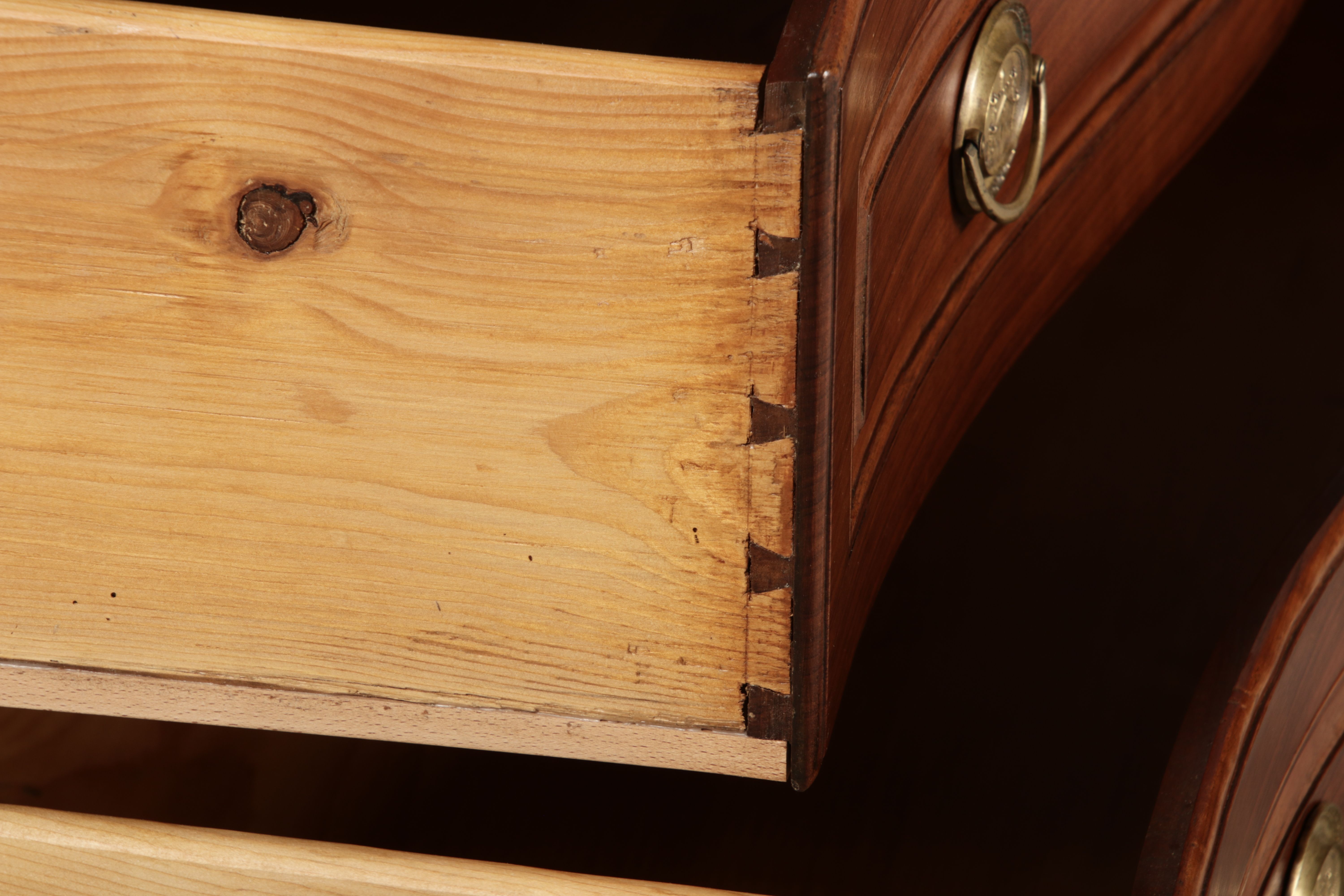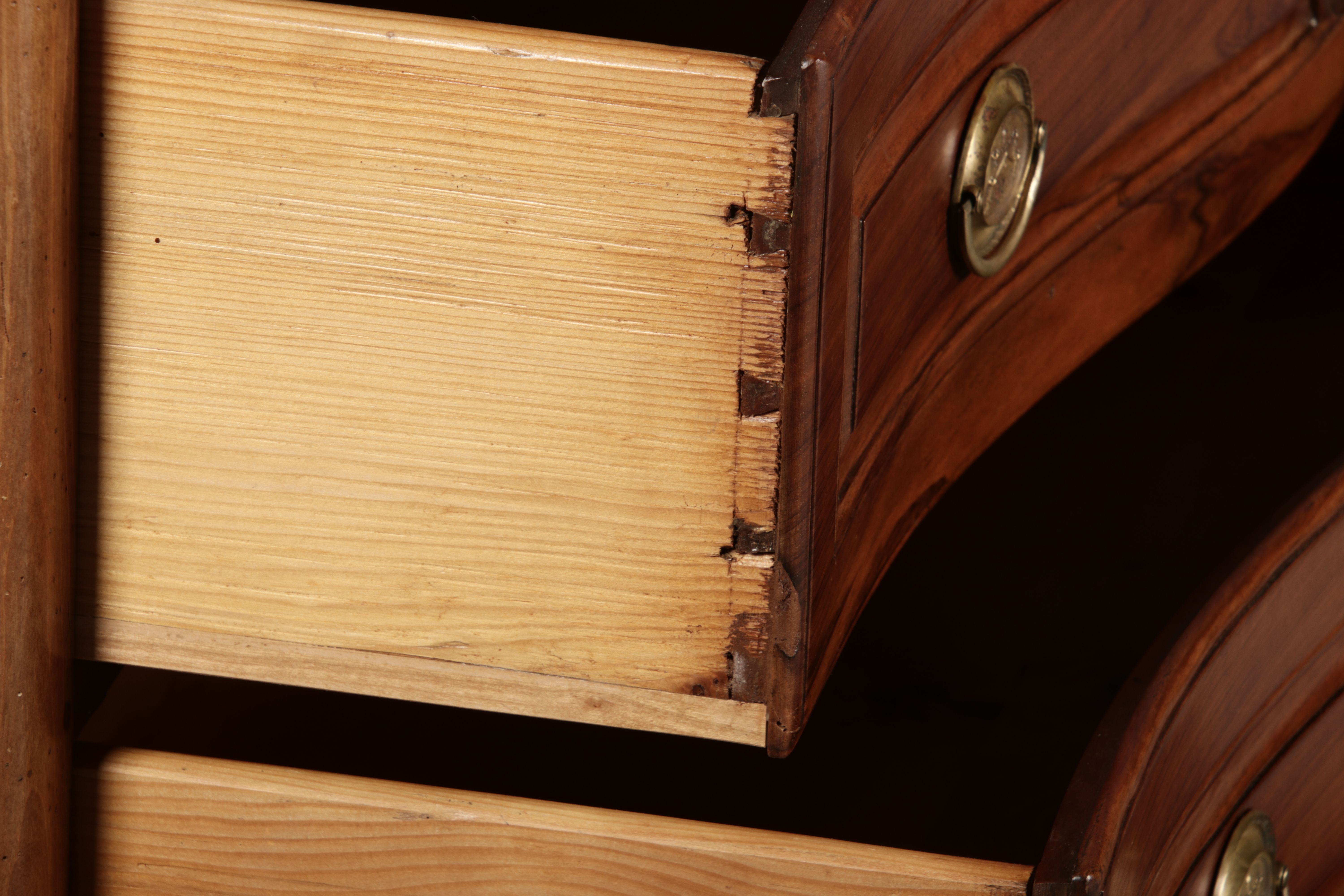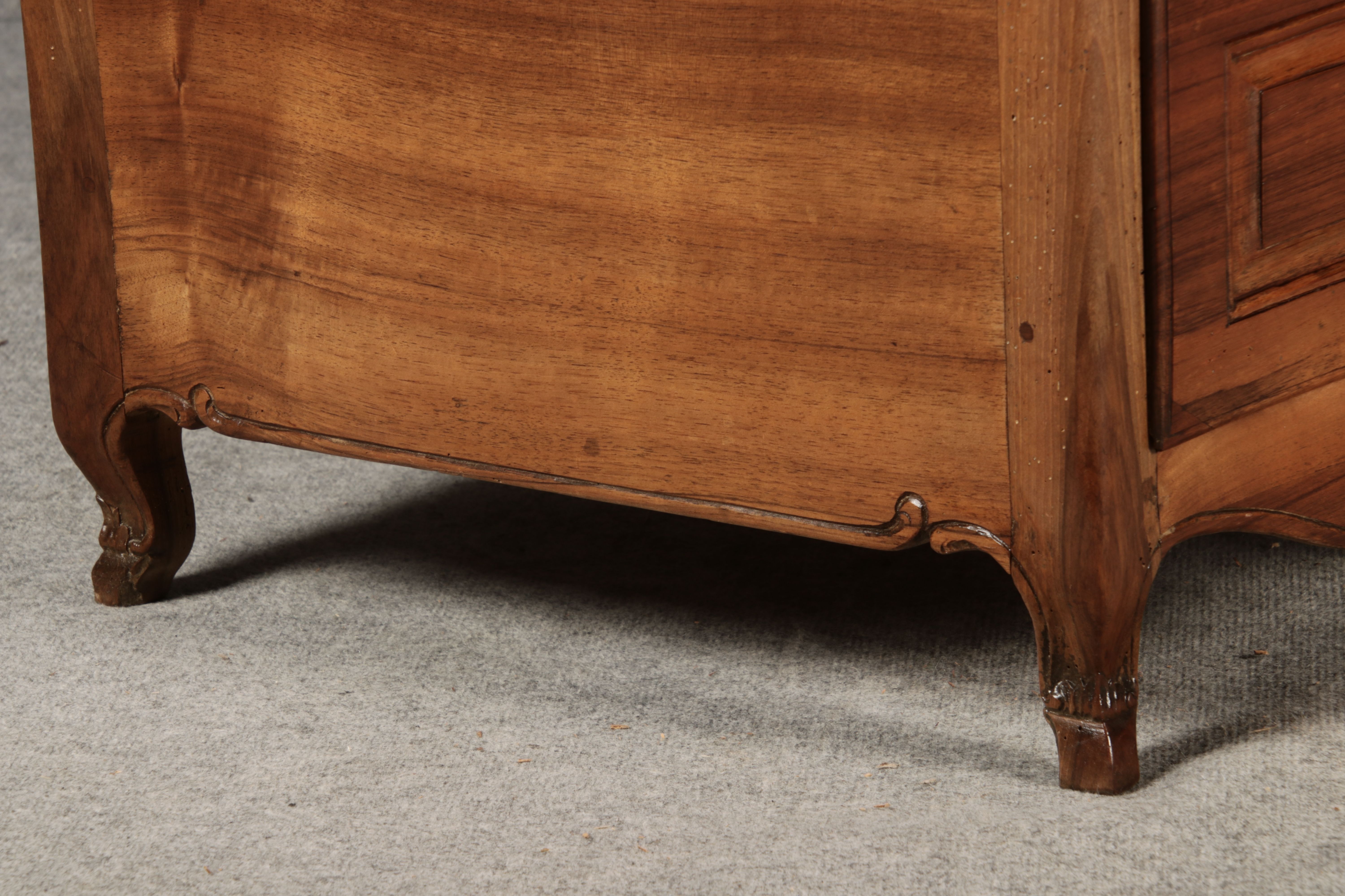 Nussbaumkommode, 18. Jahrhundert Die Kommode verfügt über vier geräumige Schubladen. Jede Schublade ist mit, kunstvoll gestalteten Messingbeschlägen und Schlüsselschildern ausgestattet, die den historischen Charakter unterstreichen. Die geschwungene Front sowie die leicht geschwungene Zarge verleihen dem Möbelstück eine grazile Leichtigkeit, die von den geschwungenen Beinen harmonisch ergänzt wird. Der geschweifte Sockel und die fein geschliffene Deckplatte runden das harmonische Gesamtbild ab. Dieses zeitlose Möbelstück fügt sich mühelos in klassisch wie auch modern eingerichtete Räume ein und bietet zugleich praktischen Stauraum und ästhetische Schönheit |