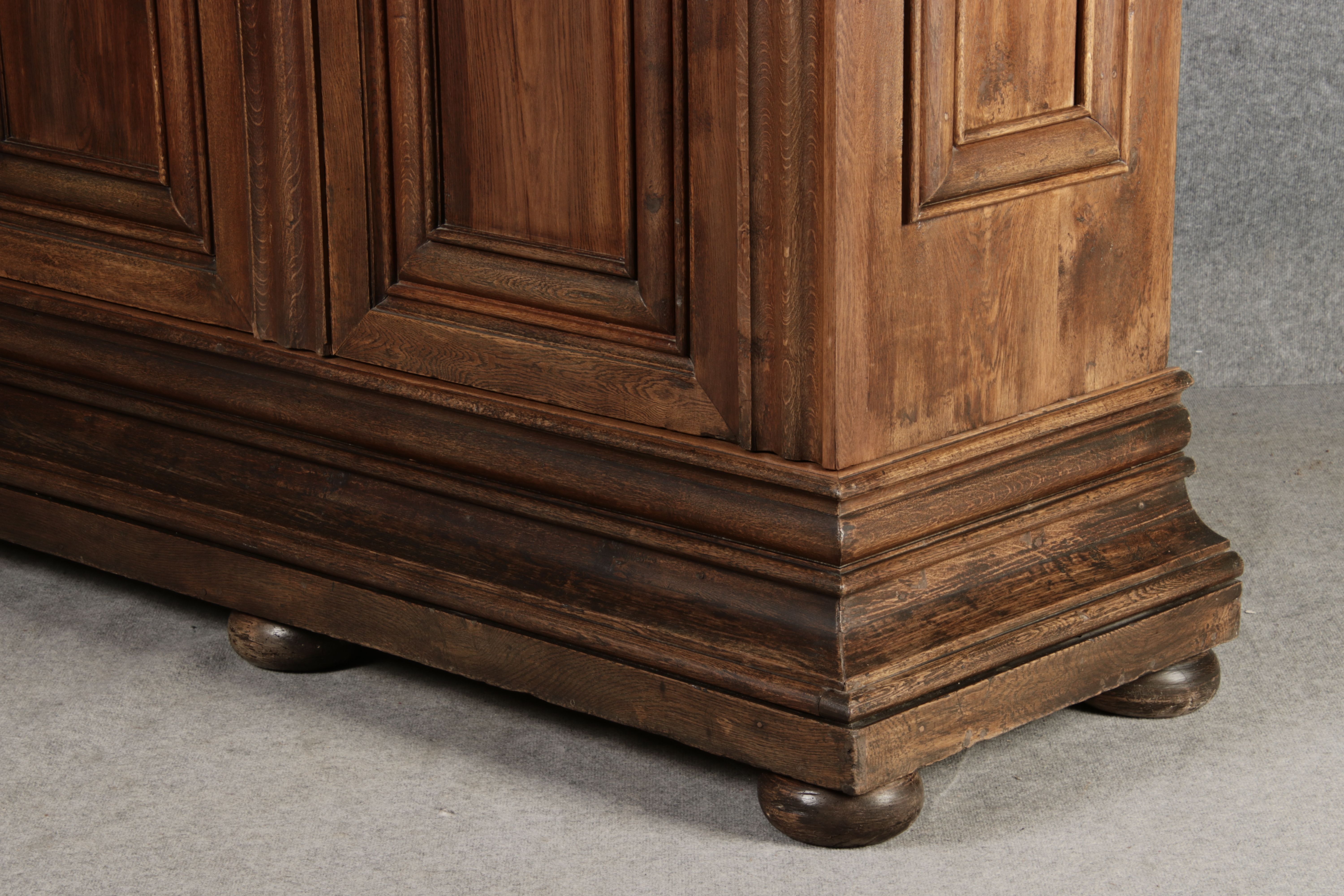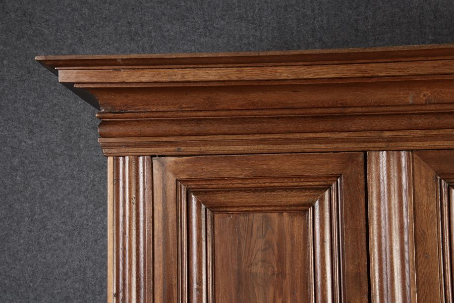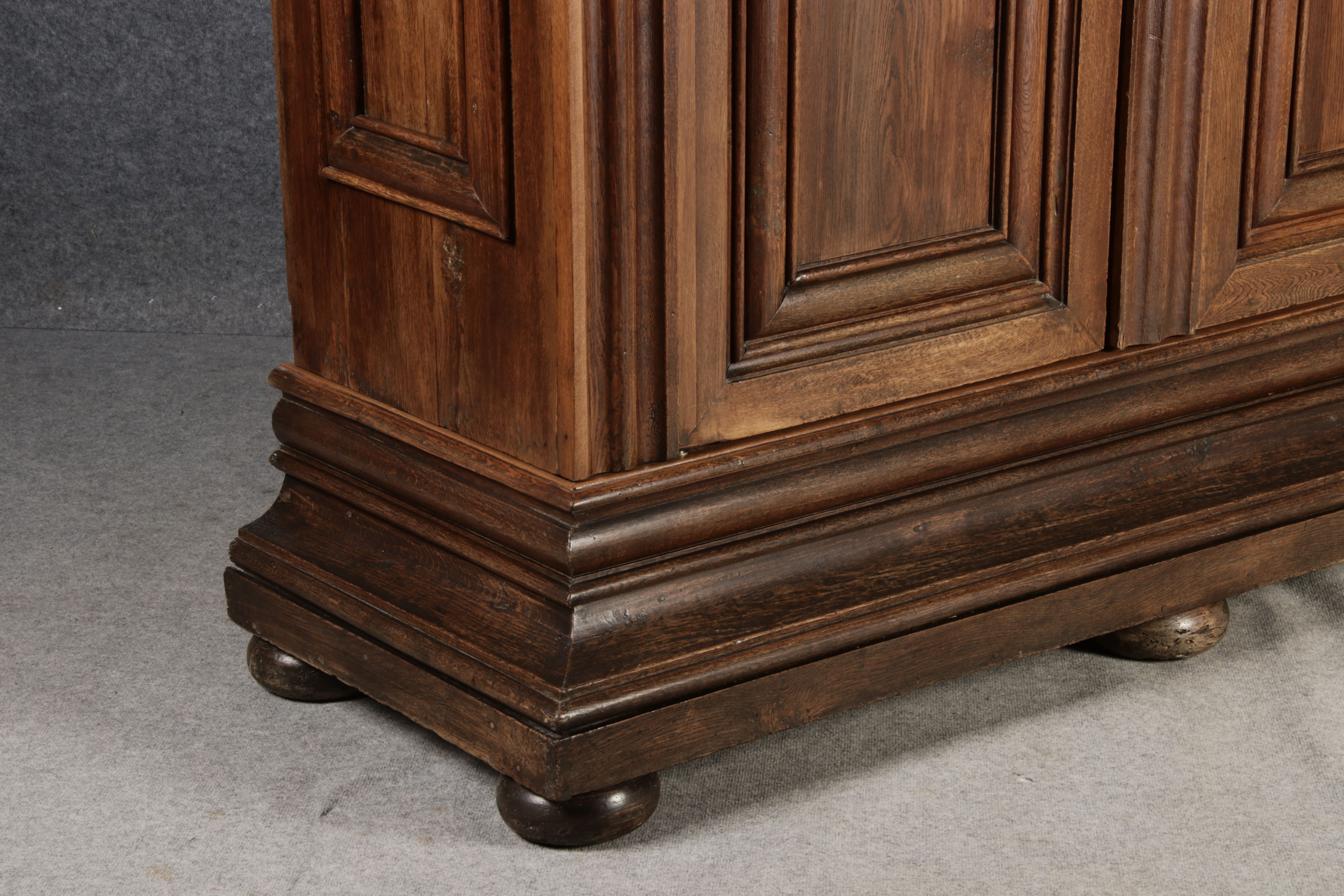 Antiker sehr hoher Frankfurter Barock Wellenschrank Eiche massiv aus dem 18 Jh. Der Schrank stand im Fränkischen Kloster Maria Hilf und wurde dort als Garderobenschrank genutzt. Der Schrank wurde innen von einem Schreiner mit neuen Sperrholz Platten ausgeschlagen, damit er innen ein sauberes Erscheinungsbild hat. Durch seine Höhe von 241 cm hat er ein Dominates Erscheinungsbild und ist in jedem Raum ein besonderes Stück. |