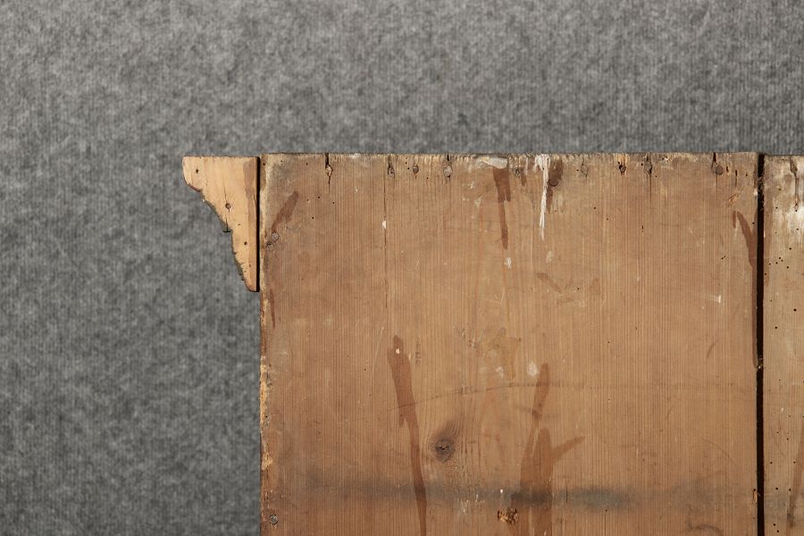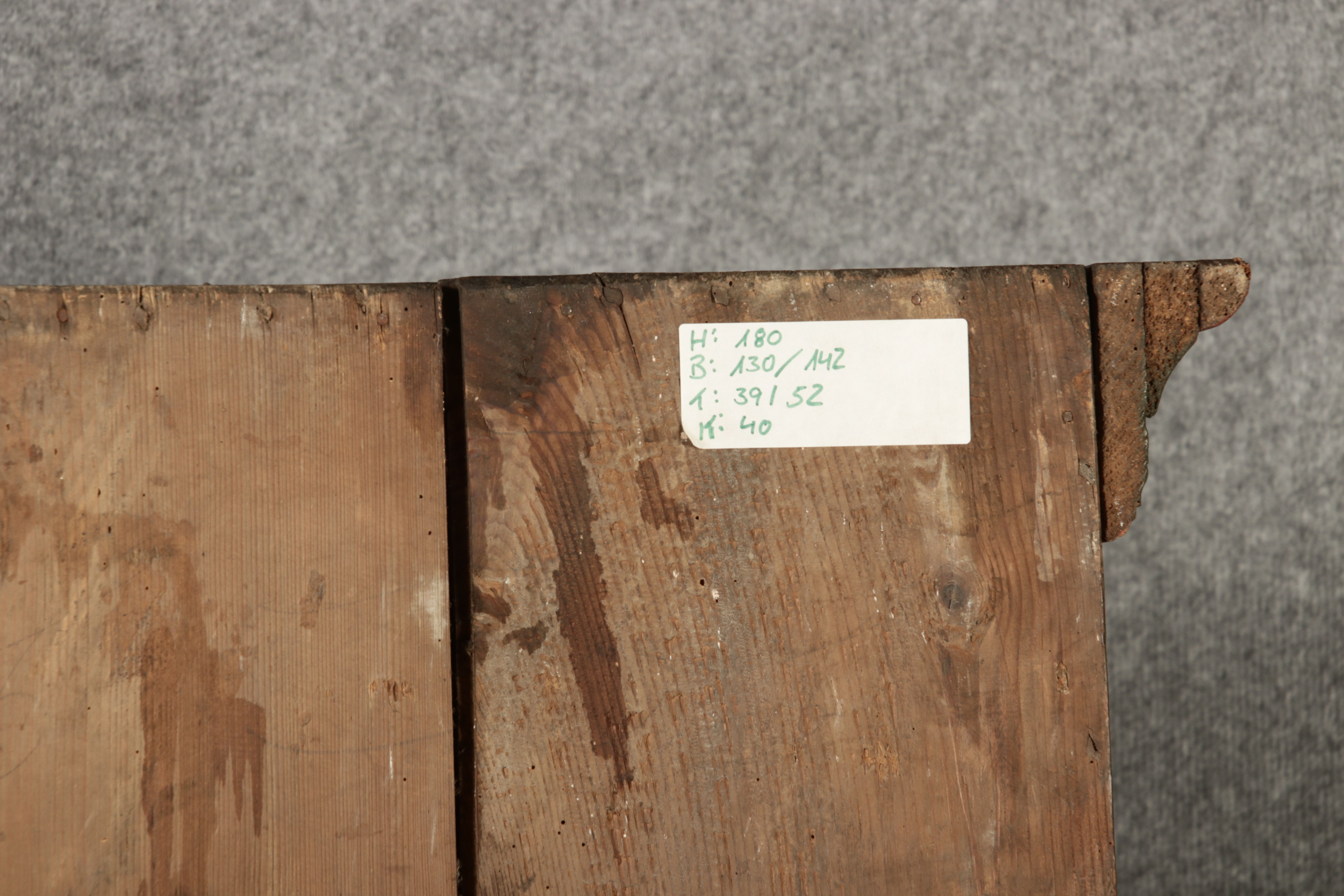Masse/dimensions: Höhe/Height ca. 180 cm, Breite Korpus/Broad Boda ca. 130 cm, Breite Gesims/Broad cornice ca. 142 cm, Tiefe Korpus/Deep body ca. 39 cm, Tiefe Gesims/Deep cornice ca. 52 cm,