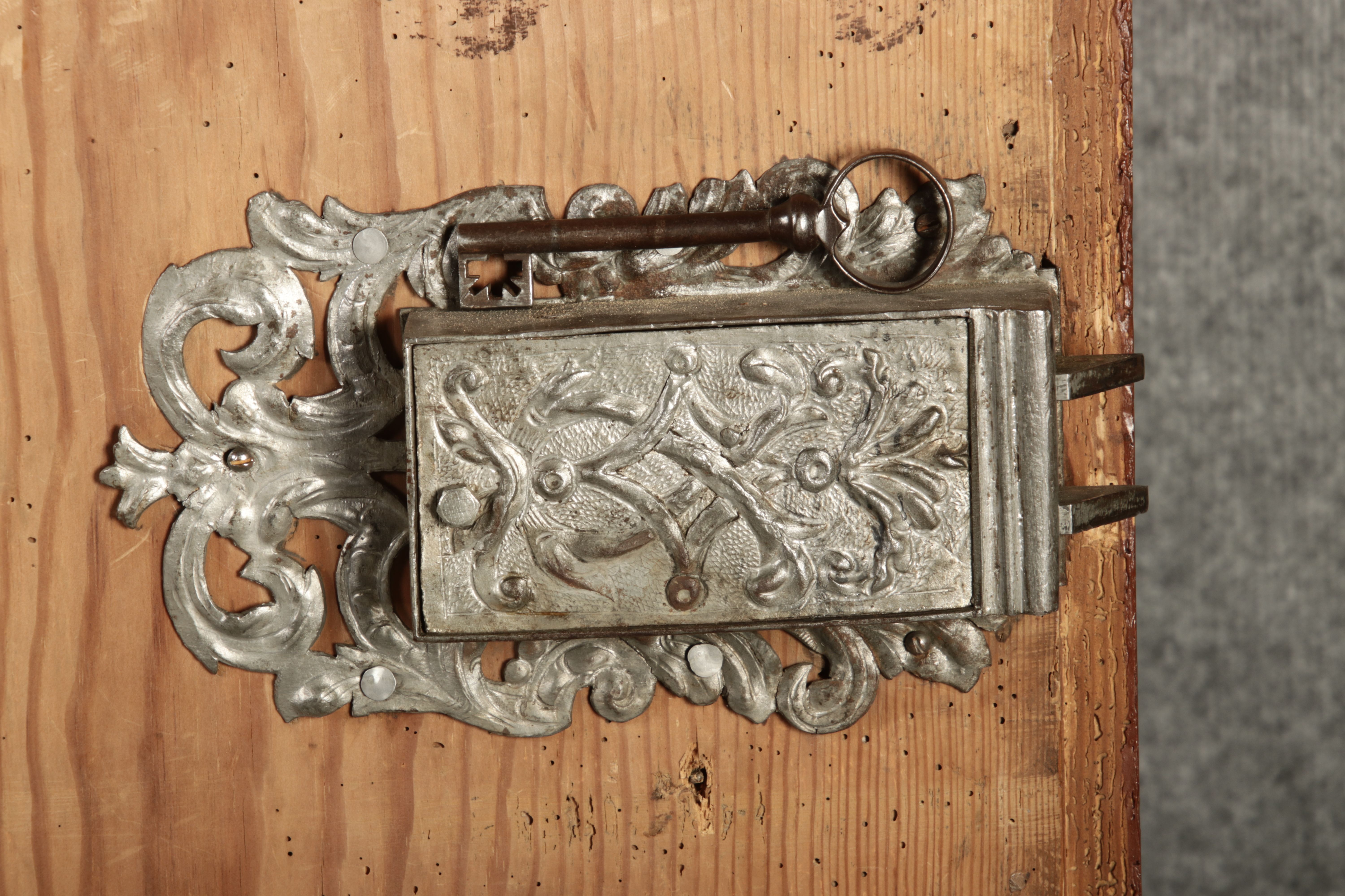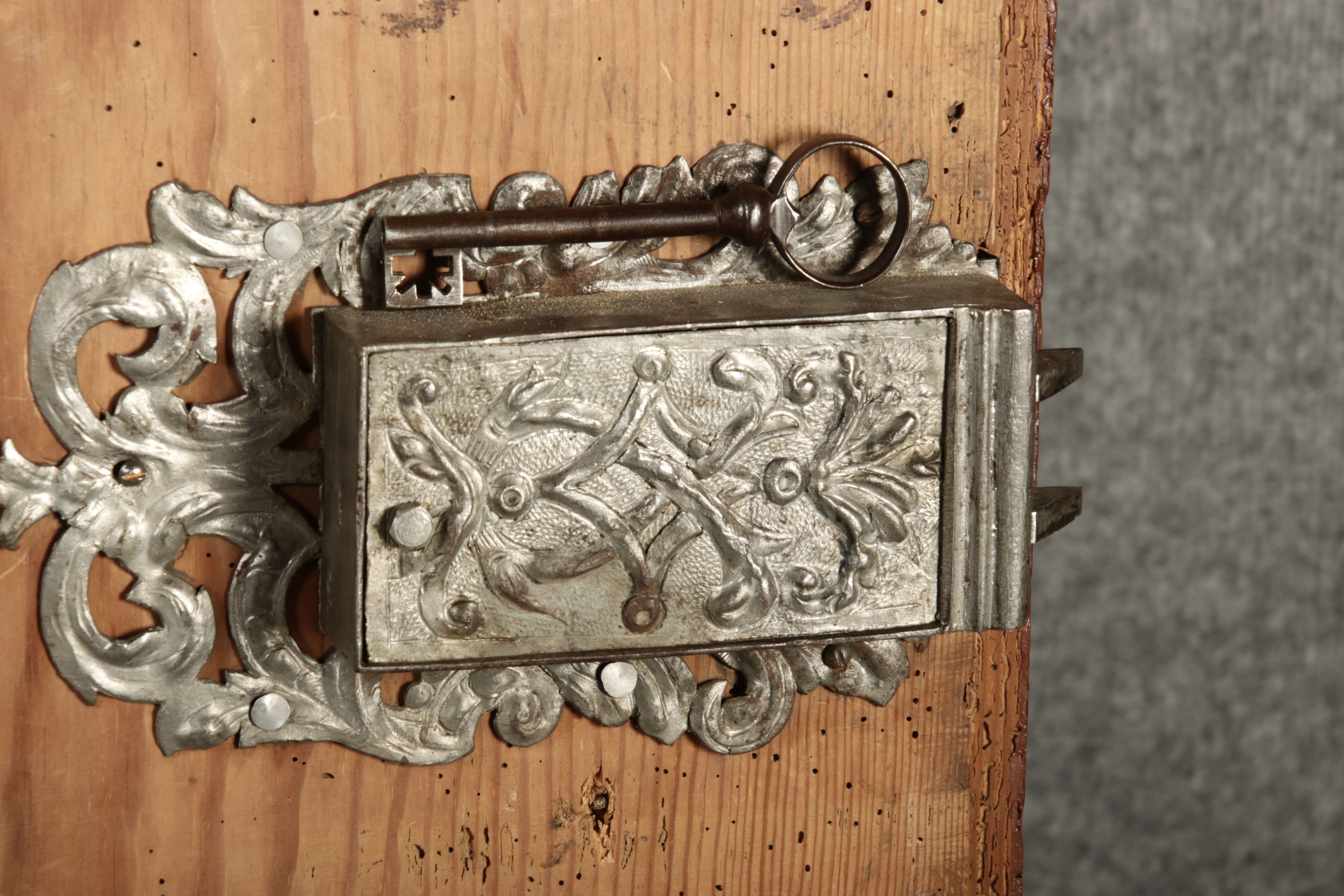 Historischer Nürnberger Bauernschrank, 18. Jahrhundert Dieser bemalte Weichholzschrank stammt aus dem 18. Jahrhundert und ist ein typisches Beispiel für die kunstvolle Handwerkskunst der Region Nürnberg. Der Schrank besteht aus Weichholz und verfügt über charakteristische Fasen sowie ein robustes Eisenschloss, welches sowohl funktionell als auch dekorativ ist. |