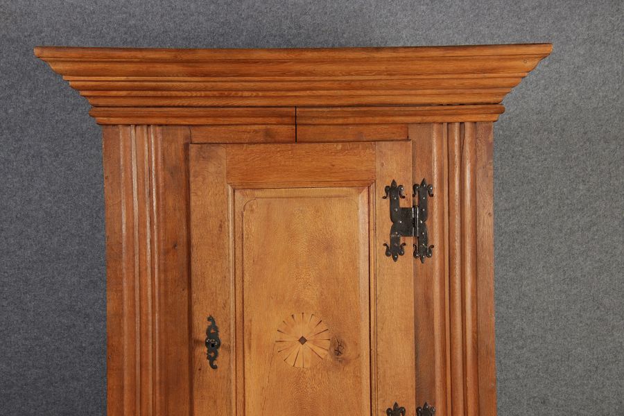 Masse/dimensions: Höhe/Height ca. 191 cm, Breite Korpus/Broad Boda ca. 128 cm, Breite Gesims/Broad cornice ca. 162 cm, Tiefe Korpus/Deep body ca. 48 cm, Tiefe Gesims/Deep cornice ca. 65 cm,