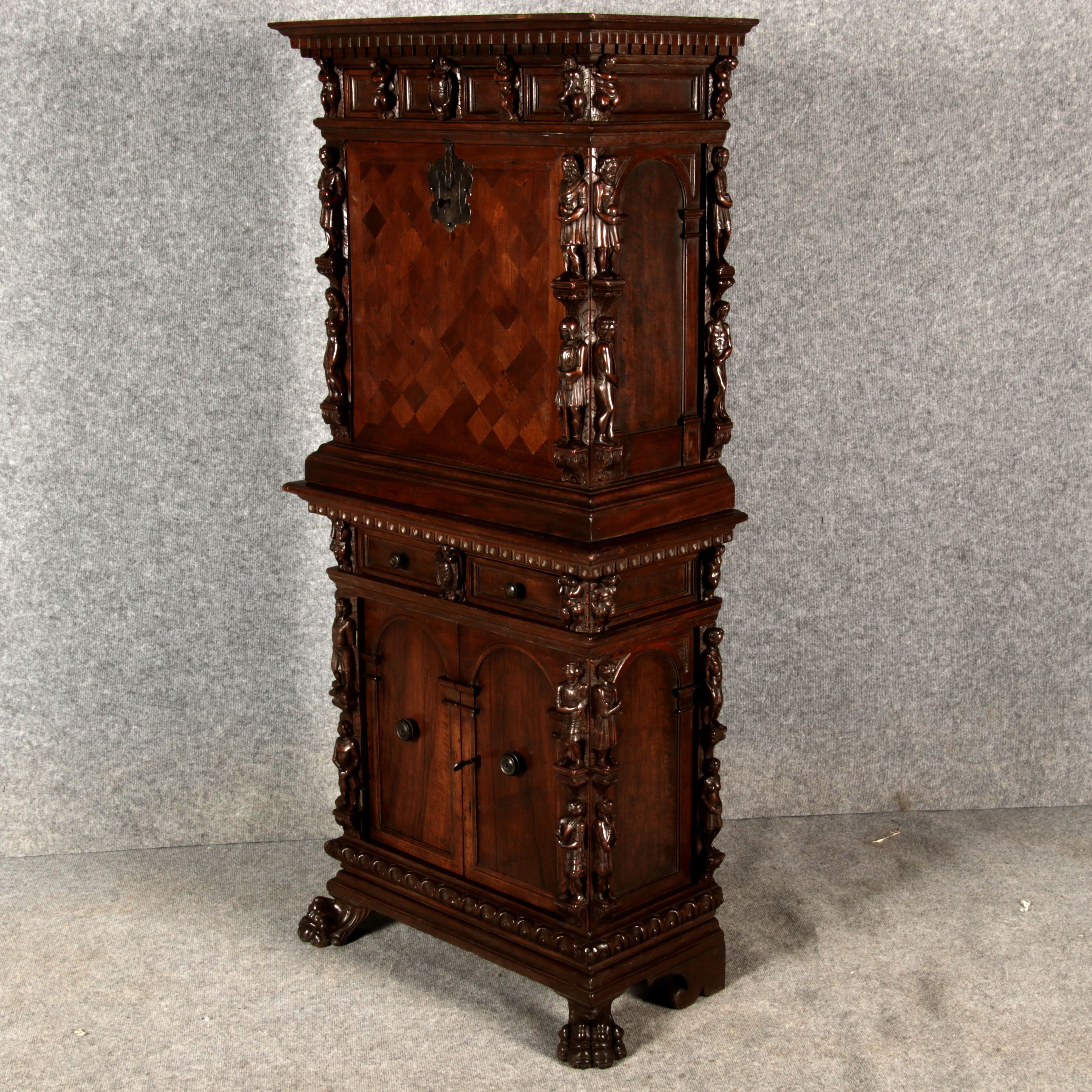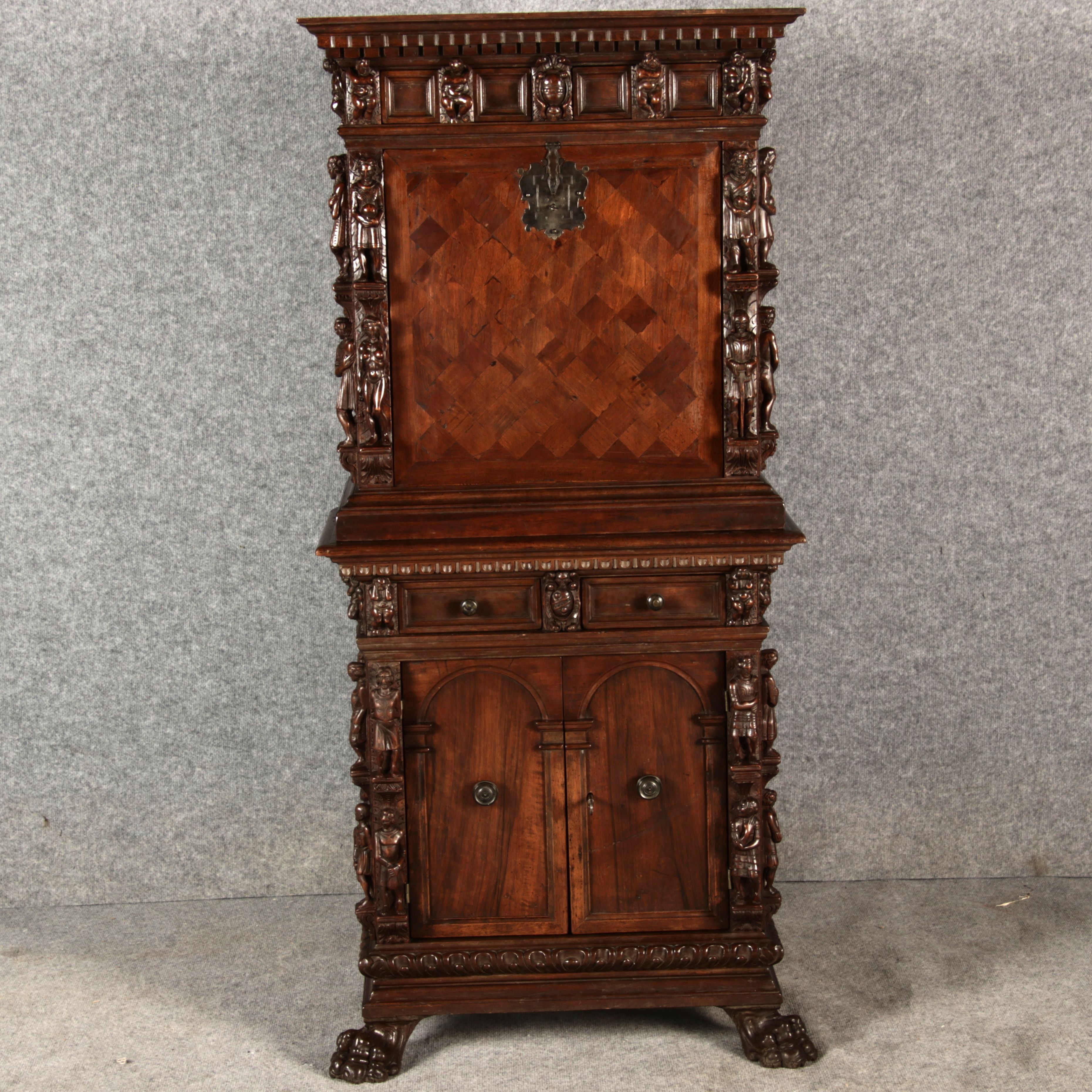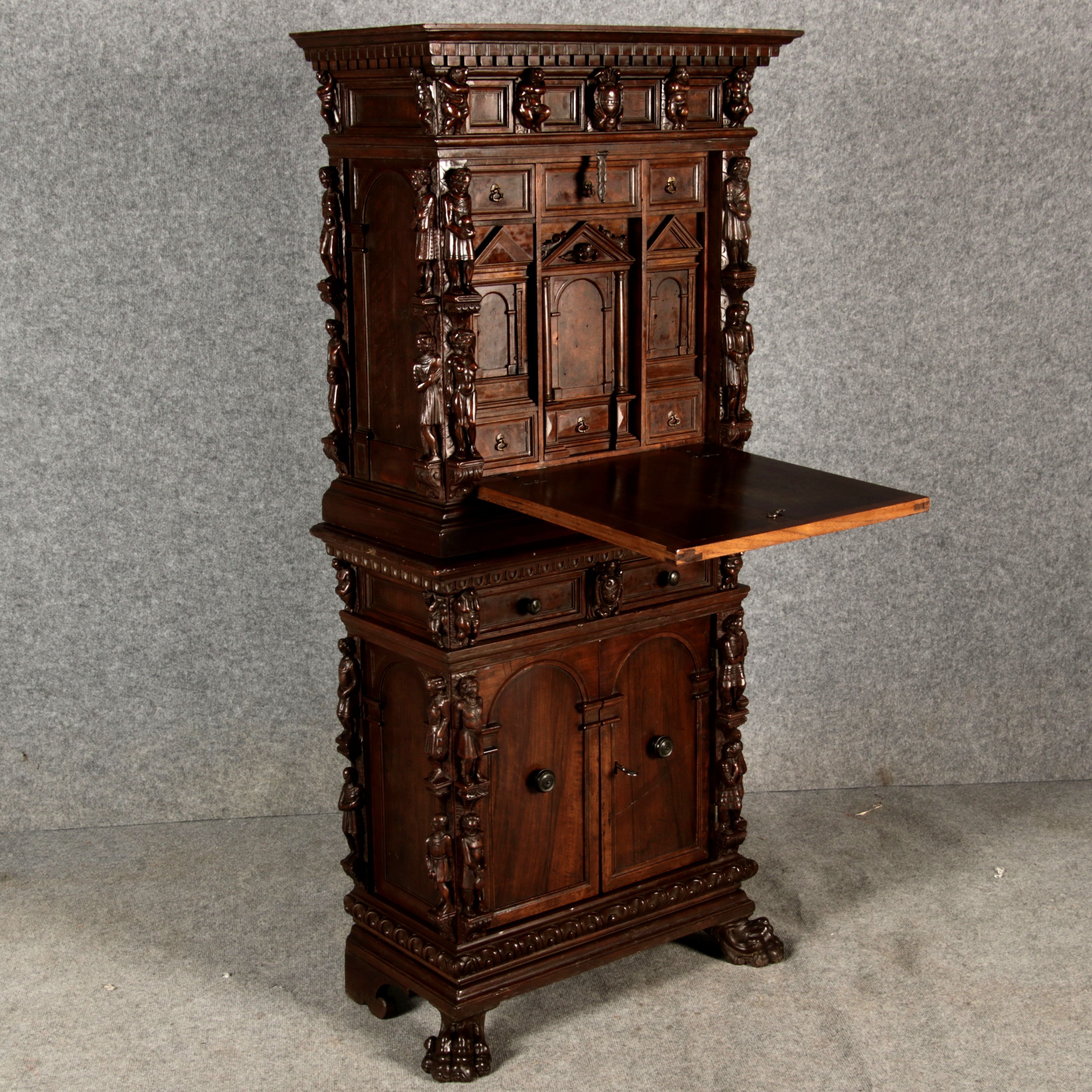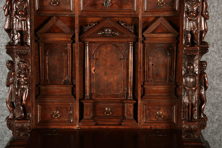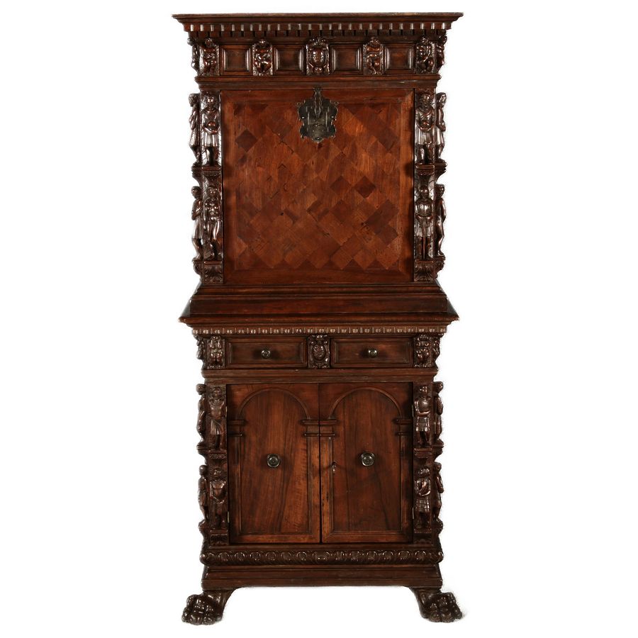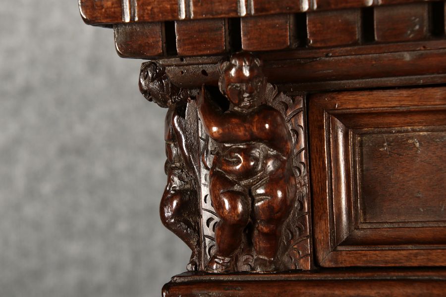Kleiner Antiker Renaissance-Sekretär, Nussbaum, 17.-19. Jahrhundert Dieser kleine dennoch imposante Renaissance-Sekretär aus Nussbaumholz stammt aus der Zeit zwischen dem 17. und 19. (Teile des Sekretärs lassen darauf schließen, das er im 19 Jh. gefertigt worden ist, eventuell aus alten Teilen.) Jahrhundert und repräsentiert den Stil und die Handwerkskunst der Renaissance-Epoche. Das Möbelstück beeindruckt durch seine aufwendigen Schnitzereien, die kunstvolle Gestaltung und die kraftvolle Präsenz. Dieser Renaissance-Sekretär ist ein beeindruckendes Kunstwerk, das sowohl dekorativ als auch funktional ist. Seine massive Bauweise, gepaart mit der kunstvollen Gestaltung, macht ihn zu einem wahren Prunkstück für jeden Liebhaber historischer Möbel. Der Sekretär bietet nicht nur großzügigen Stauraum, sondern ist auch ein Zeugnis der meisterhaften Handwerkskunst vergangener Jahre. |