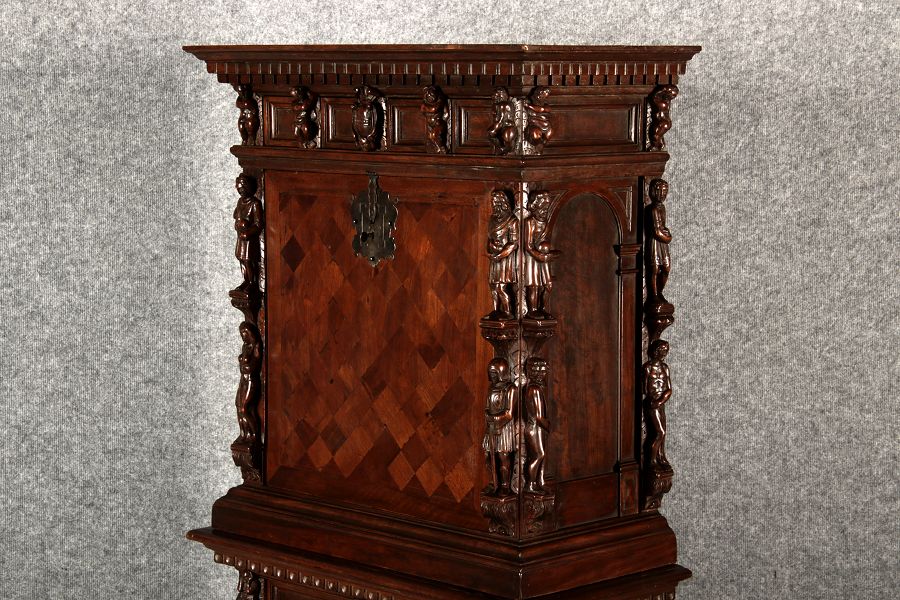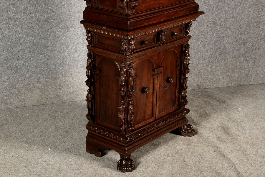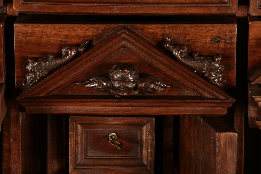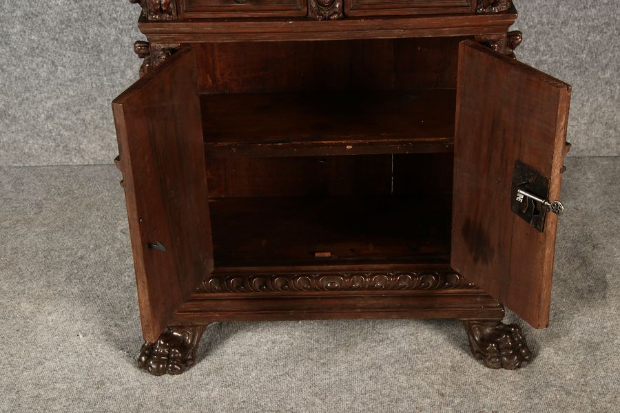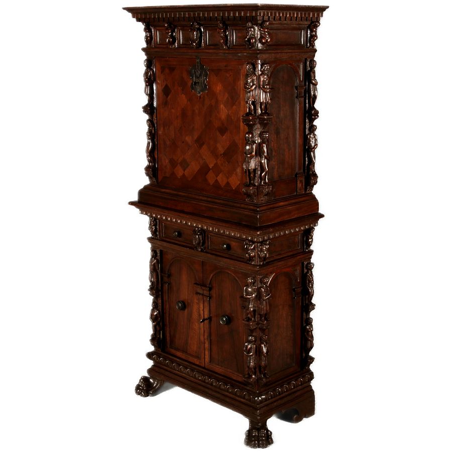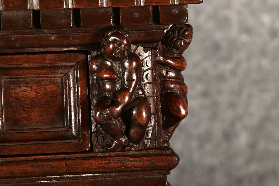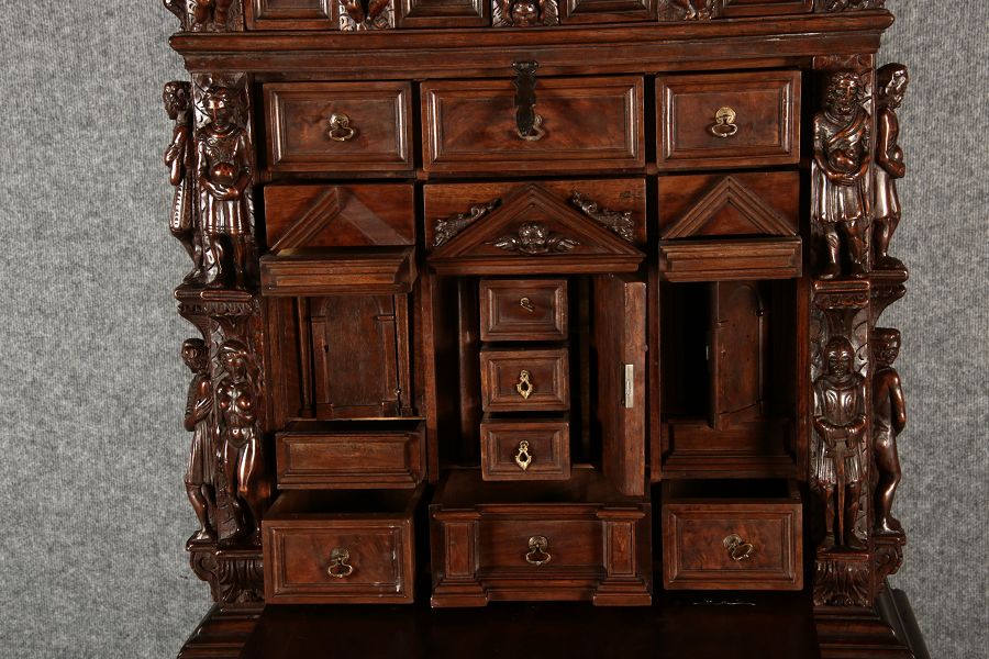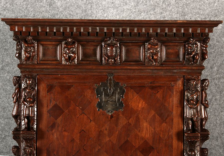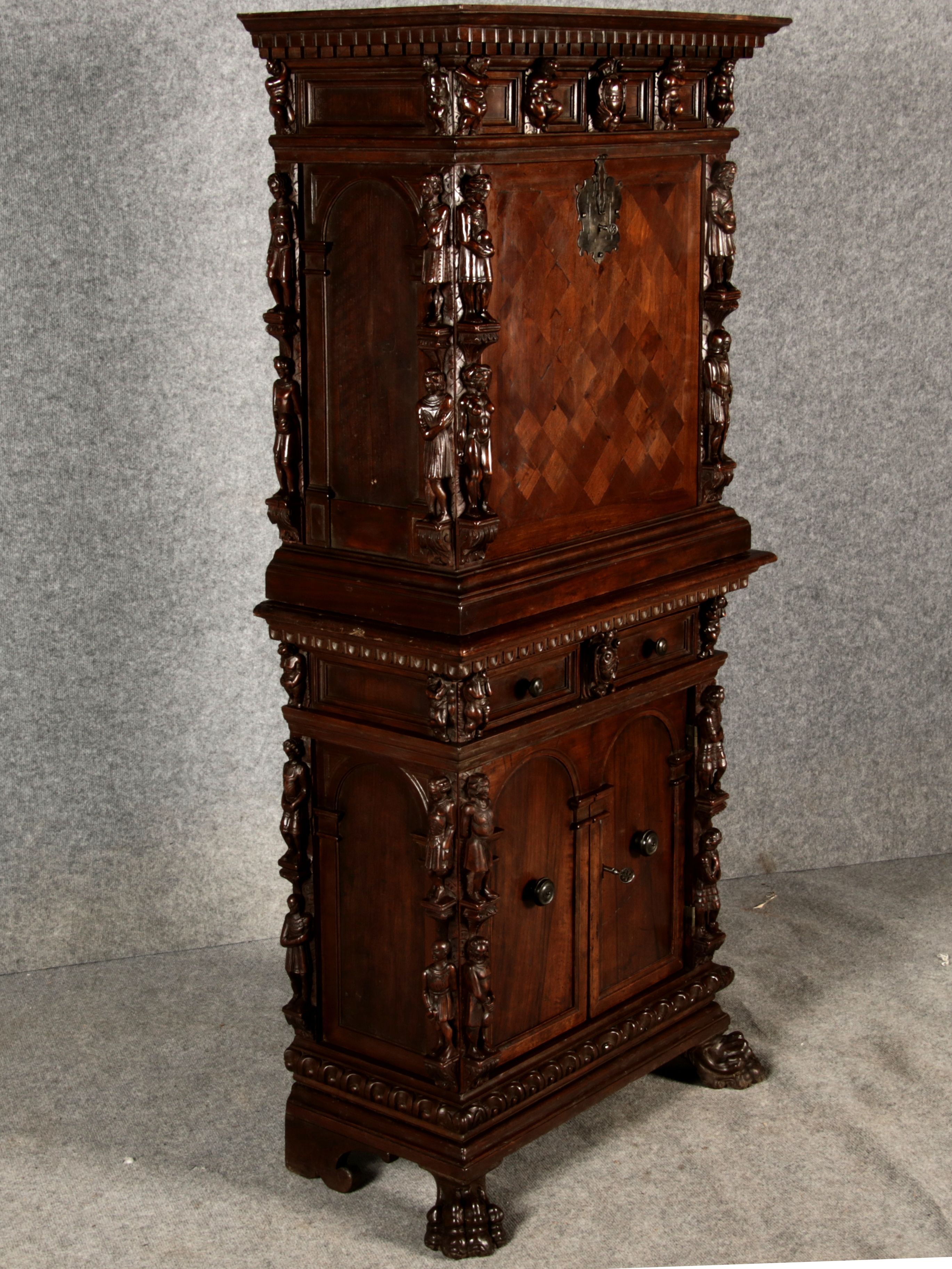 Kleiner Antiker Renaissance-Sekretär, Nussbaum, 17.-19. Jahrhundert Dieser kleine dennoch imposante Renaissance-Sekretär aus Nussbaumholz stammt aus der Zeit zwischen dem 17. und 19. (Teile des Sekretärs lassen darauf schließen, das er im 19 Jh. gefertigt worden ist, eventuell aus alten Teilen.) Jahrhundert und repräsentiert den Stil und die Handwerkskunst der Renaissance-Epoche. Das Möbelstück beeindruckt durch seine aufwendigen Schnitzereien, die kunstvolle Gestaltung und die kraftvolle Präsenz. Dieser Renaissance-Sekretär ist ein beeindruckendes Kunstwerk, das sowohl dekorativ als auch funktional ist. Seine massive Bauweise, gepaart mit der kunstvollen Gestaltung, macht ihn zu einem wahren Prunkstück für jeden Liebhaber historischer Möbel. Der Sekretär bietet nicht nur großzügigen Stauraum, sondern ist auch ein Zeugnis der meisterhaften Handwerkskunst vergangener Jahre. |