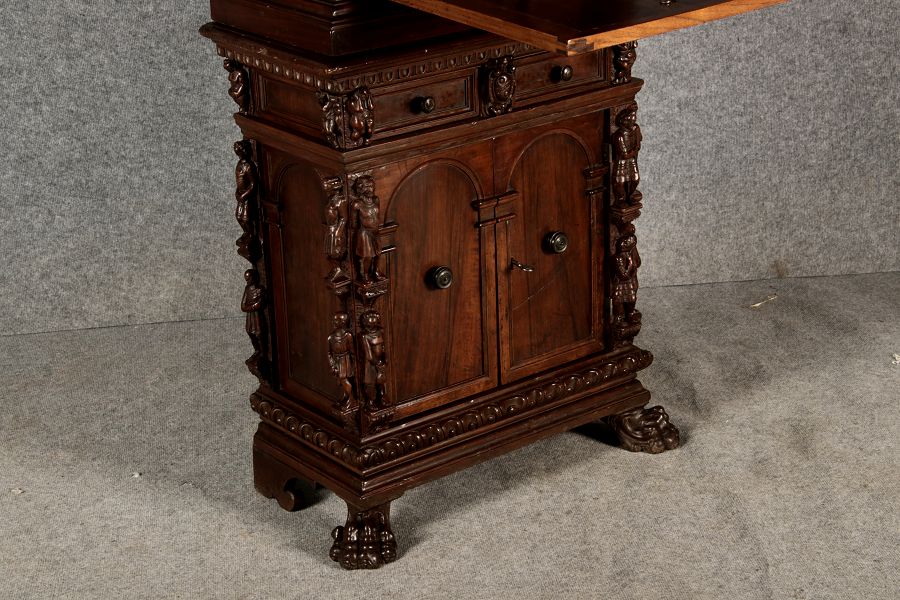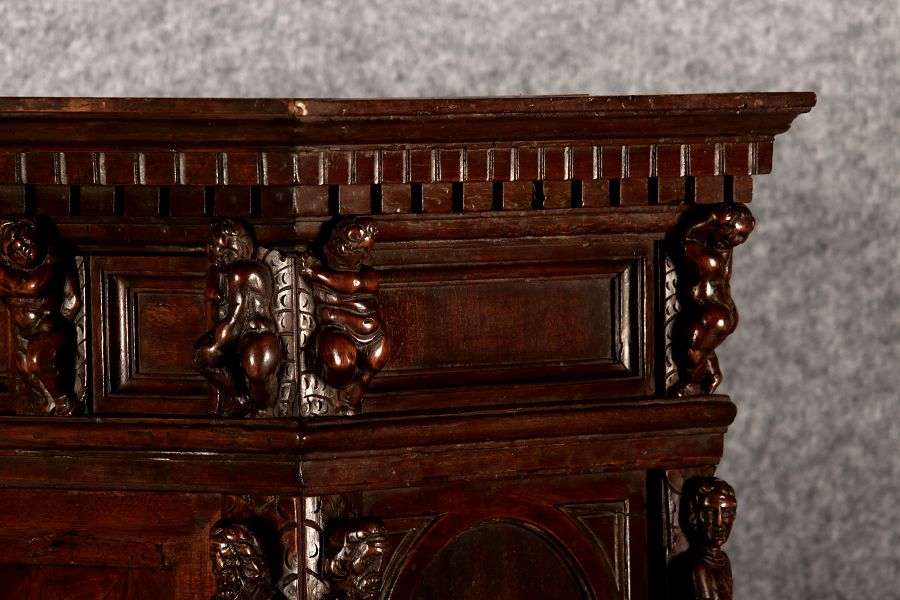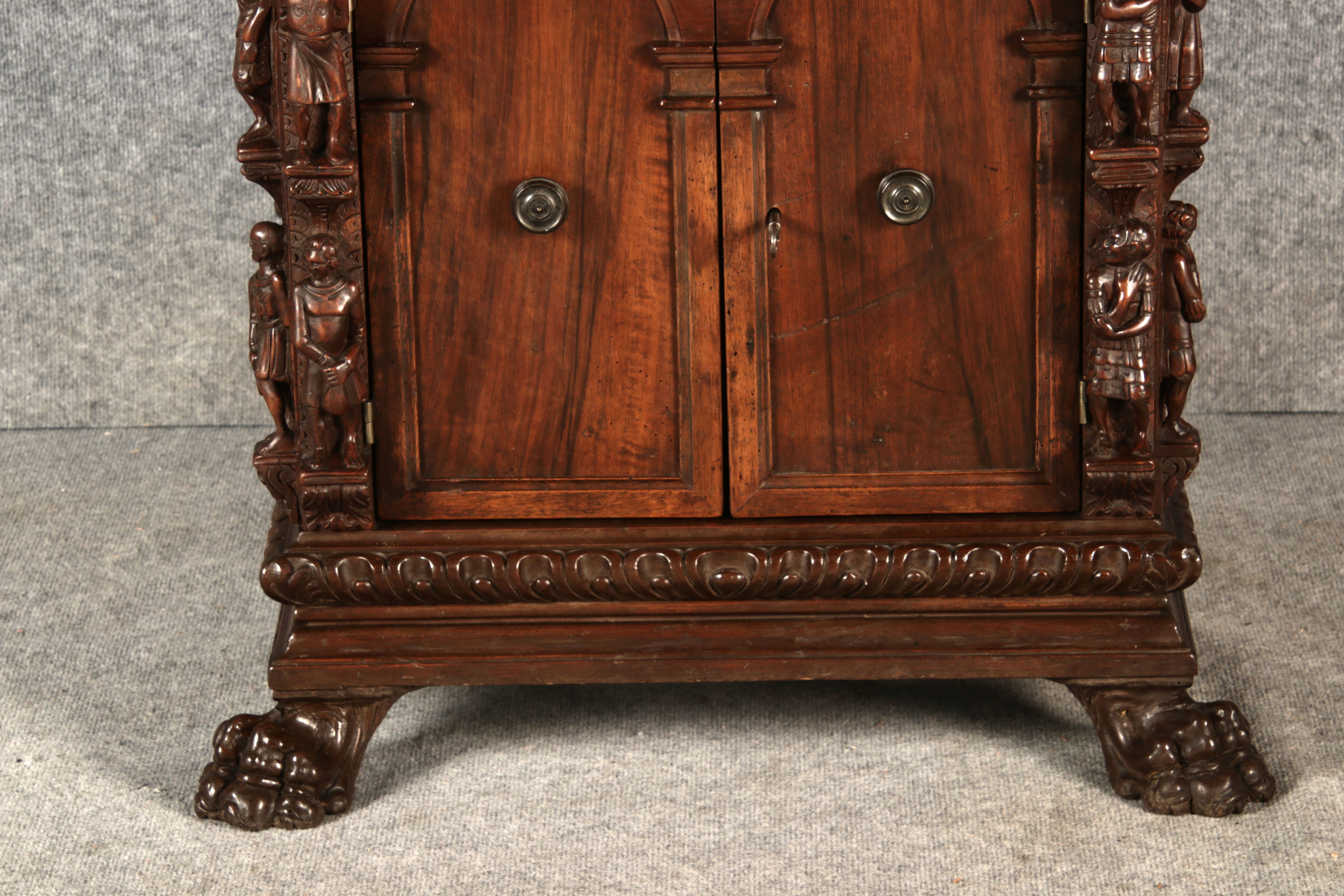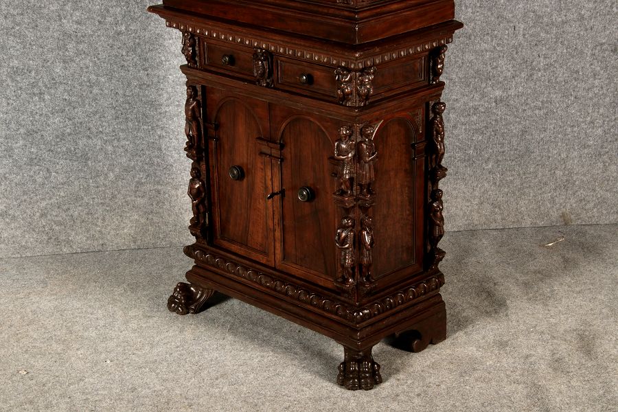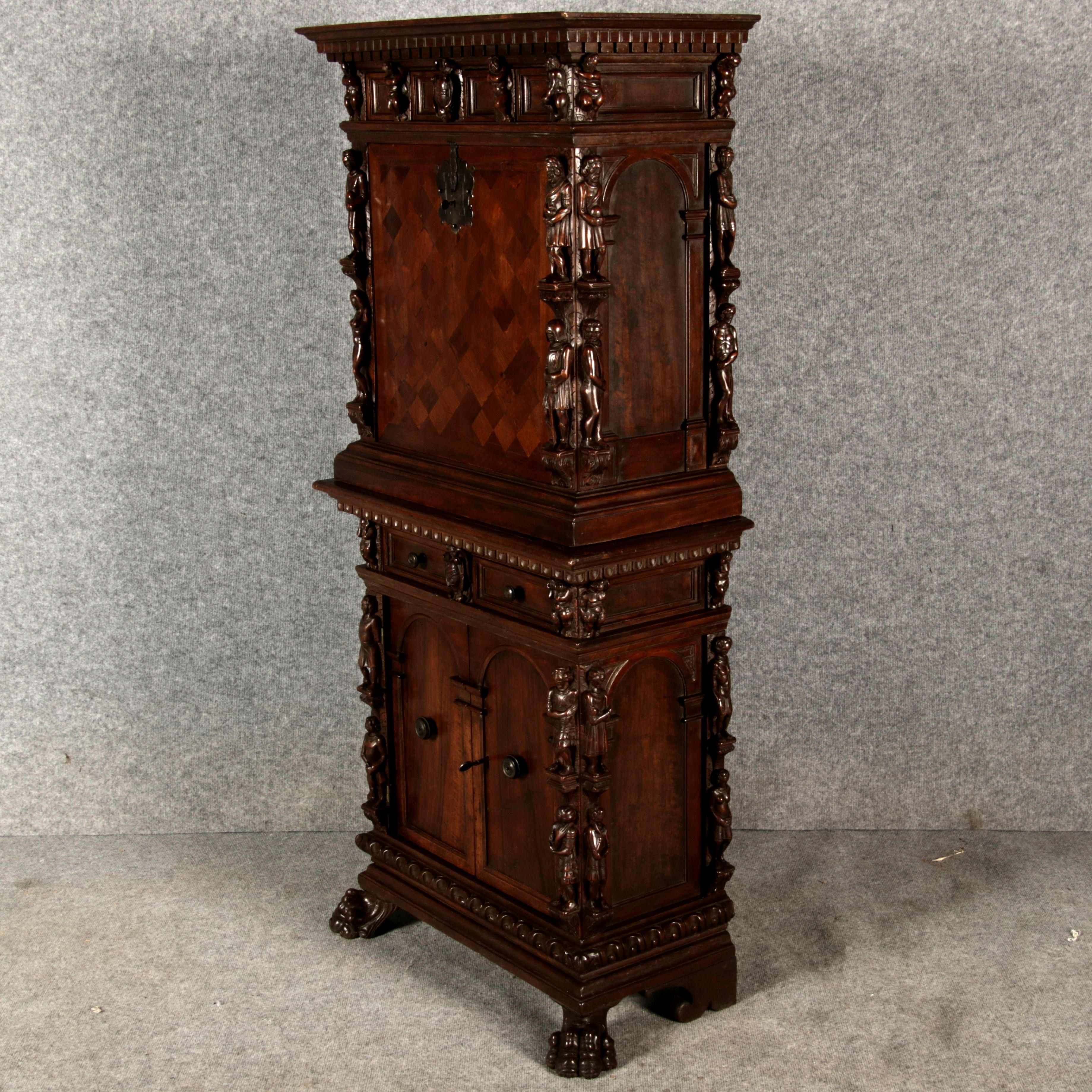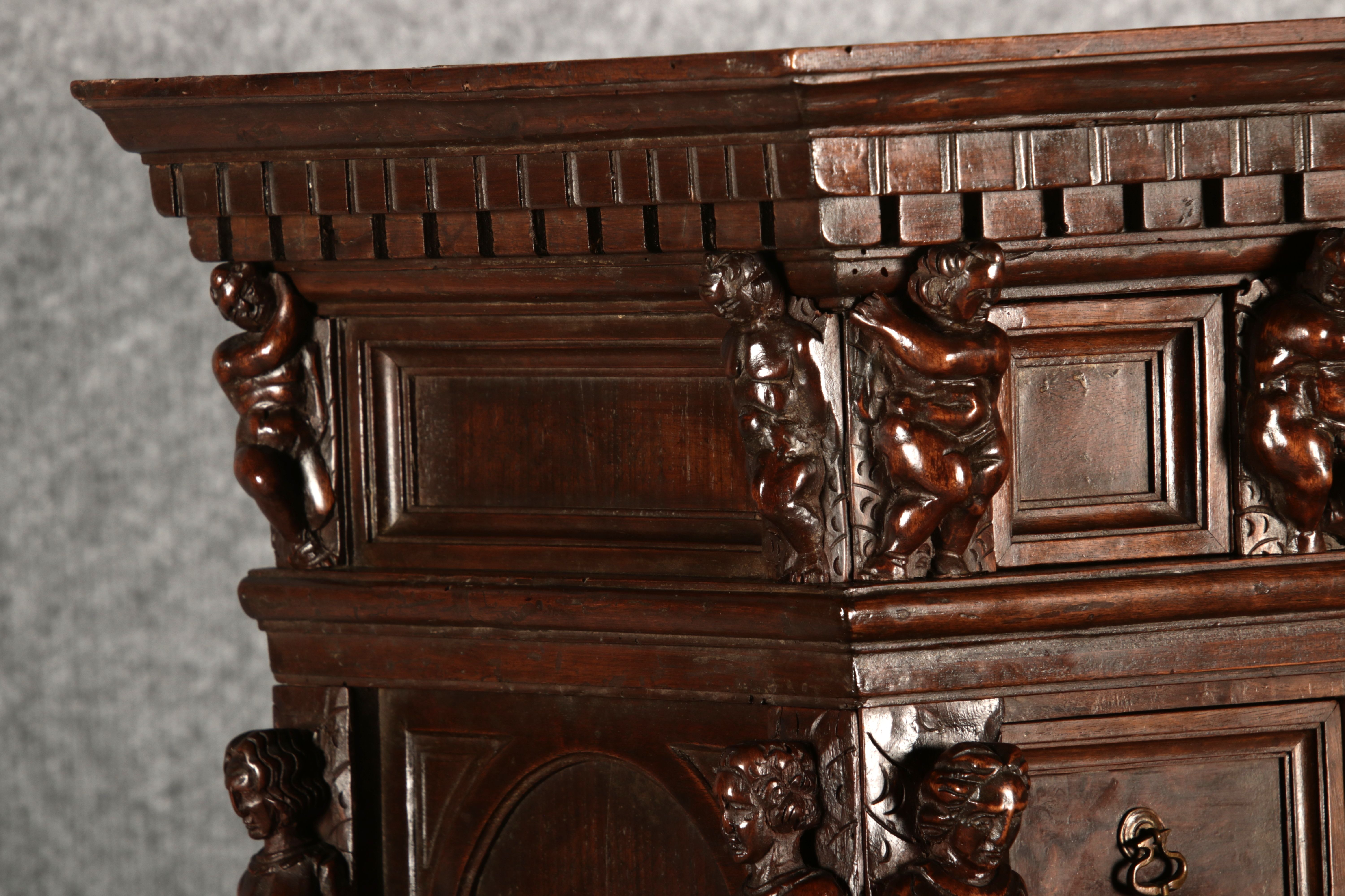 Kleiner Antiker Renaissance-Sekretär, Nussbaum, 17.-19. Jahrhundert Dieser kleine dennoch imposante Renaissance-Sekretär aus Nussbaumholz stammt aus der Zeit zwischen dem 17. und 19. (Teile des Sekretärs lassen darauf schließen, das er im 19 Jh. gefertigt worden ist, eventuell aus alten Teilen.) Jahrhundert und repräsentiert den Stil und die Handwerkskunst der Renaissance-Epoche. Das Möbelstück beeindruckt durch seine aufwendigen Schnitzereien, die kunstvolle Gestaltung und die kraftvolle Präsenz. Dieser Renaissance-Sekretär ist ein beeindruckendes Kunstwerk, das sowohl dekorativ als auch funktional ist. Seine massive Bauweise, gepaart mit der kunstvollen Gestaltung, macht ihn zu einem wahren Prunkstück für jeden Liebhaber historischer Möbel. Der Sekretär bietet nicht nur großzügigen Stauraum, sondern ist auch ein Zeugnis der meisterhaften Handwerkskunst vergangener Jahre. |