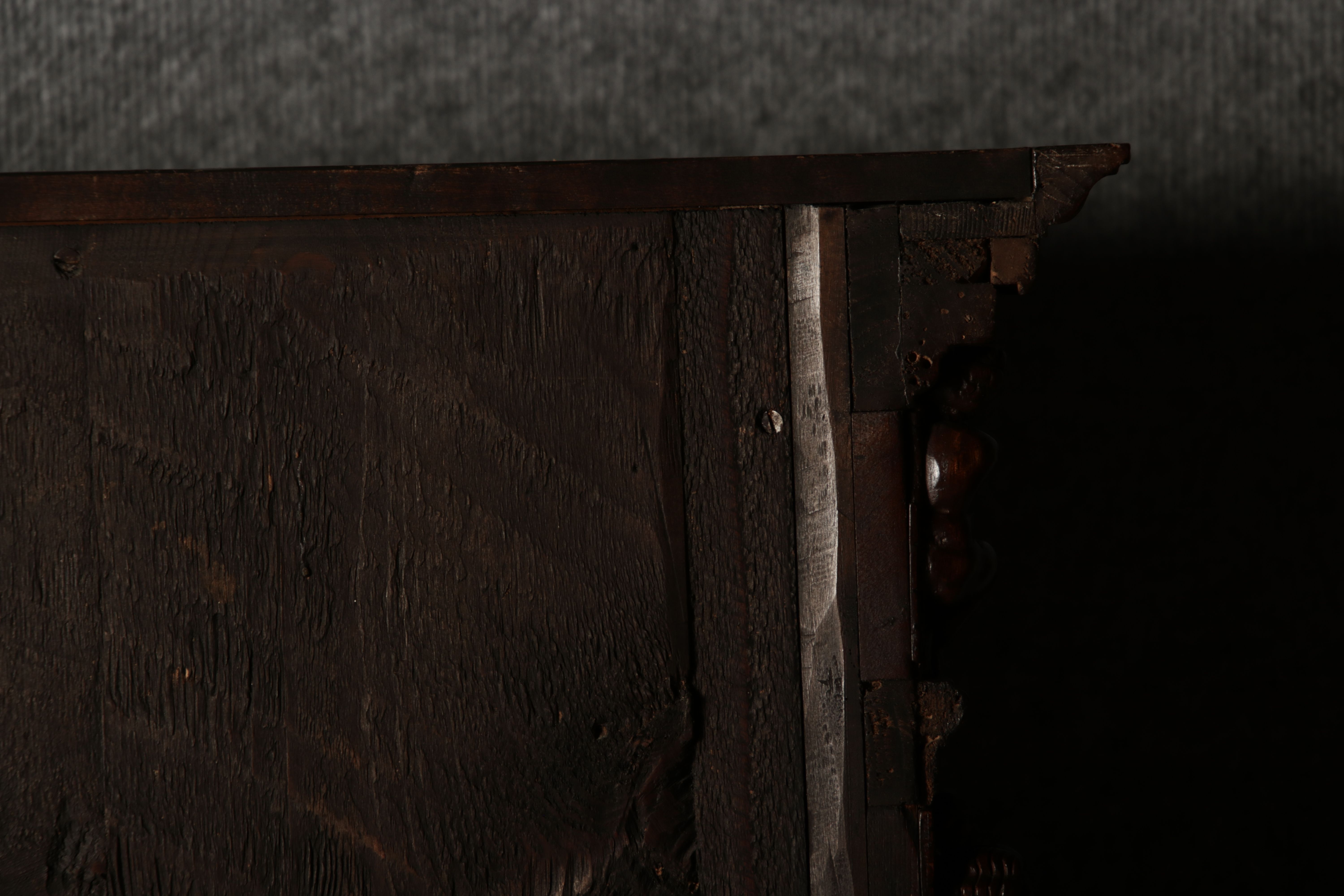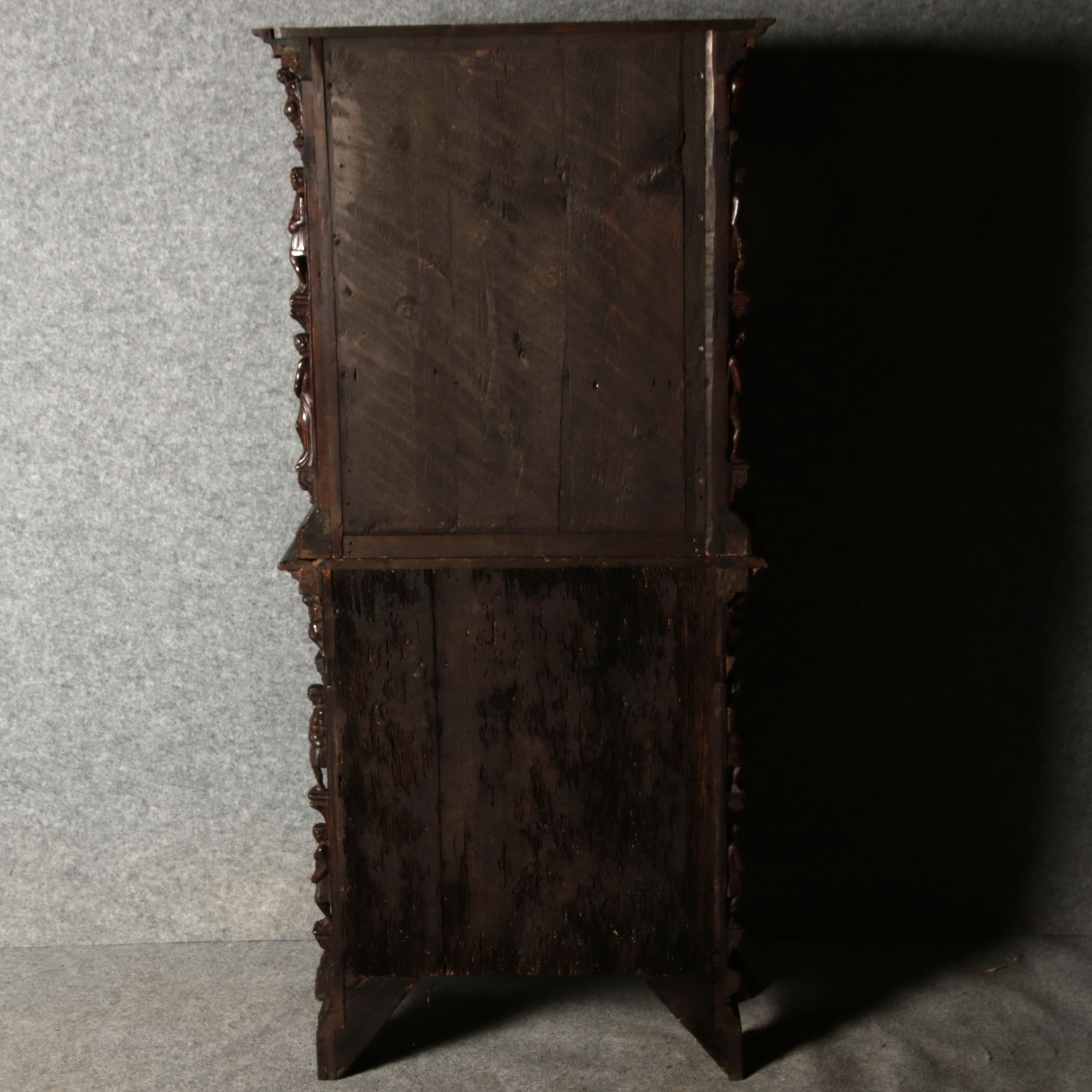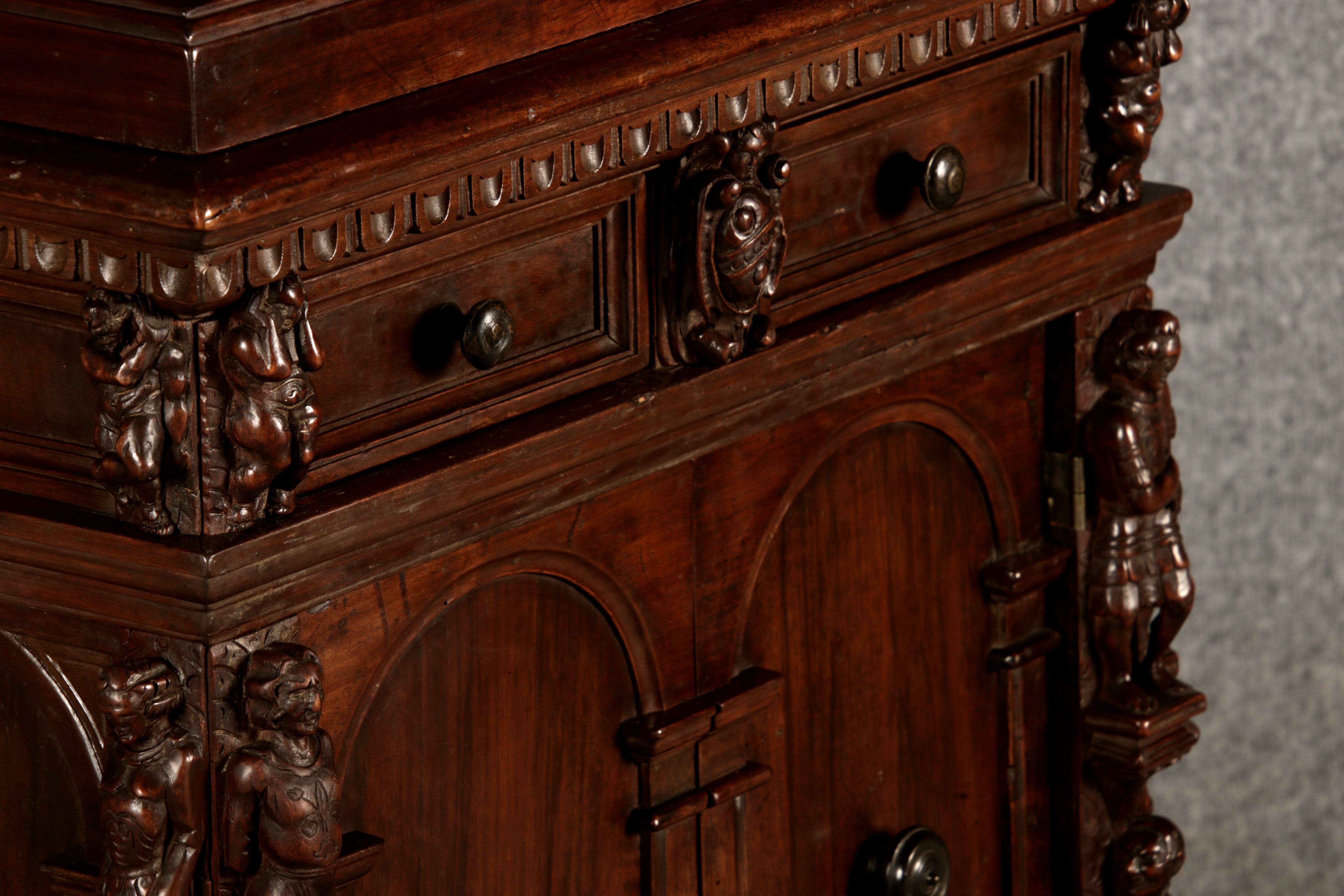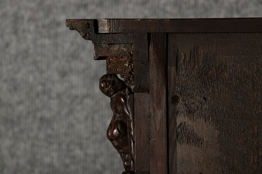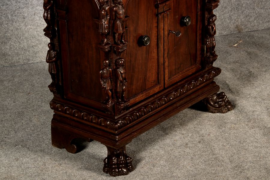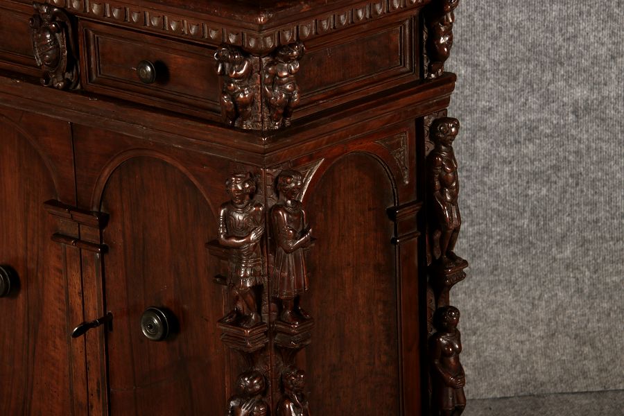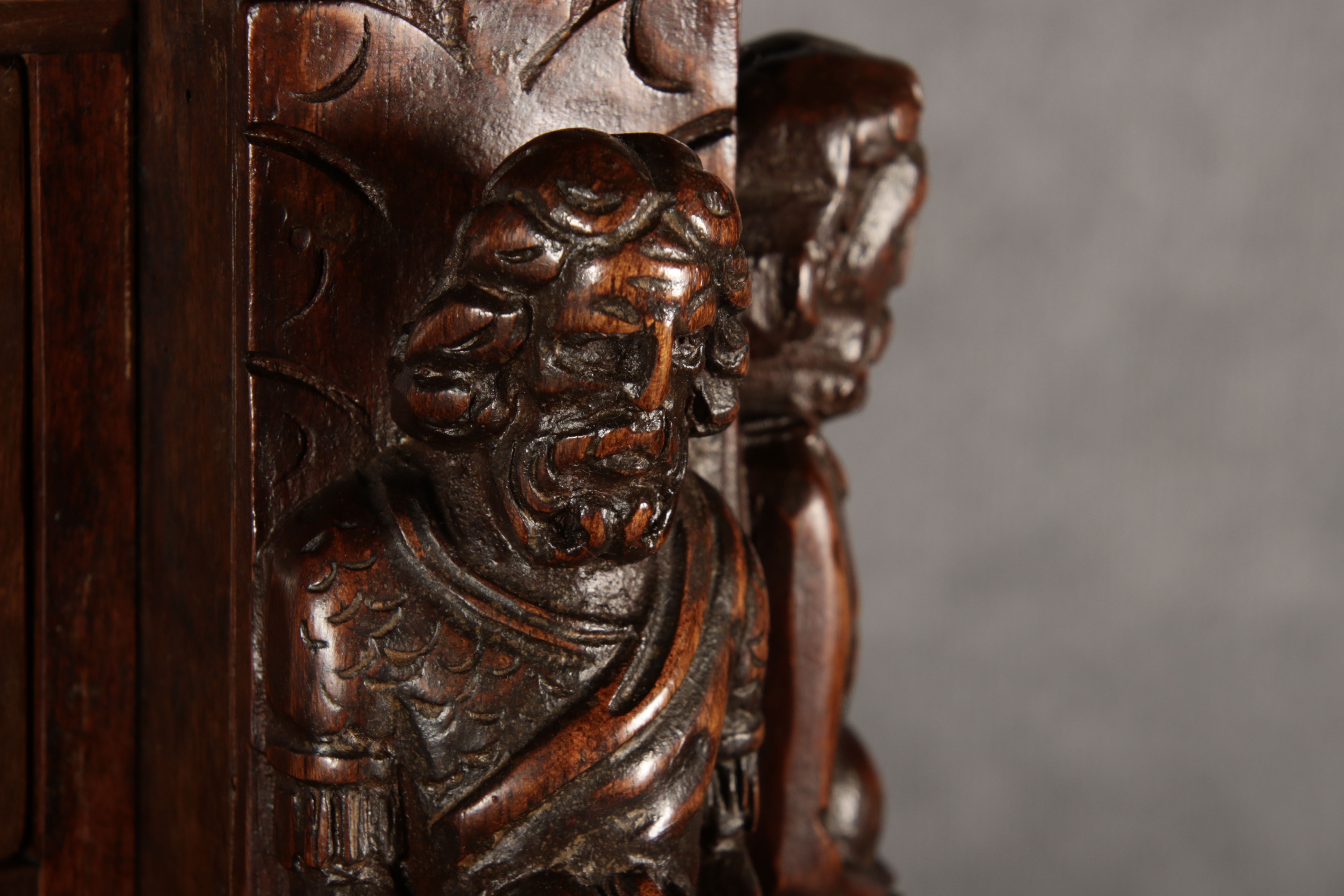 Kleiner Antiker Renaissance-Sekretär, Nussbaum, 17.-19. Jahrhundert Dieser kleine dennoch imposante Renaissance-Sekretär aus Nussbaumholz stammt aus der Zeit zwischen dem 17. und 19. (Teile des Sekretärs lassen darauf schließen, das er im 19 Jh. gefertigt worden ist, eventuell aus alten Teilen.) Jahrhundert und repräsentiert den Stil und die Handwerkskunst der Renaissance-Epoche. Das Möbelstück beeindruckt durch seine aufwendigen Schnitzereien, die kunstvolle Gestaltung und die kraftvolle Präsenz. Dieser Renaissance-Sekretär ist ein beeindruckendes Kunstwerk, das sowohl dekorativ als auch funktional ist. Seine massive Bauweise, gepaart mit der kunstvollen Gestaltung, macht ihn zu einem wahren Prunkstück für jeden Liebhaber historischer Möbel. Der Sekretär bietet nicht nur großzügigen Stauraum, sondern ist auch ein Zeugnis der meisterhaften Handwerkskunst vergangener Jahre. |