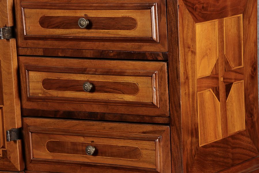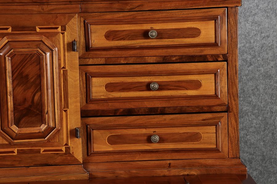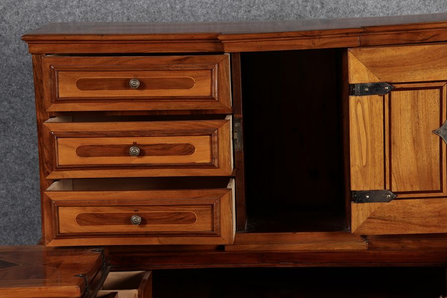 Konstruktion/construction: Der Sekretär besteht aus drei Teilen, Oberteil,Mittelteil und Unterteil.