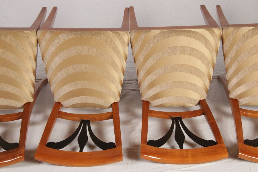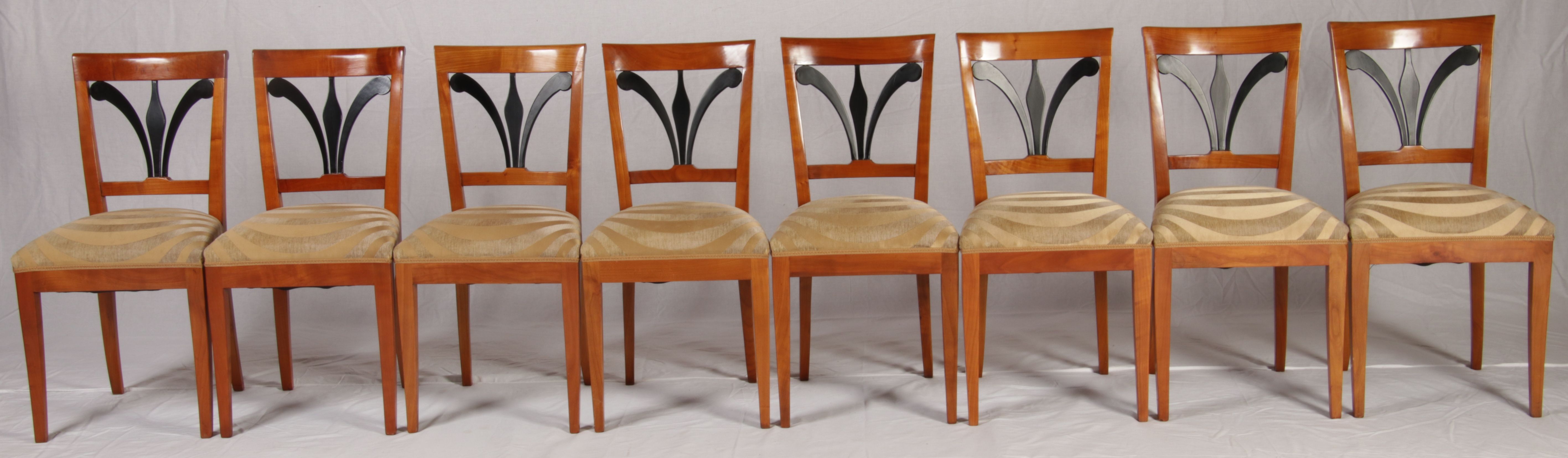 8 Antike Biedermeierstiel Stühle um 1920 Kirschbaum. Der Klassiker unter den Biedermeierstühlen. Die Stühle sind um 1920, aber ursprünglich ist der Stiel der Stühle 100 Jahre früher um 1820. |