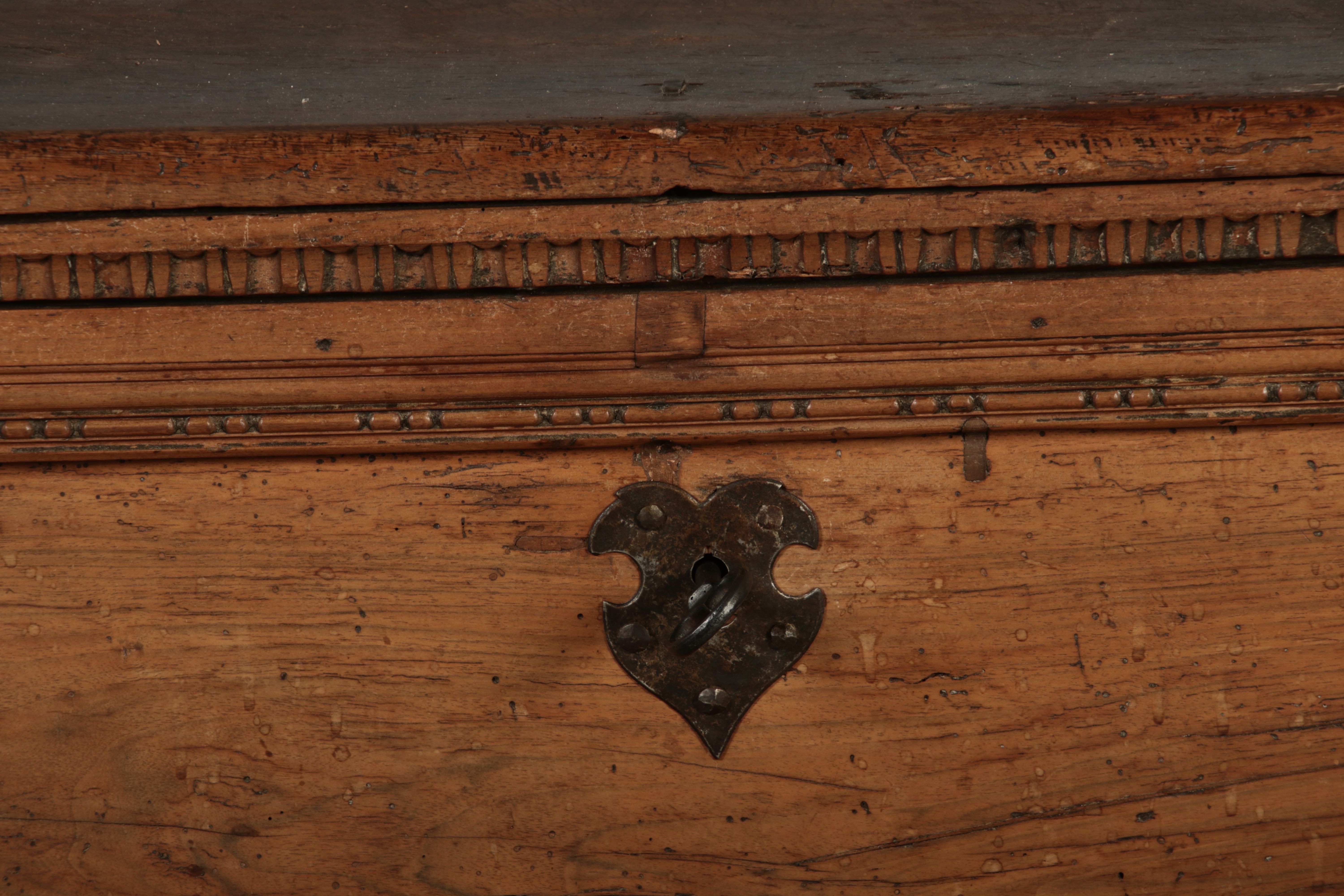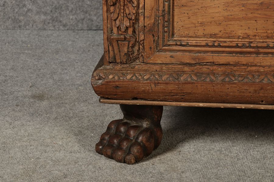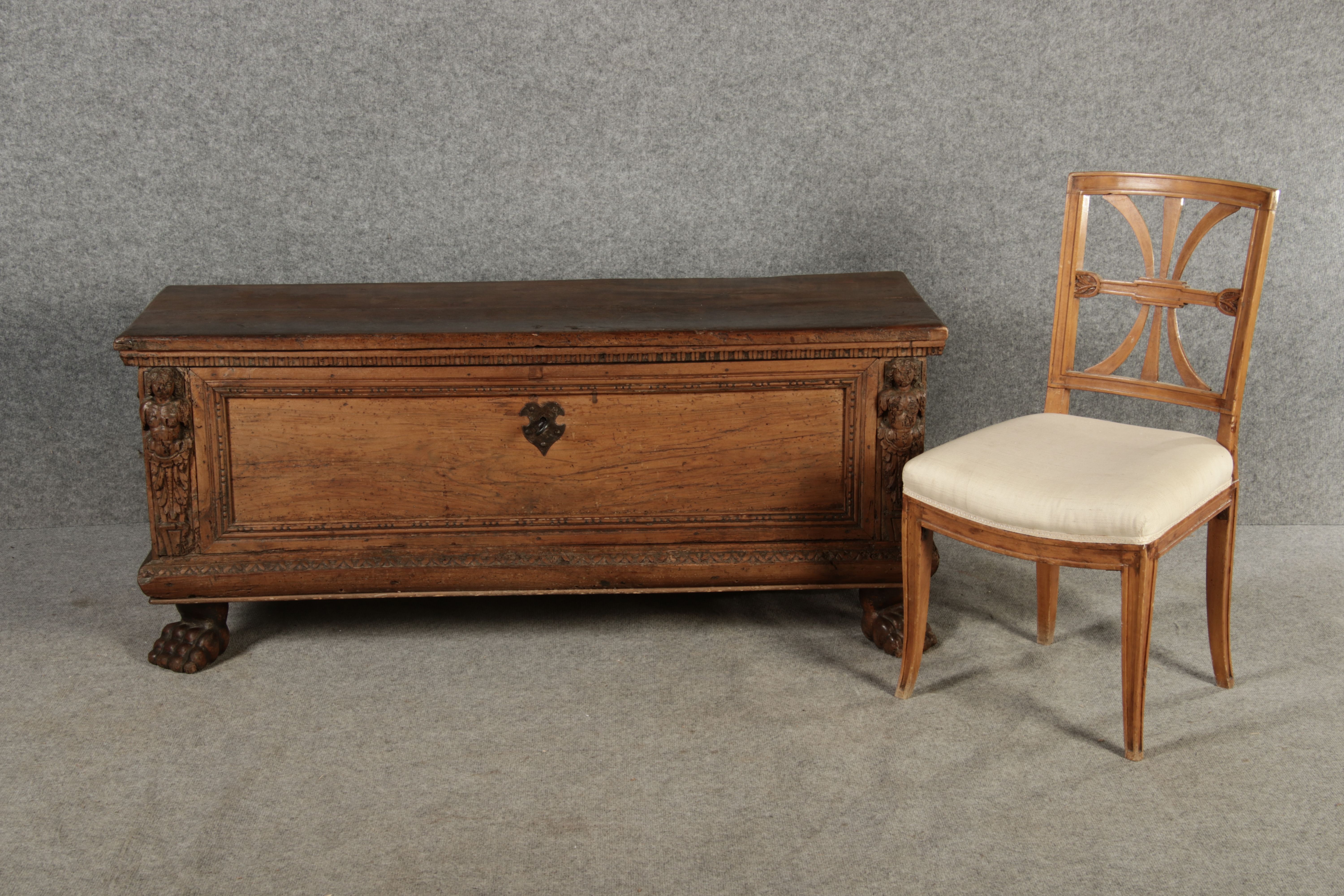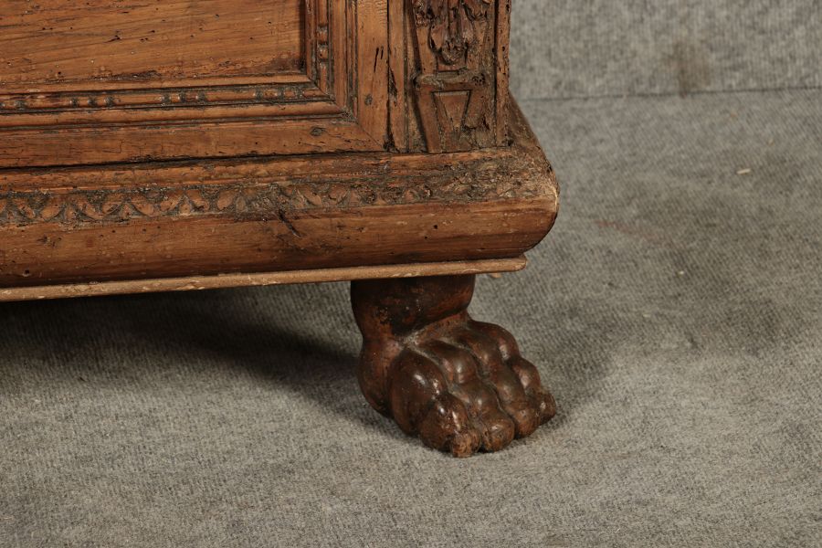 17 Jh. In Nussholz gearbeitet. Längsrechteckiger Kasten mit gerade schließendem Deckel und seitlichem, geschmiedetem Tragehenkel in Eisen. Die Front zeigt ein durchgehendes Rechteckfeld, flankiert von figürlich geschnitzten Hermenpilastern, das Kassettenfeld breit gerahmt. Unteres Profil in Godronnierung leicht vortretend, über kurzen Stollenfüßen in Form von Löwen Tatzen. Im Inneren original Eisenschloss. Mit schöner Alterspatina. Ansonsten in sehr guter Erhaltung.