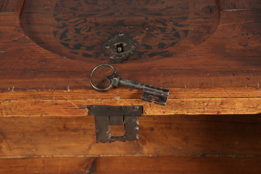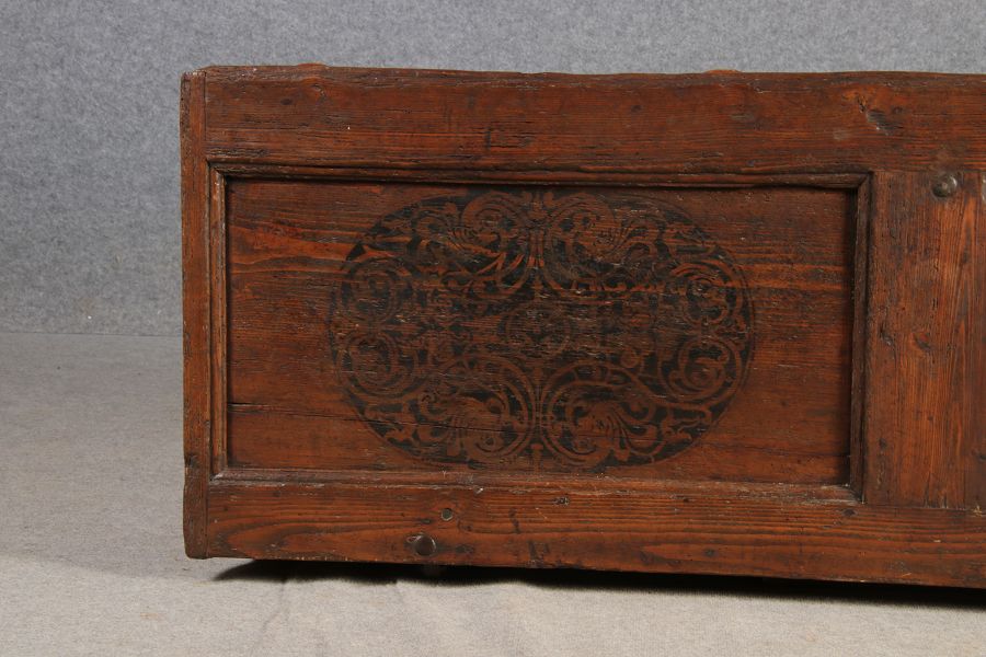 Antike 2 m lange Spät Renaissance früh Barock Truhe 17 Jh. Schwarz Malerei Eisenschloss |