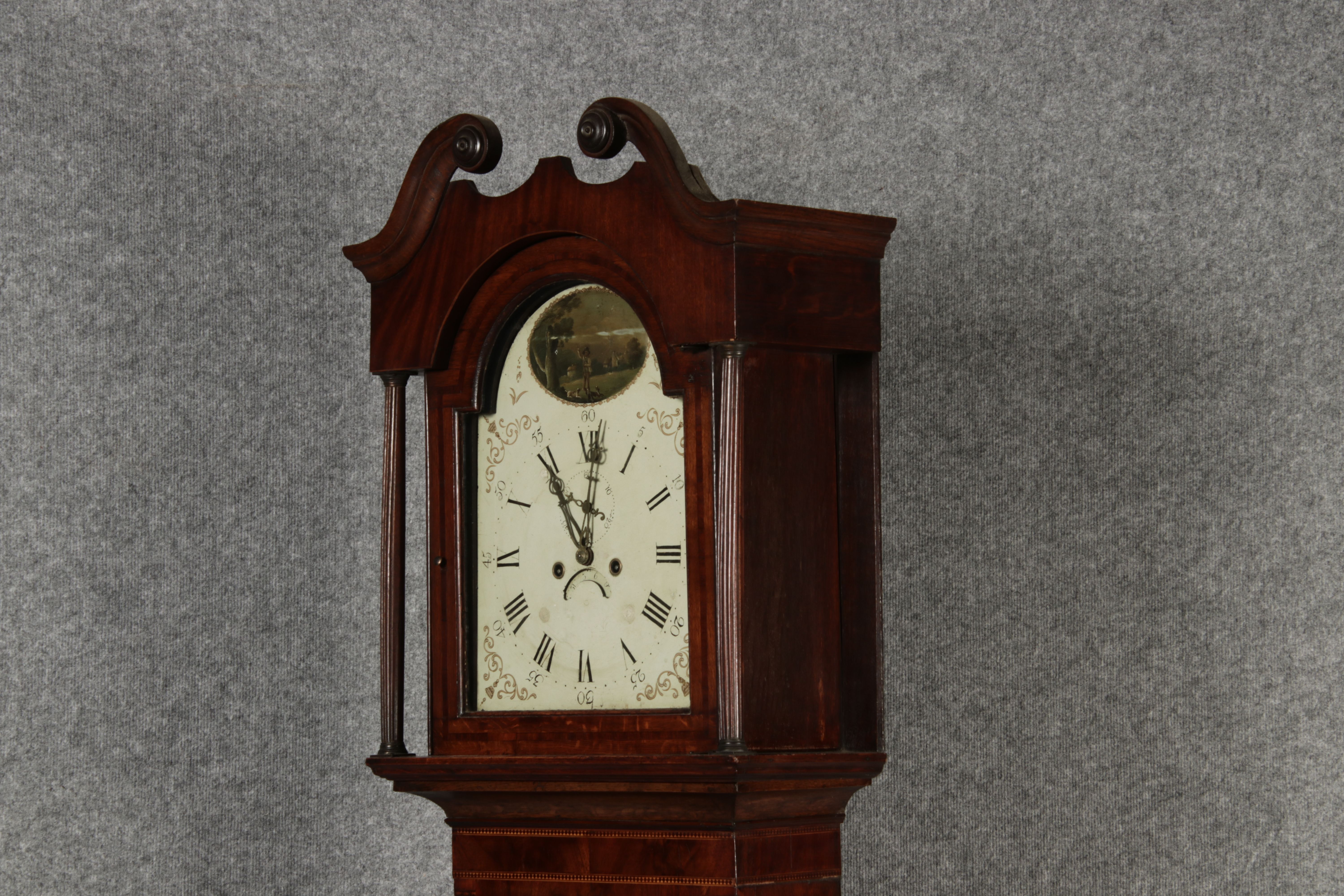 Antike Englische Standuhr im klassischen Design aus dem 19 Jh. Diese elegante antike Standuhr besticht durch ihre handwerkliche Verarbeitung und die Verwendung von Edler Hölzer, die dem Stück eine warme Ausstrahlung verleihen. Die Uhr verfügt über ein Gehäuse aus massivem Holz, das einen tiefen, warmen Ton hat und mit einer geschmackvollen Patina versehen ist, die im Laufe der Jahre entwickelt wurde. Die geschwungene Krone im klassischen Stil sowie die detailreiche Gestaltung des Ziffernblatts tragen zum Erscheinungsbild bei. Das Ziffernblatt selbst ist mit römischen Ziffern versehen und zeigt feine Verzierungen im Barockstil. Über dem Ziffernblatt befindet sich eine dekorative Malerei, die eine ländliche Szene darstellt, und dem Design einen zusätzlichen Hauch von Eleganz und Kunstfertigkeit verleiht. Die Uhr besitzt ein mechanisches Uhrwerk, das über ein Pendel angetrieben wird.