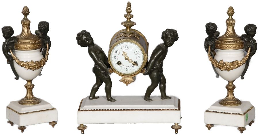 Für XXL Bild hier klicken1 Uhren Spezifikationen Art der Uhr Kamin- Uhr Tisch- Uhr mit Beistellern Alter und Herkunft Alter Wahrscheinlich Mitte 19 Jh. und die Herkunft ist wahrscheinlich Frankreich Gehäuse Material Messing Bronze Mamor Masse Uhr Höhe ca. 33 cm, Breite ca. 26 cm Masse Beisteller Höhe ca. 31 cm, Breite ca. 13 cm Material Uhrwerk Messing Eisen Pendel- Aufhängung Pendelfeder Hemmung Ankerhemmung Schlagwerk 1/2 Stunden und volle Stunden Schlag auf Glocke Zustand Gehäuse Guter Zustand mit Gebrauchsspuren, Bilder sind Bestandteil der Auktion. Zustand Uhrwerk Guter Zustand mit Gebrauchsspuren. Uhrwerk ist vor ca. 3 Jahren überholt worden und läuft einwandfrei. Bilder sind Bestandteil der Auktion. |