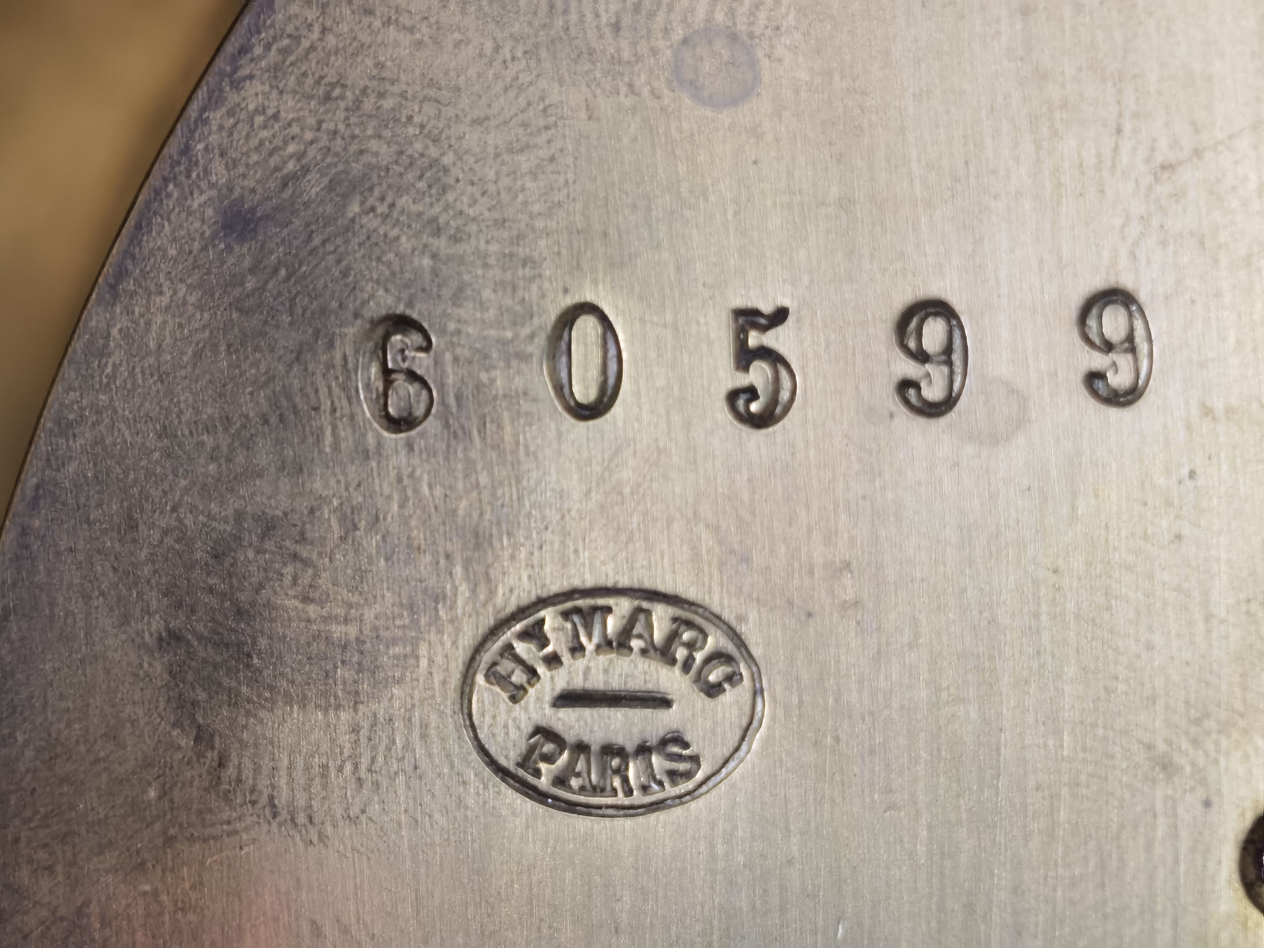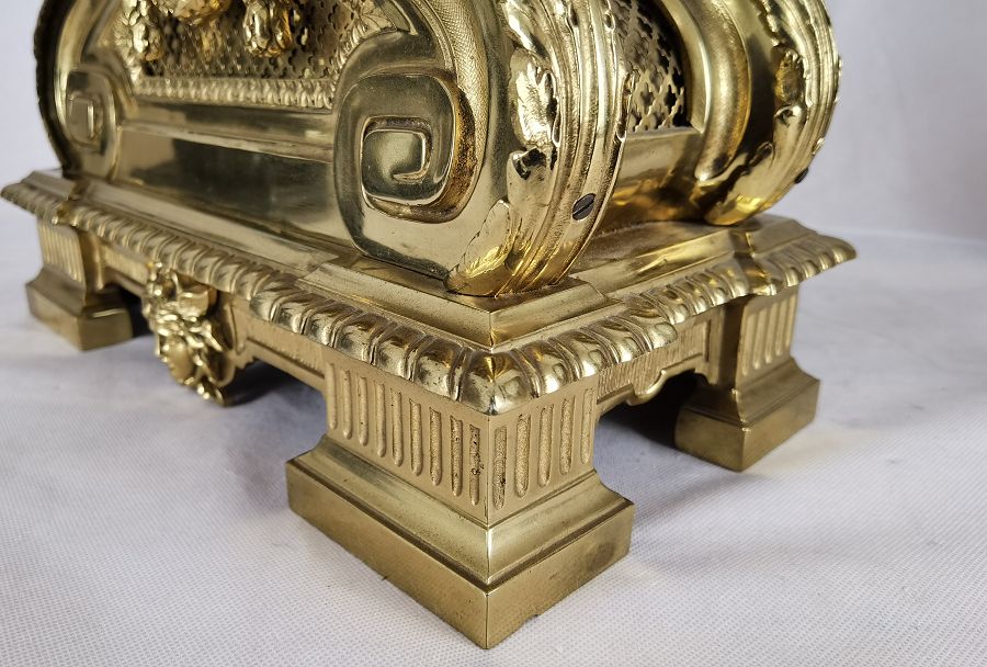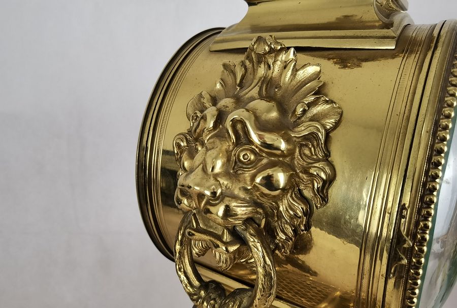 für die Minuten. Das Uhrwerk ist auf der Platine mit der Signatur des Uhrmachers "Hymarg Paris" versehen. Dieses sorgfältig gearbeitete Stück ist mit einer Schale versehen, die das ewige Feuer enthält. Auf beiden Seiten sind Löwenköpfe die mit Trageringen versehen. Der Zylinder des Uhrwerks wird von Konsolen aus Akanthusblättern getragen. Das Ganze ruht auf einer gestuften Basis mit rechteckigem Querschnitt. |