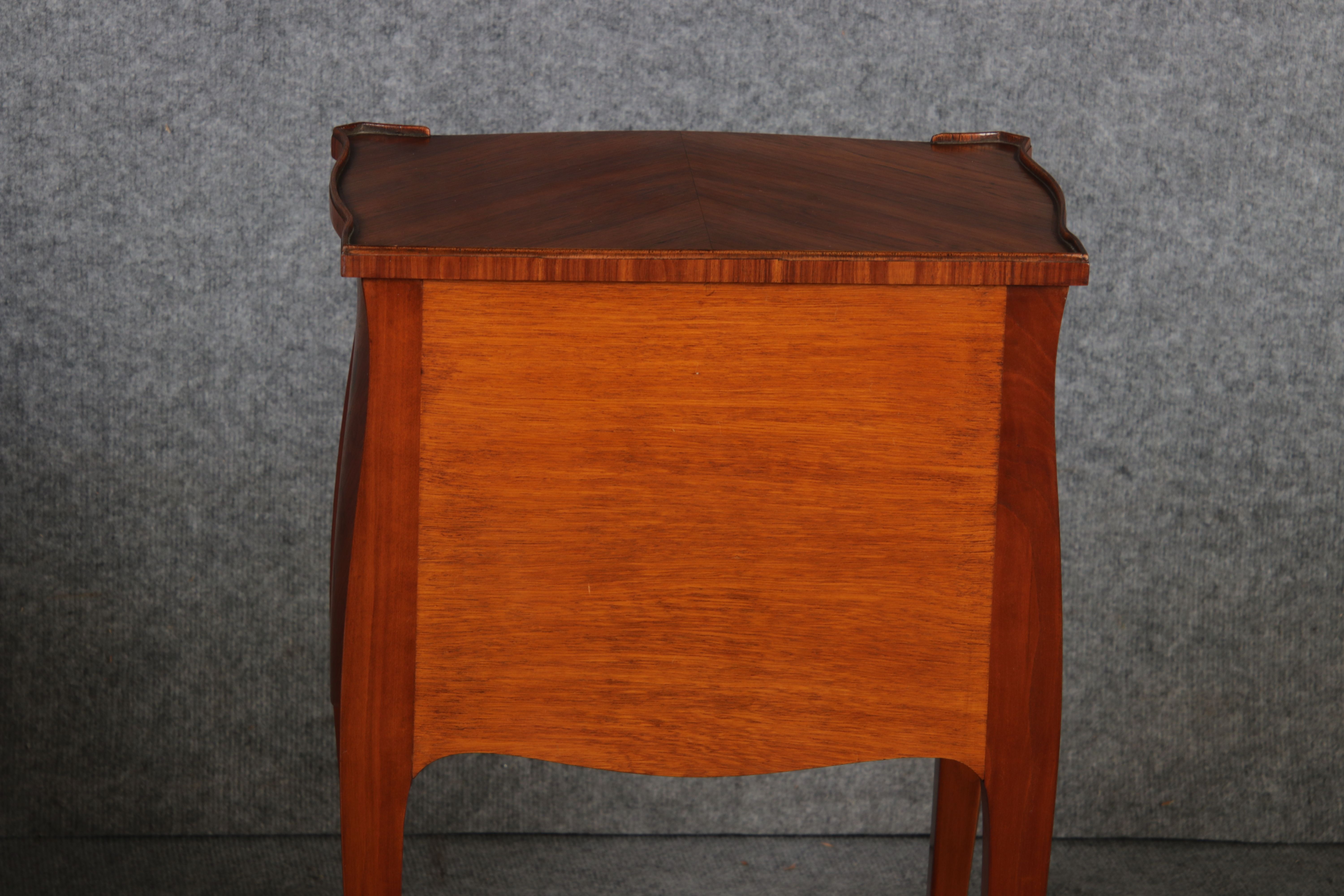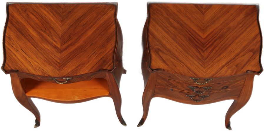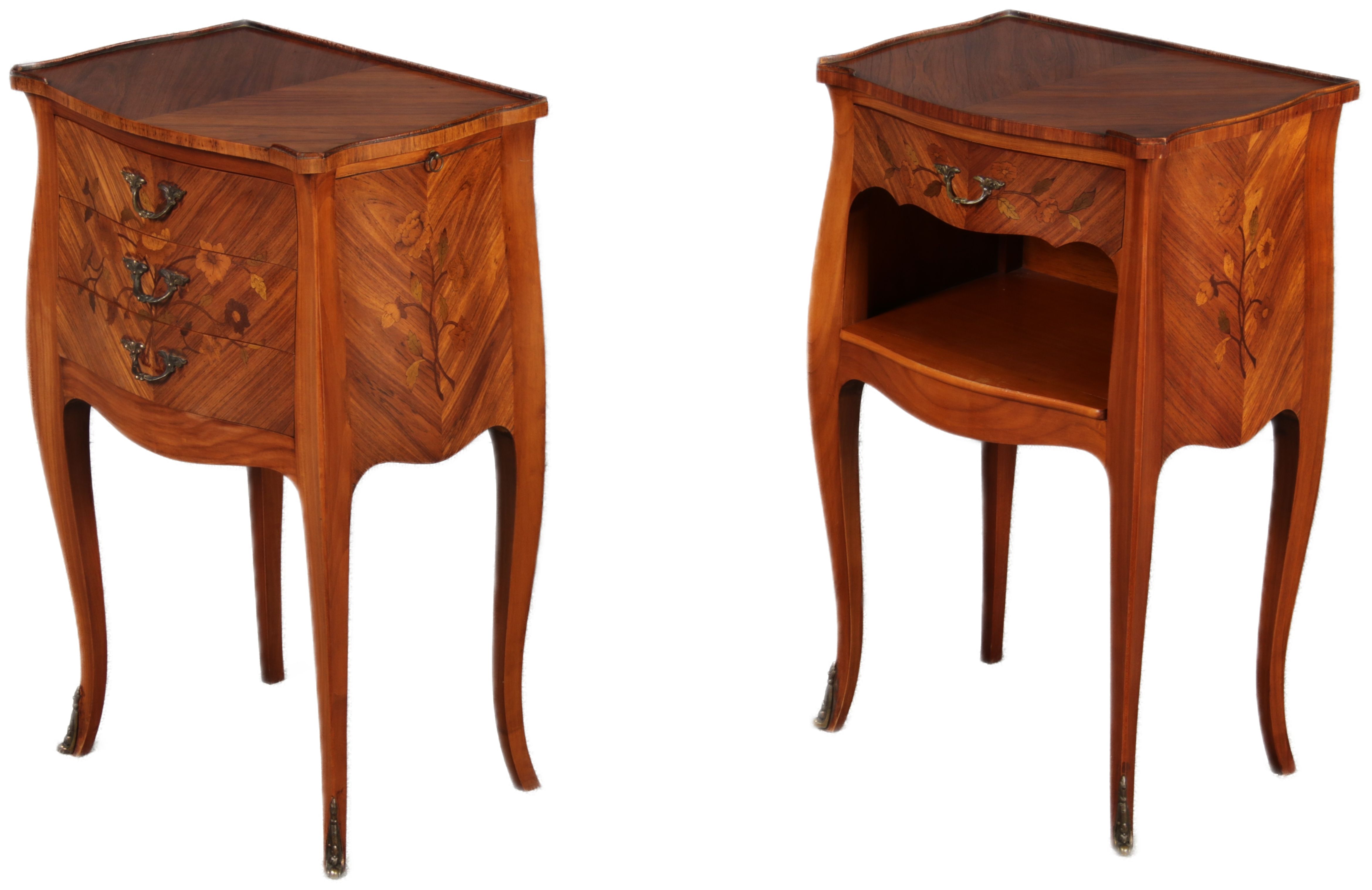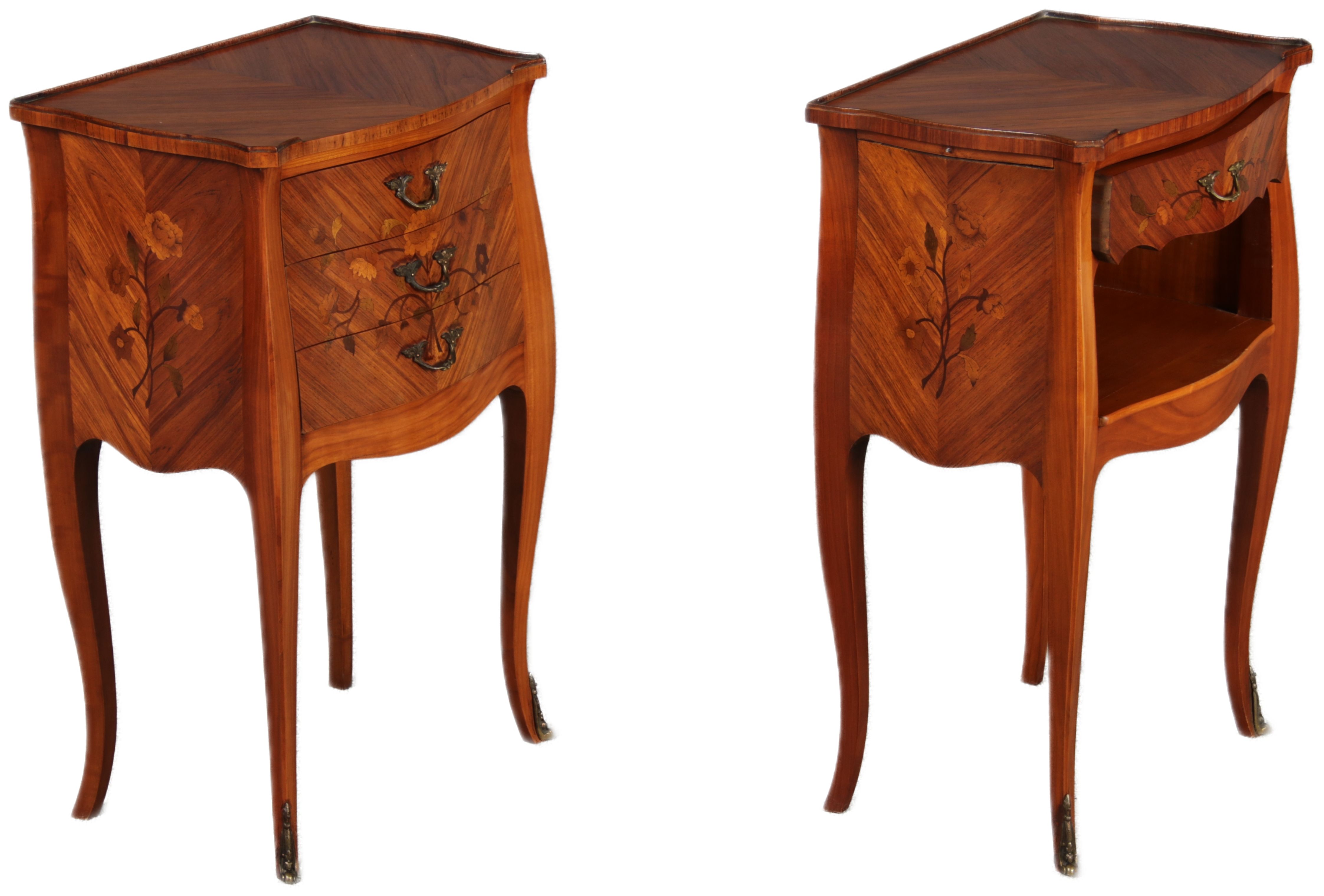 | zwei Antike Nachttische Blumen Intarsien Louis XV Stil | ||
