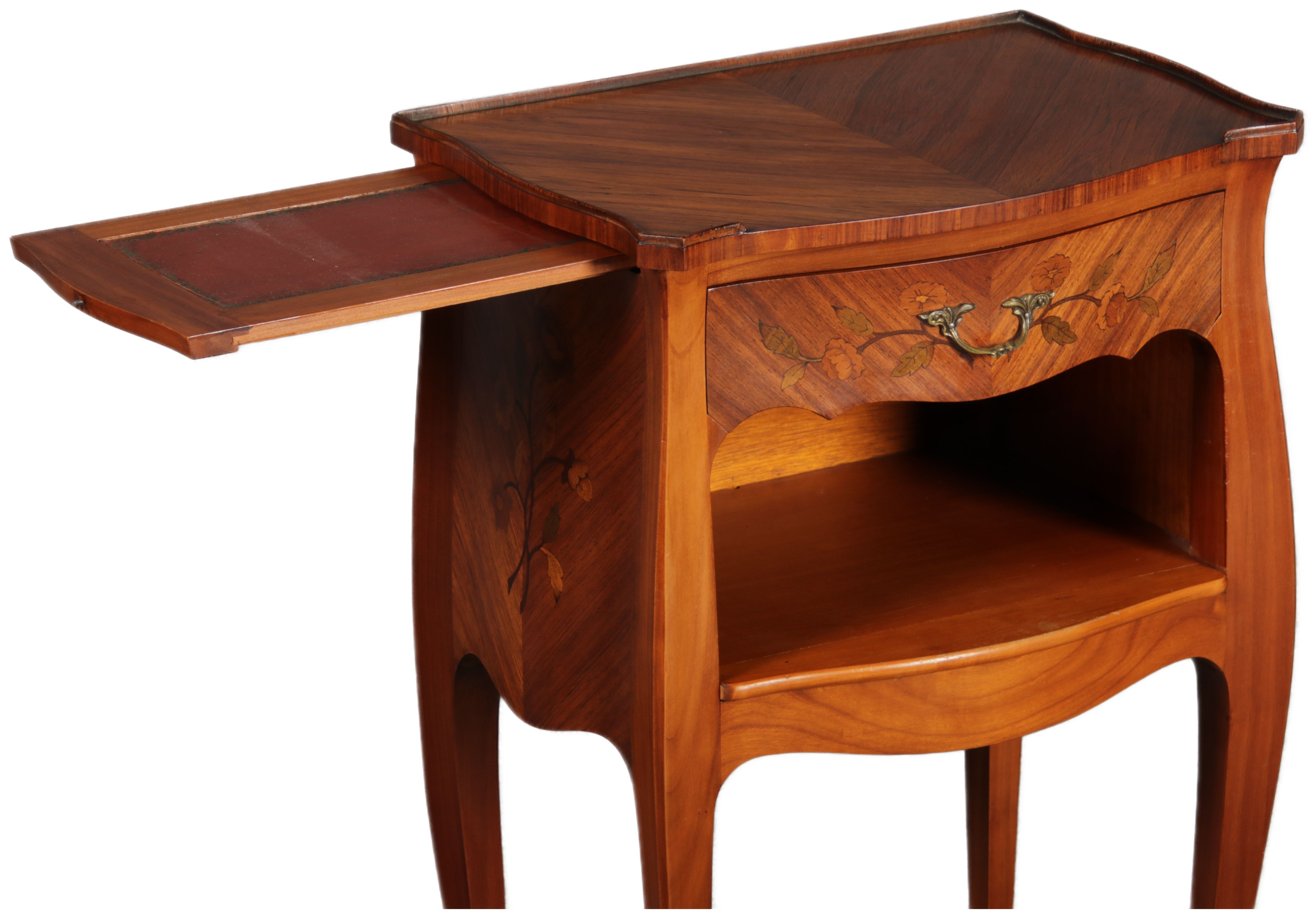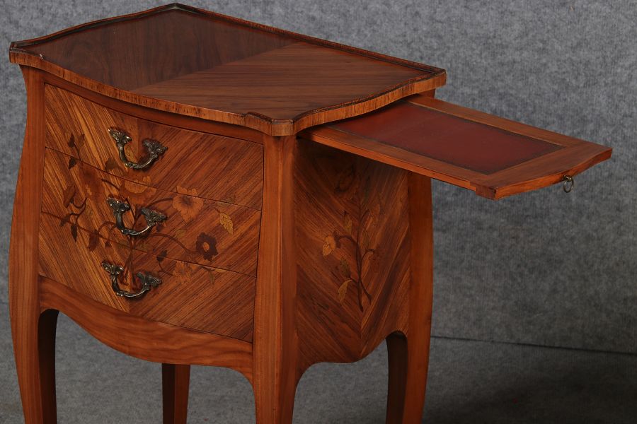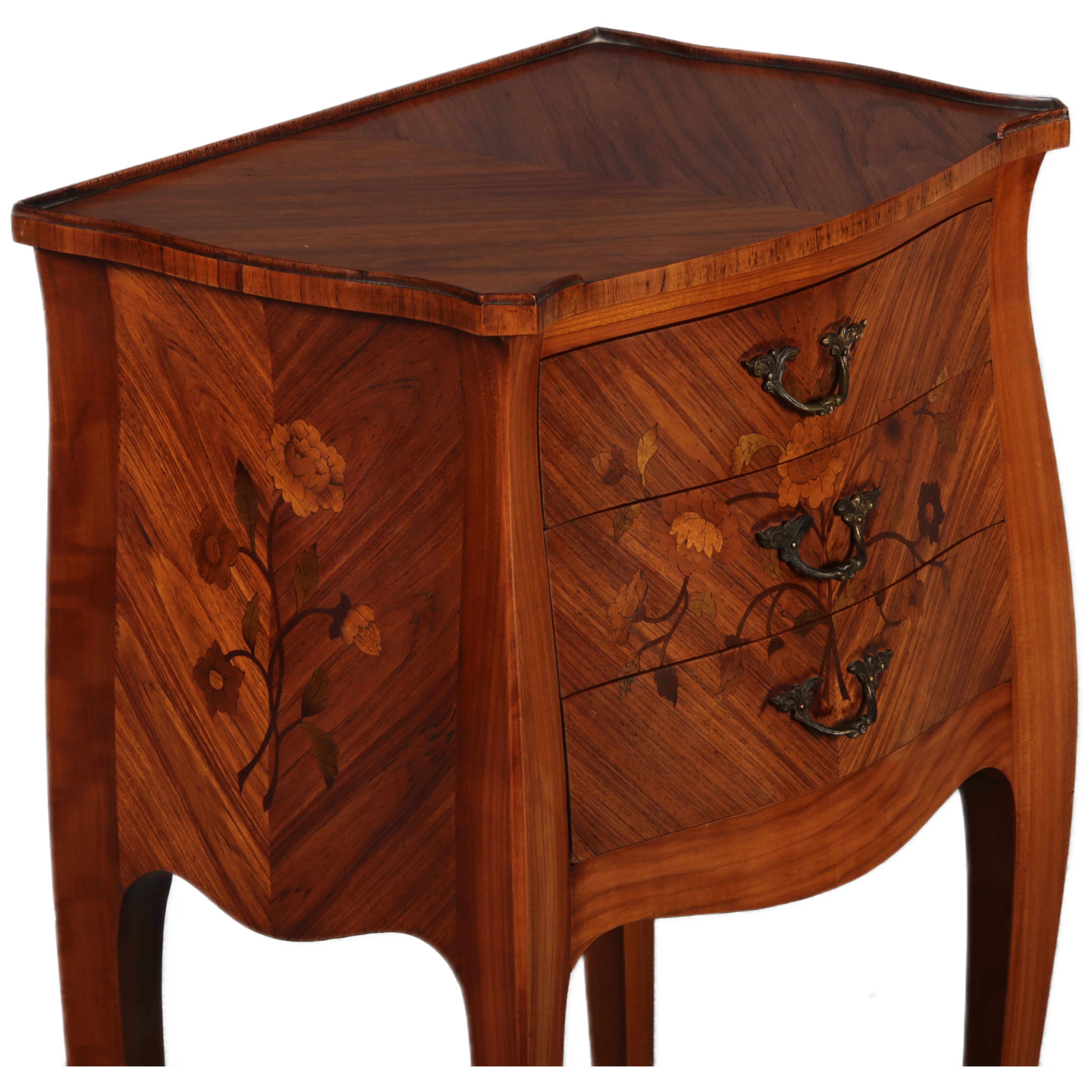 | zwei Antike Nachttische Blumen Intarsien Louis XV Stil | ||