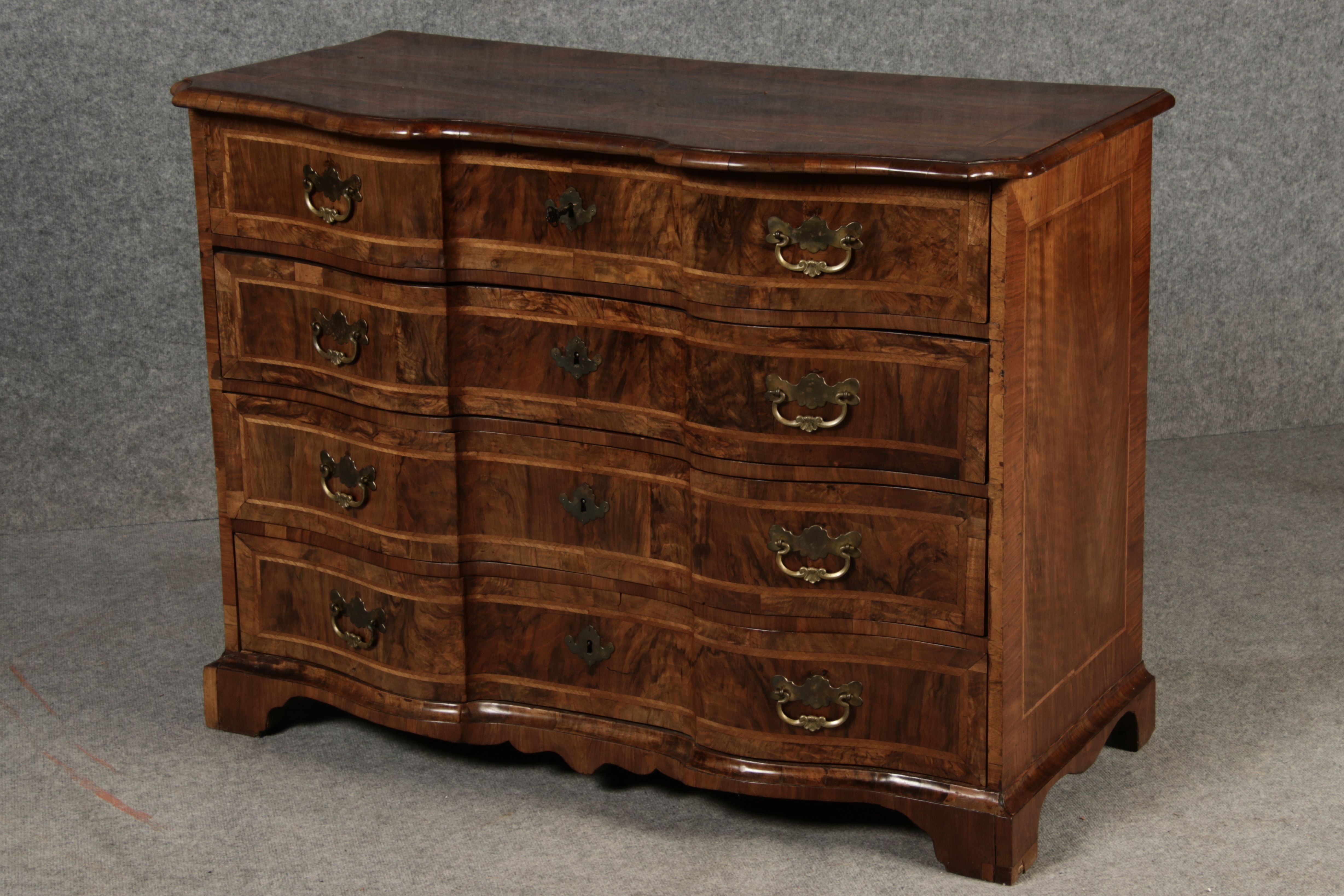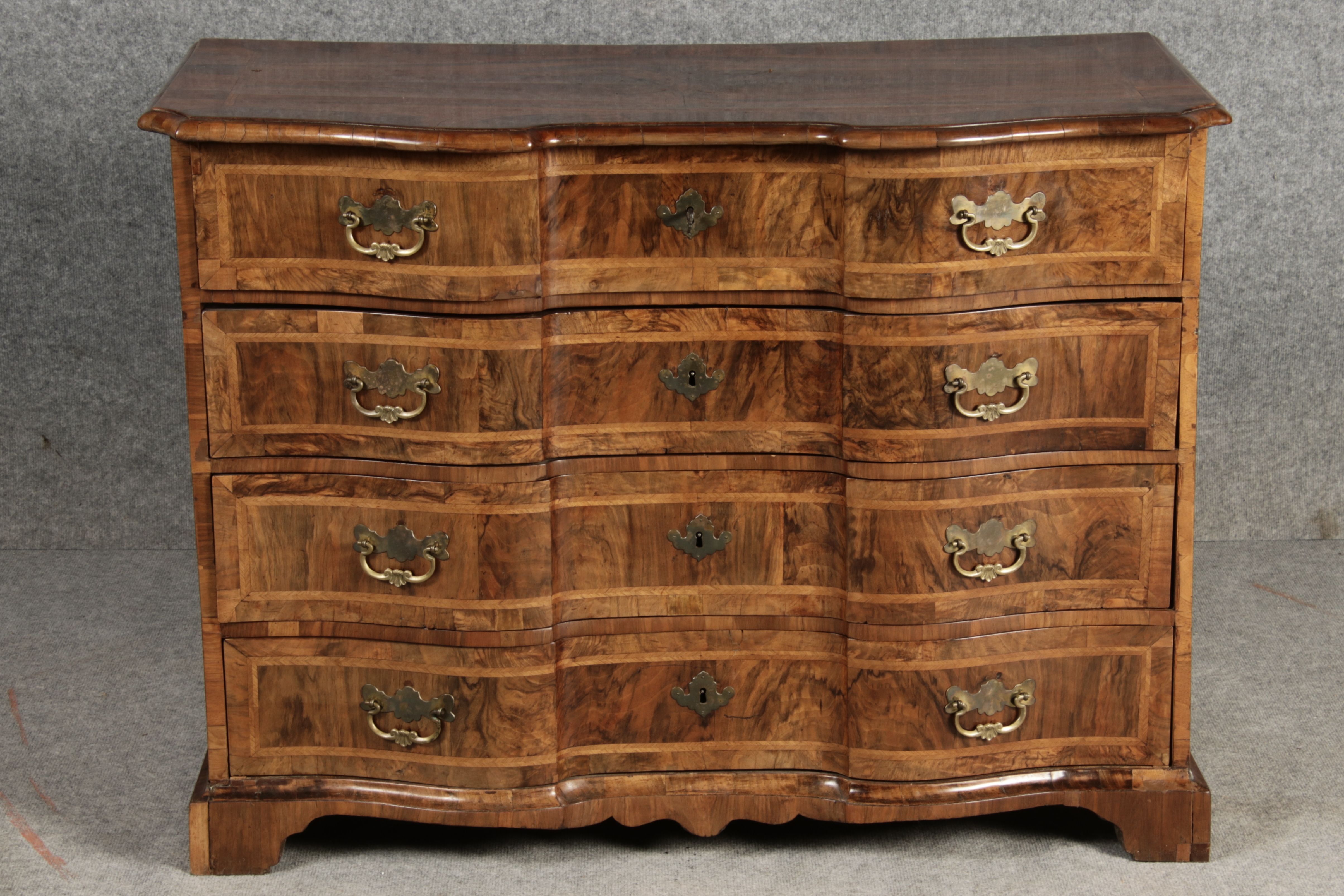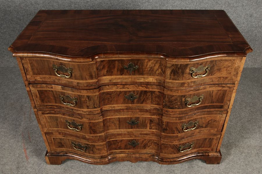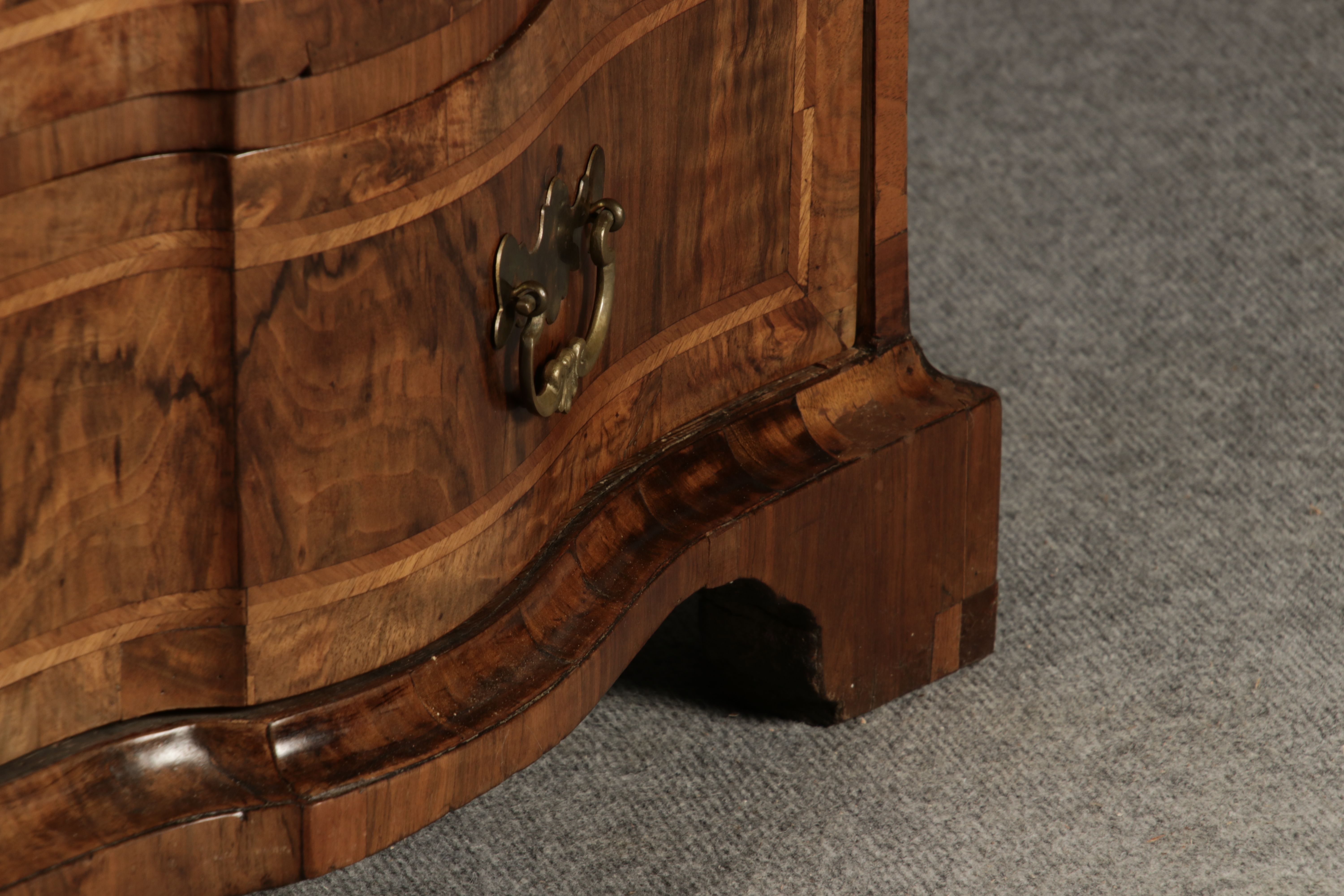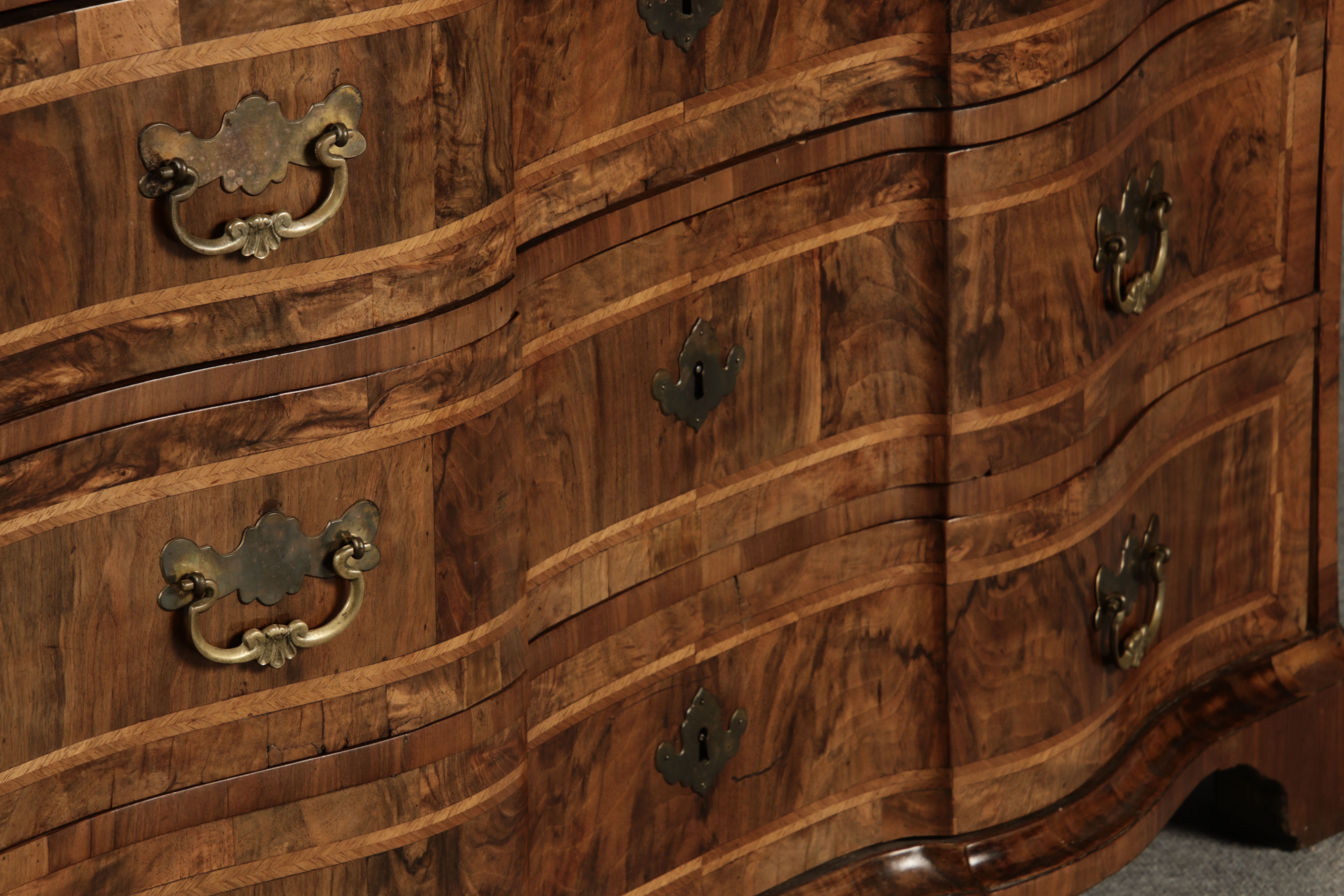 | Antike Barockkommode 4 Schubladen Nussbaum Einlegearbeiten geschweift 18 Jh. |
