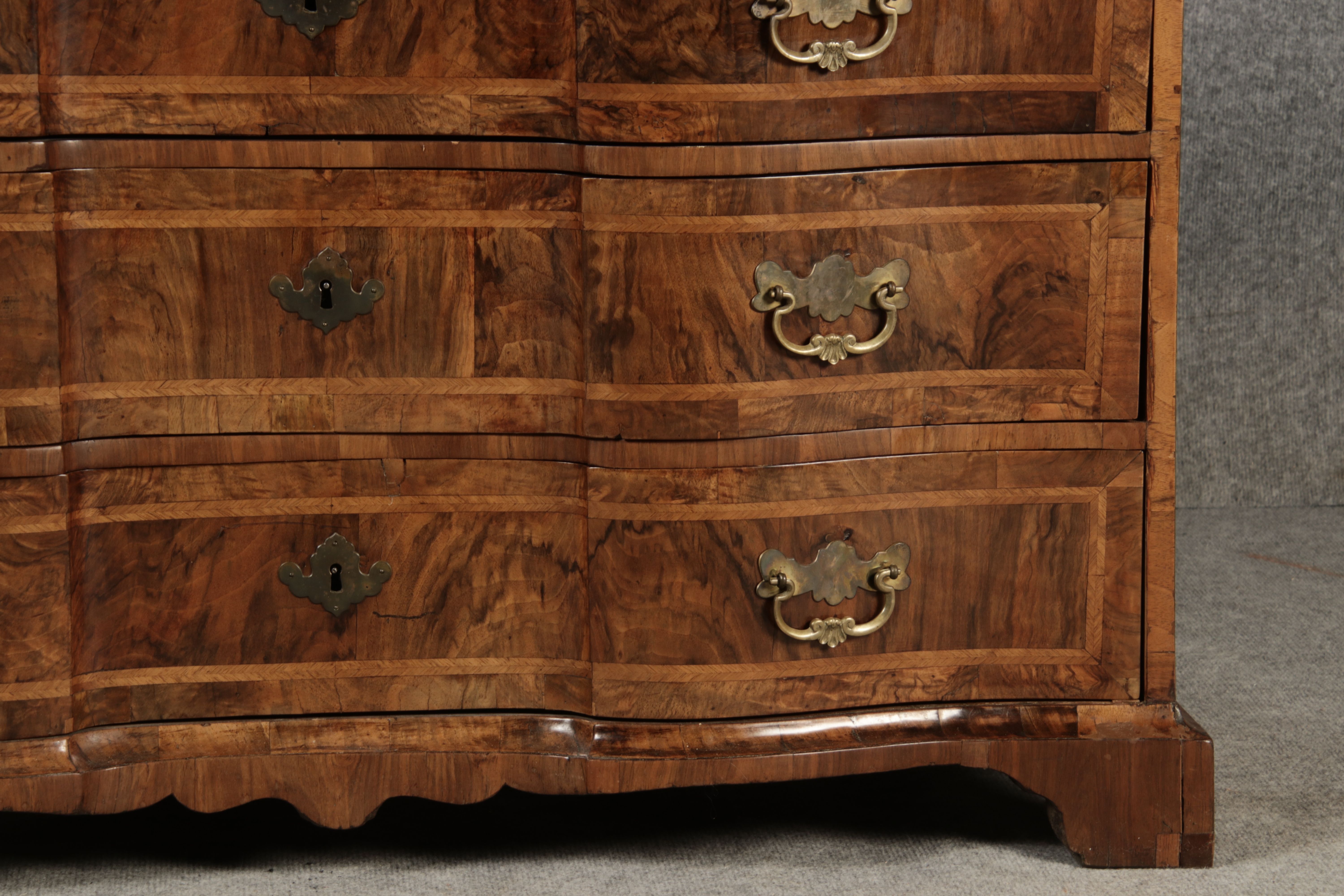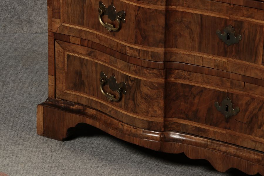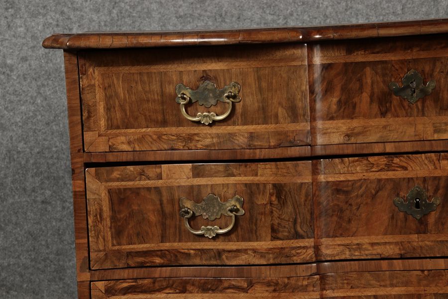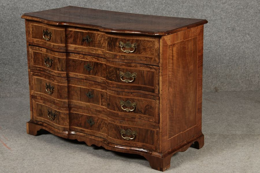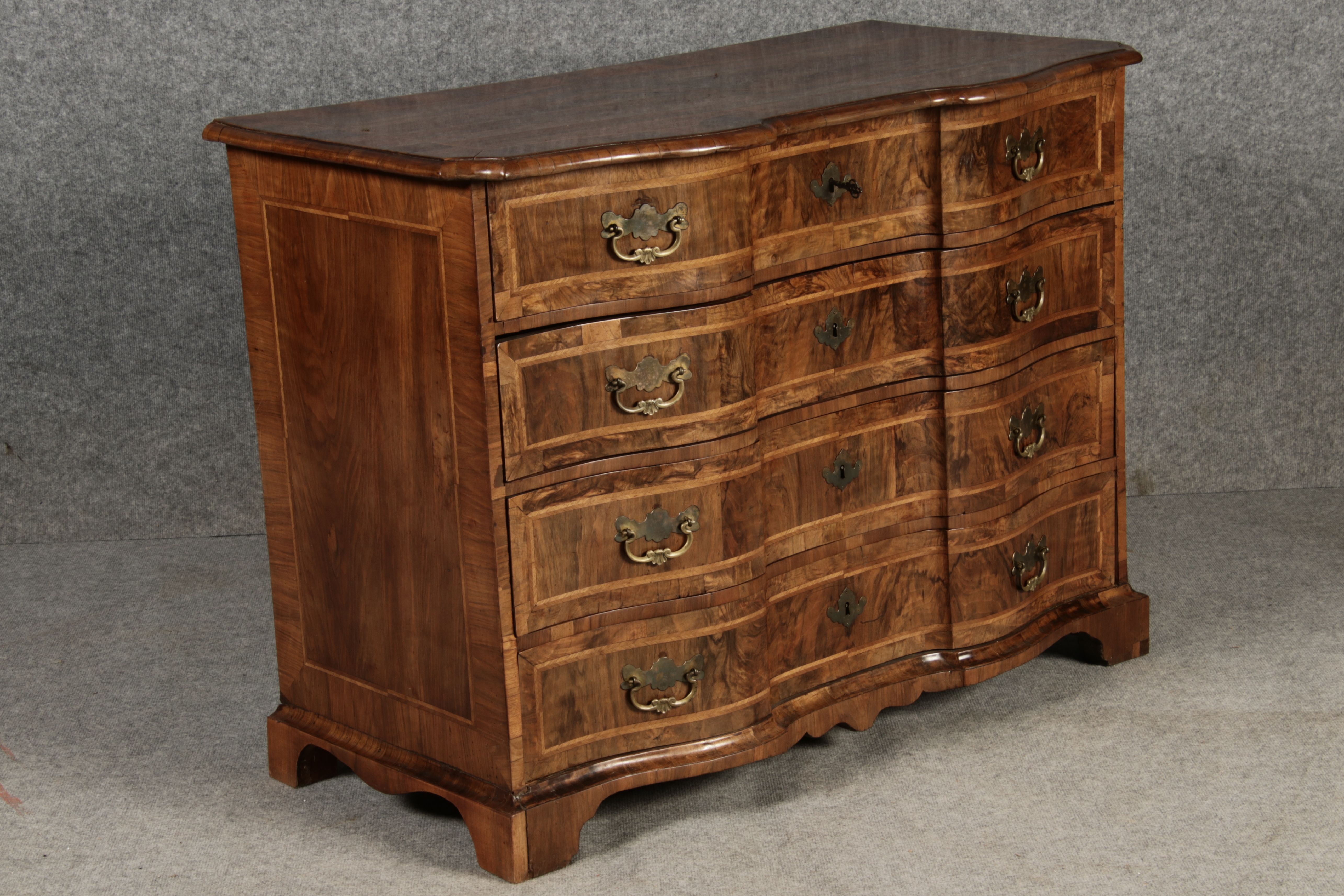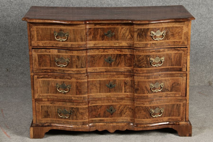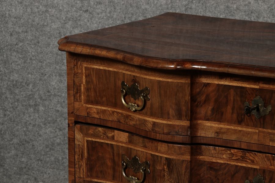 | Antike Barockkommode 4 Schubladen Nussbaum Einlegearbeiten geschweift 18 Jh. |
