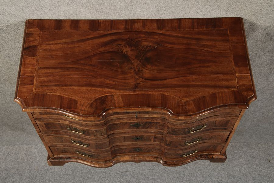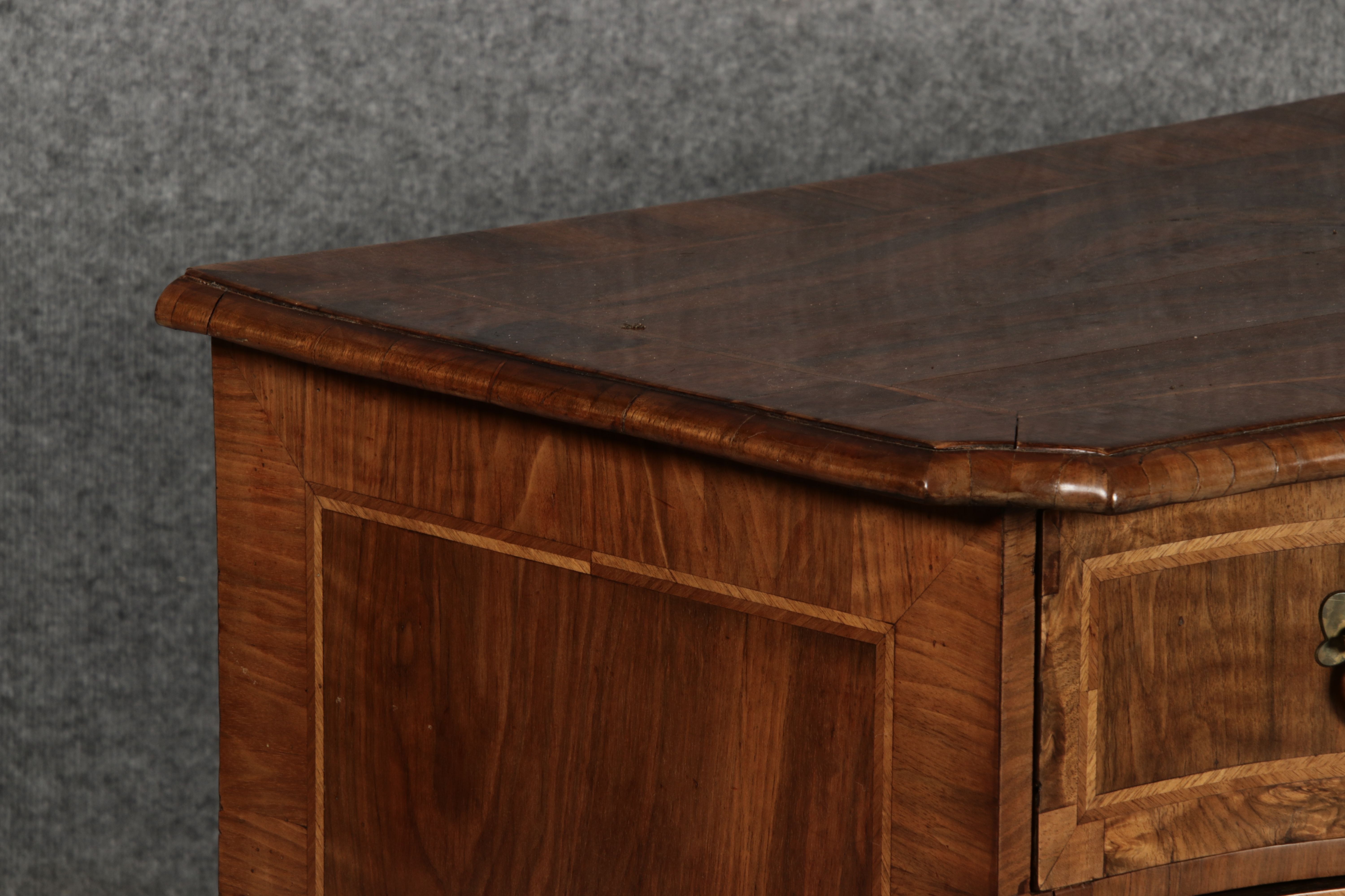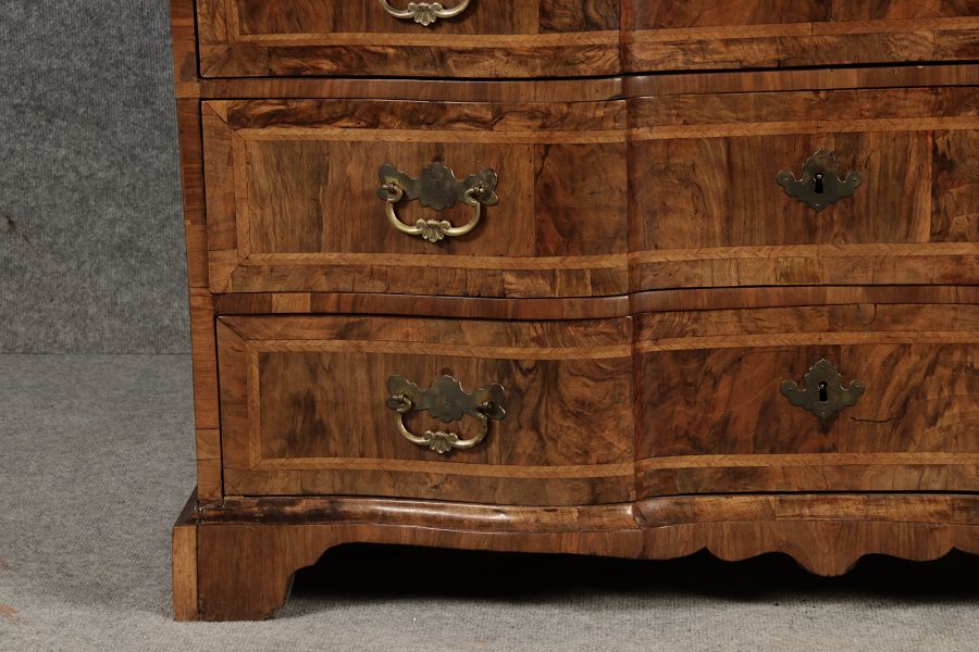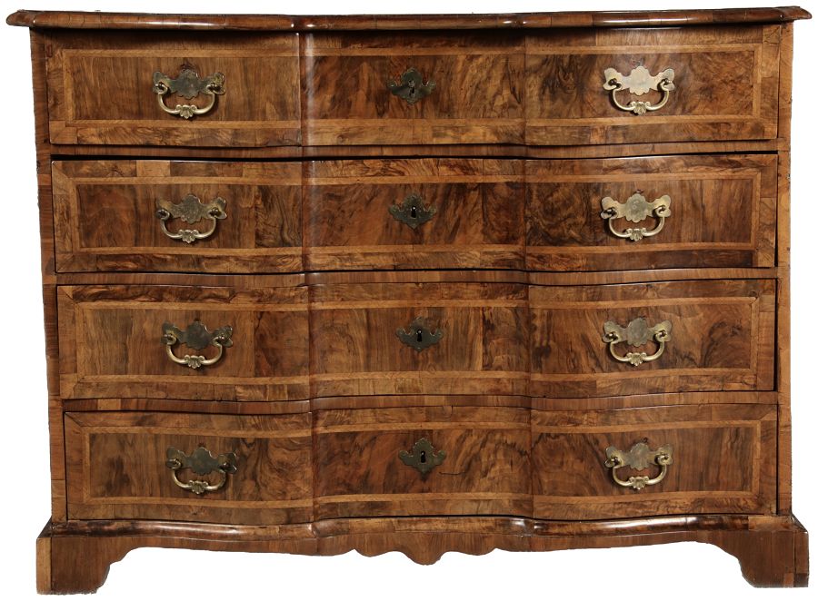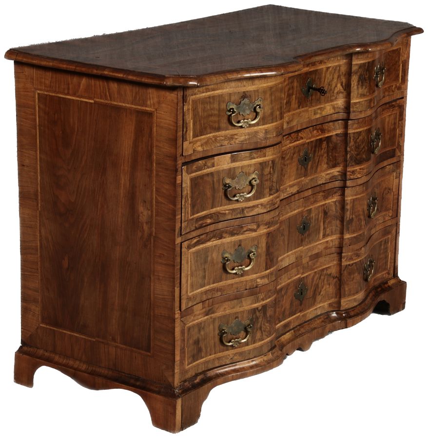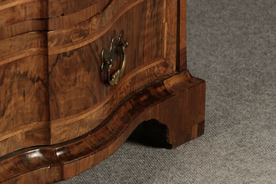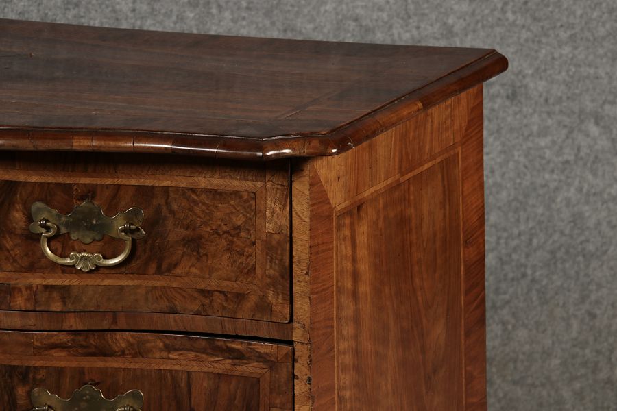 | Antike Barockkommode 4 Schubladen Nussbaum Einlegearbeiten geschweift 18 Jh. |