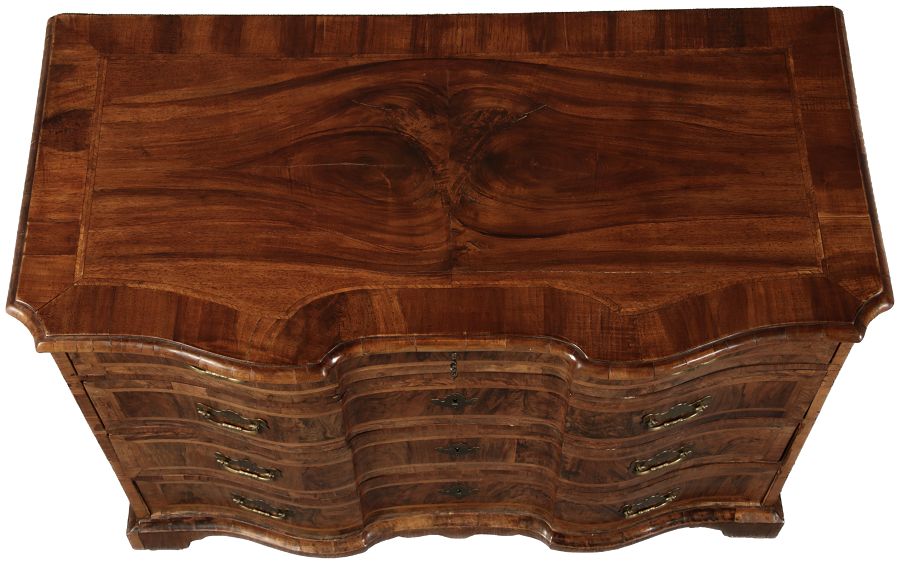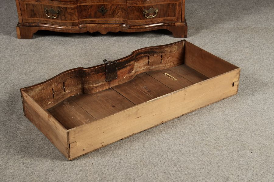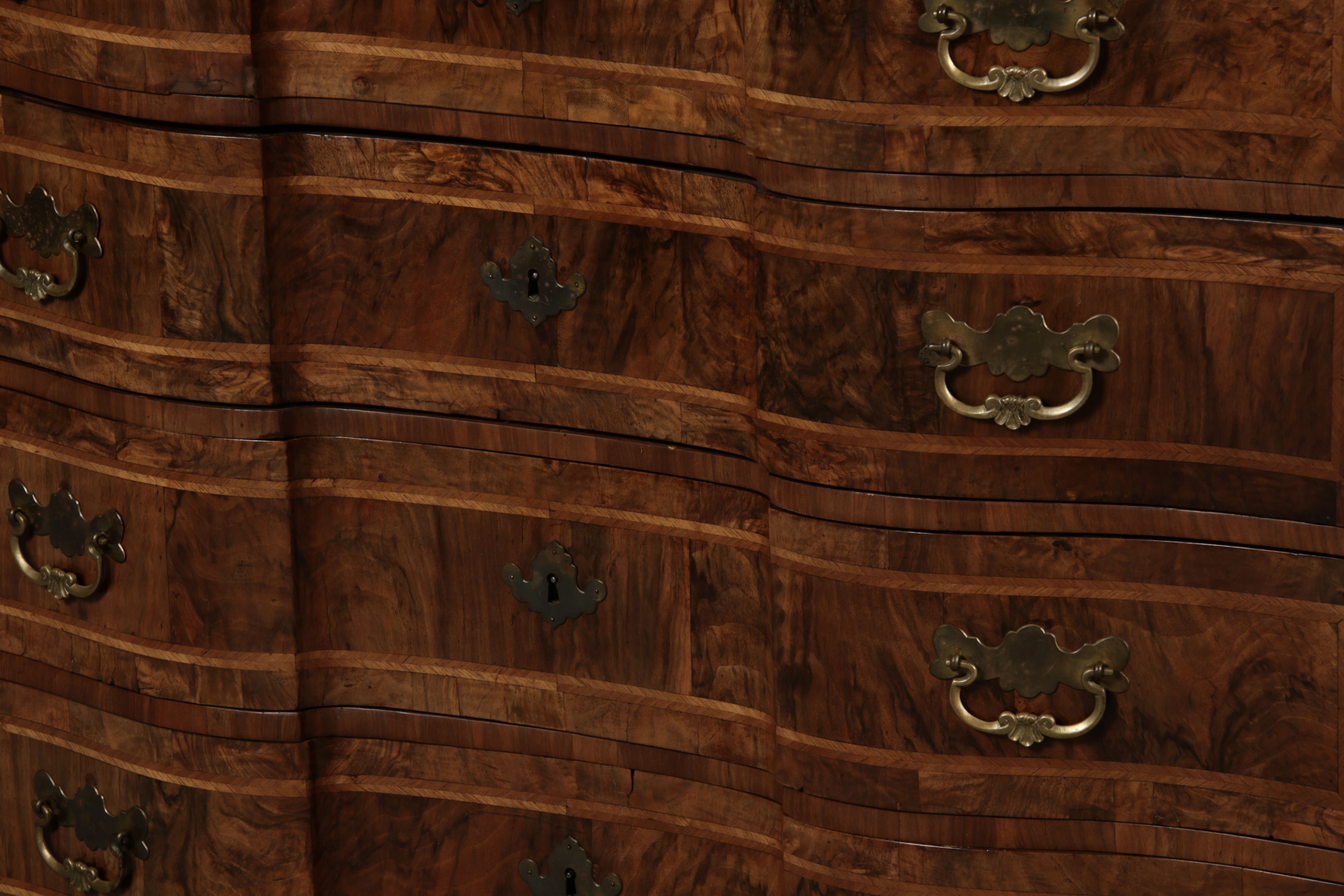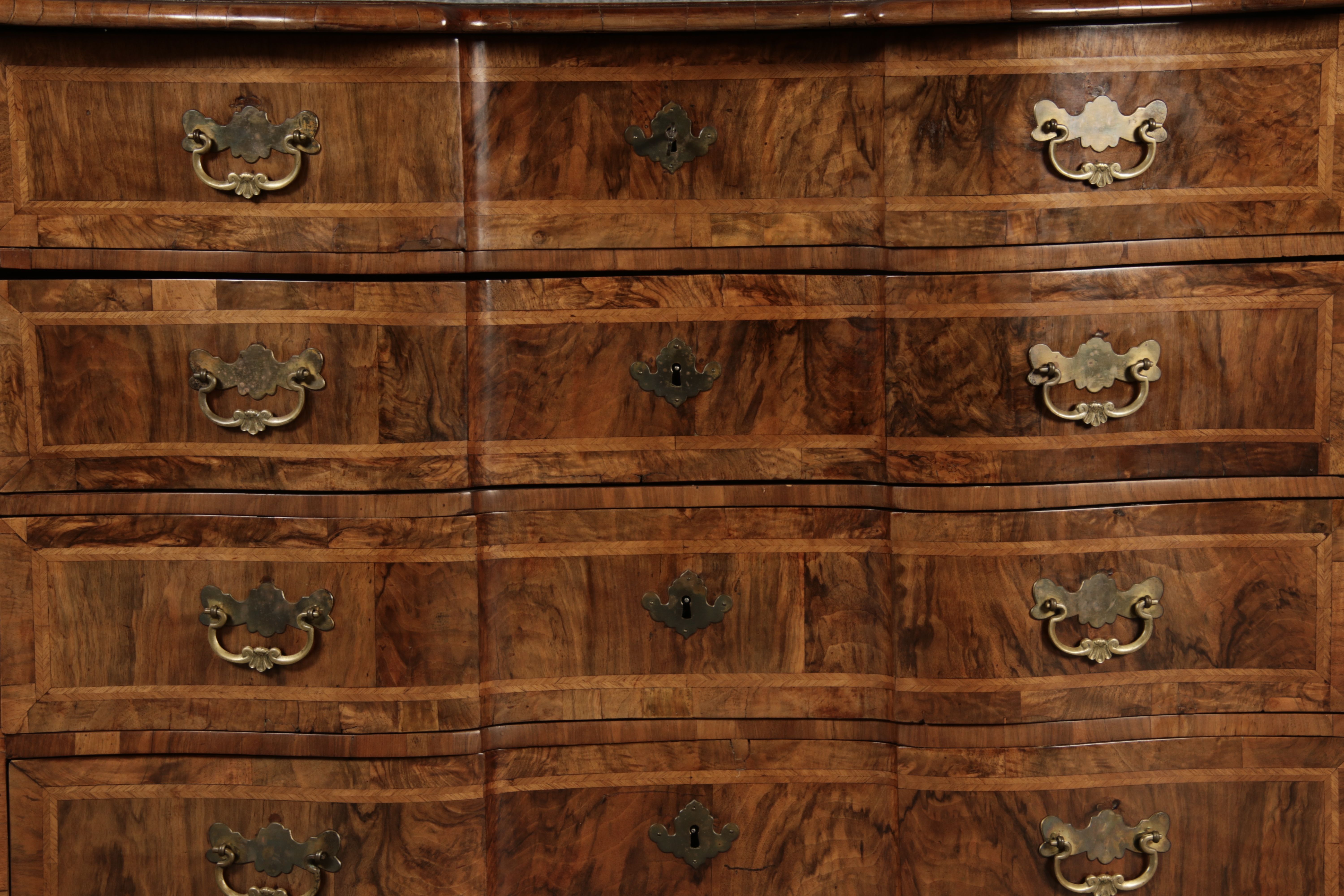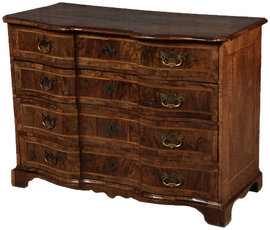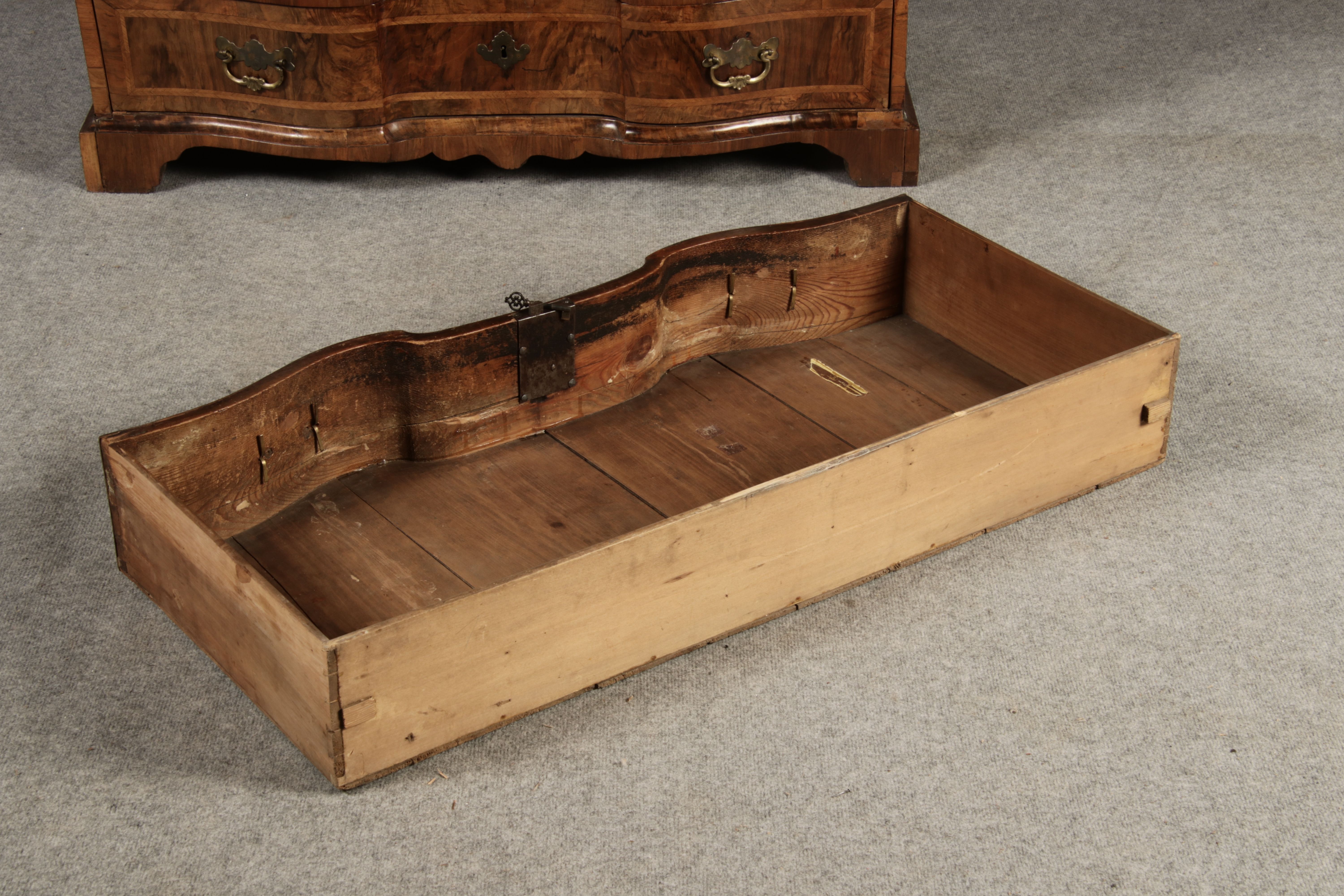 | Antike Barockkommode 4 Schubladen Nussbaum Einlegearbeiten geschweift 18 Jh. |