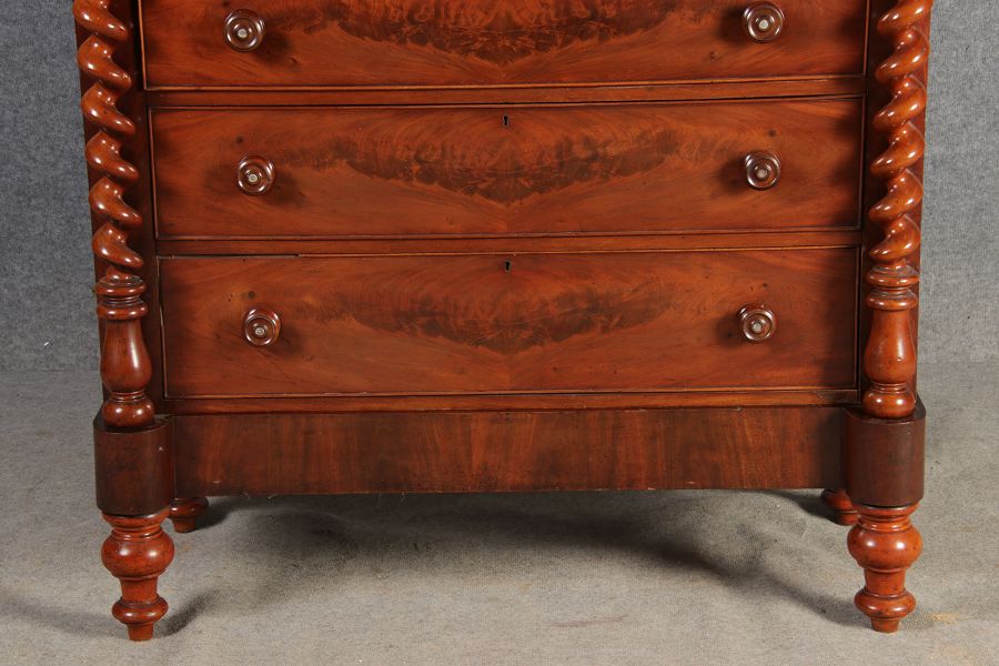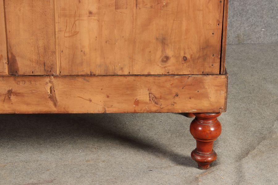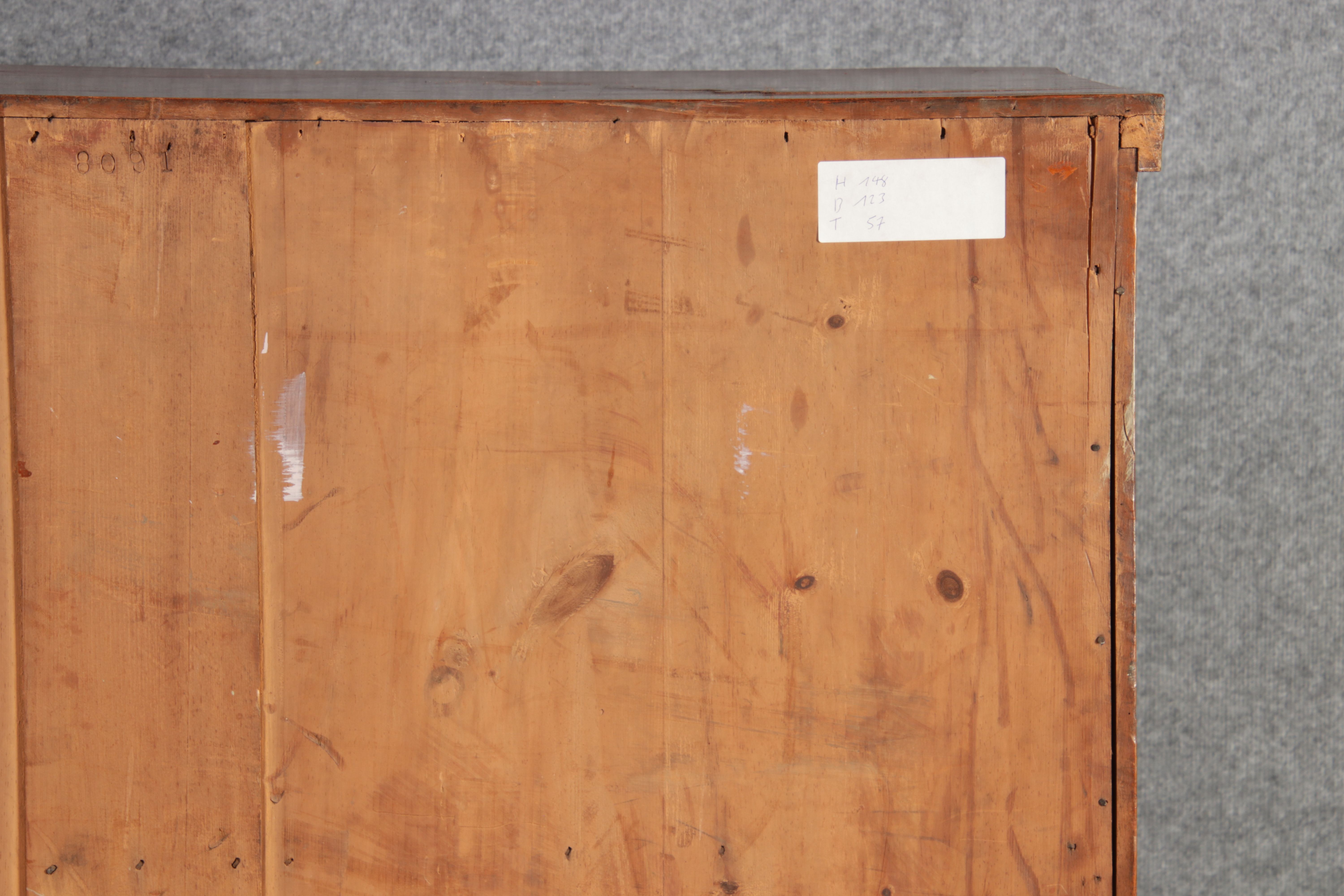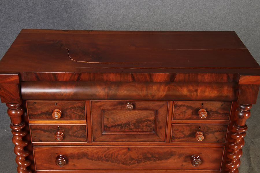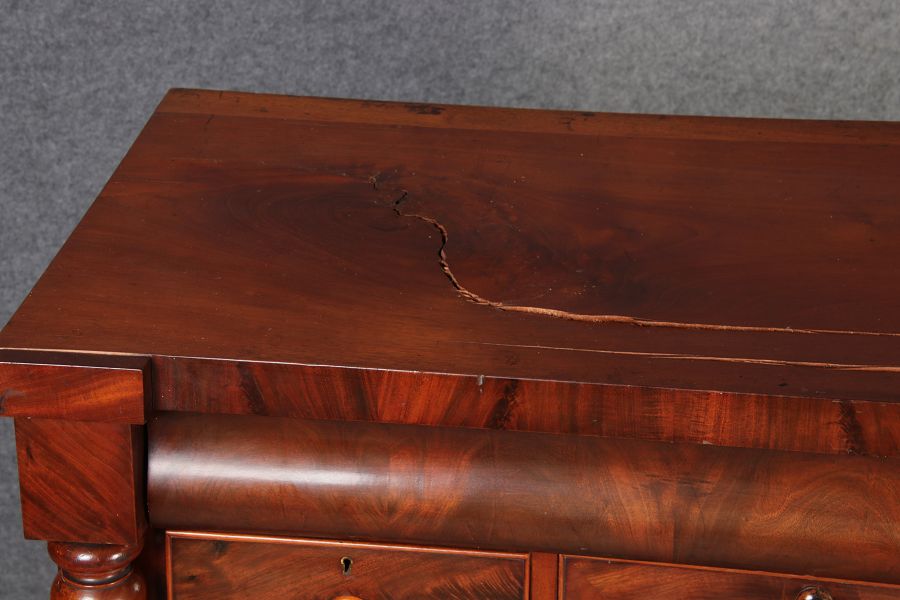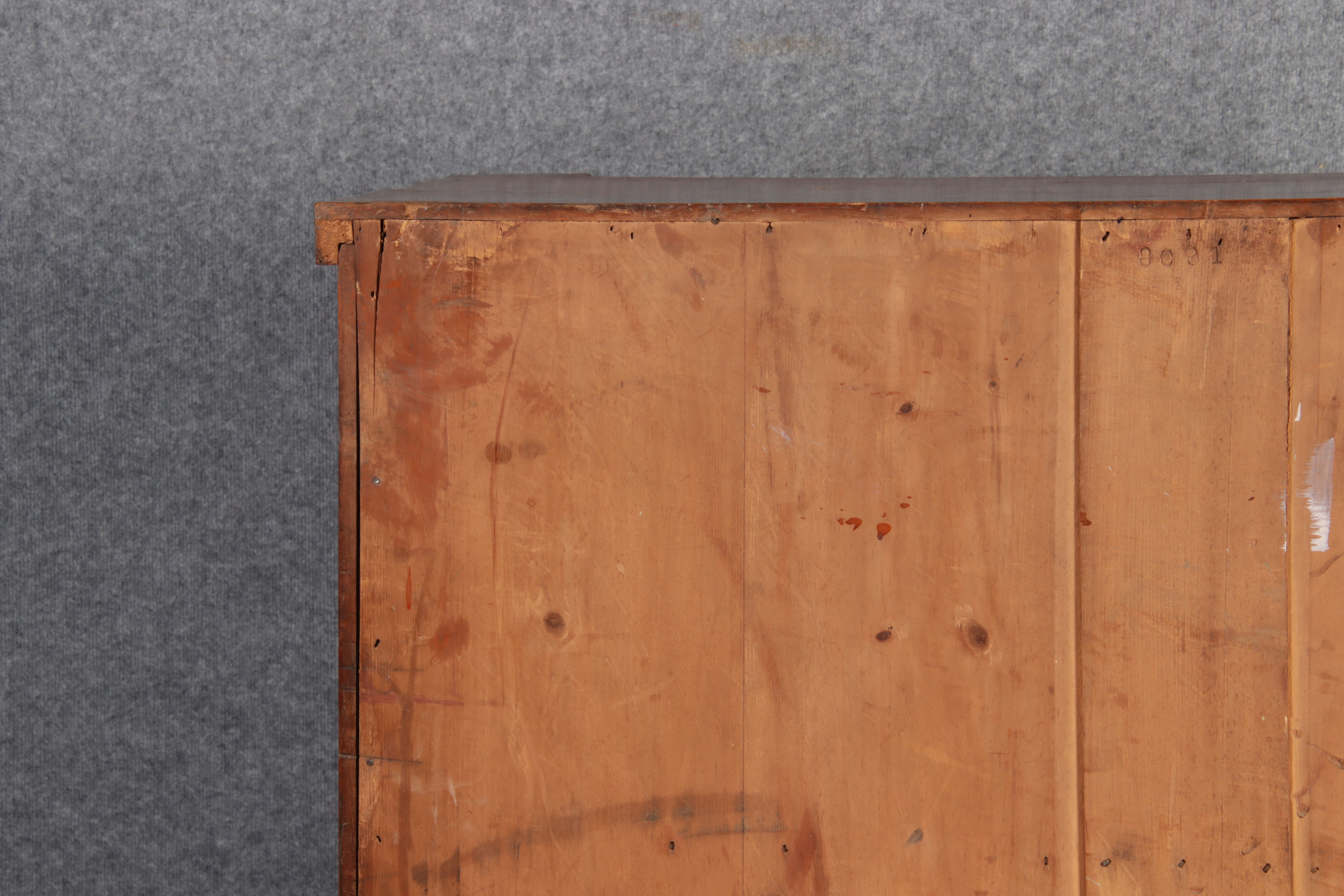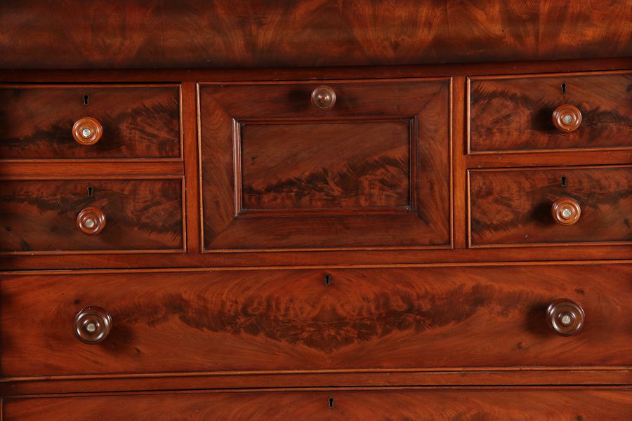 Alle Schubladenfronten sind mit ausgesuchten Mahagoni mit feinster Maserung furniert. Diese schöne große Kommode befindet sich in einem für das alter guten Zustand mit Gebrauchsspuren und kleinen Beschädigungen, die dem Alter und der Verwendung entsprechen.
