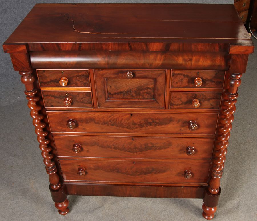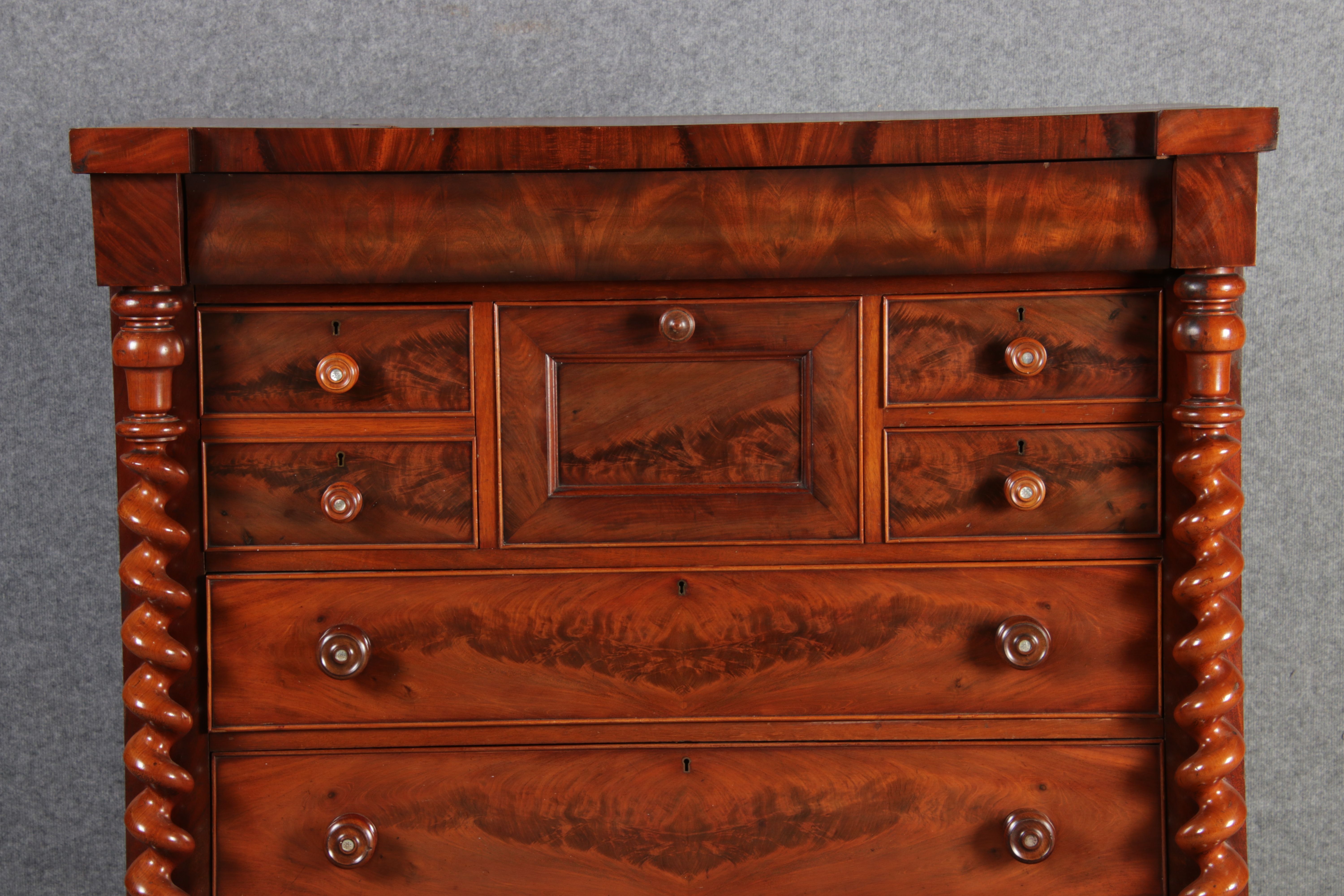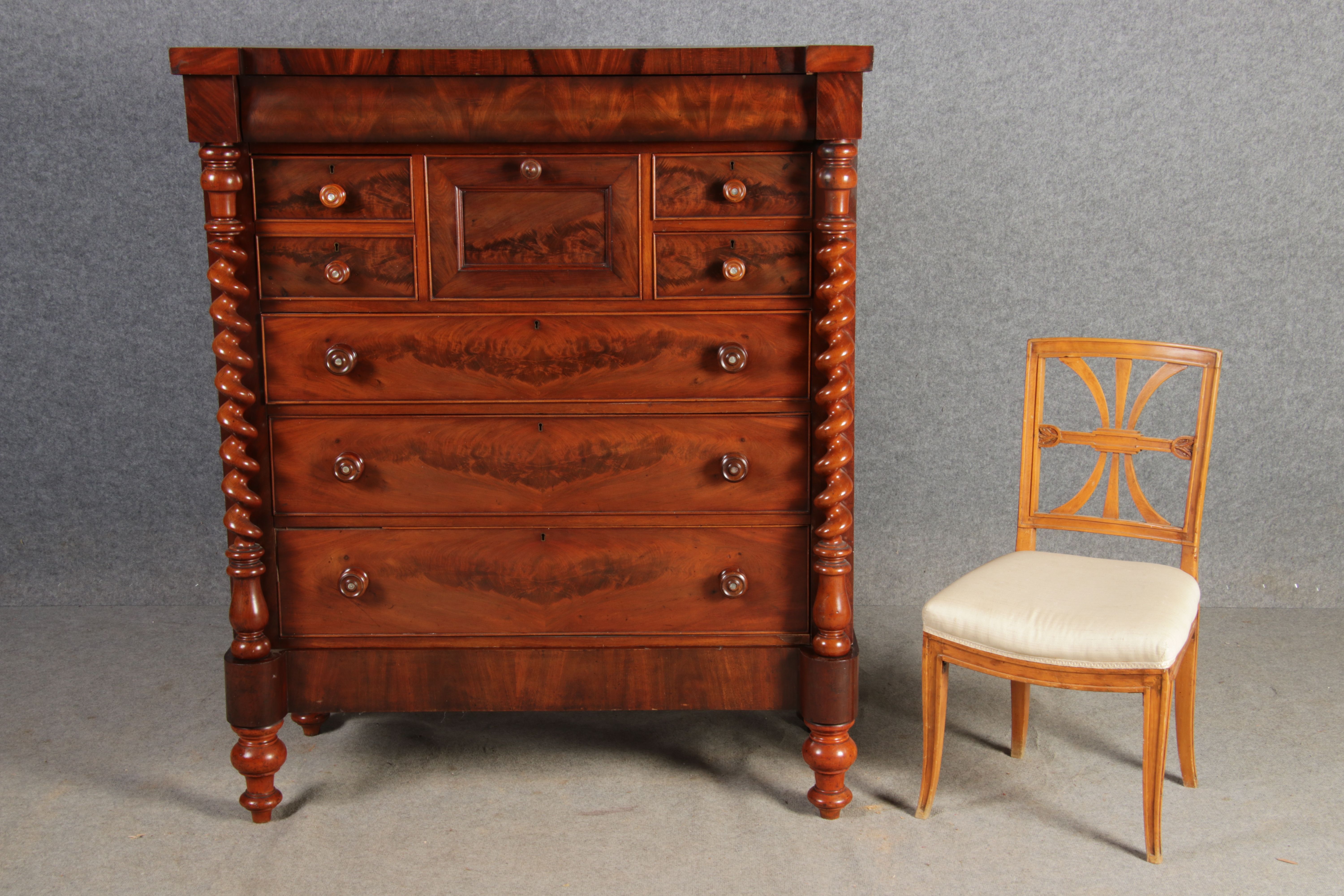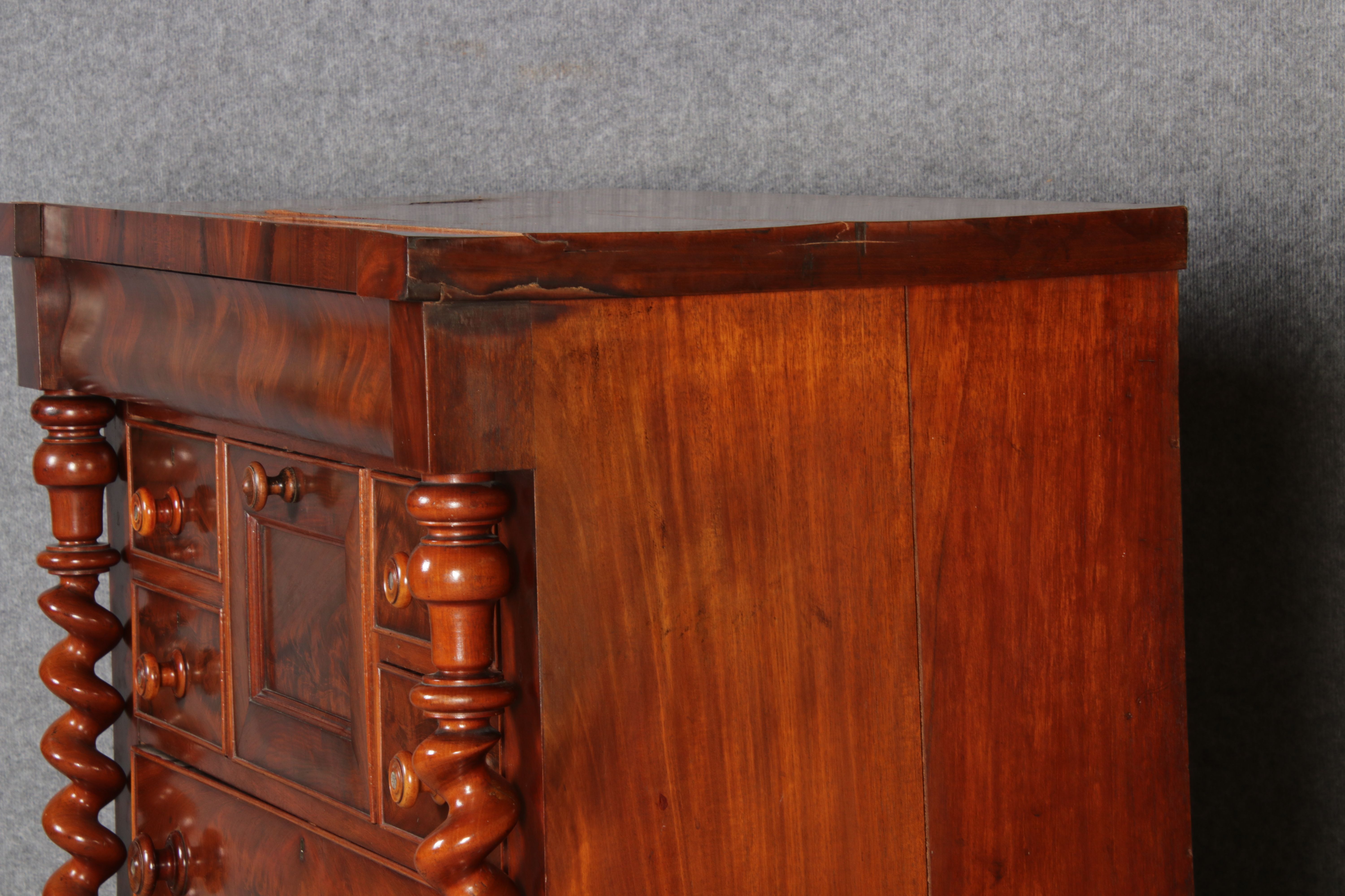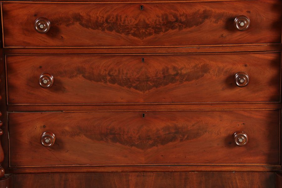 Alle Schubladenfronten sind mit ausgesuchten Mahagoni mit feinster Maserung furniert. Diese schöne große Kommode befindet sich in einem für das alter guten Zustand mit Gebrauchsspuren und kleinen Beschädigungen, die dem Alter und der Verwendung entsprechen.
