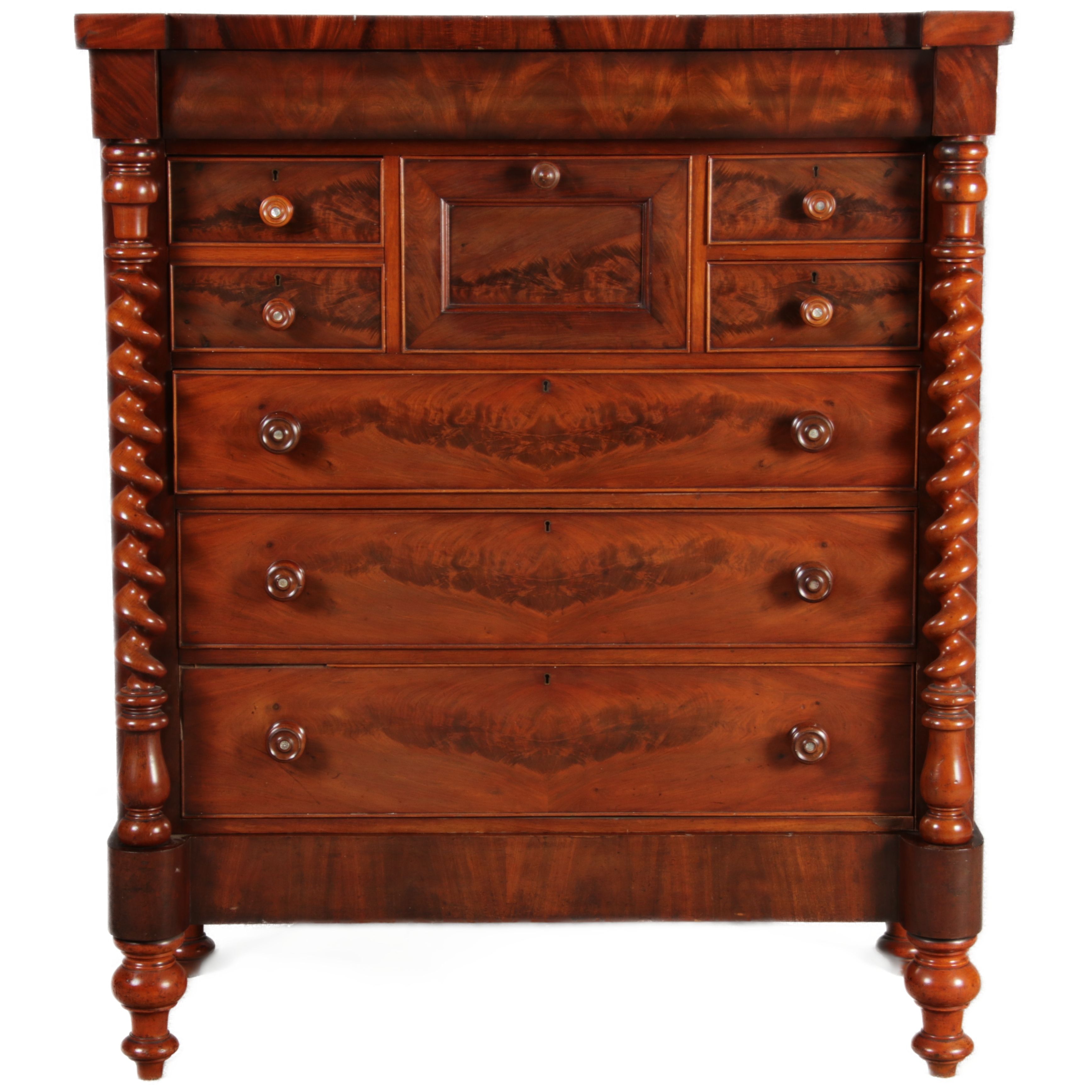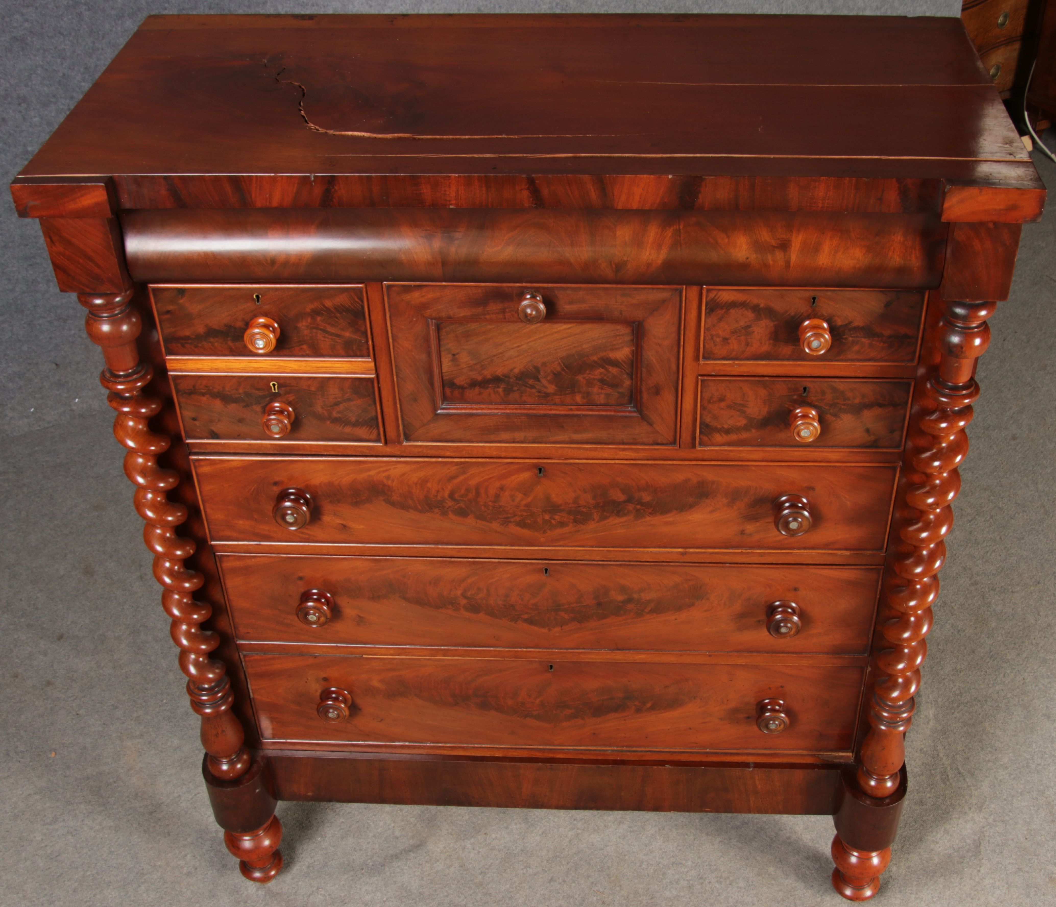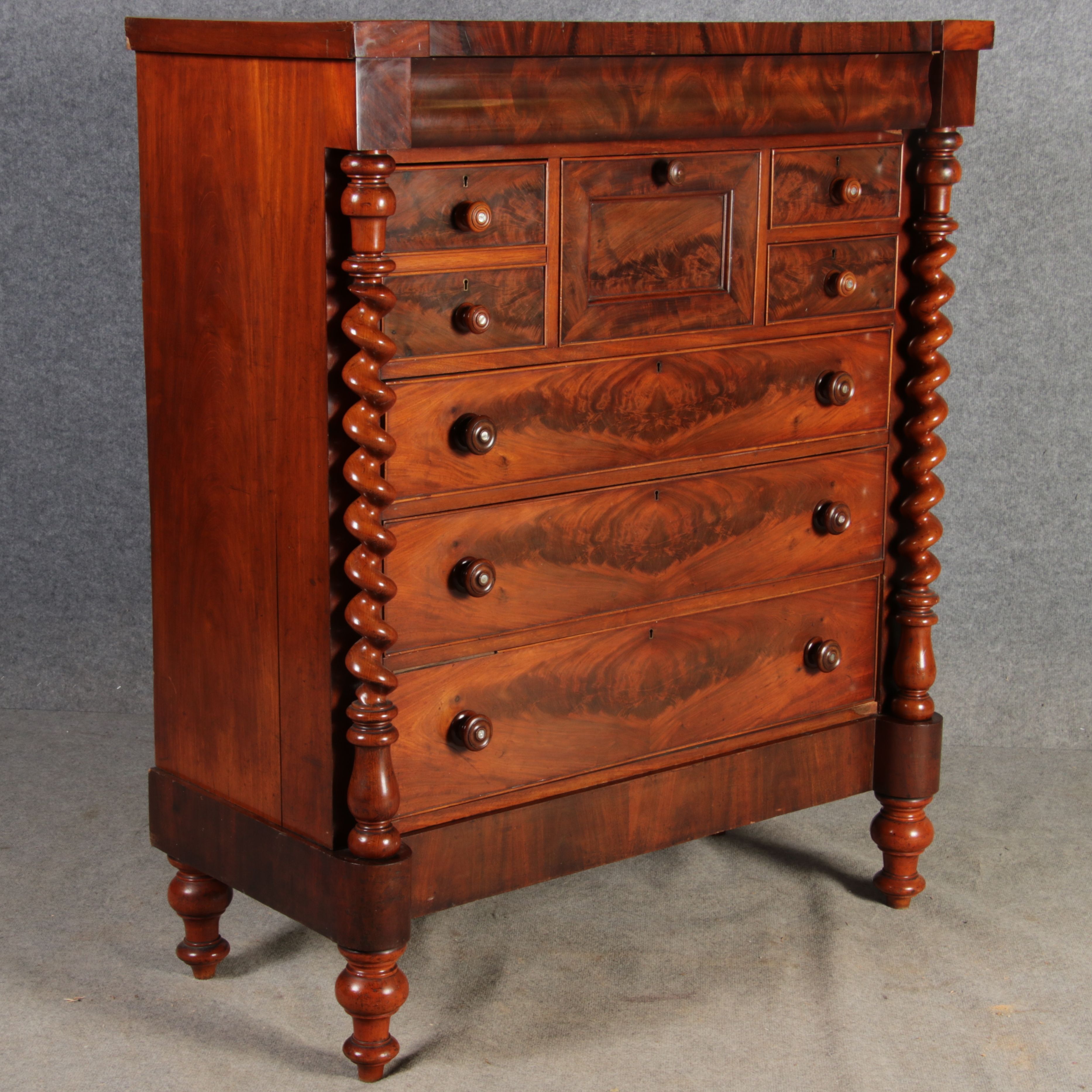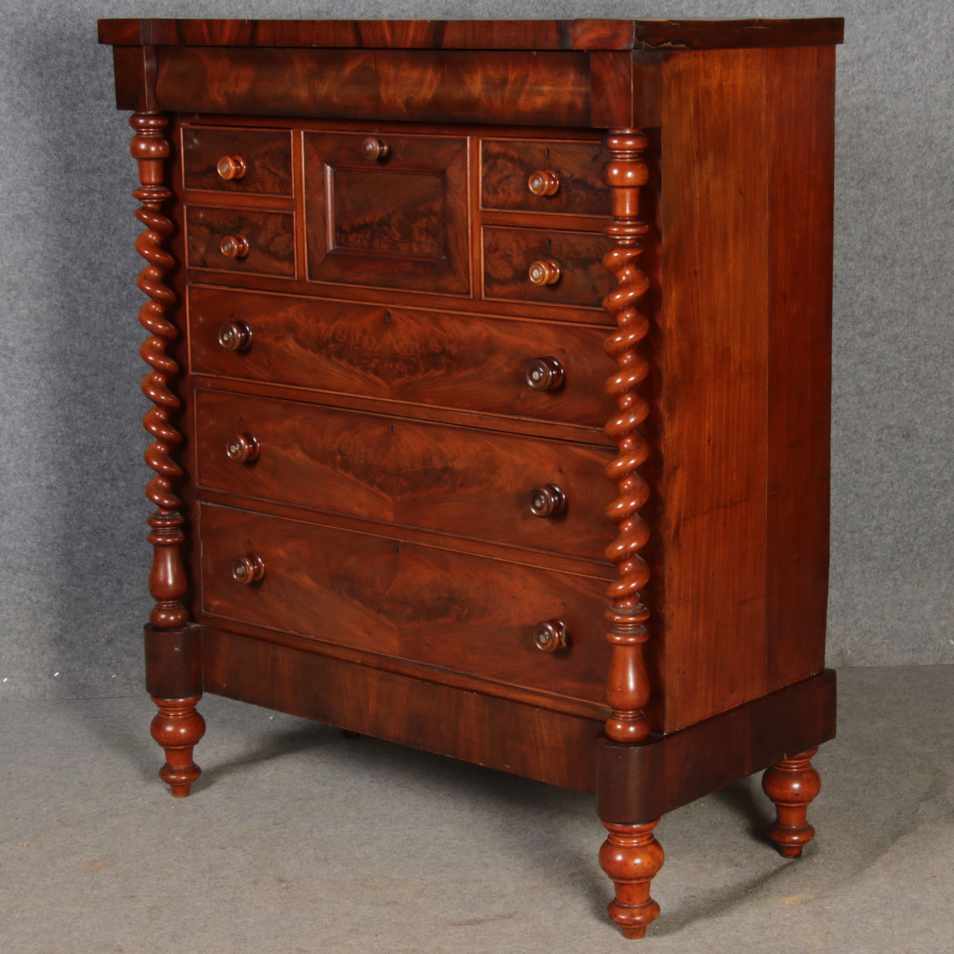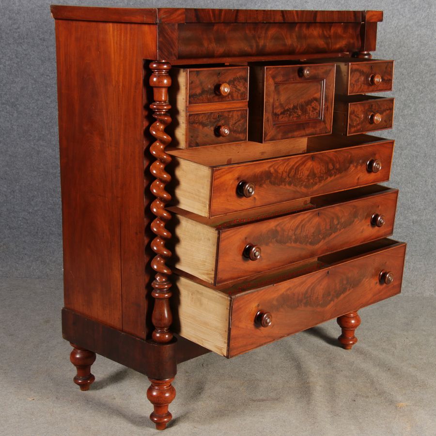 Alle Schubladenfronten sind mit ausgesuchten Mahagoni mit feinster Maserung furniert. Diese schöne große Kommode befindet sich in einem für das alter guten Zustand mit Gebrauchsspuren und kleinen Beschädigungen, die dem Alter und der Verwendung entsprechen.