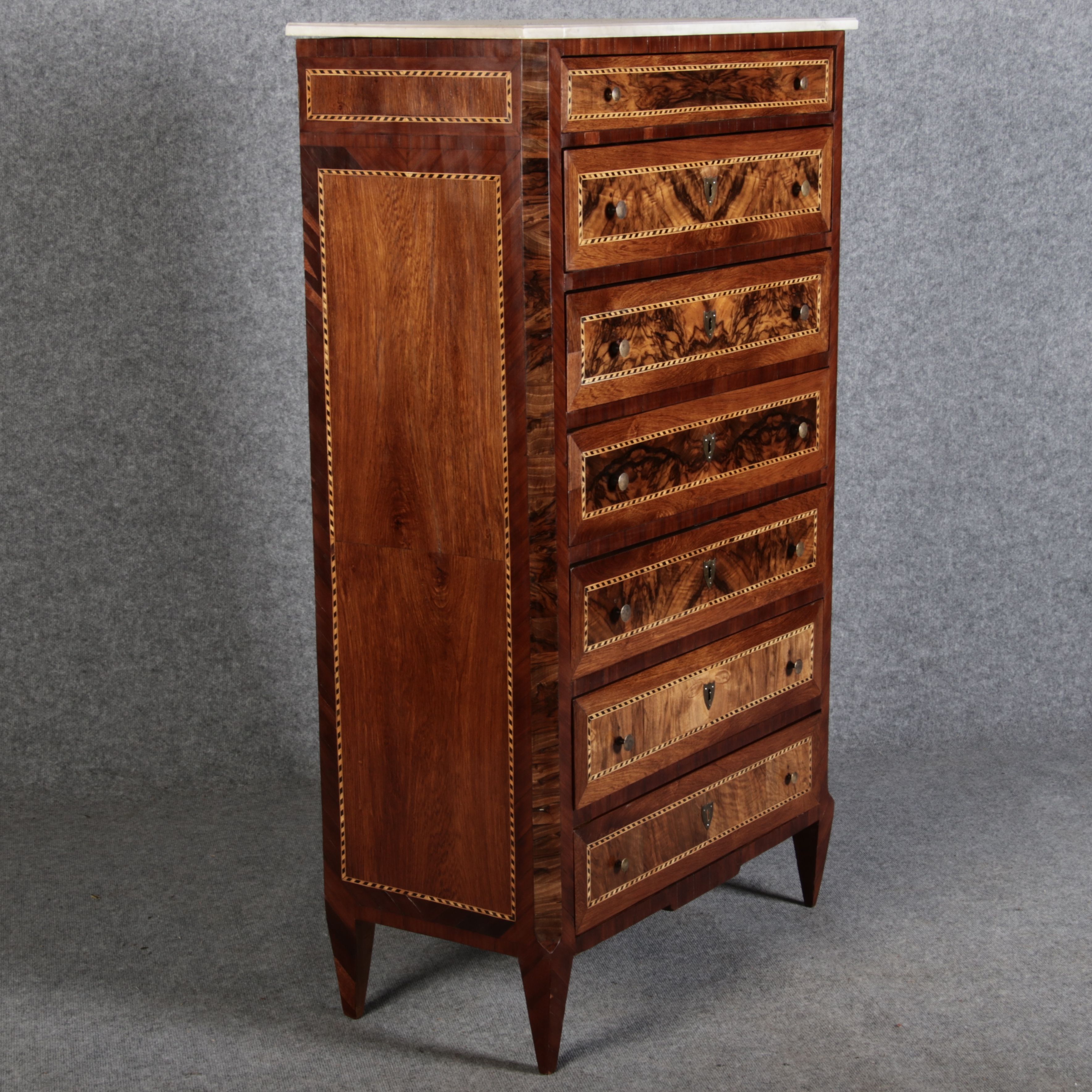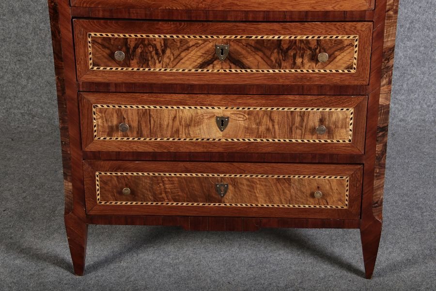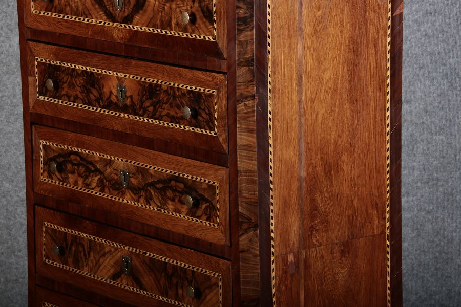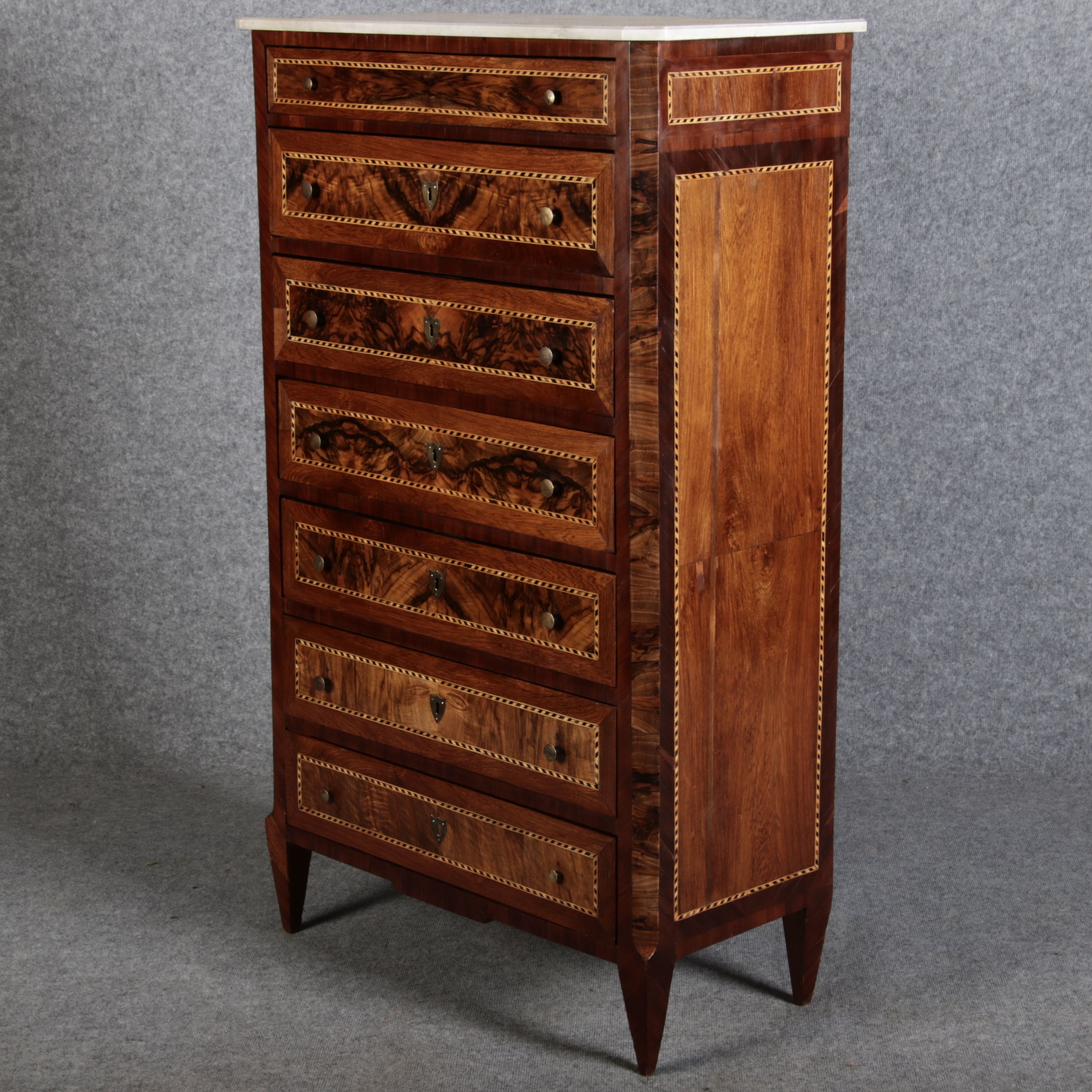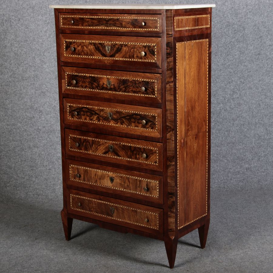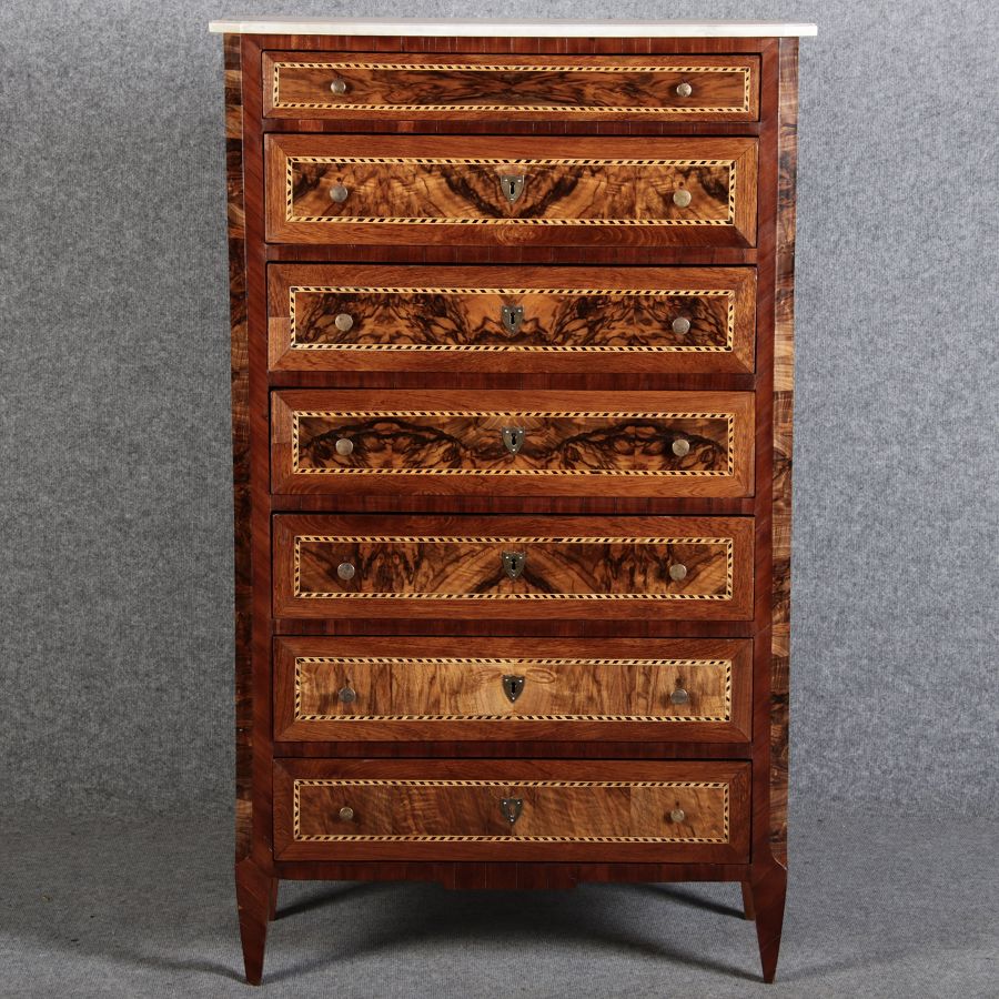 | Antike Louise XVI Pfeiler Hoch Kommode um 1800 mit Einlegearbeiten Nussbaum 7 Schubladen |