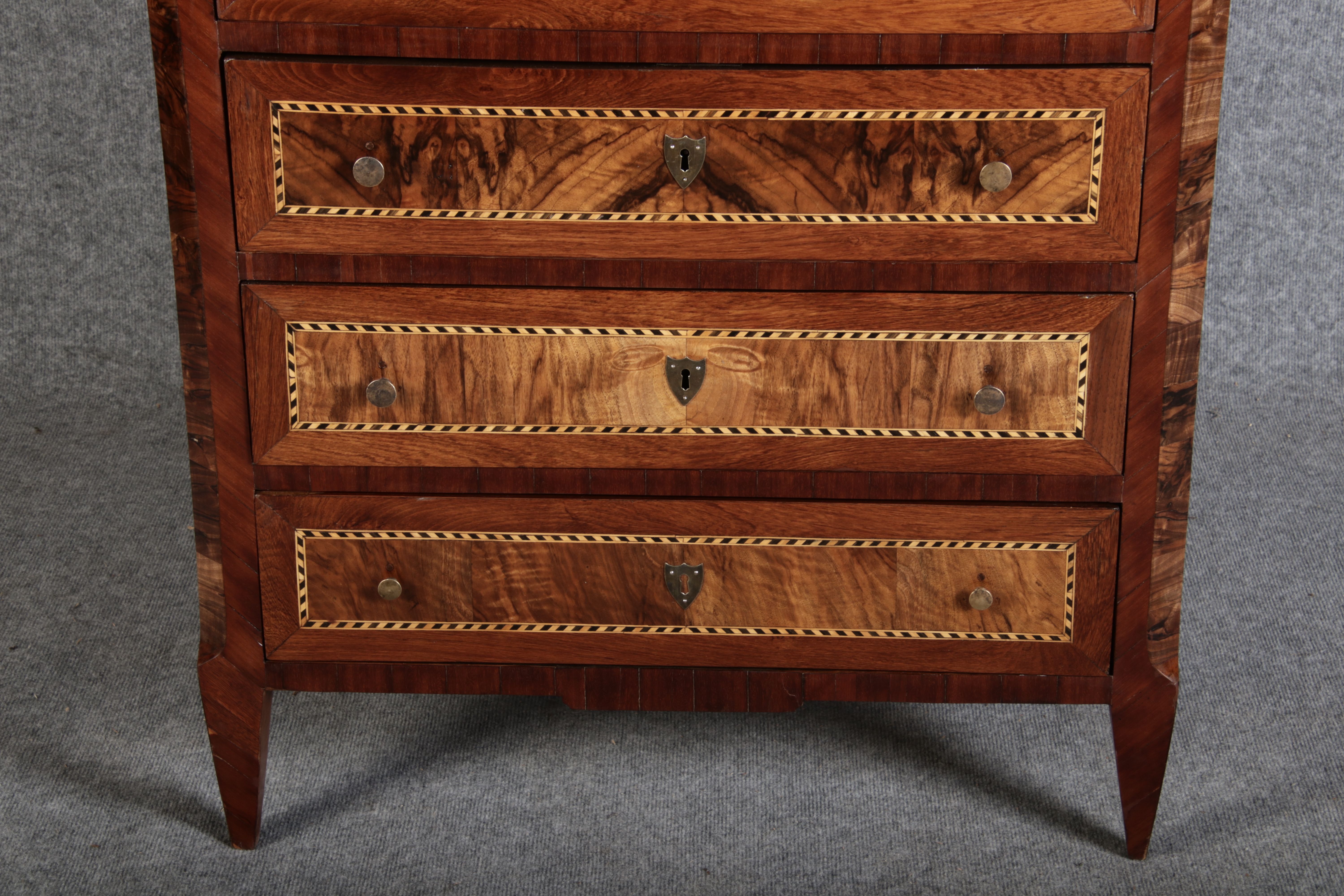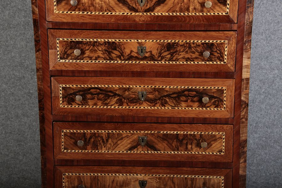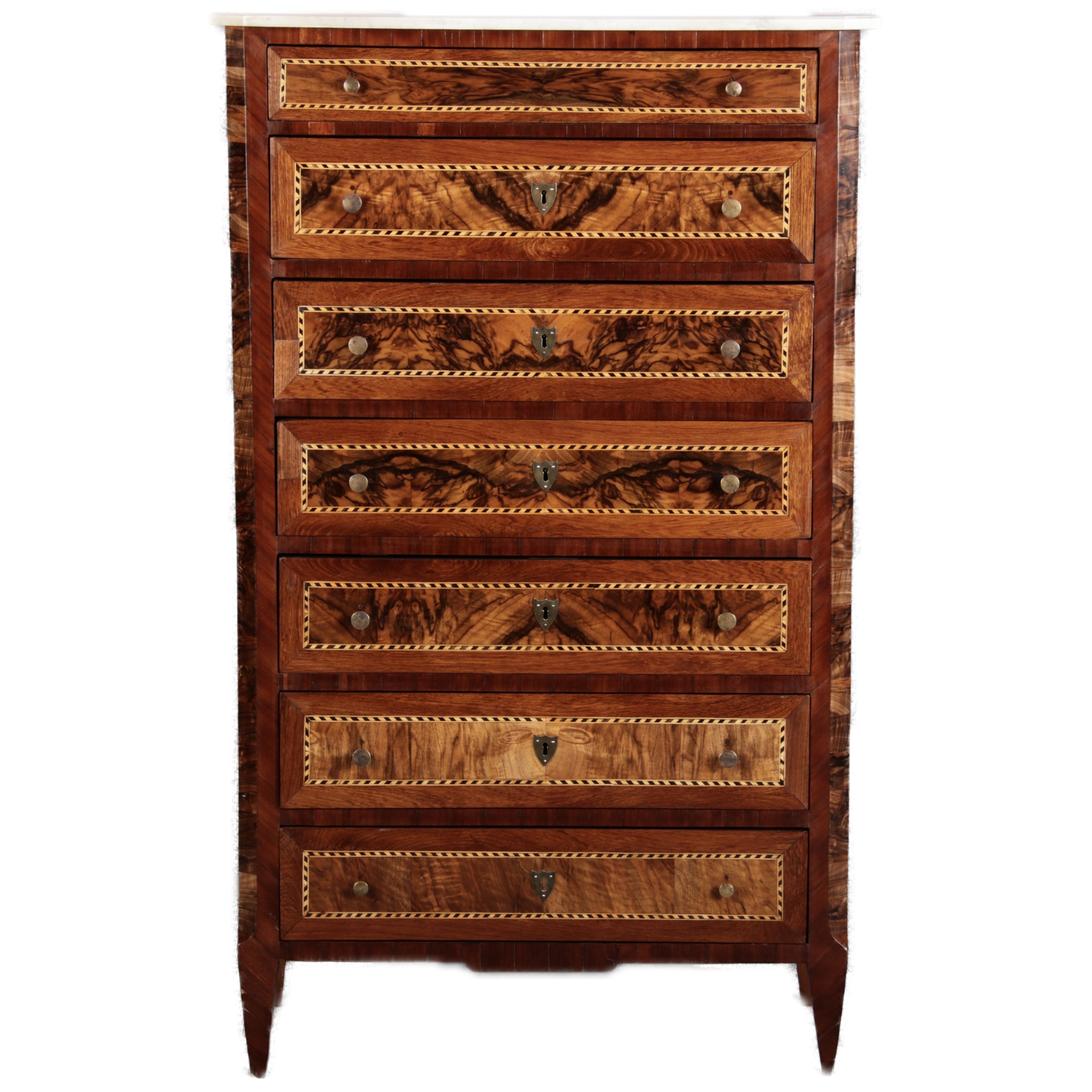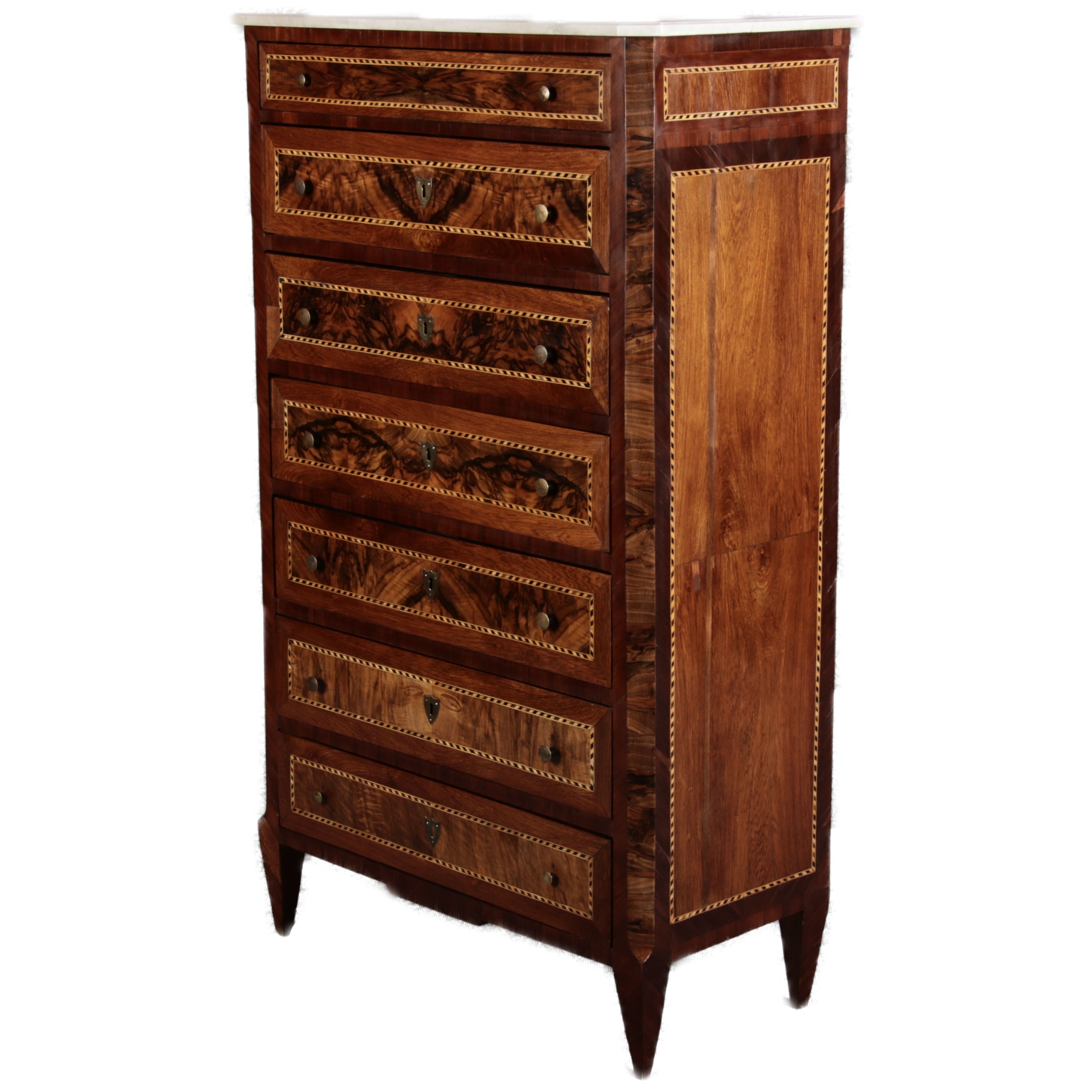 | Antike Louise XVI Pfeiler Hoch Kommode um 1800 mit Einlegearbeiten Nussbaum 7 Schubladen |