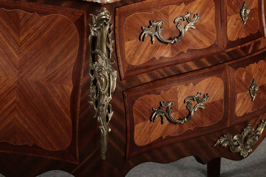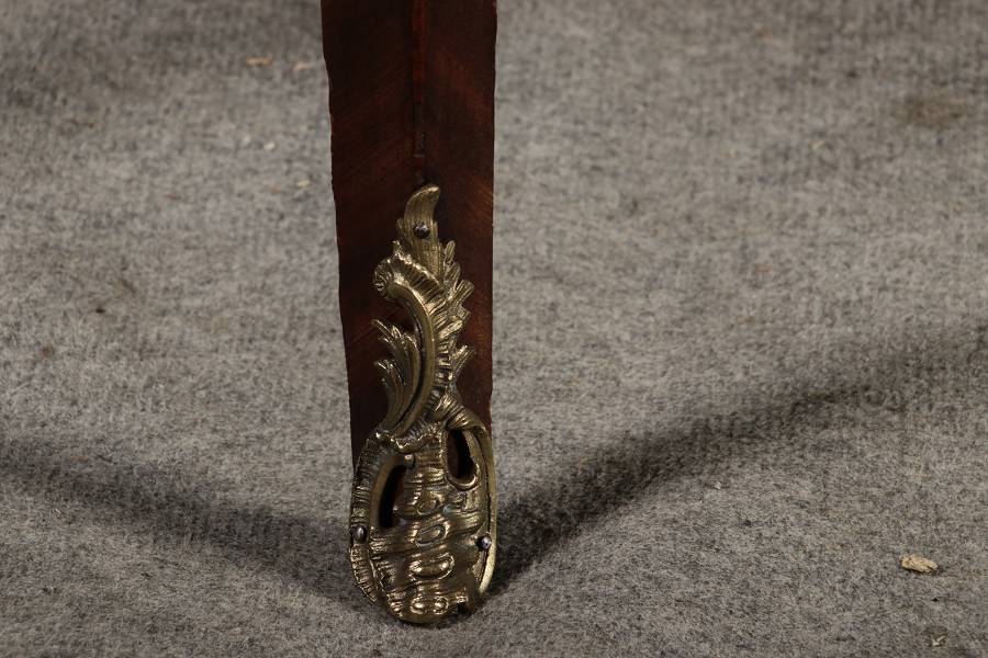 Das Holz ist Nussbaum und andere Hölzer auf Eichenholz mit Bronze Verzierungen und einer Marmorplatte
