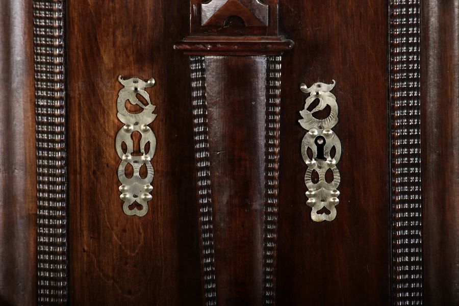 Masse/dimensions: Höhe/Height ca. 146 cm, Breite Korpus/Broad Boda ca. 134 cm, Breite Gesims/Broad cornice ca. 143 cm, Tiefe Korpus/Deep body ca. 39 cm, Tiefe Gesims/Deep cornice ca. 44 cm