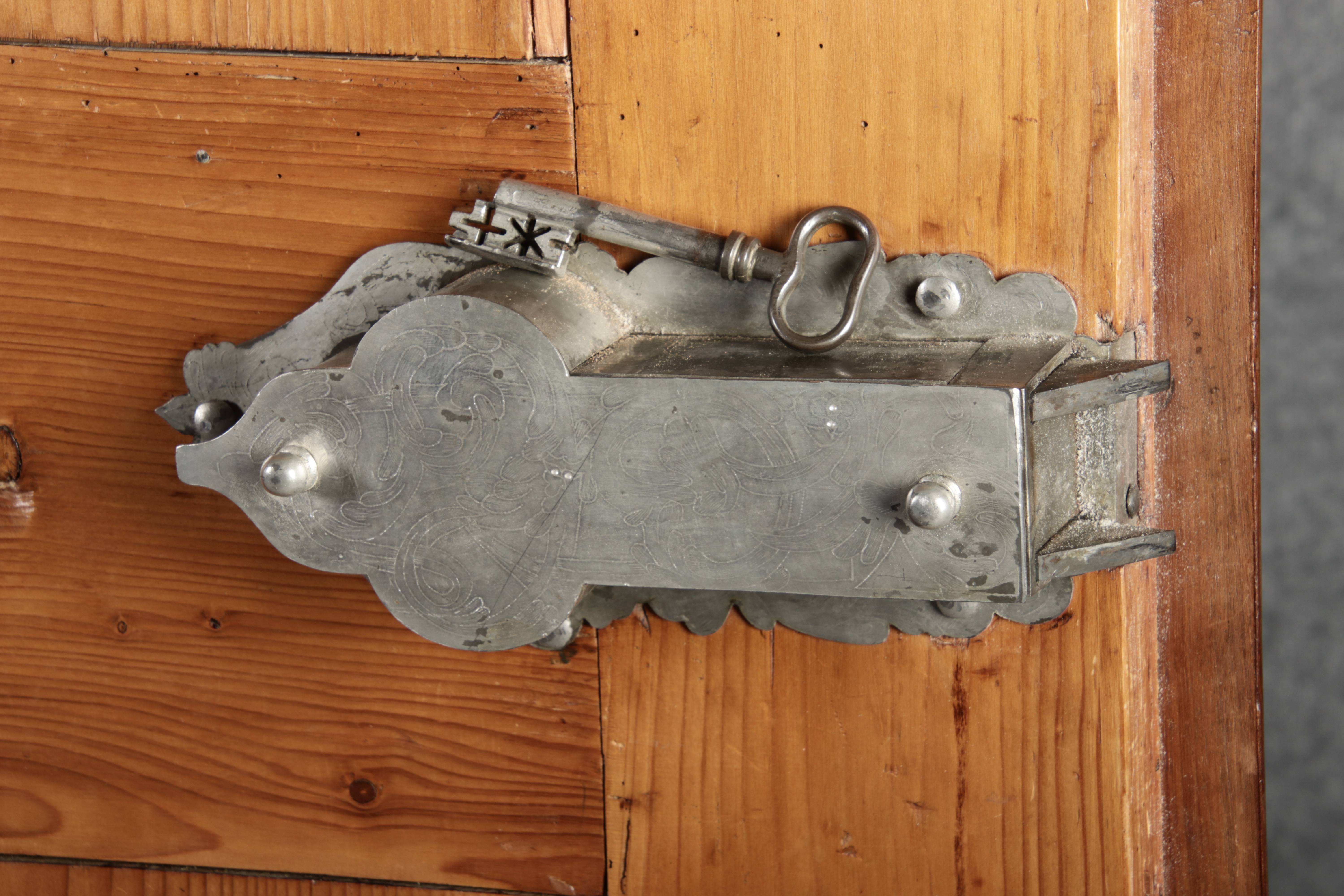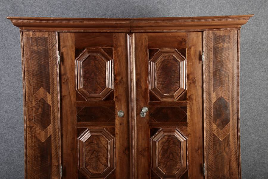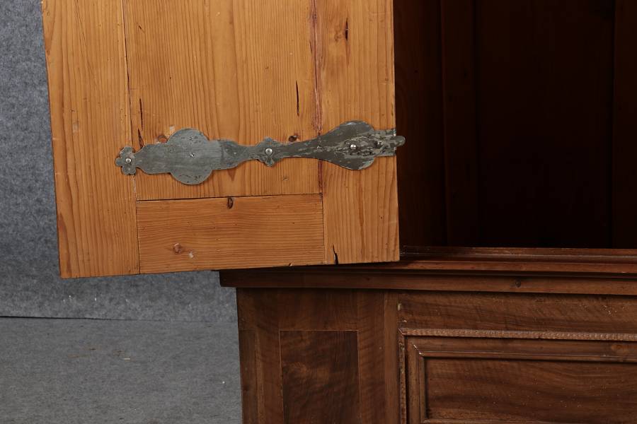 Antiker Renaissance Früh Barock Schrank um 1680 Nussbaum auf Weichholz mit Eisenschloss und Schlüssel In dem Buch Züricher und Nordschweizer Möbel findet sich auf Seite 113 ein ähnlicher Schrank. Laut Text, Herstellungsort Nordwestschweiz Zürich oder Winterthur und Datierung wurde um 1680-1690 angegeben. Die dendrochronologische Datierung ergab nach 1674.