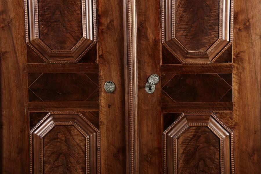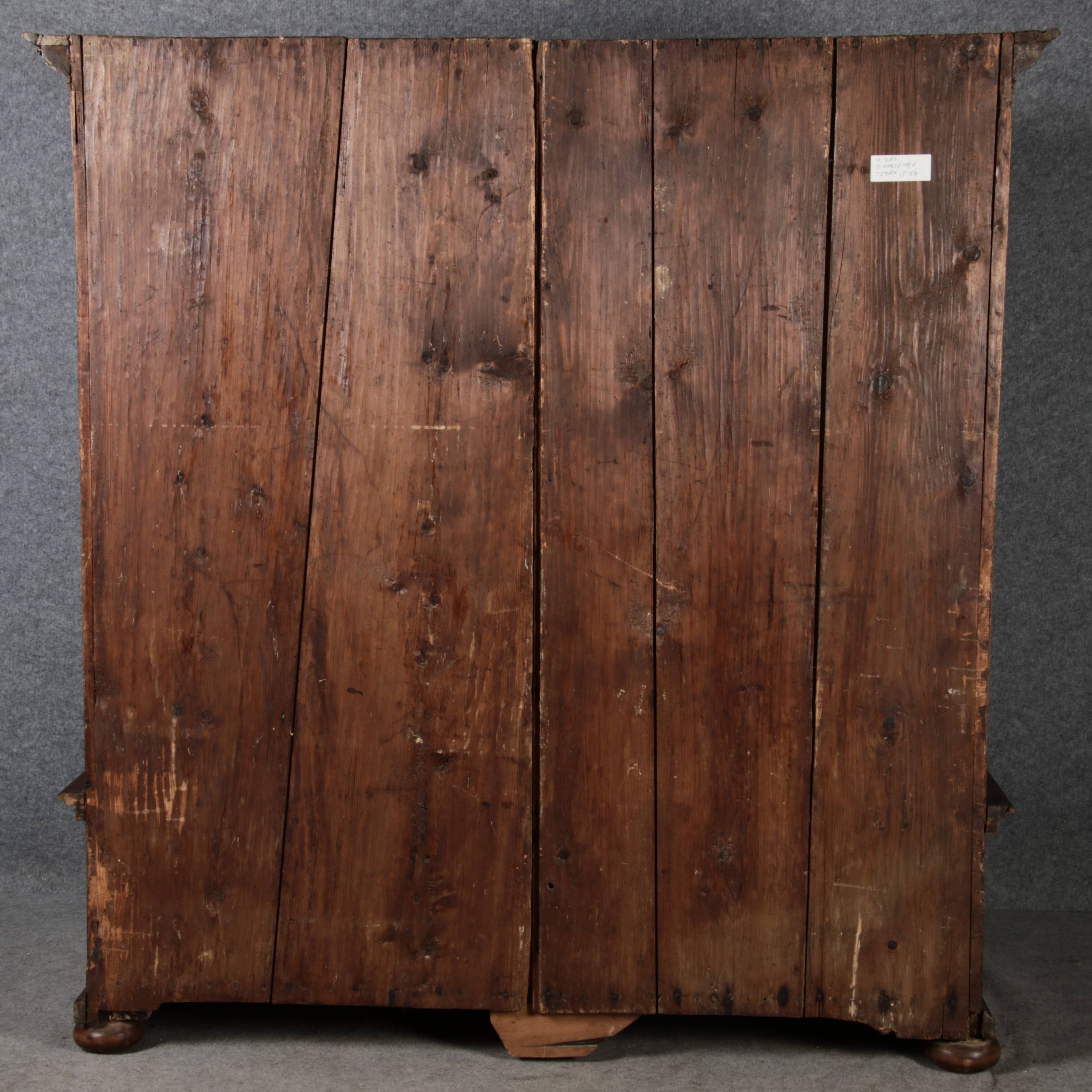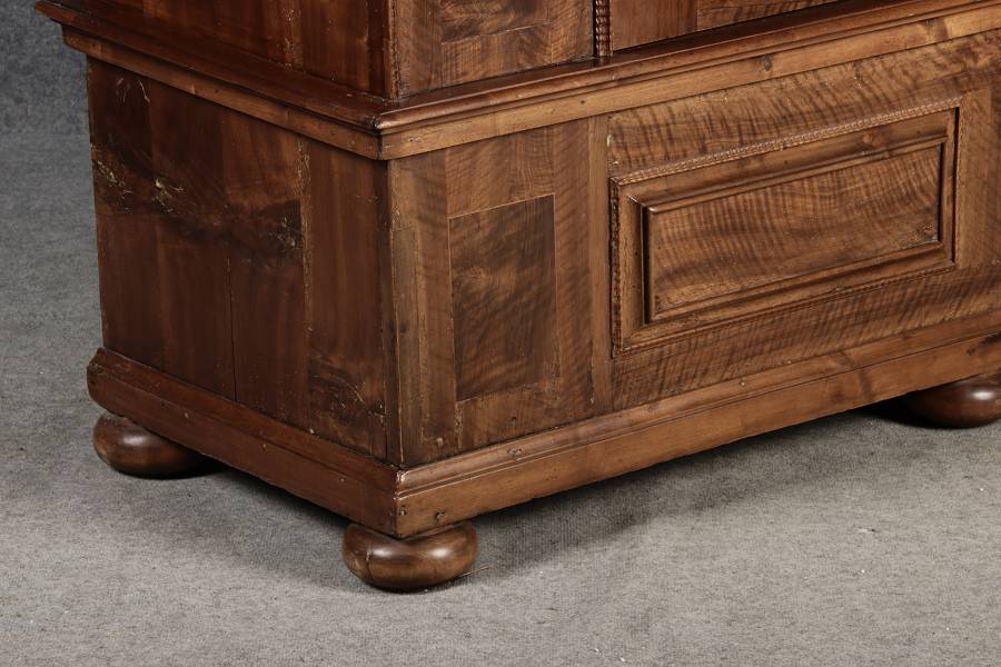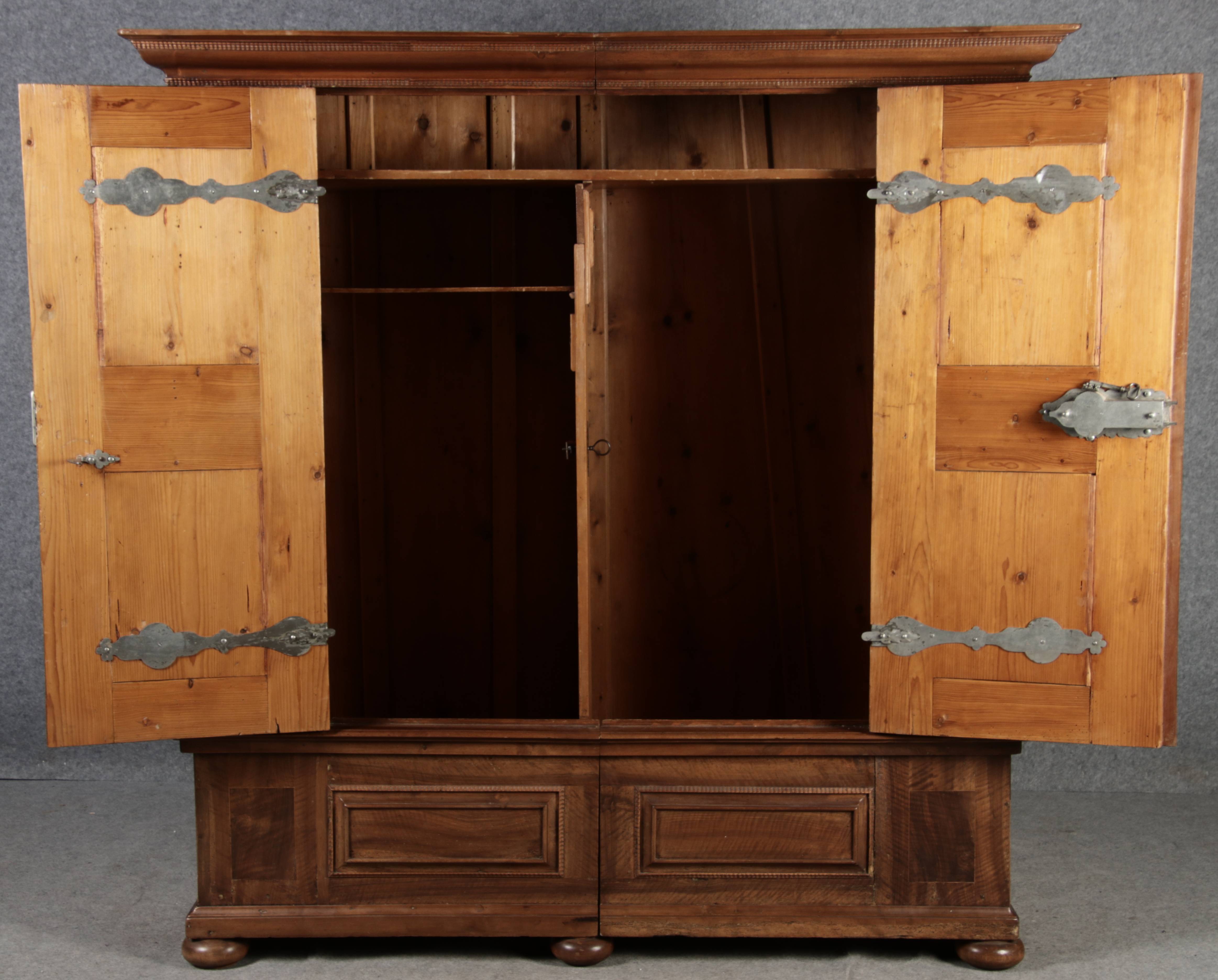 Masse/dimensions: Höhe/Height ca. 203 cm, Breite Korpus/Broad Boda ca. 179 cm, Breite Gesims/Broad cornice ca. 197 cm, Tiefe Korpus/Deep body ca. 59 cm, Tiefe Gesims/Deep cornice ca. 67 cm,