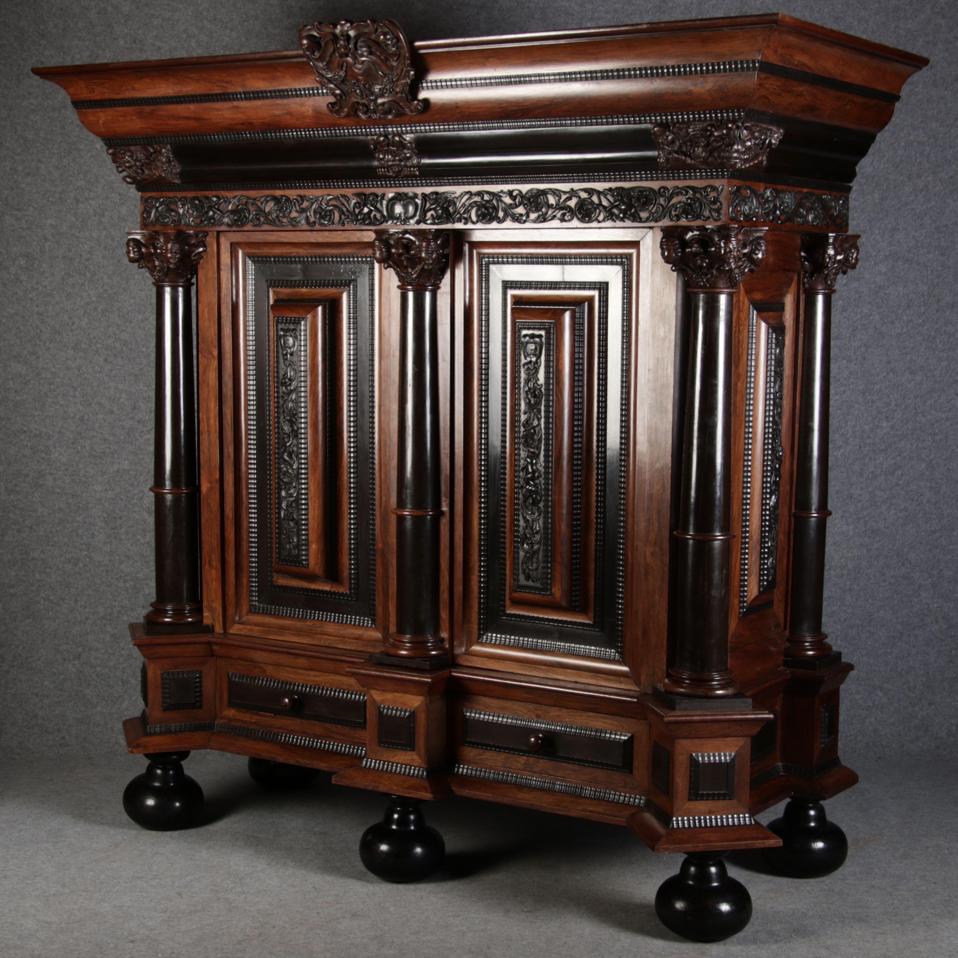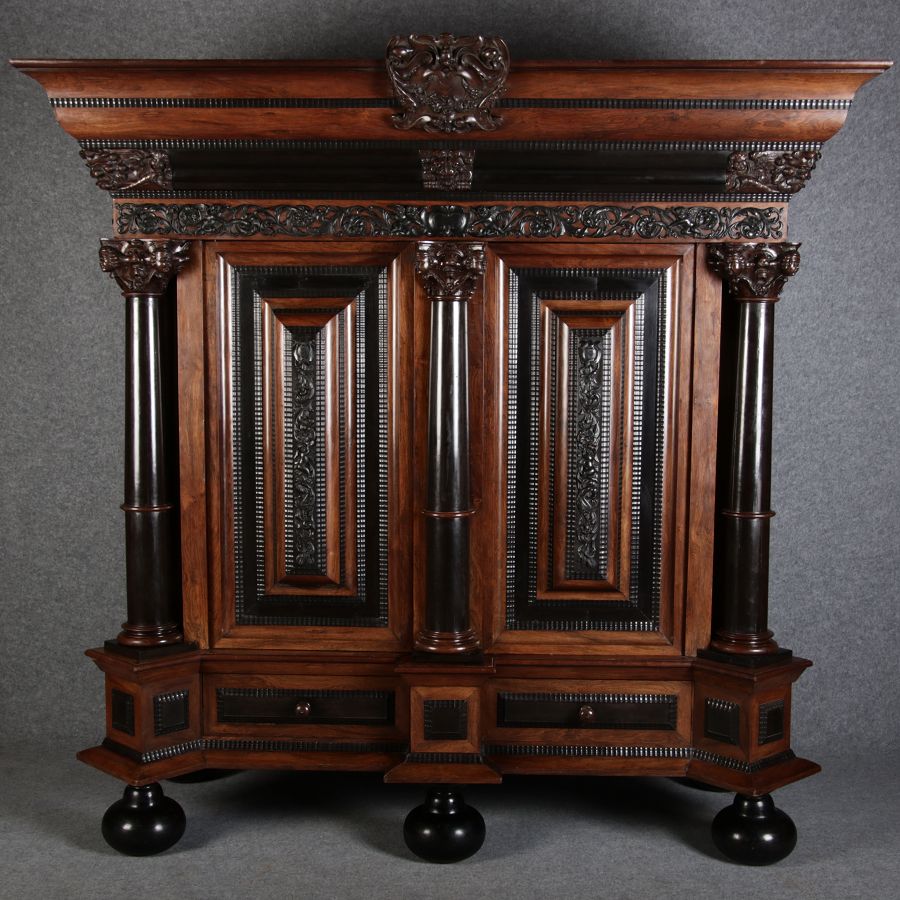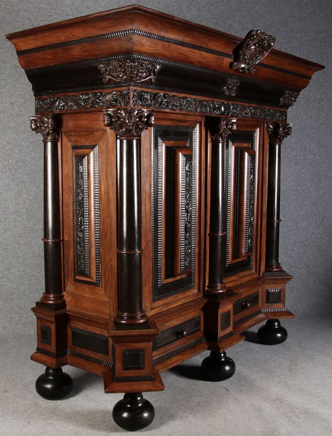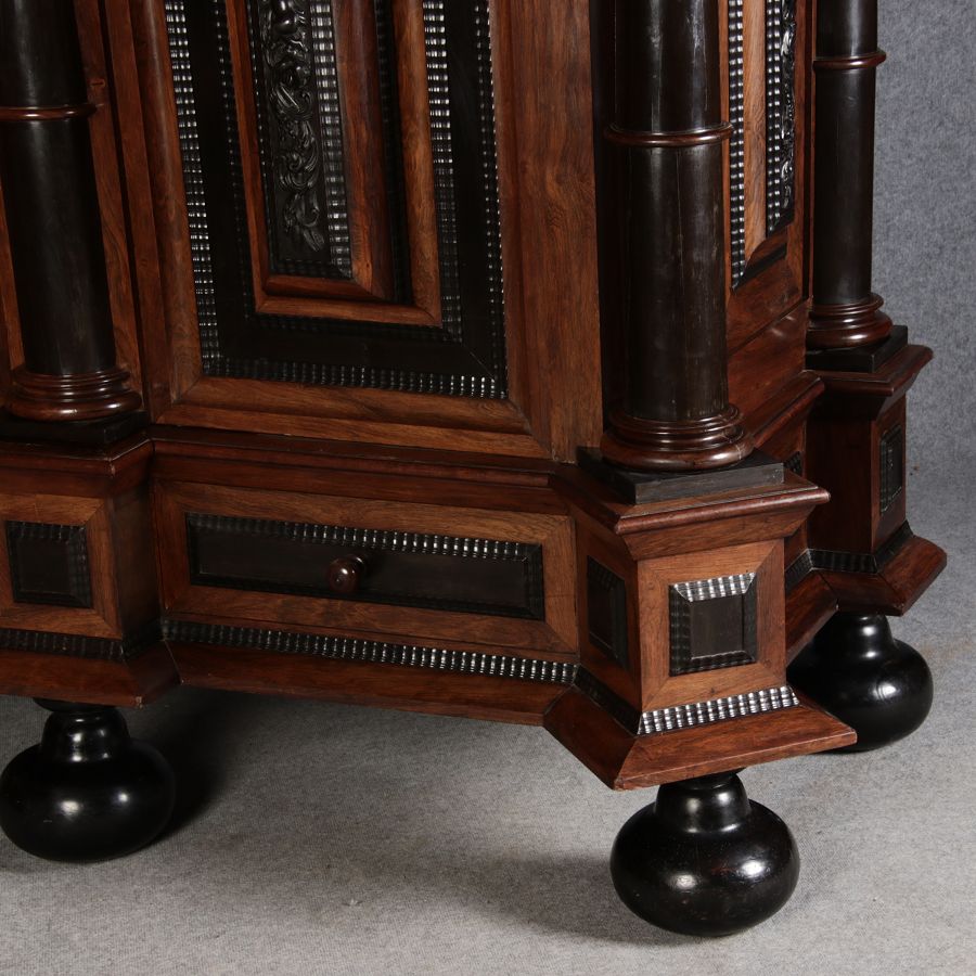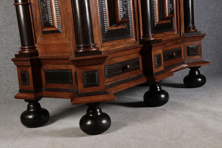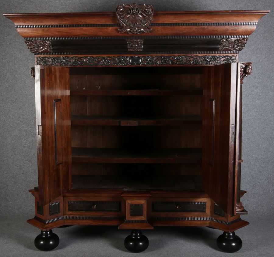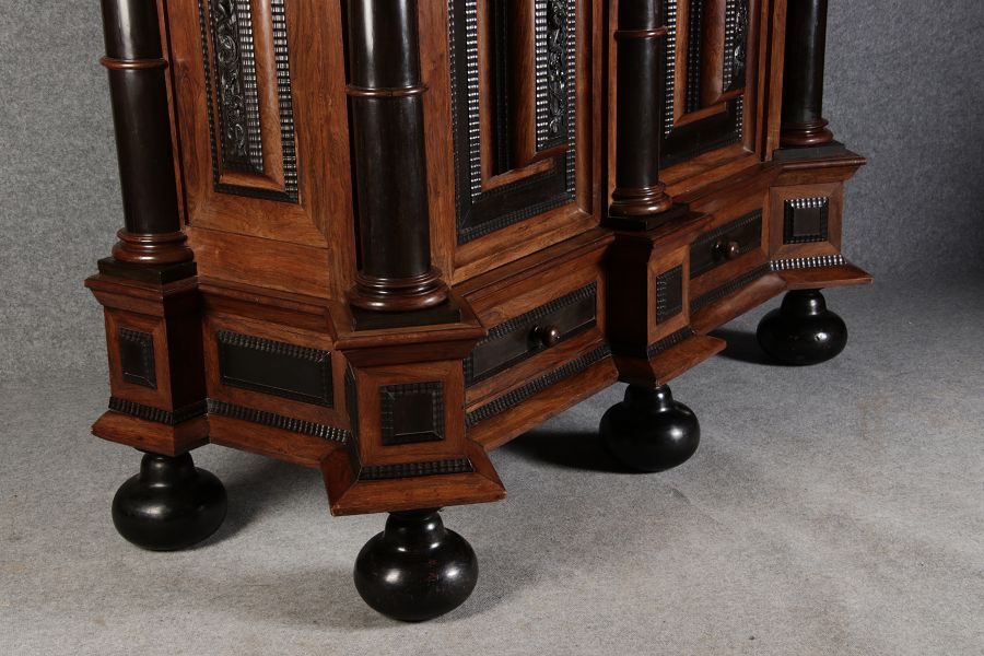 Antiker Barockschrank Amsterdamer Schapp, 5 ebonisierten Säulen, Kissenfüllungen, geschnitzte Kapitele - Türen - Gesimse, Geheimfach, auf hohen Füßen |