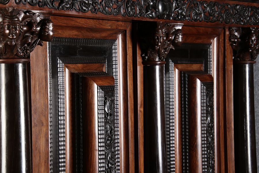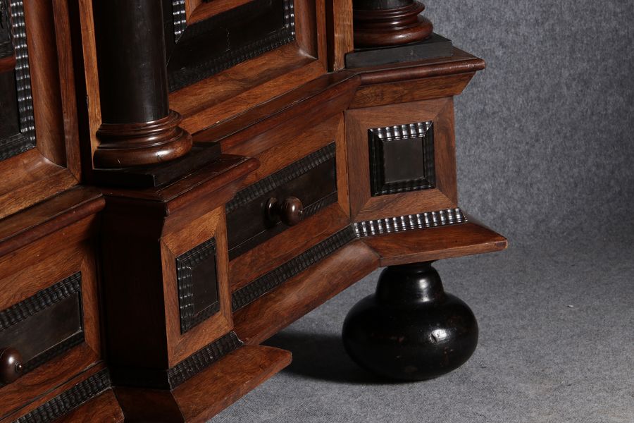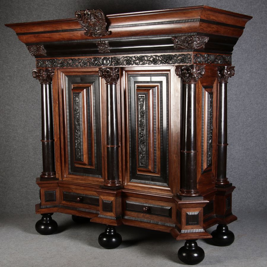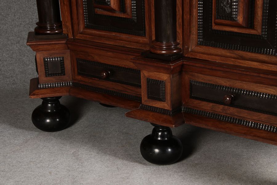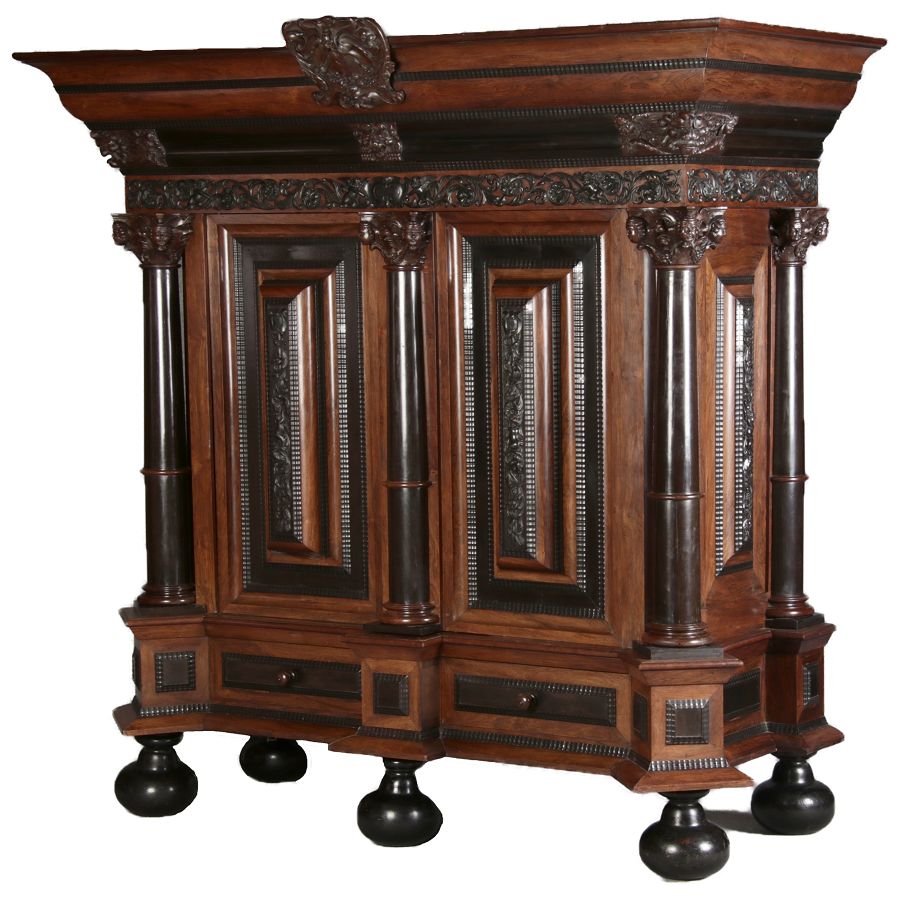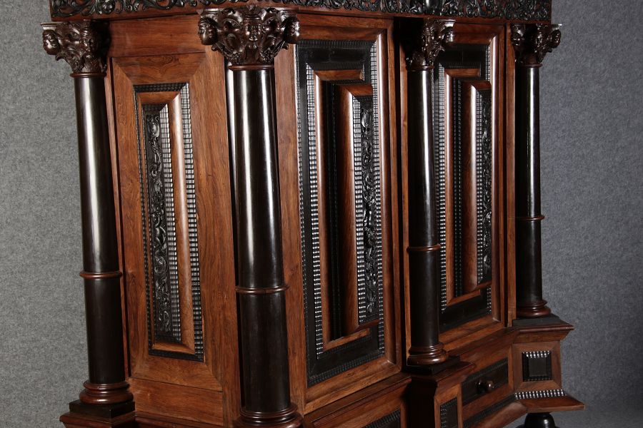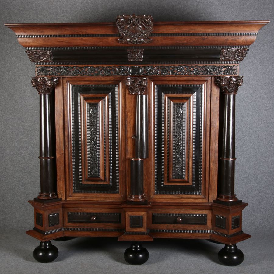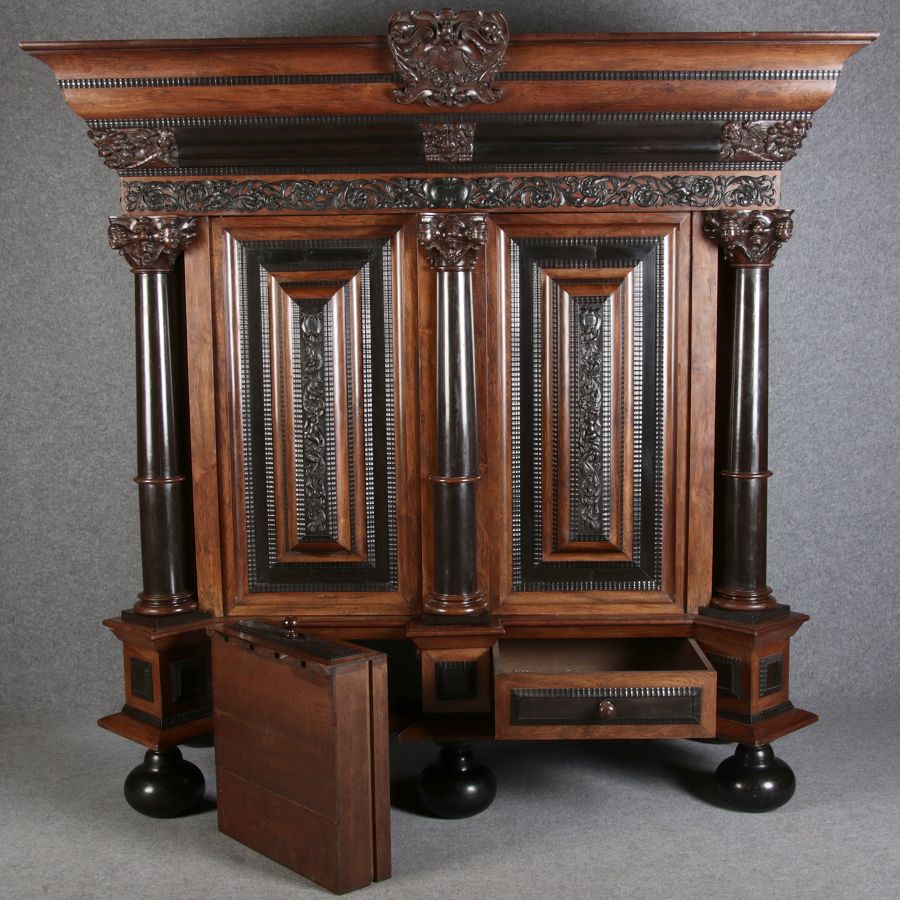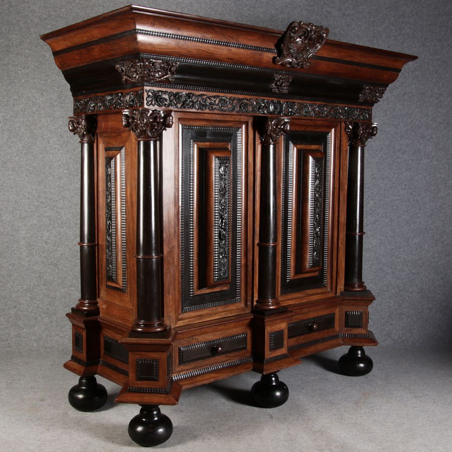 Antiker Barockschrank Amsterdamer Schapp, 5 ebonisierten Säulen, Kissenfüllungen, geschnitzte Kapitele - Türen - Gesimse, Geheimfach, auf hohen Füßen |