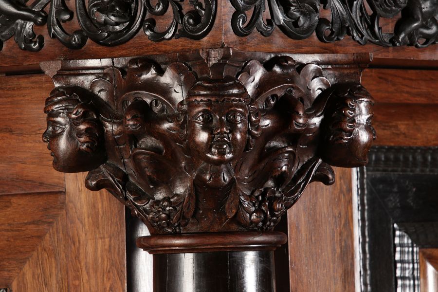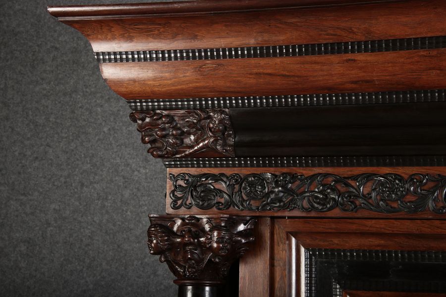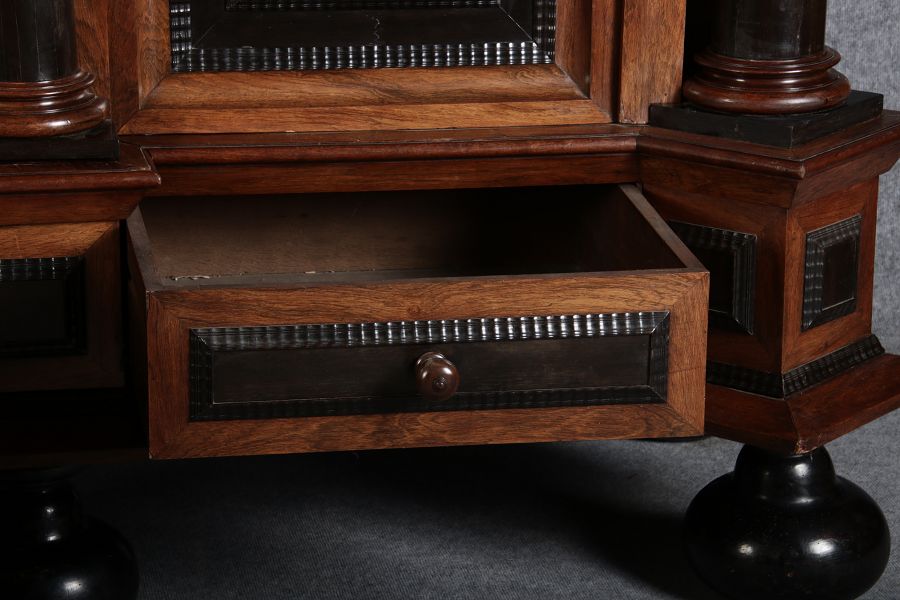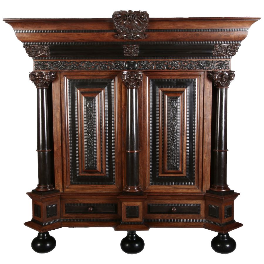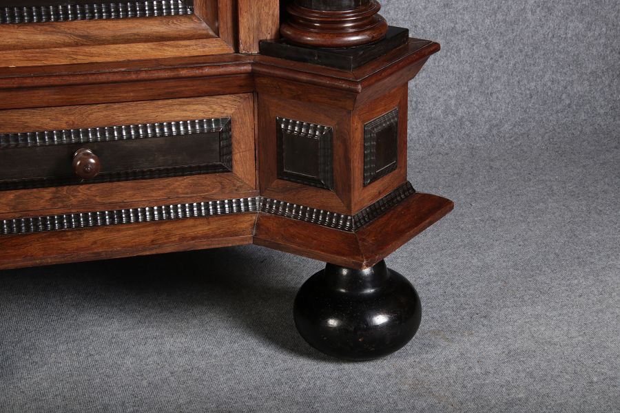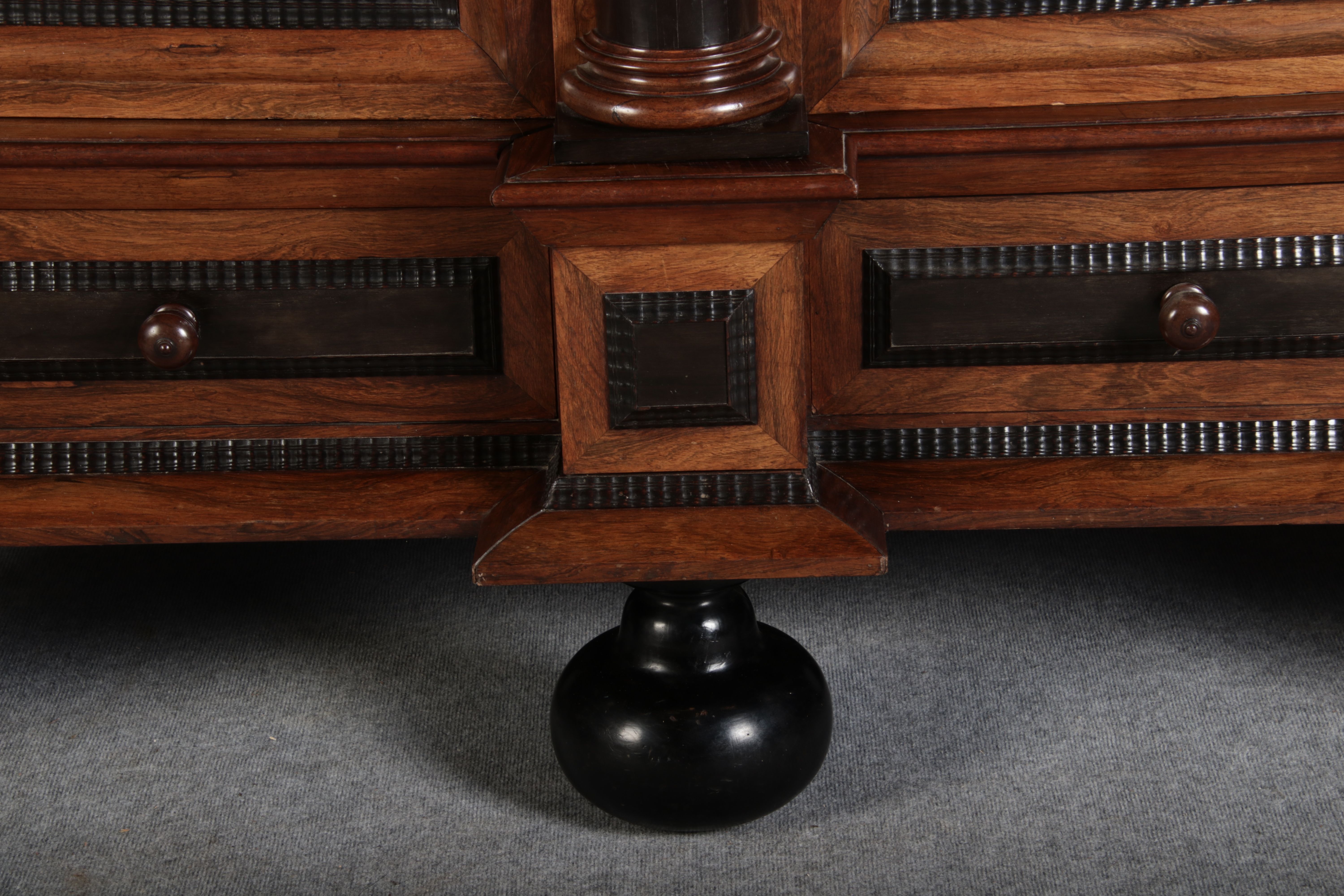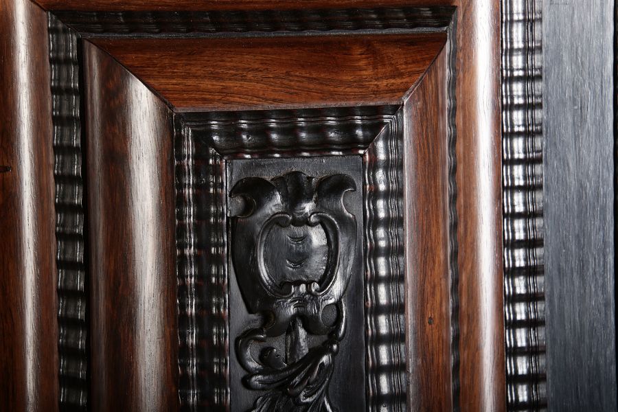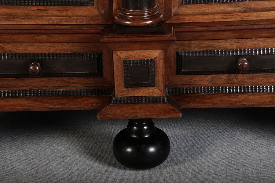 Antiker Barockschrank Amsterdamer Schapp, 5 ebonisierten Säulen, Kissenfüllungen, geschnitzte Kapitele - Türen - Gesimse, Geheimfach, auf hohen Füßen |