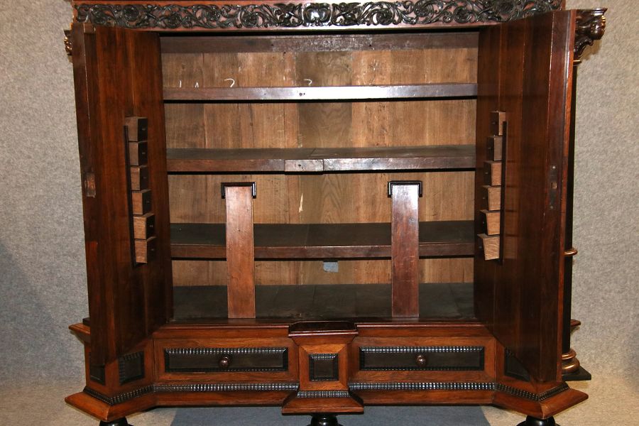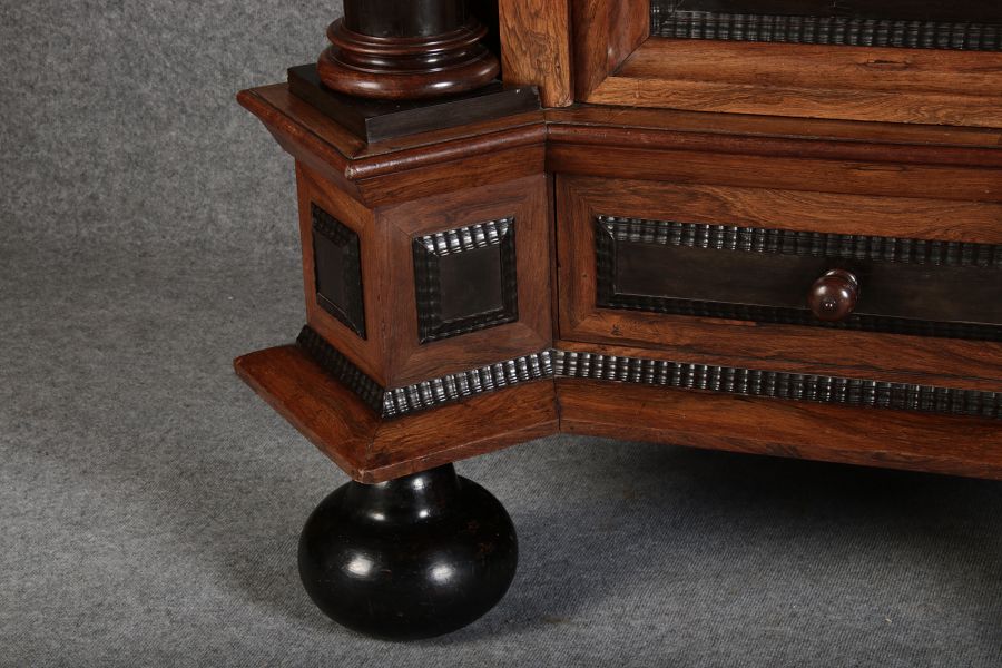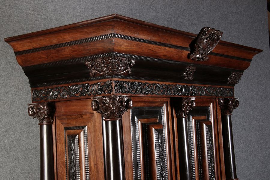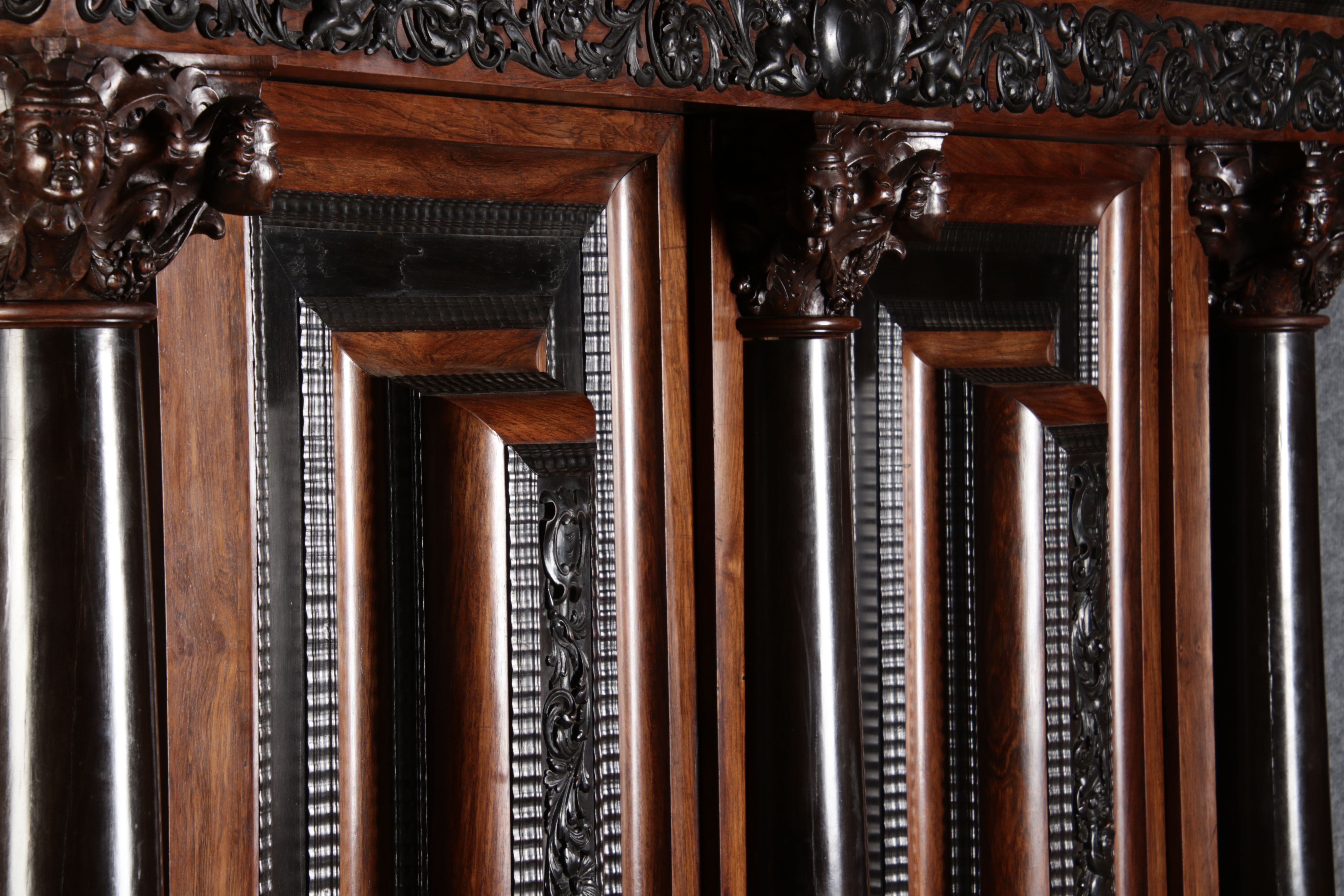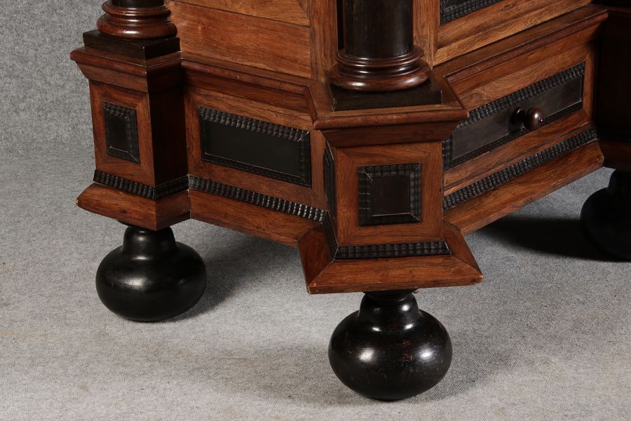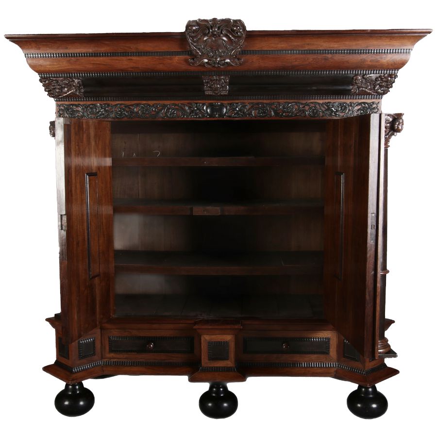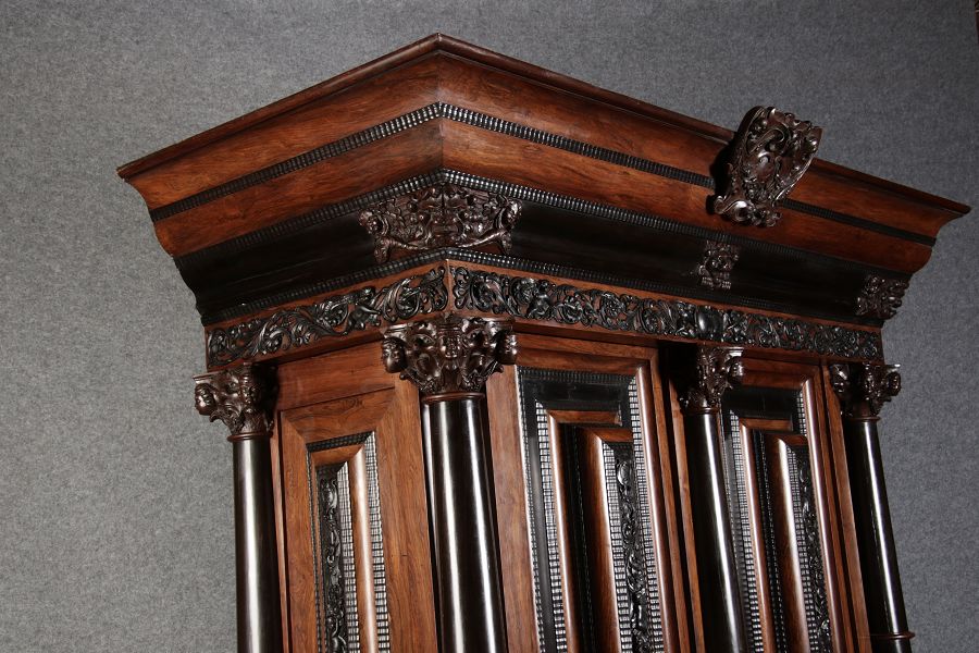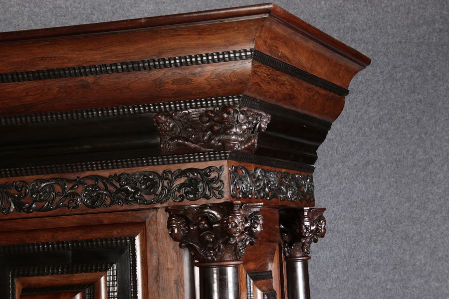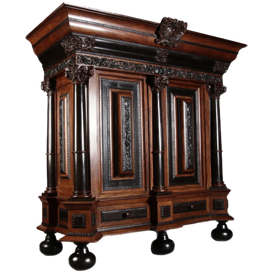 Antiker Barockschrank Amsterdamer Schapp, 5 ebonisierten Säulen, Kissenfüllungen, geschnitzte Kapitele - Türen - Gesimse, Geheimfach, auf hohen Füßen |